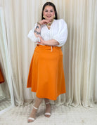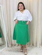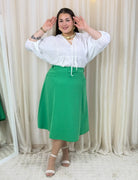 Spódnica plus size została wykonana z gładkiego, przyjemnego w dotyku materiału, który dobrze pracuje podczas ruchu i gwarantuje komfort noszenia przez cały dzień. Długość midi sprawia, że model jest niezwykle uniwersalny — idealnie sprawdzi się zarówno w eleganckich stylizacjach, jak i w zestawach casualowych.