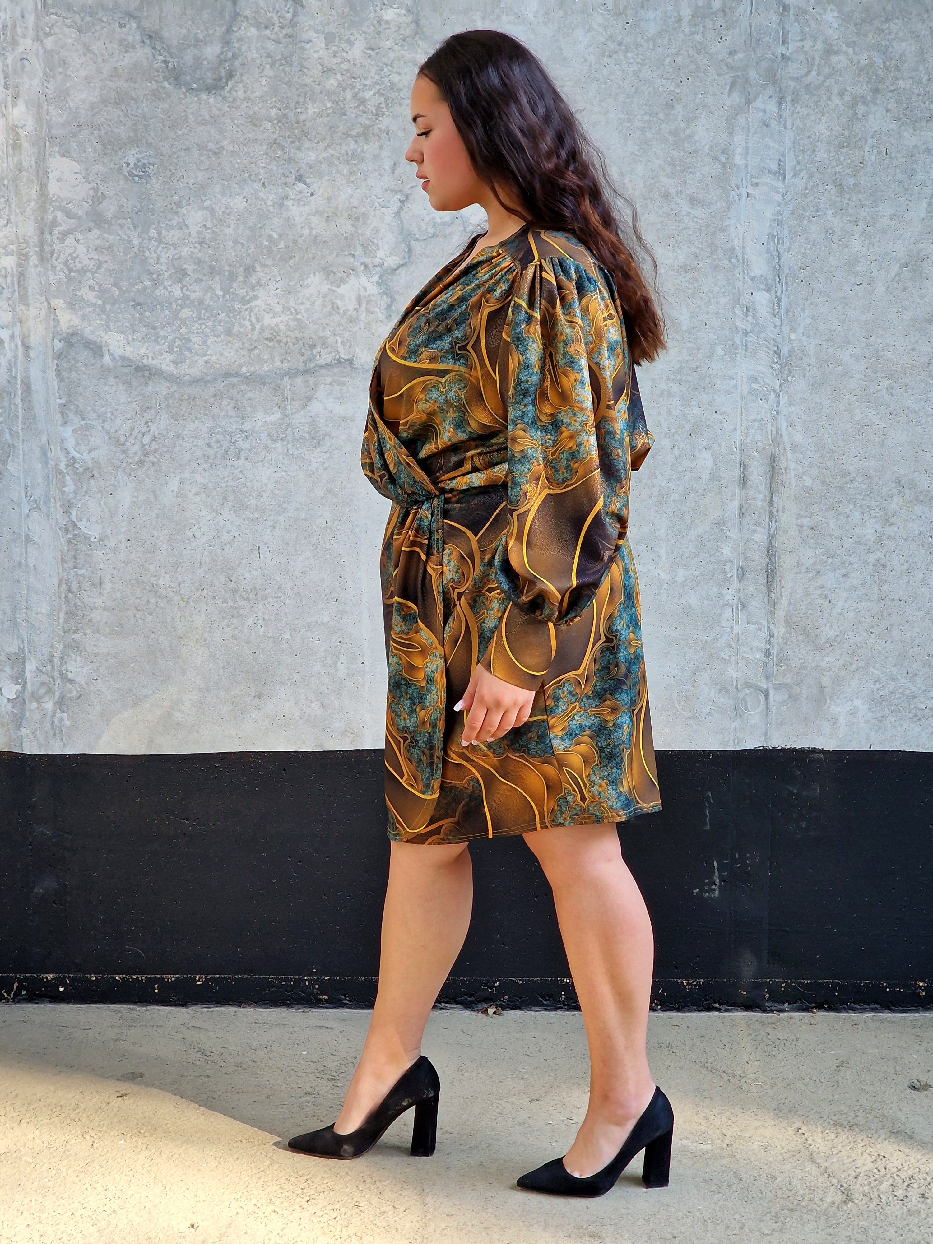 Stylowa sukienka kopertowa plus size w marmurkowy wzór