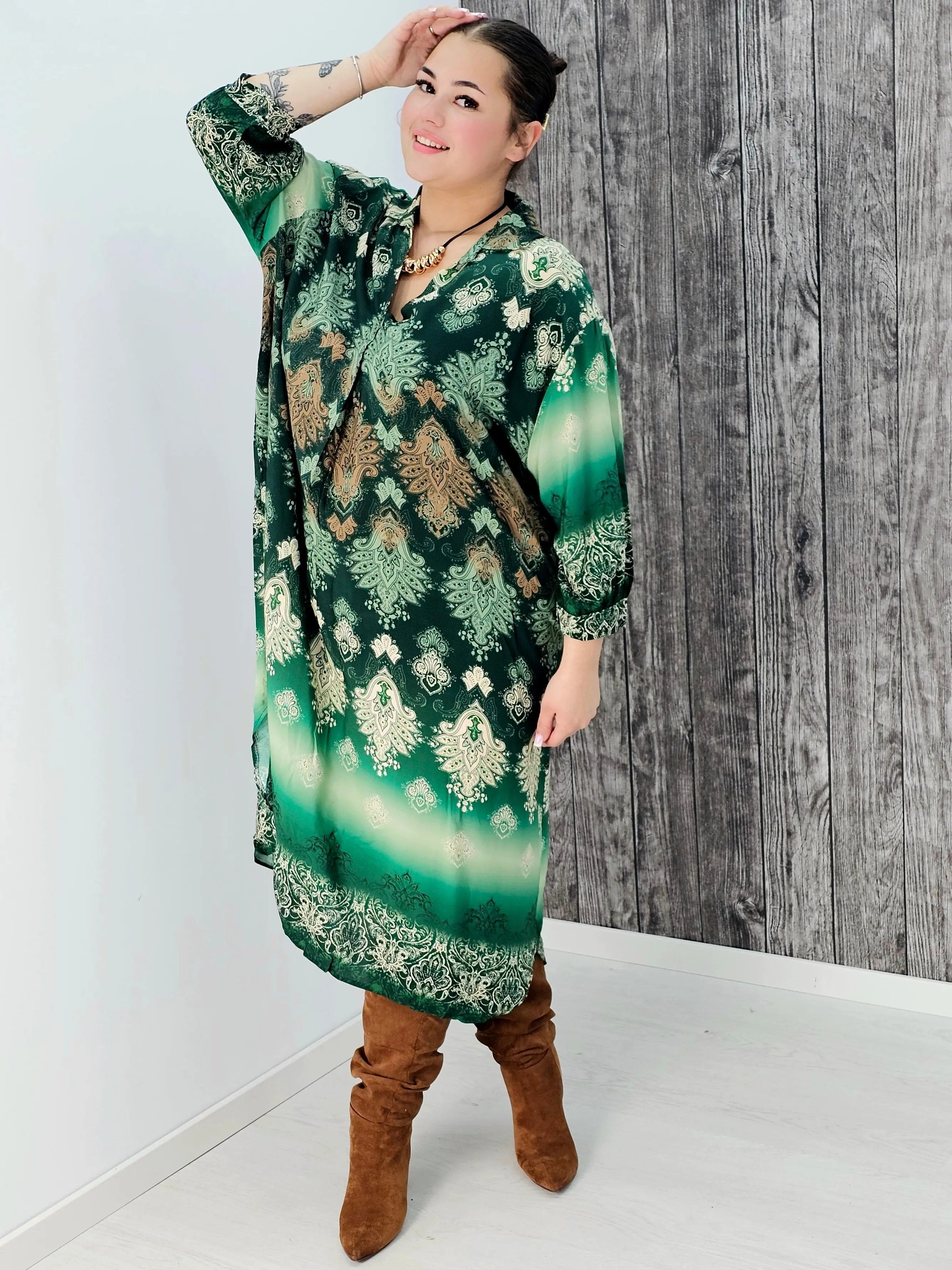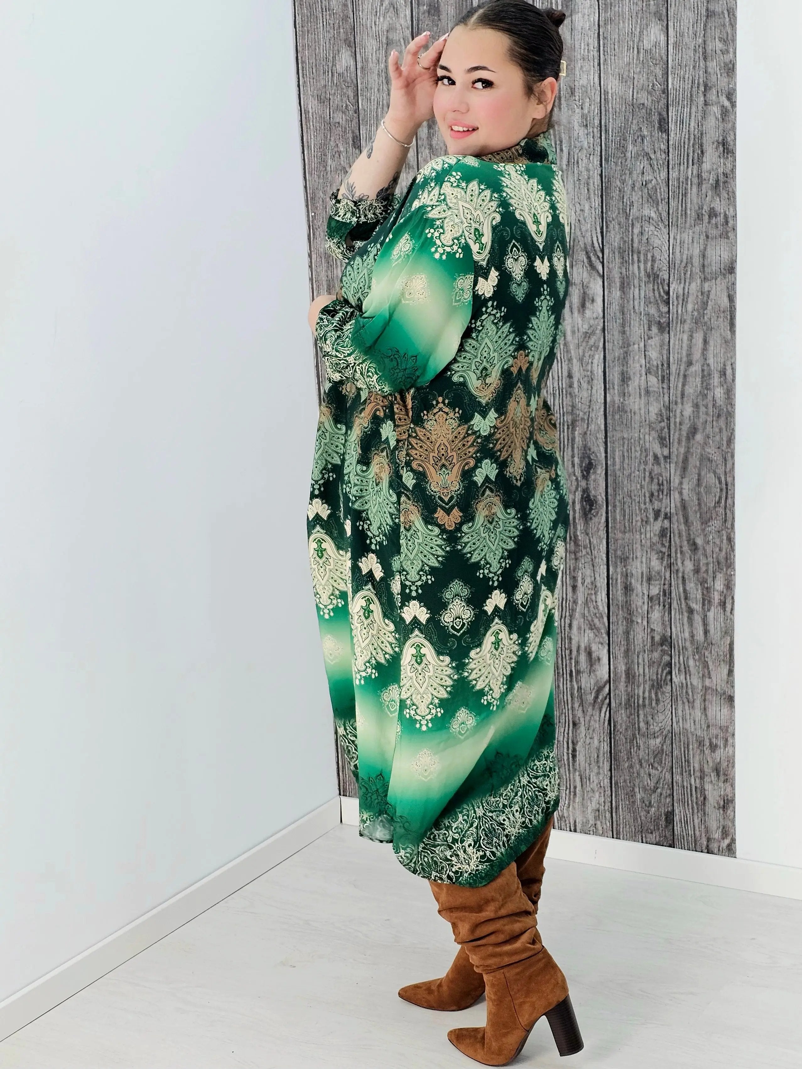 Sukienka posiada elegancki kołnierzyk, który nadaje jej klasyczny, a jednocześnie szykowny wygląd. Rękawy o długości 3/4 są idealnym kompromisem między długimi a krótkimi rękawami, co czyni tę sukienkę odpowiednią do noszenia przez większość roku.