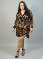 Sukienka plus size w modny, brązowo-czarny zwierzęcy wzór to propozycja dla kobiet, które chcą połączyć wygodę z wyrazistym stylem. Print inspirowany motywem zebry przyciąga wzrok i optycznie modeluje sylwetkę, dzięki czemu sukienka plus size świetnie wpisuje się w aktualne trendy mody plus size dla kobiet.