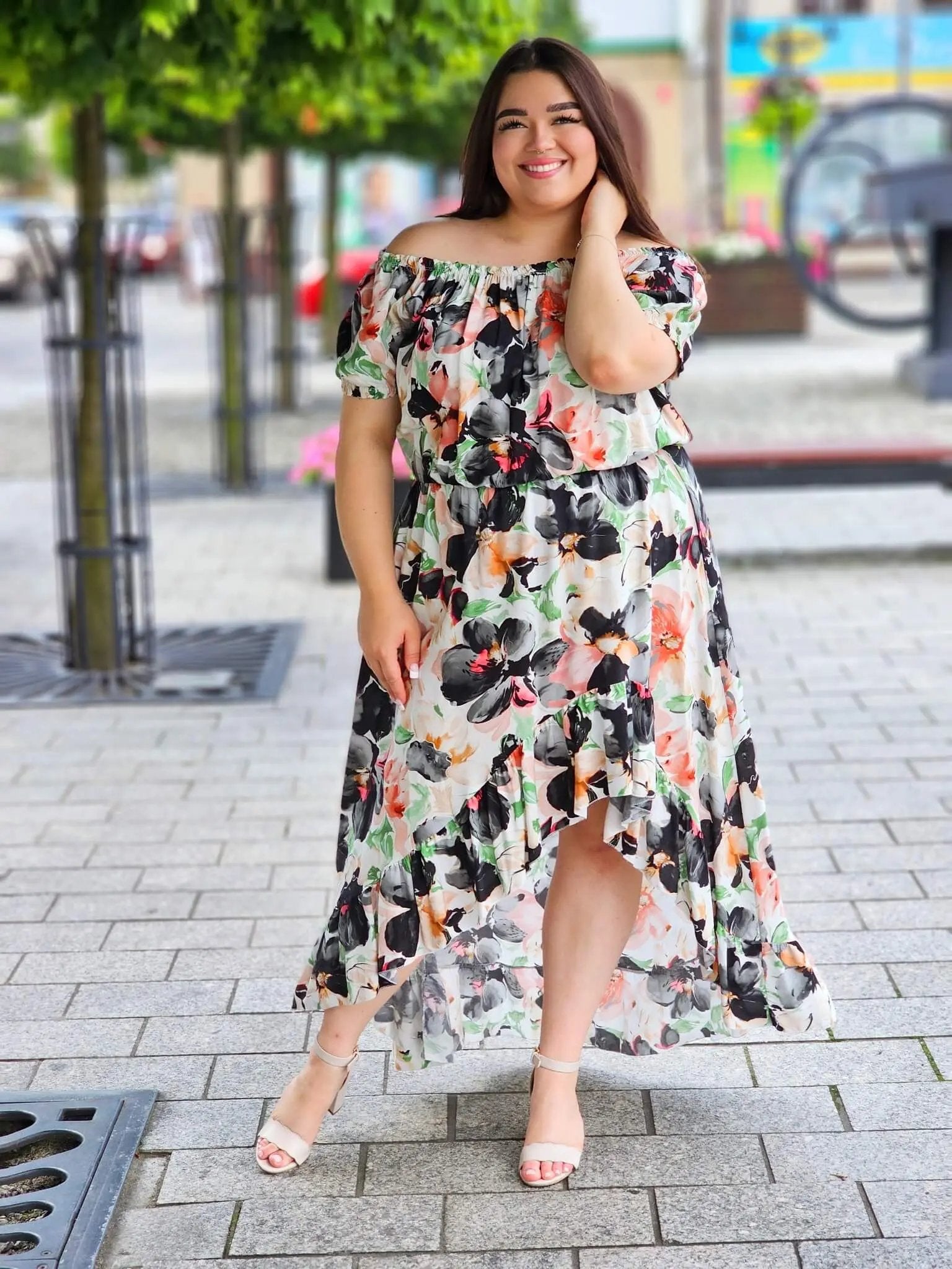 Zwiewna sukienka plus size z odkrytymi ramionami i kwiatowym printem