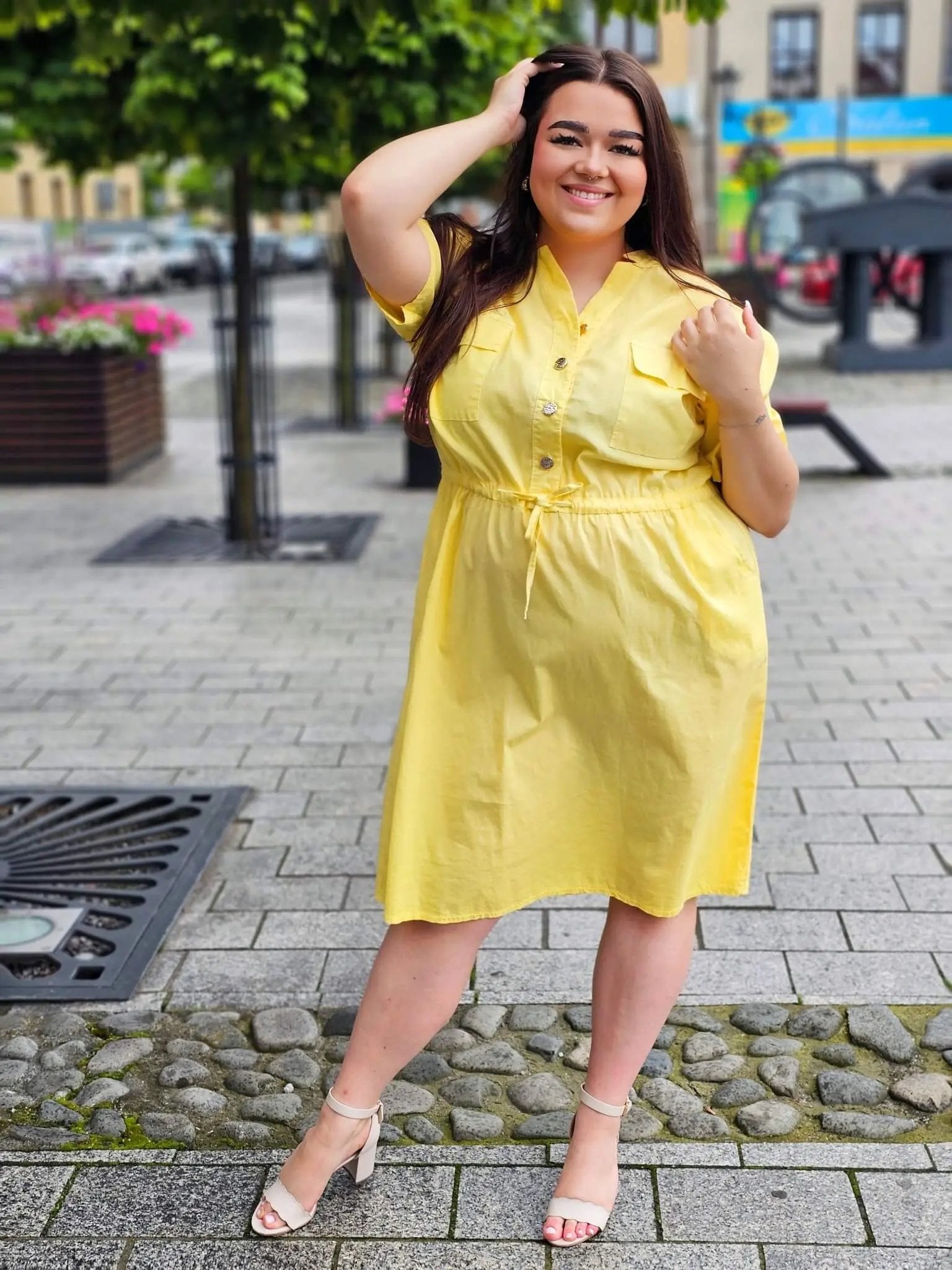 Fason z krótkim rękawem i rozpinanym dekoltem z ozdobnymi guzikami dodaje lekkości i ułatwia stylizację — pasuje zarówno do sportowych butów, jak i bardziej eleganckich dodatków. Góra sukienki została wyposażona w kieszenie z klapkami, które dodają jej praktycznego, miejskiego charakteru.