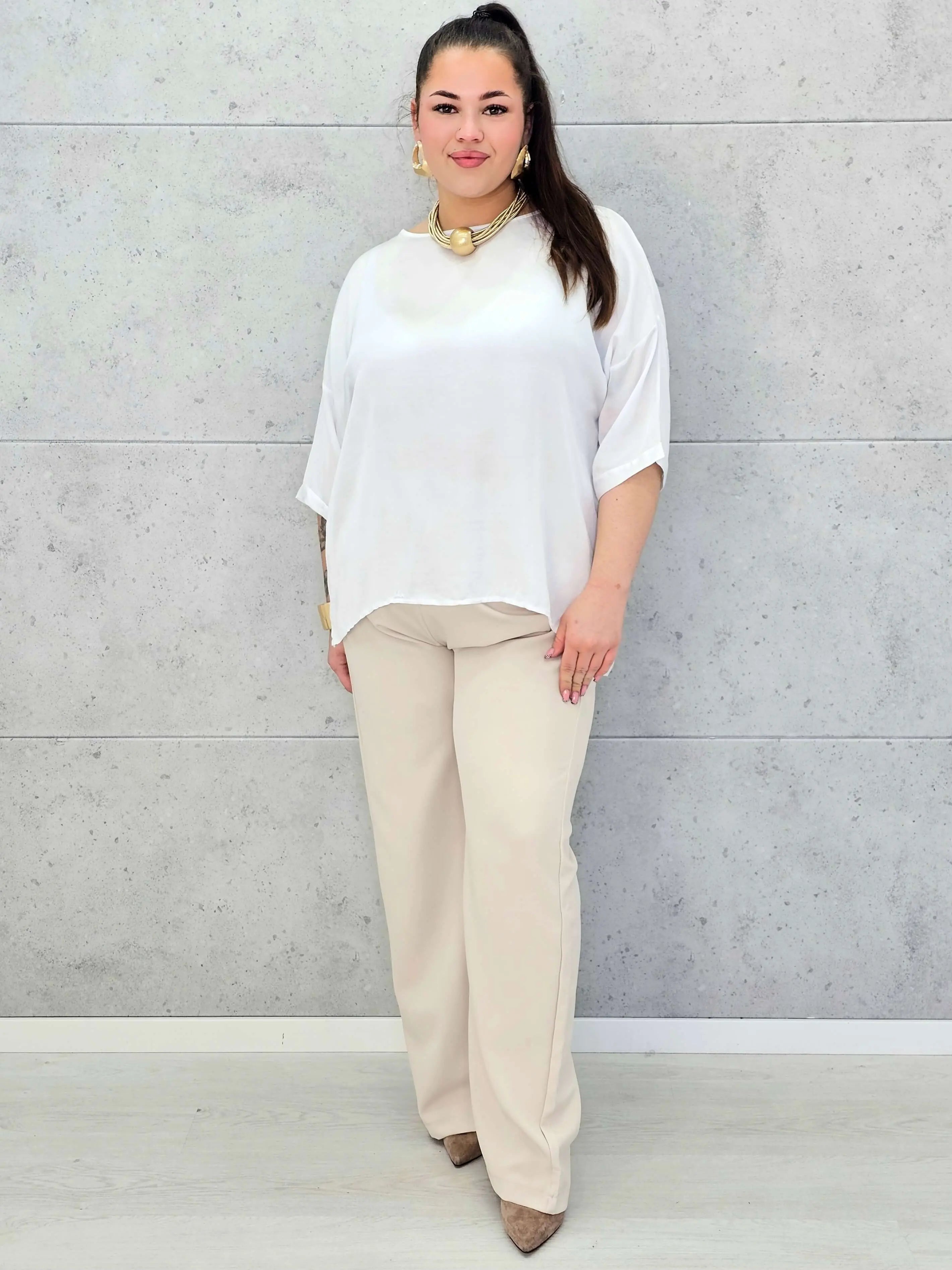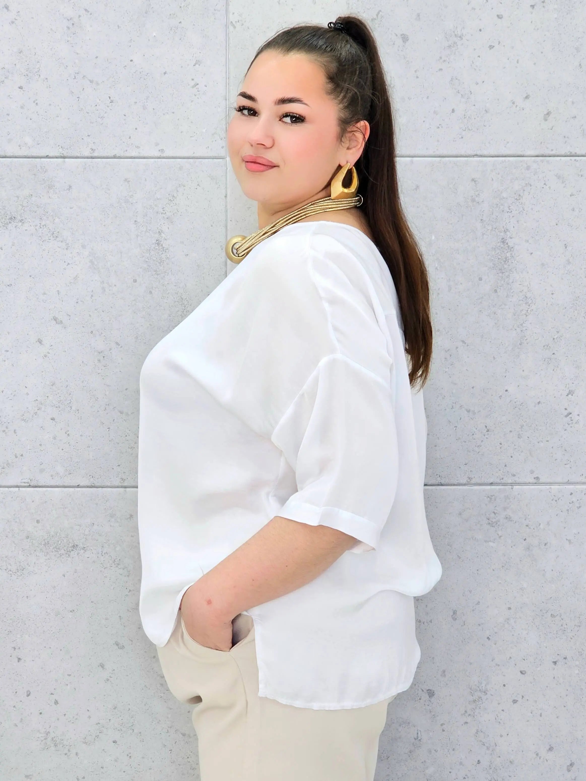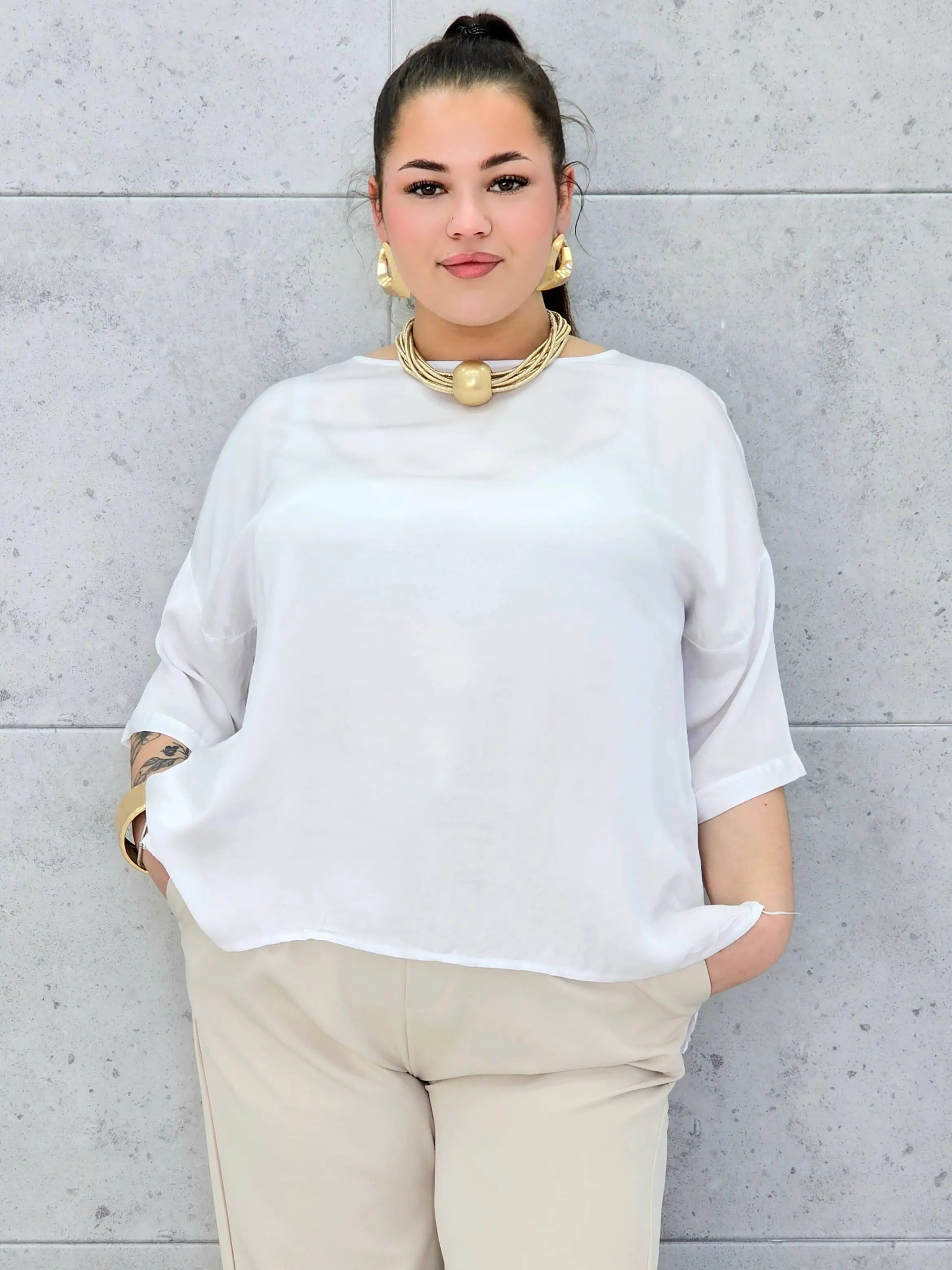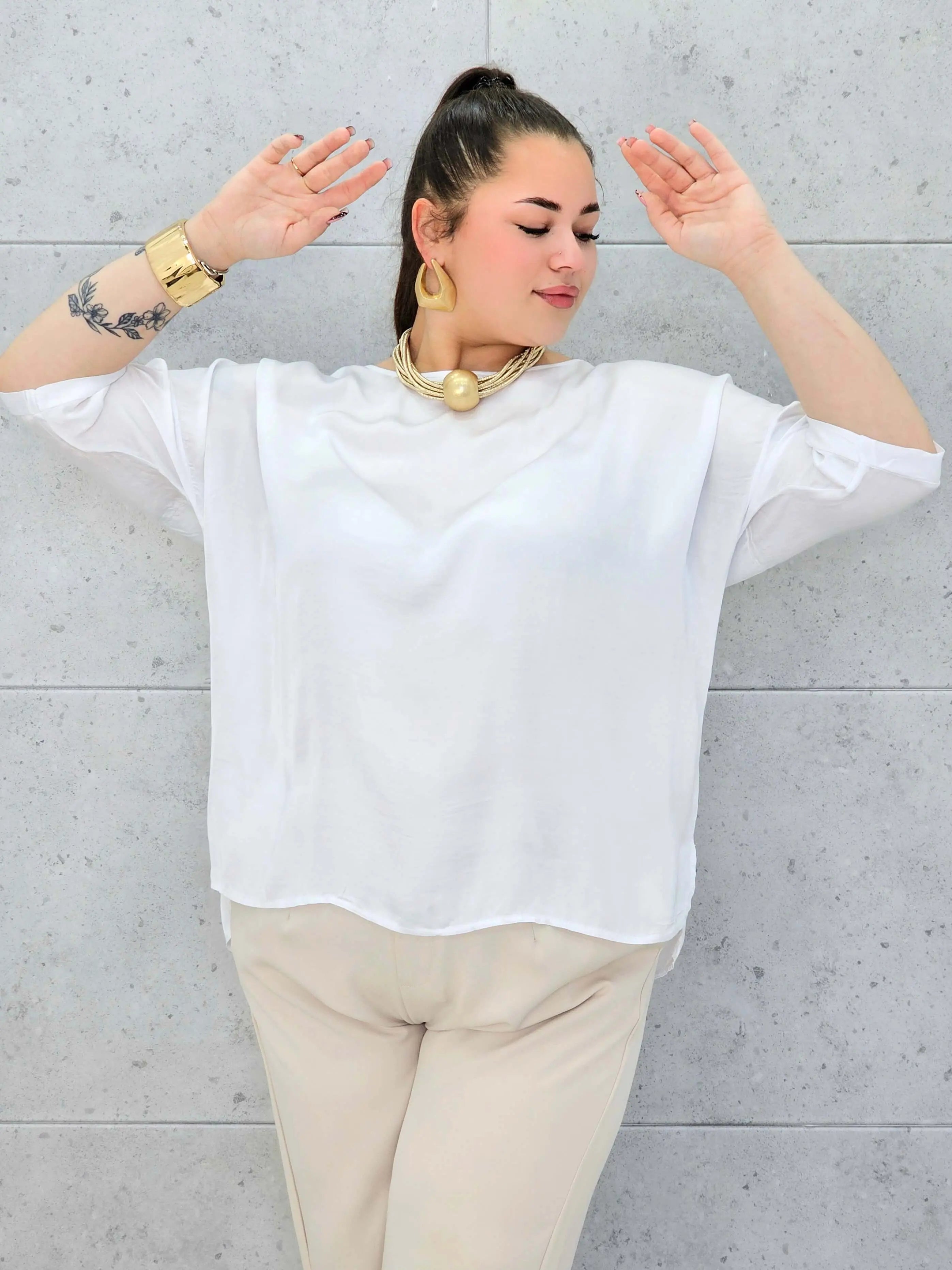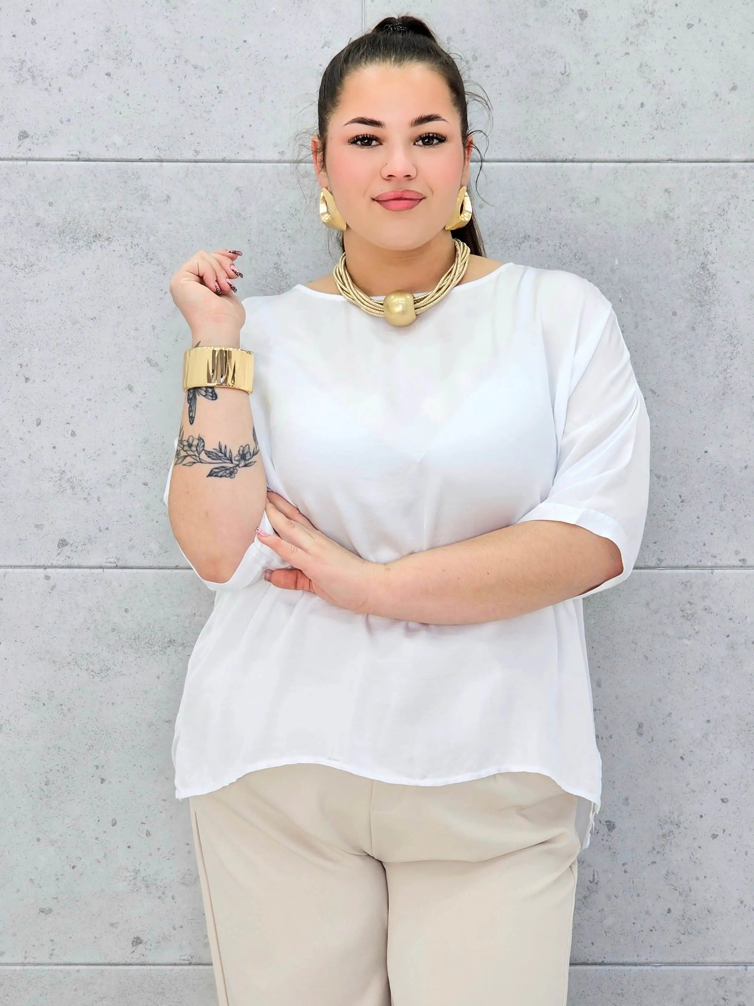 Biała bluzka plus size to idealny wybór dla kobiet ceniących elegancję, komfort i ponadczasowy styl. Jej lekko połyskujący materiał pięknie układa się na sylwetce, a swobodny krój gwarantuje pełną wygodę noszenia. Model doskonały zarówno do pracy, jak i na specjalne wyjścia — pasuje do eleganckich spodni, spódnic czy klasycznych jeansów.