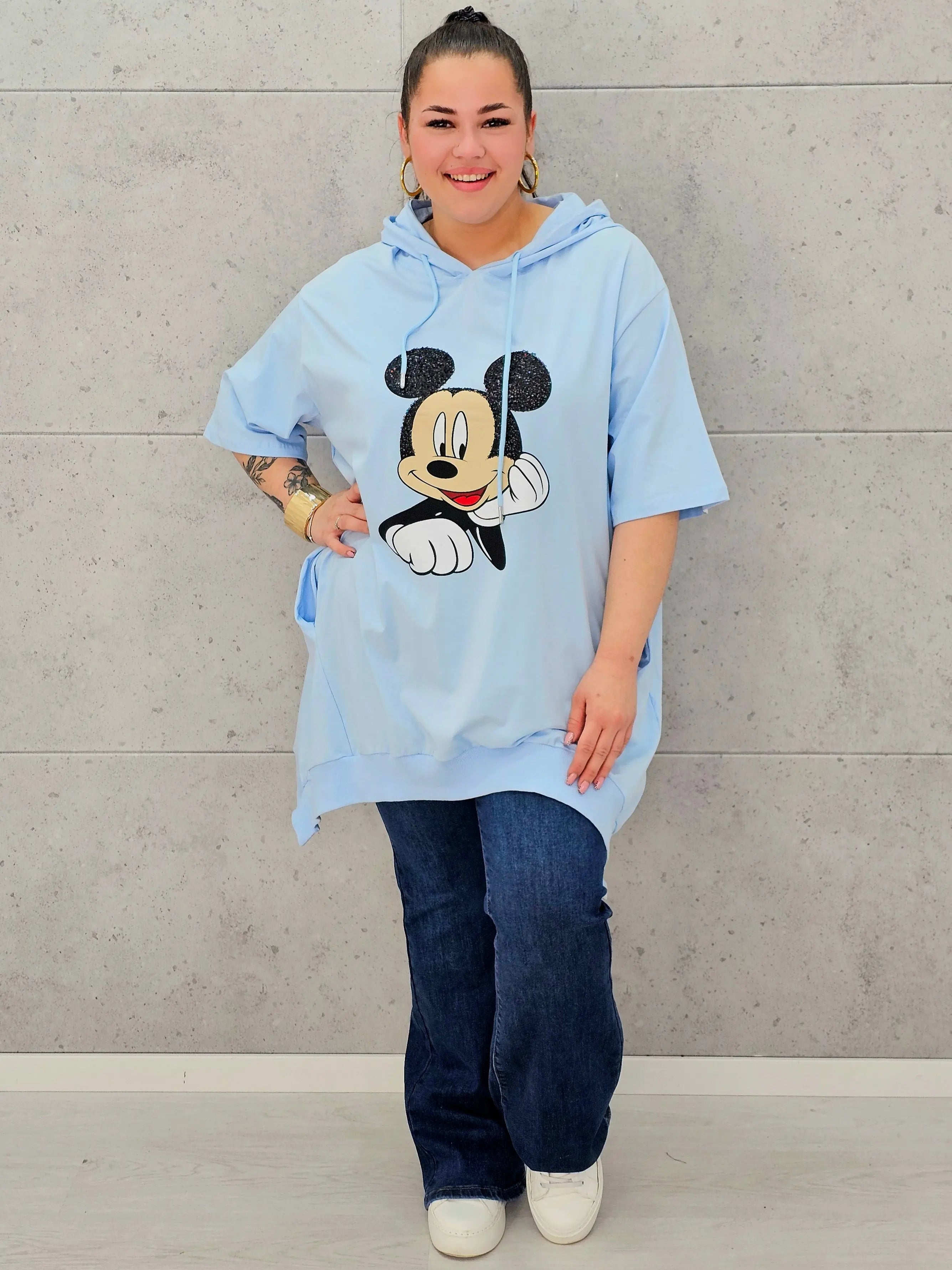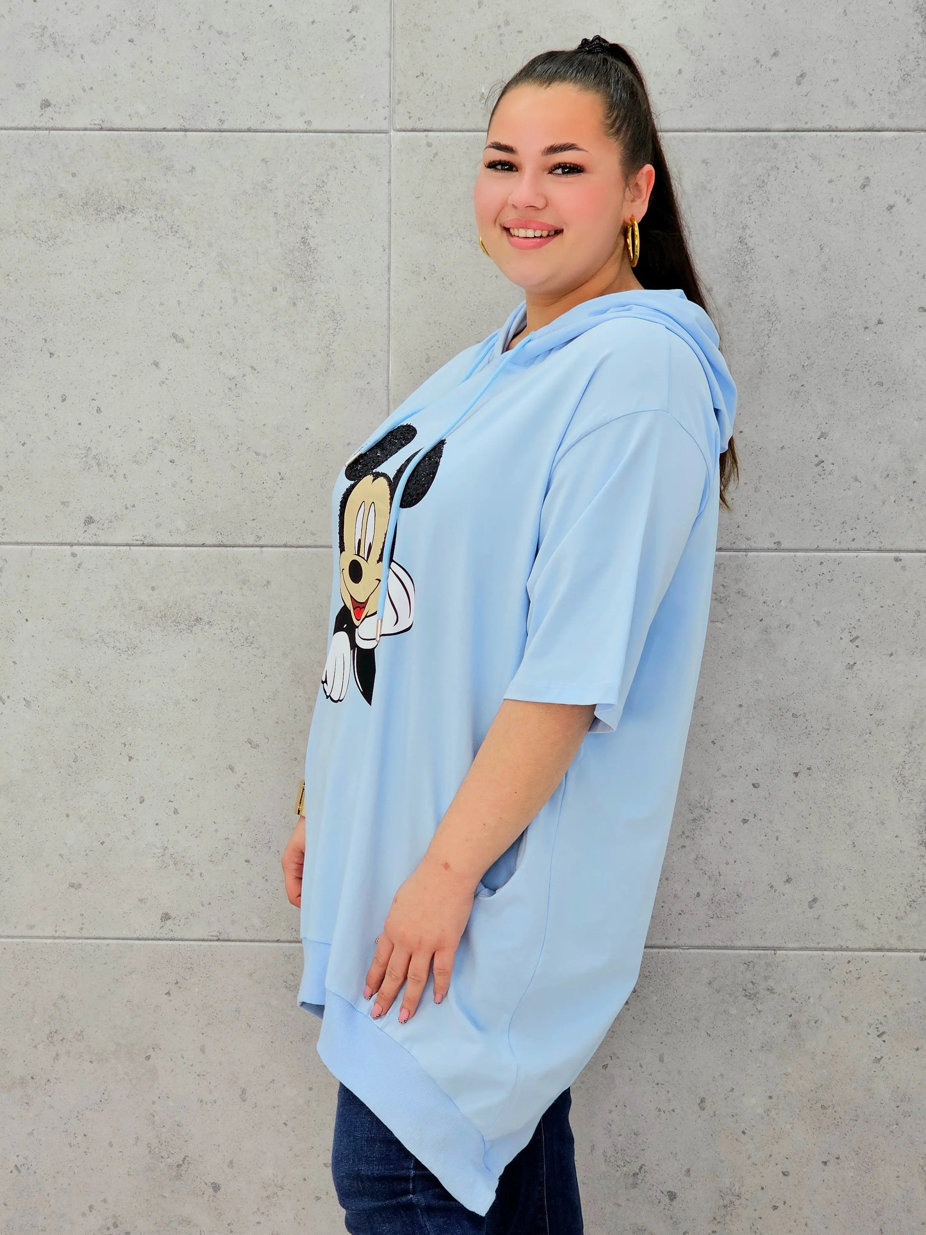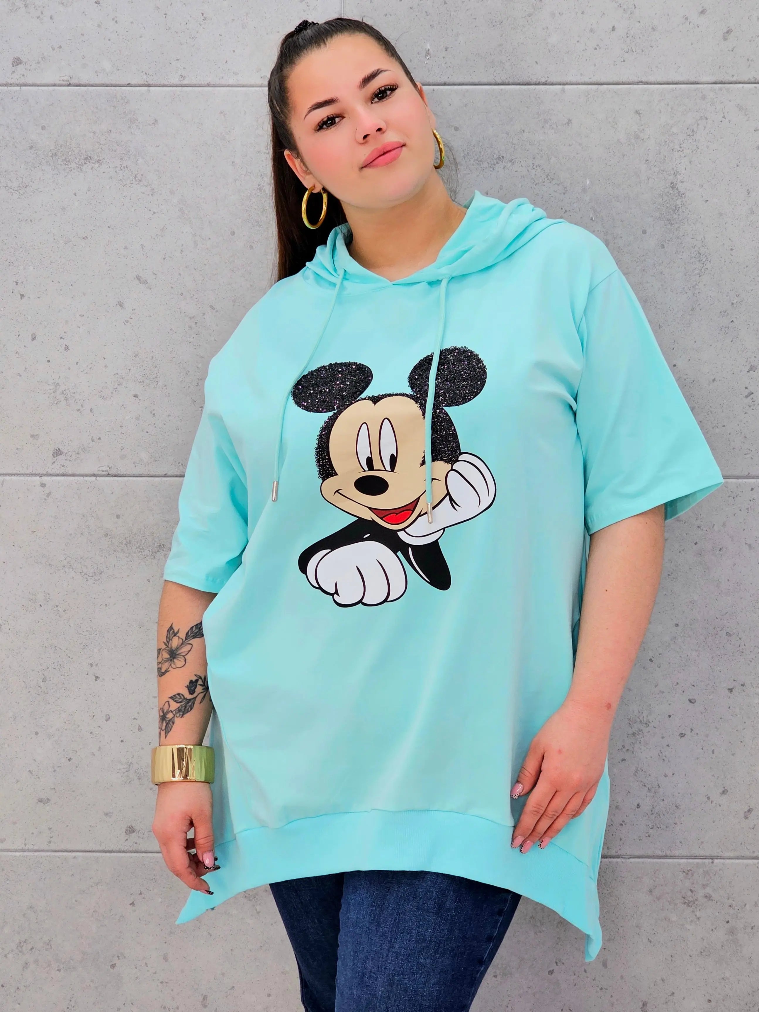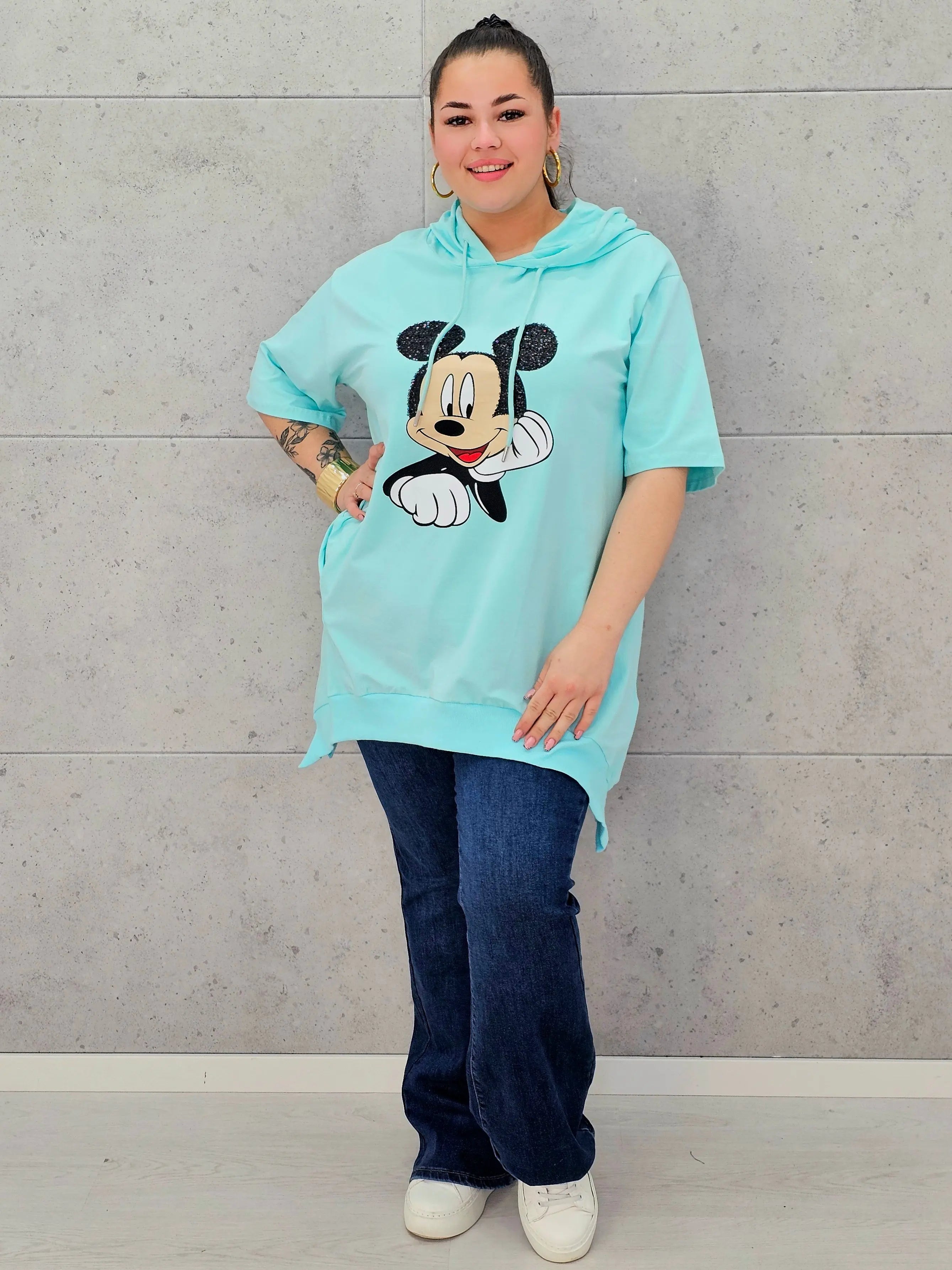 Kaptur z troczkami dodaje sportowego charakteru, a krótkie rękawy sprawiają, że model jest idealny na cieplejsze dni lub jako element lekkich, przyjemnych outfitów. Duży nadruk nadaje bluzie młodzieżowego wdzięku, jednocześnie pięknie wpisując się w współczesne trendy mody plus size. Asymetryczny dół subtelnie wydłuża sylwetkę, dodając całości lekkości i nowoczesnego wyglądu.