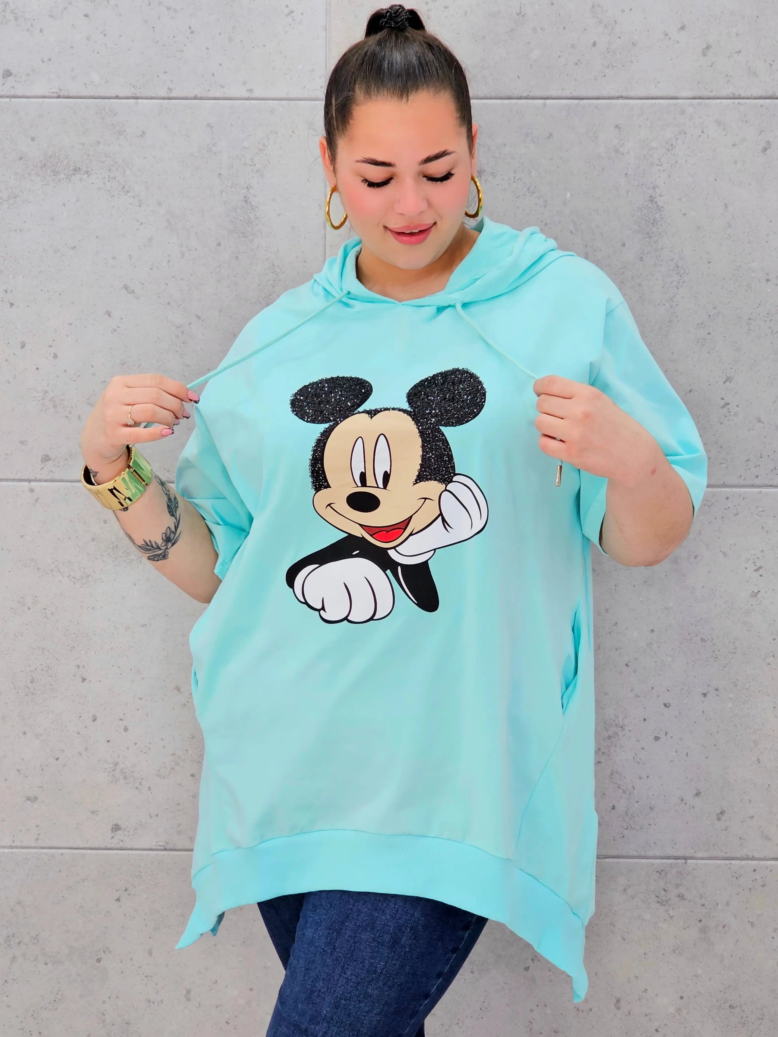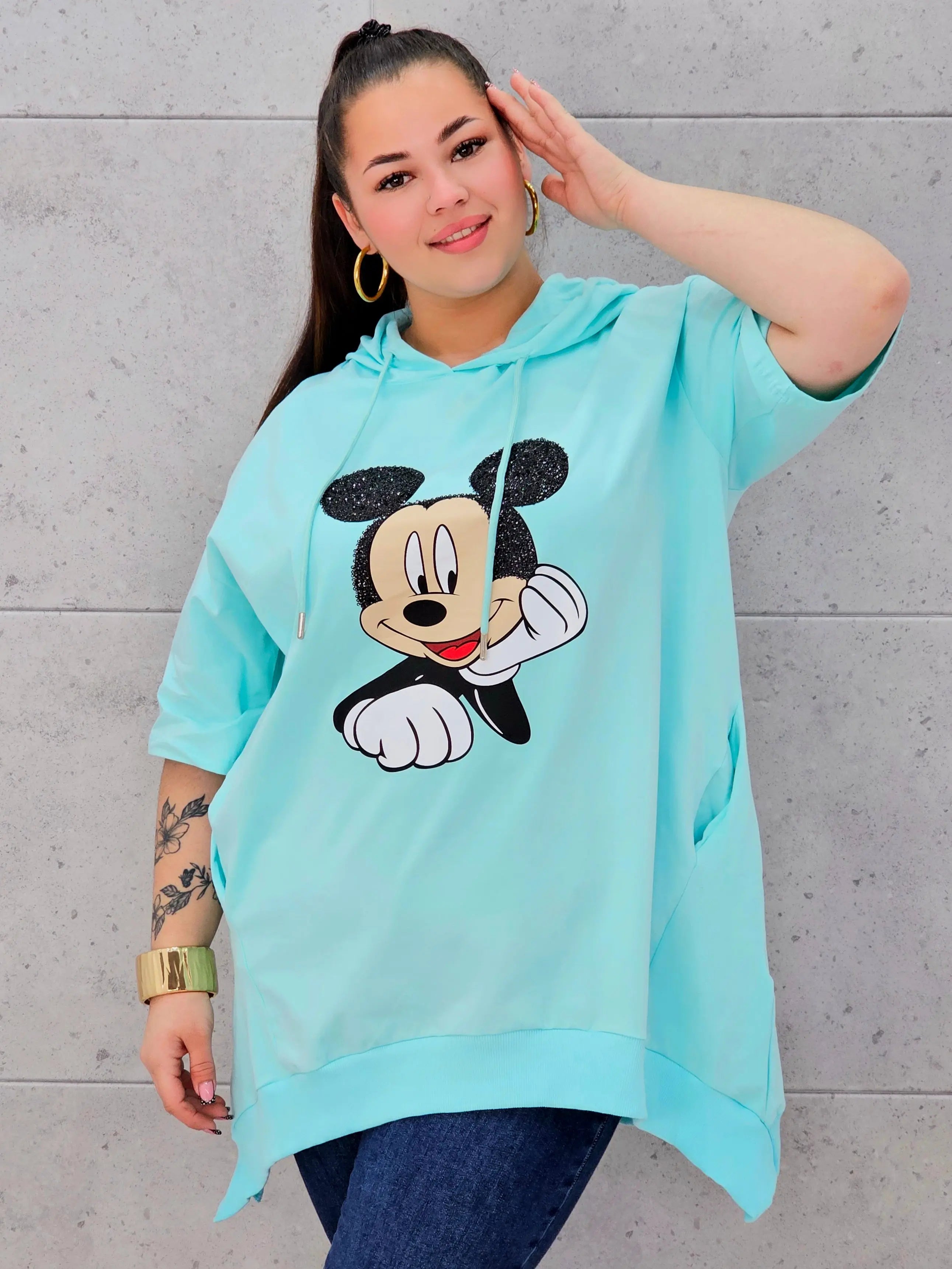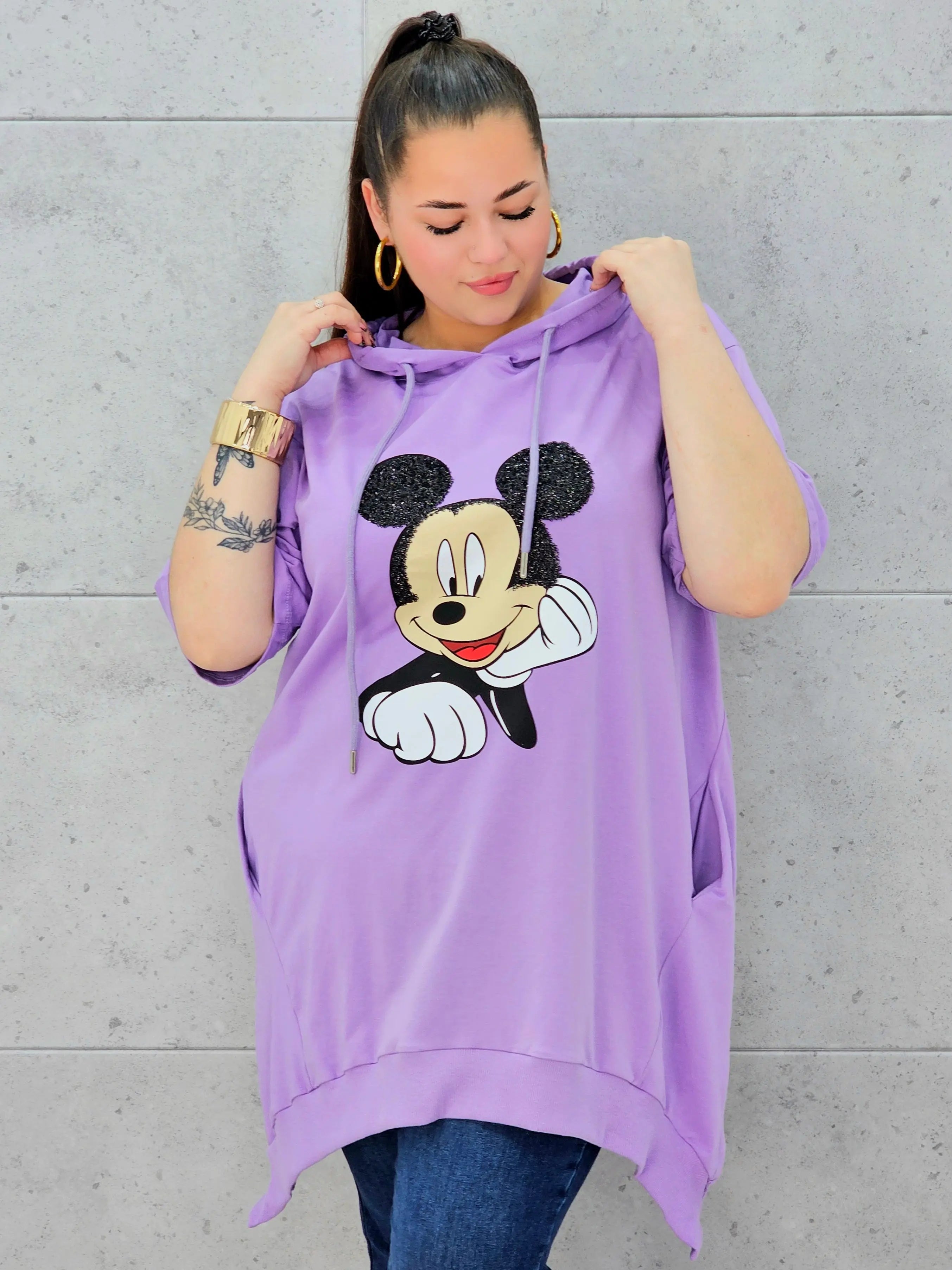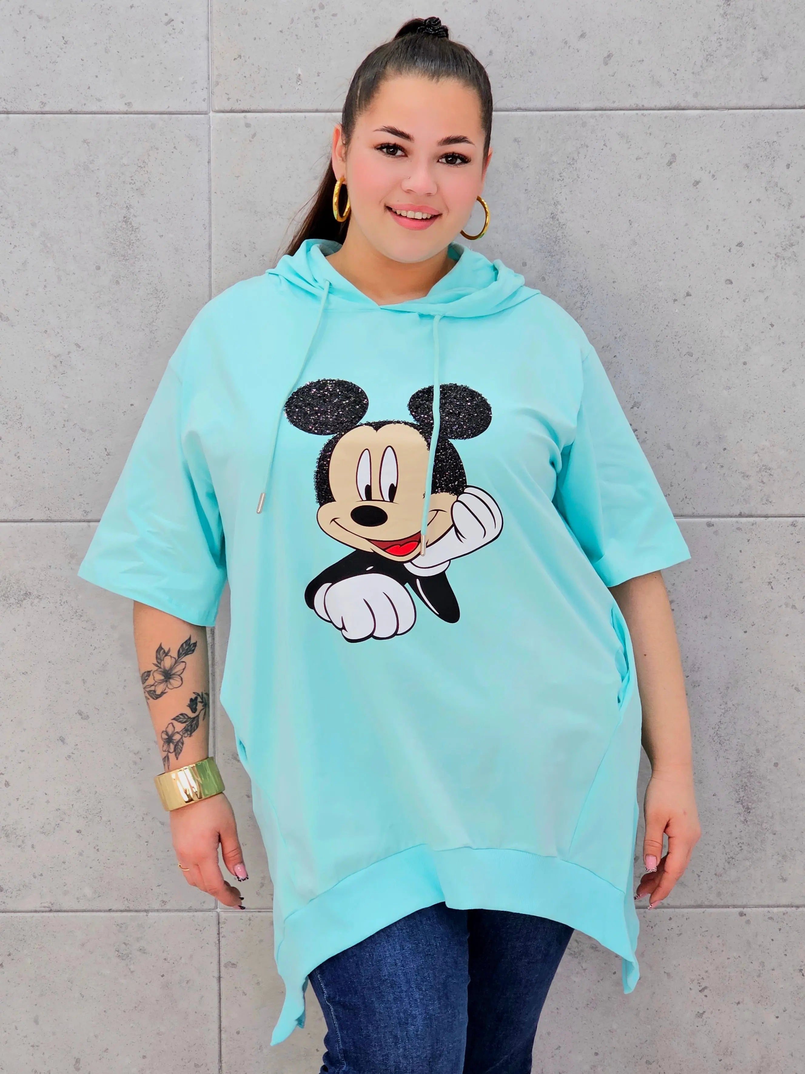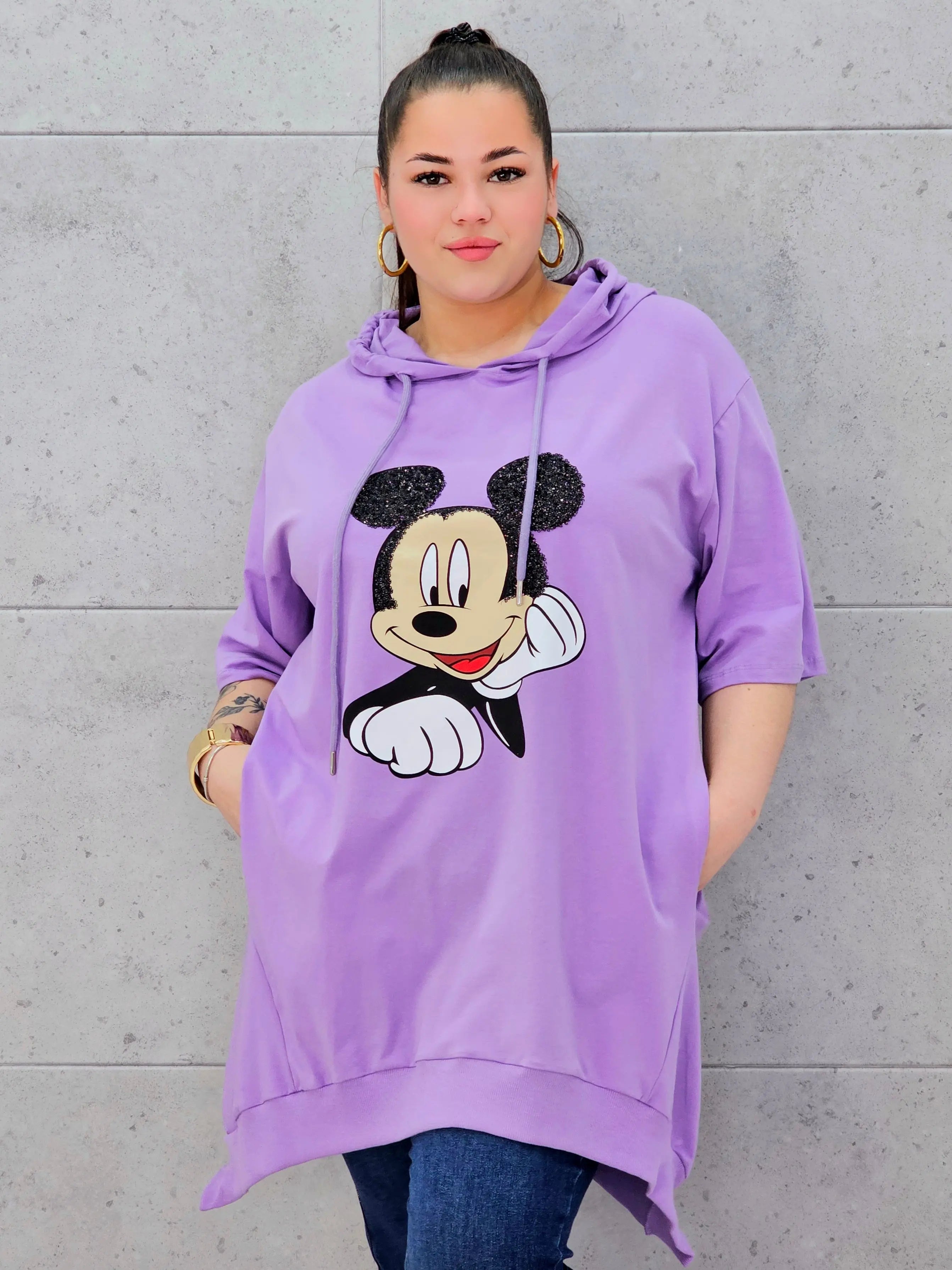 Kaptur z troczkami dodaje sportowego charakteru, a krótkie rękawy sprawiają, że model jest idealny na cieplejsze dni lub jako element lekkich, przyjemnych outfitów. Duży nadruk nadaje bluzie młodzieżowego wdzięku, jednocześnie pięknie wpisując się w współczesne trendy mody plus size. Asymetryczny dół subtelnie wydłuża sylwetkę, dodając całości lekkości i nowoczesnego wyglądu.