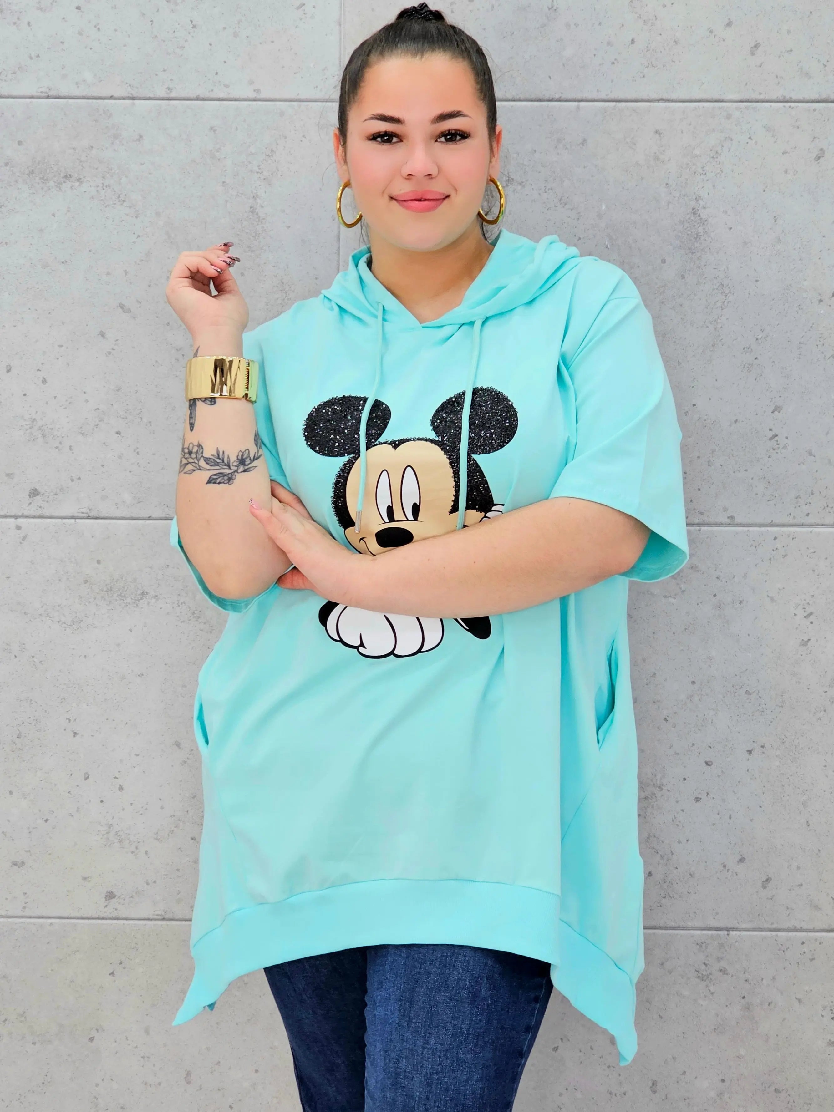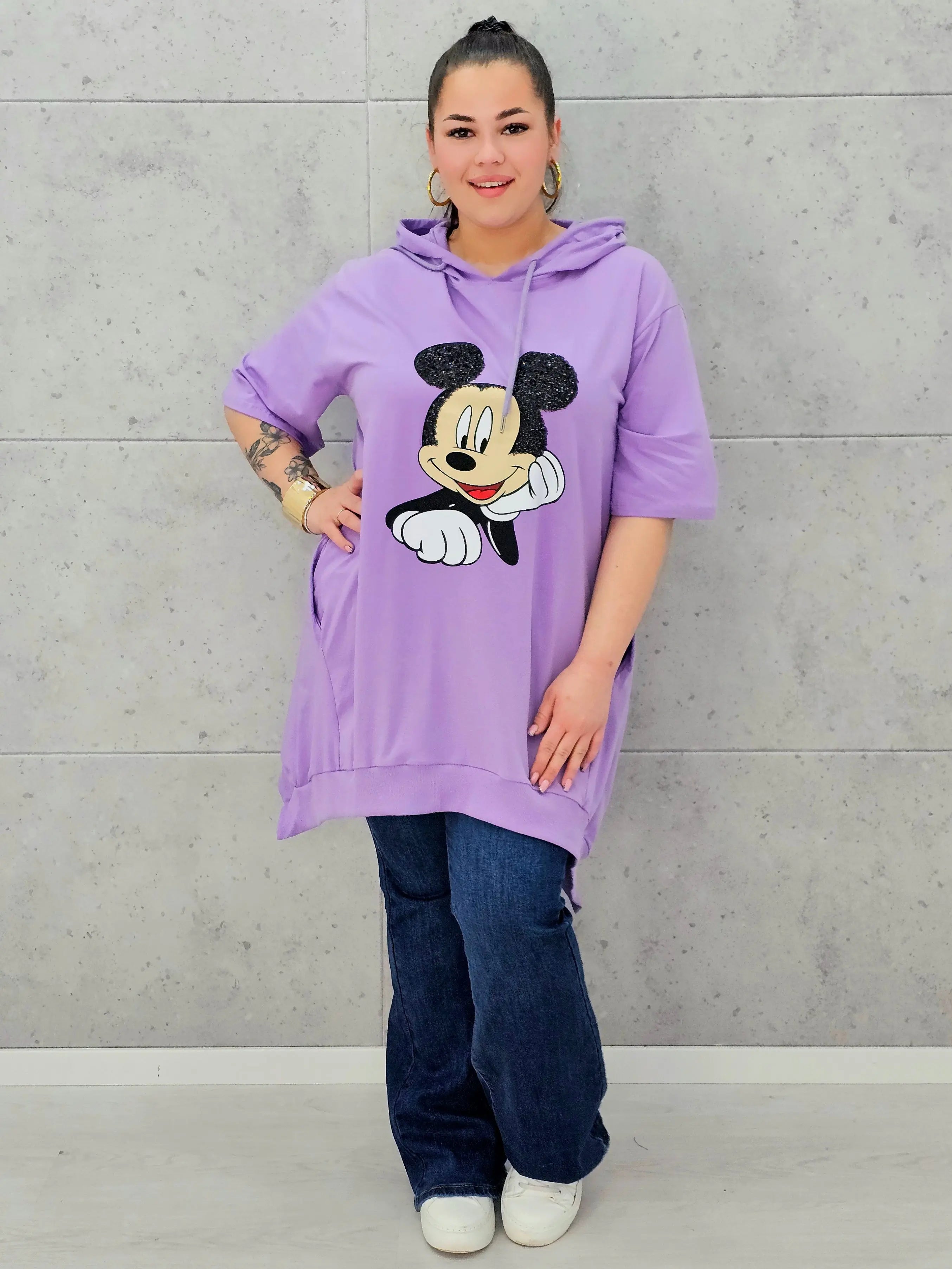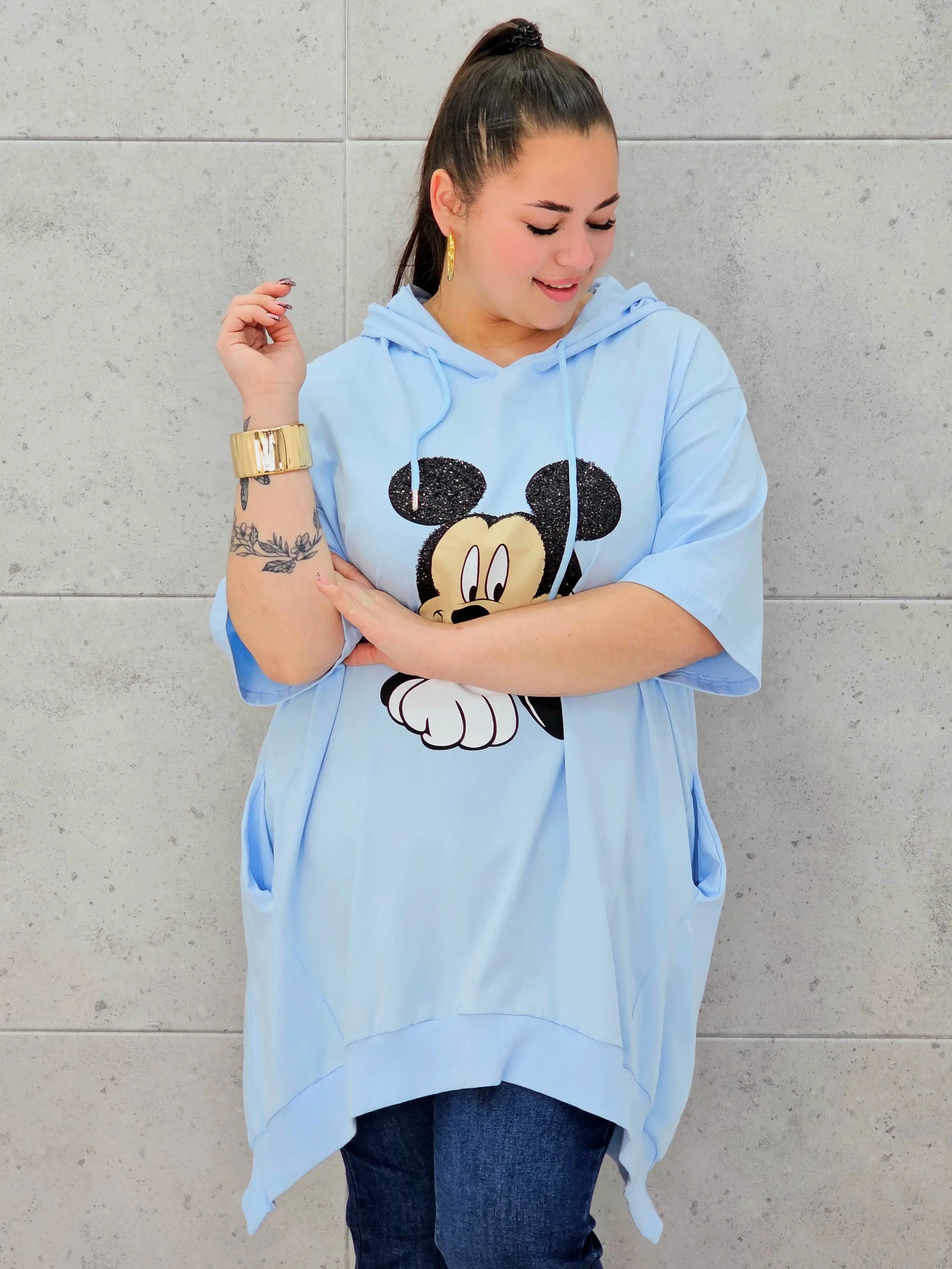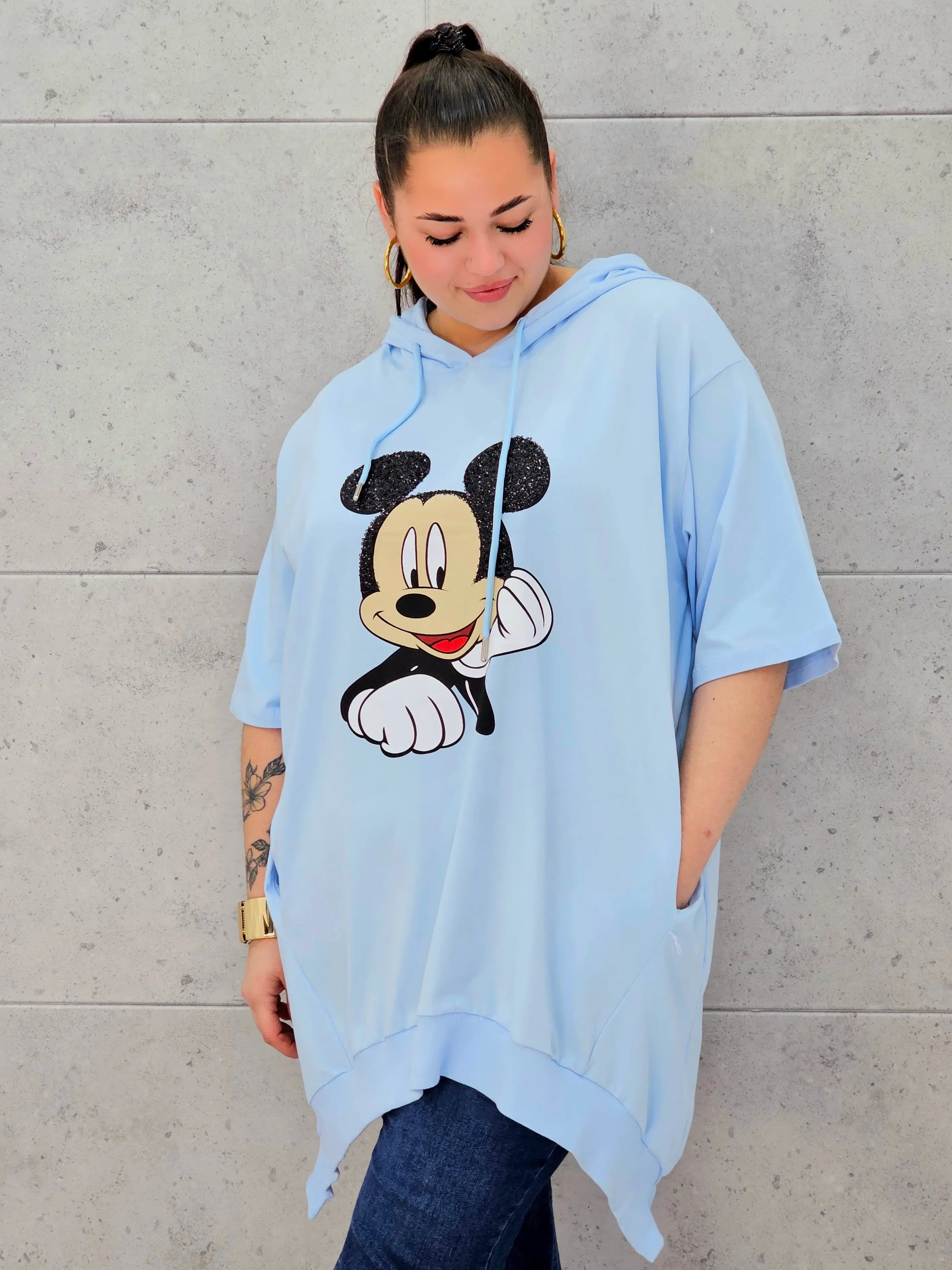 Kaptur z troczkami dodaje sportowego charakteru, a krótkie rękawy sprawiają, że model jest idealny na cieplejsze dni lub jako element lekkich, przyjemnych outfitów. Duży nadruk nadaje bluzie młodzieżowego wdzięku, jednocześnie pięknie wpisując się w współczesne trendy mody plus size. Asymetryczny dół subtelnie wydłuża sylwetkę, dodając całości lekkości i nowoczesnego wyglądu.