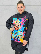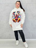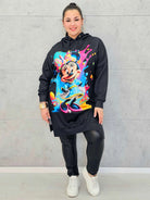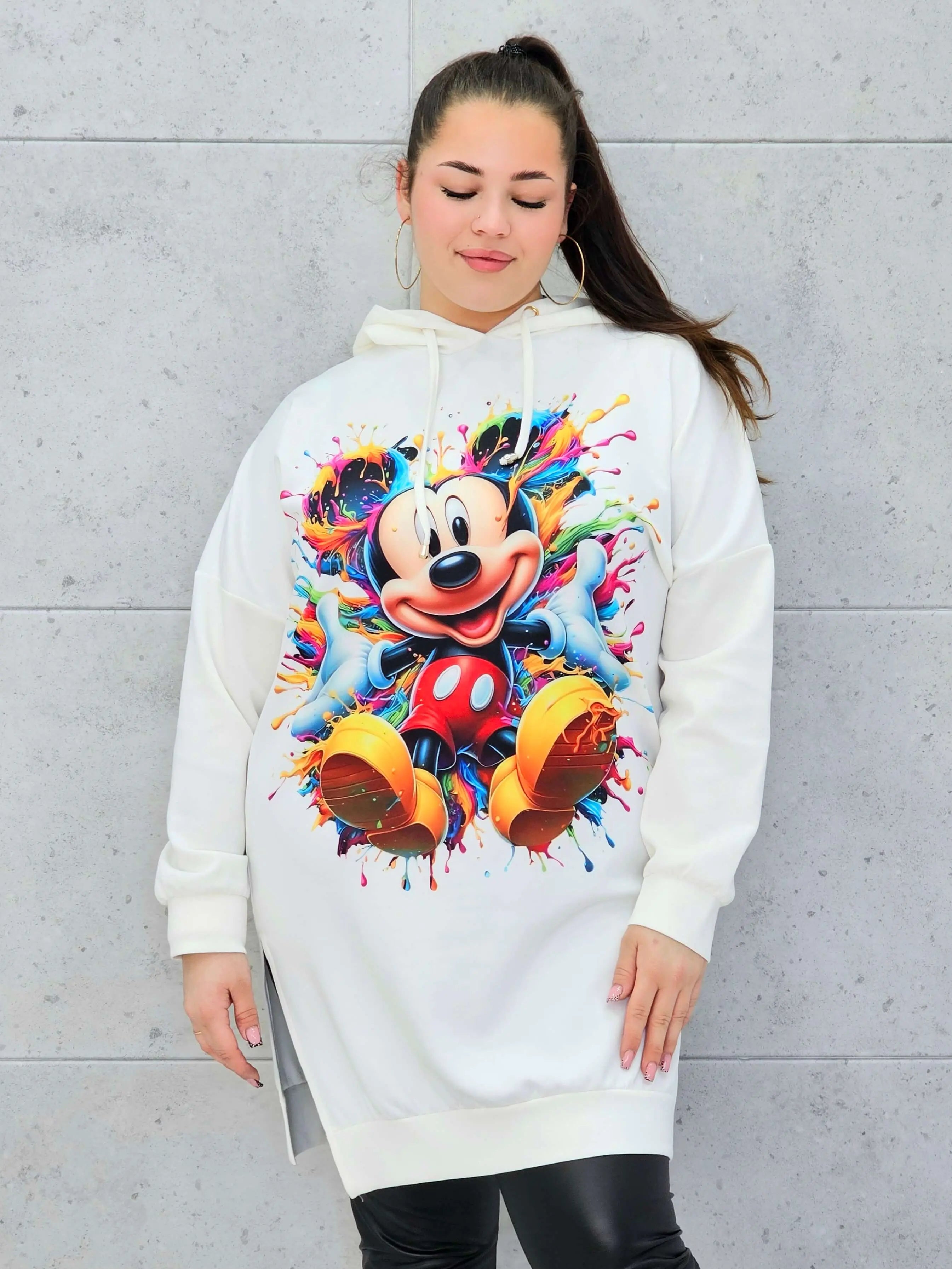 Bluza sukienkowa plus size to idealny wybór dla kobiet, które chcą połączyć wygodę z energetycznym, nowoczesnym stylem. Jej oversize’owy krój pięknie układa się na sylwetce XXL, zapewniając pełną swobodę ruchów. Duży, kolorowy nadruk bajkowych postaci dodaje całości uroku i sprawia, że model świetnie wpisuje się w radosny, modny klimat mody plus size.
