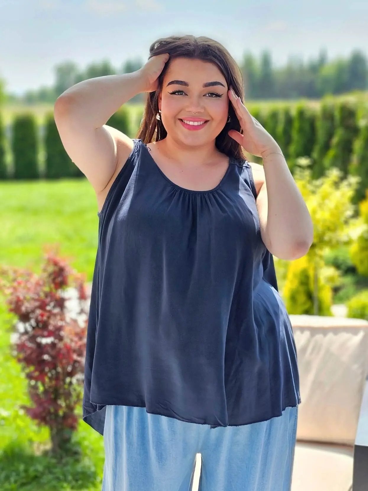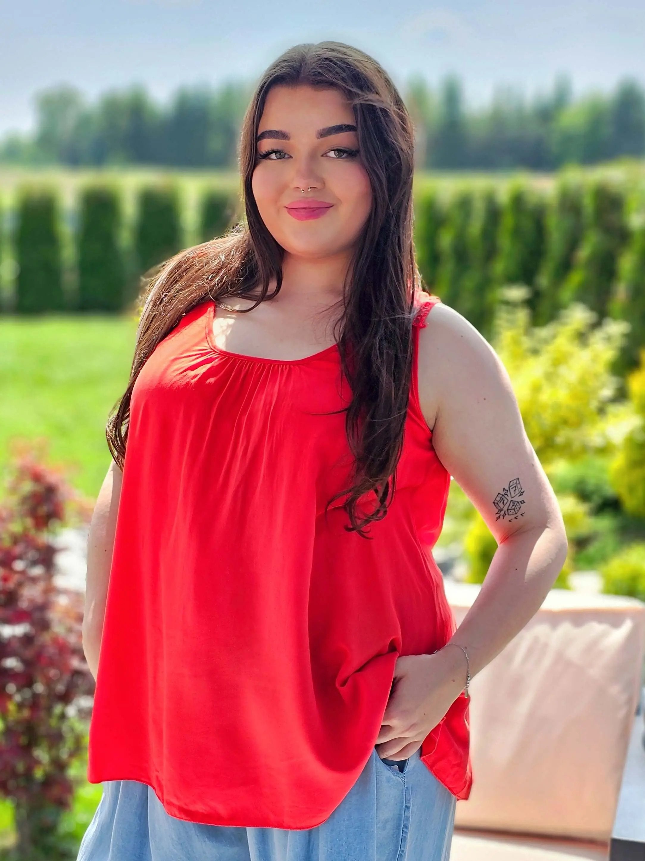Elegancka bluzka bez rękawów z wyjątkowym koronkowym panelem na plecach. Idealna na ciepłe dni, doskonale pasuje do dżinsów czy białych spodni. Luźny krój zapewnia komfort noszenia, a koronkowy detal dodaje subtelnej elegancji i wyjątkowego charakteru.