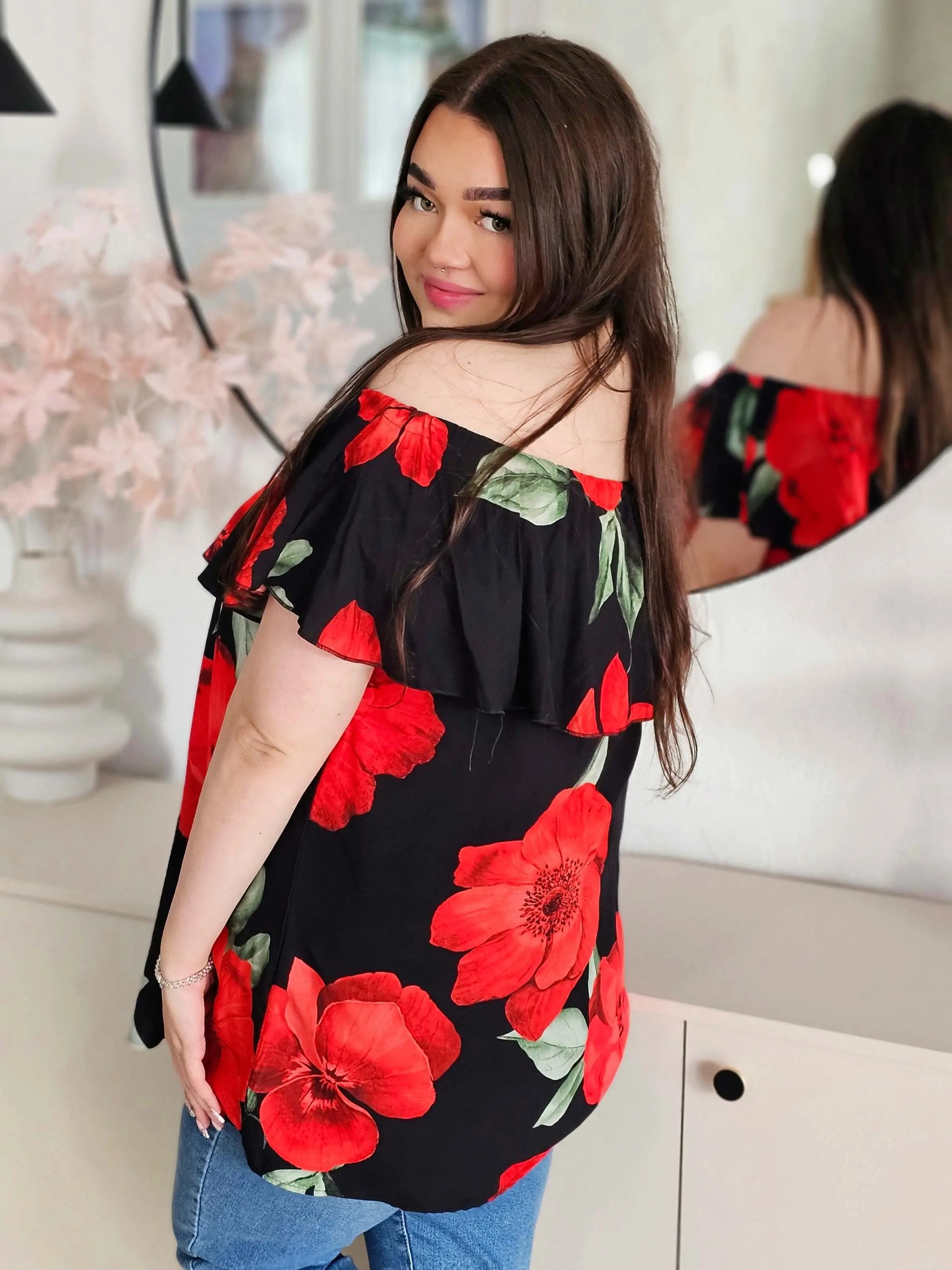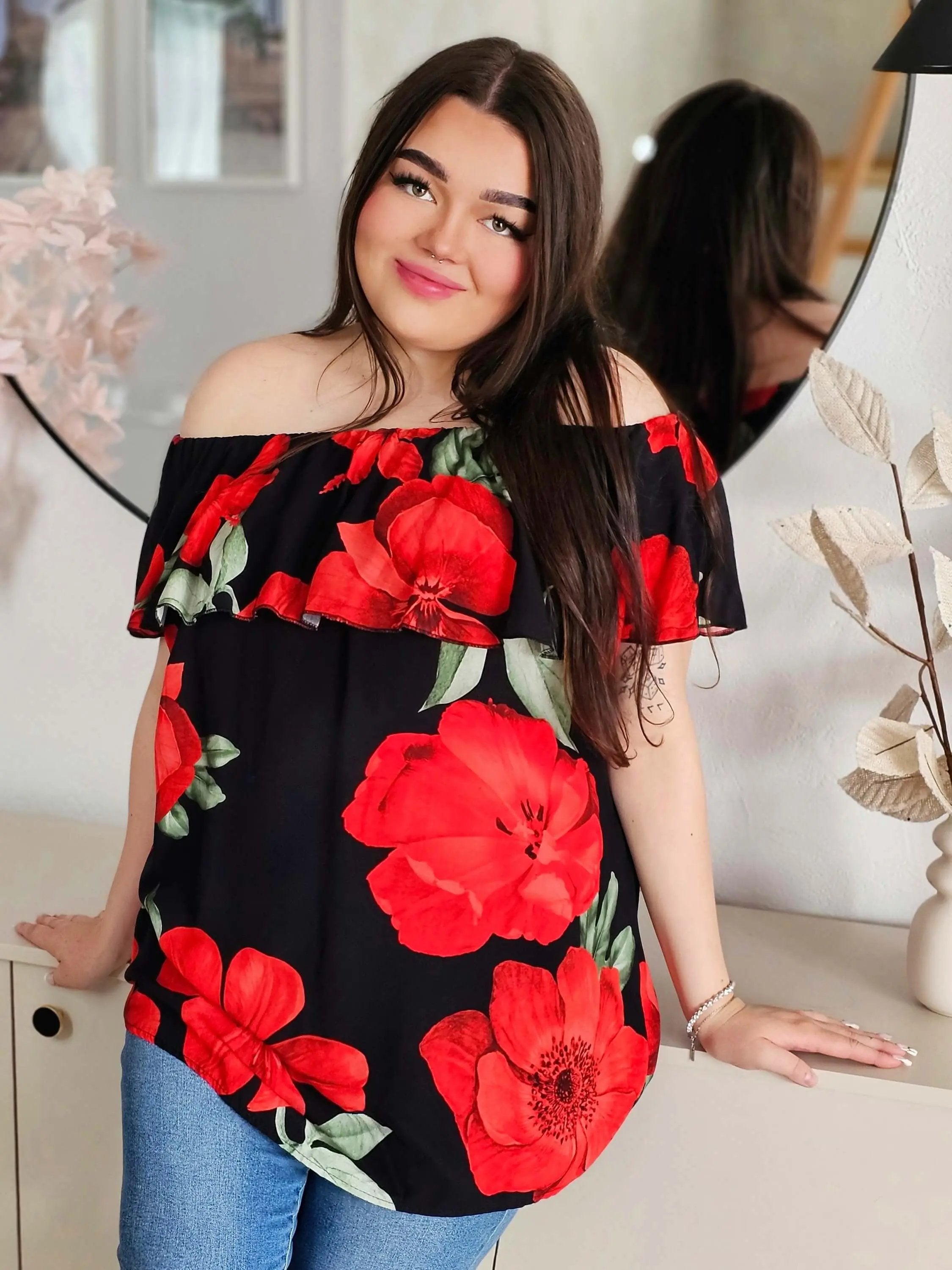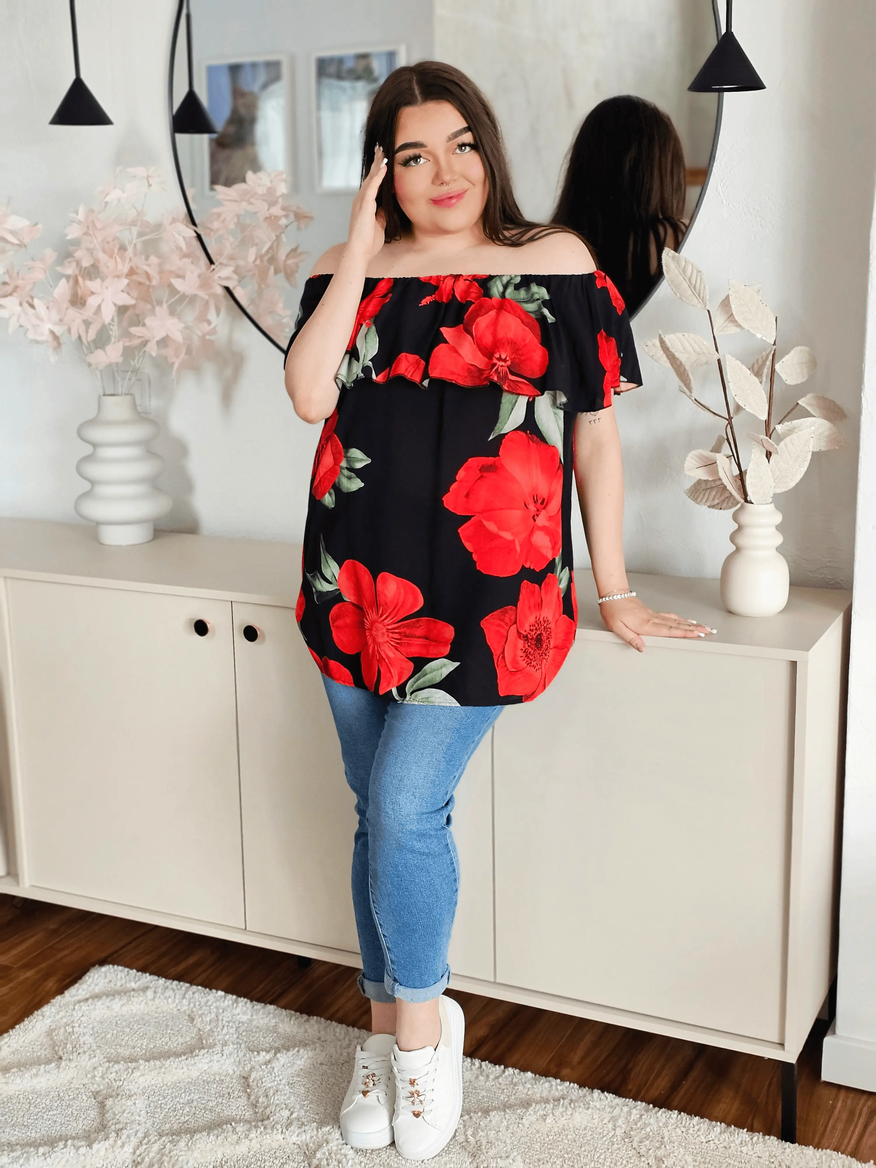 Zachwycaj w letnim wydaniu! Ta bluzka z odkrytymi ramionami i dużym kwiatowym printem to kwintesencja kobiecego stylu z nutą egzotyki. Intensywnie czerwone kwiaty na czarnym tle przyciągają spojrzenia, a luźny fason gwarantuje swobodę ruchów i komfort noszenia.