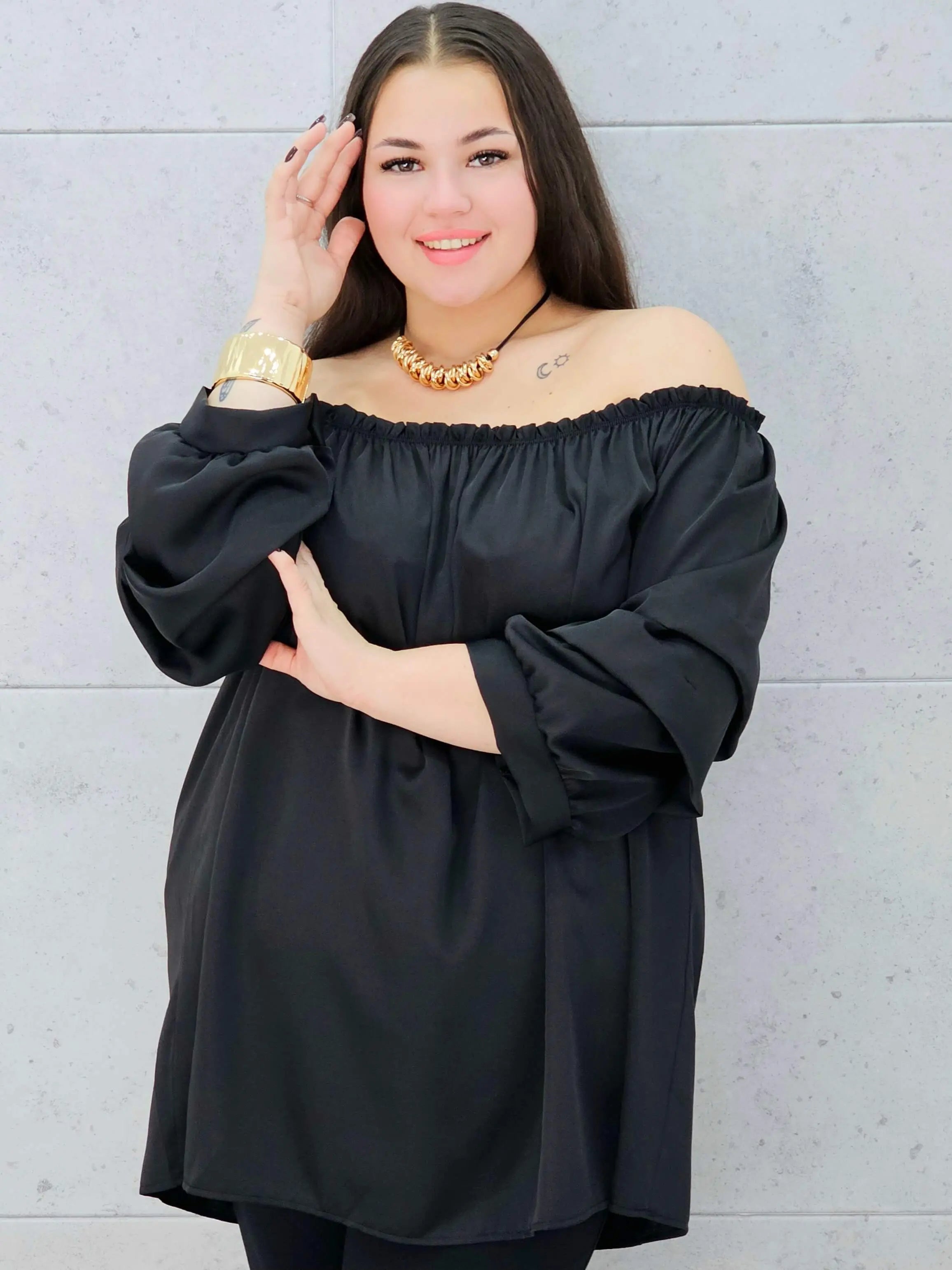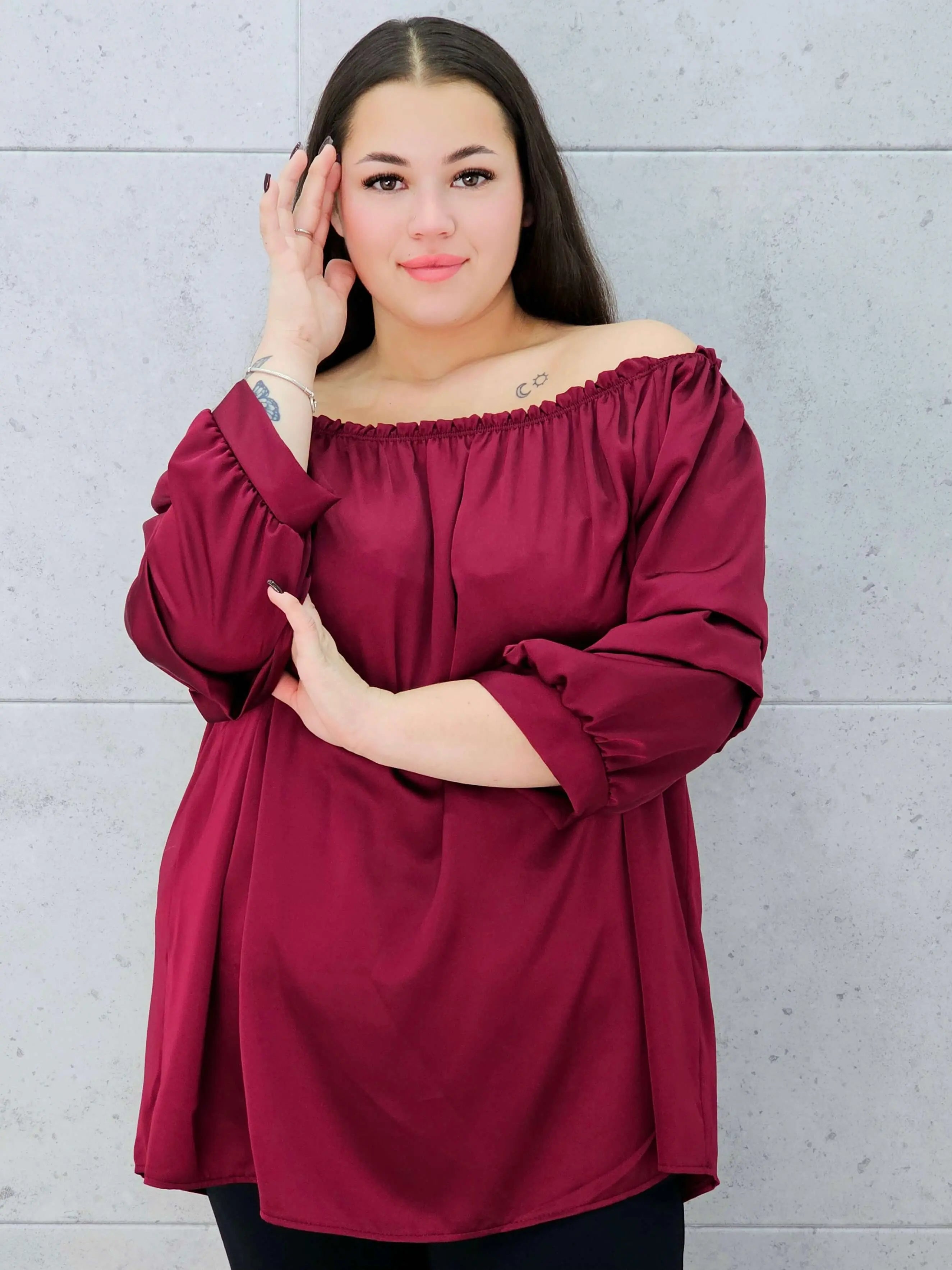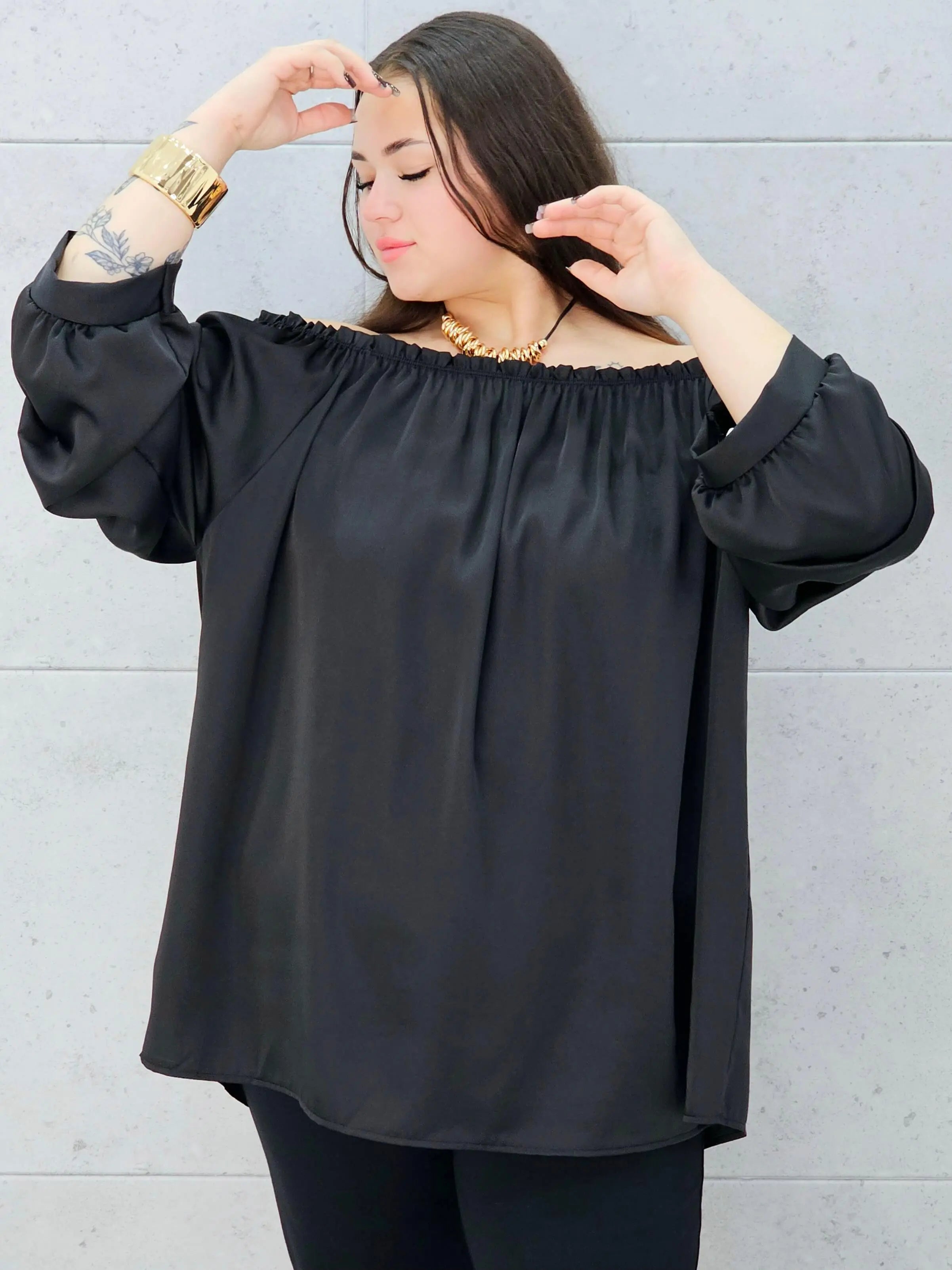 Nasza bluzka hiszpanka xxl to połączenie elegancji i komfortu w najlepszym wydaniu. Delikatny materiał pięknie się układa, a dekolt typu hiszpanka podkreśla ramiona i dodaje bluzce lekkości.