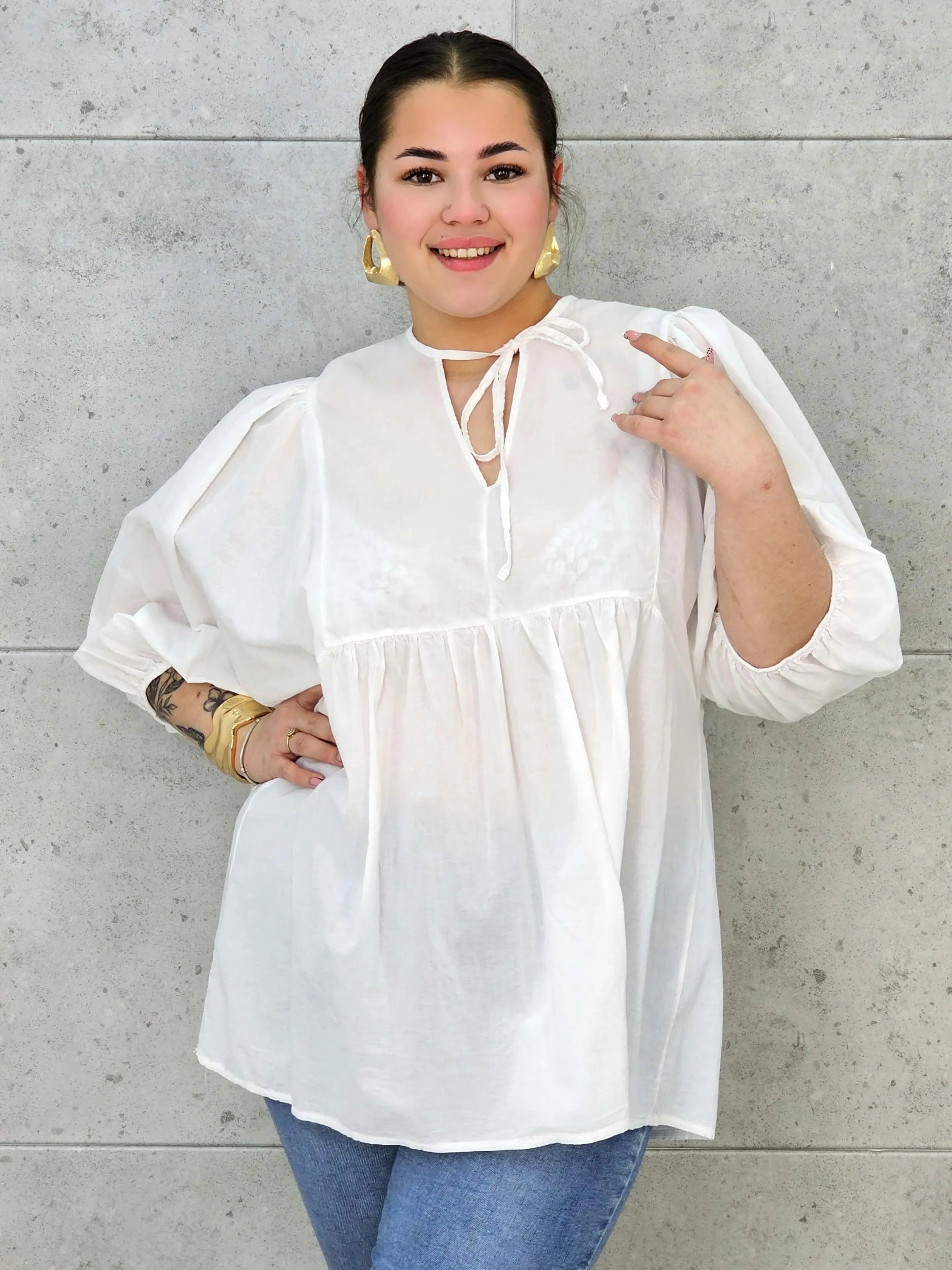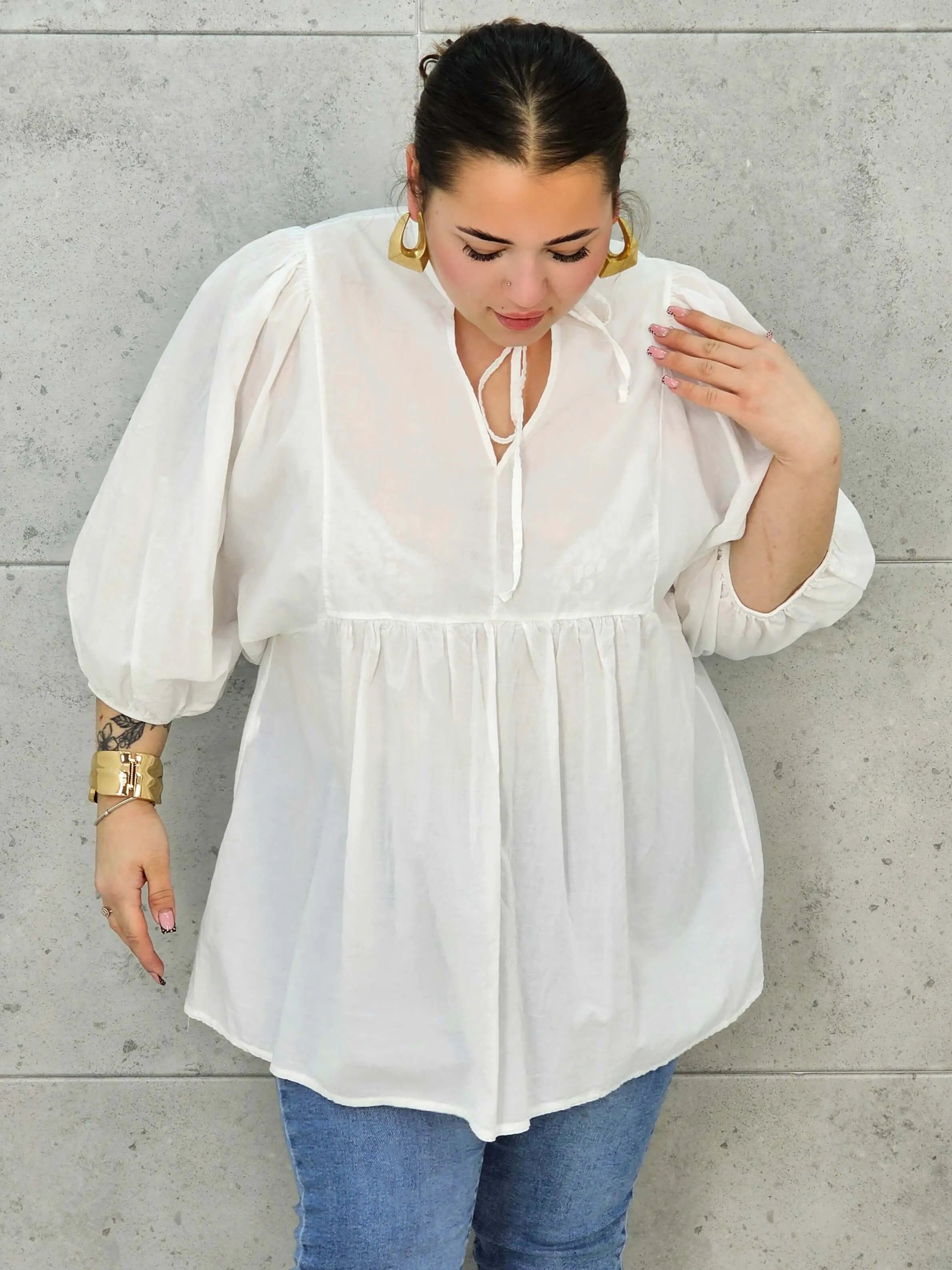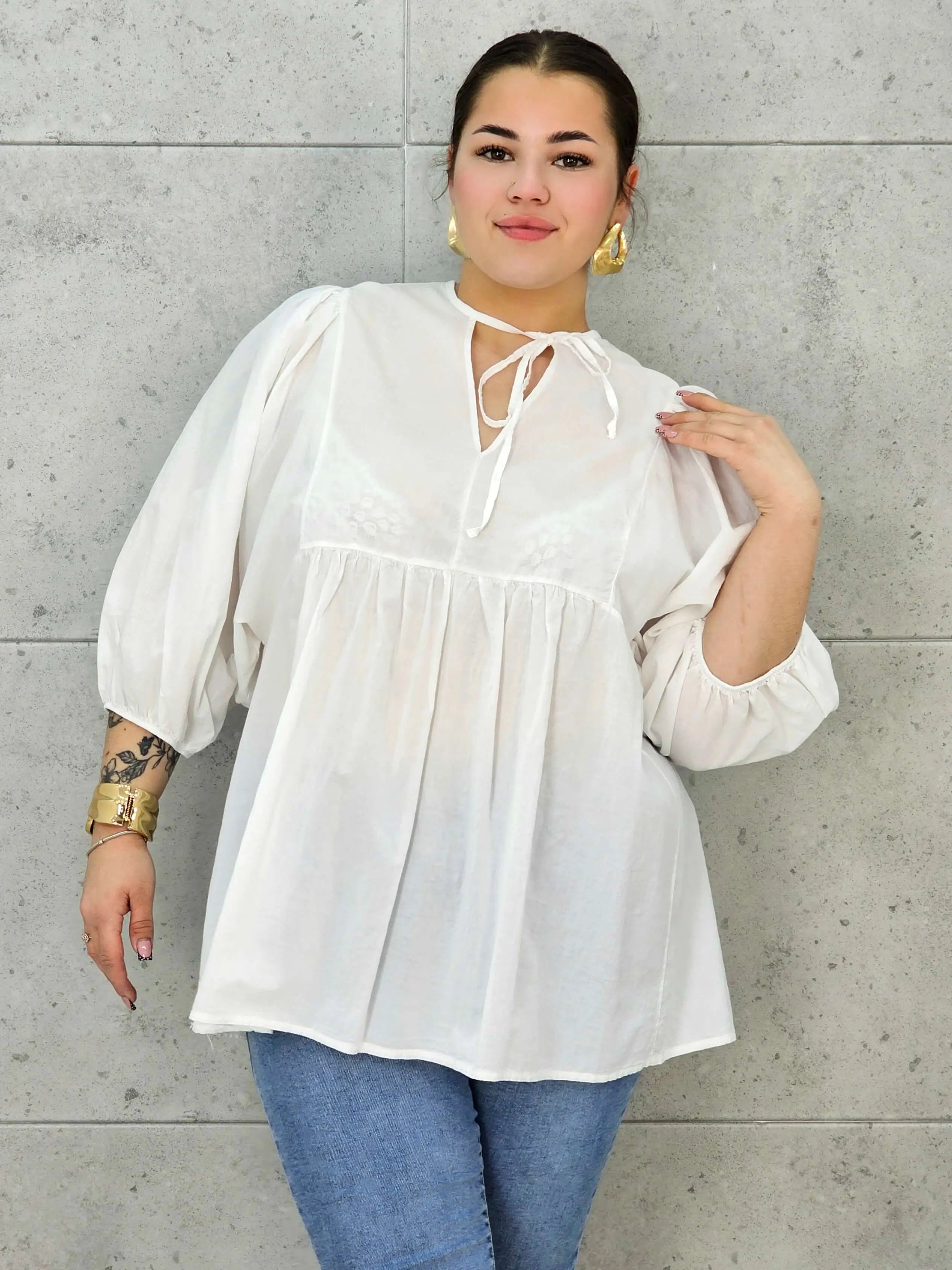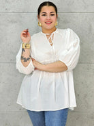 Bluzka plus size to idealny model dla kobiet, które uwielbiają lekkość, swobodę i subtelnie romantyczny styl. Zwiewny materiał pięknie układa się na sylwetce, a delikatne marszczenia pod linią biustu dodają całości dziewczęcego uroku. Dekolt z wiązaniem wprowadza nutę elegancji, a bufiaste rękawy nadają nowoczesny, modowy charakter.