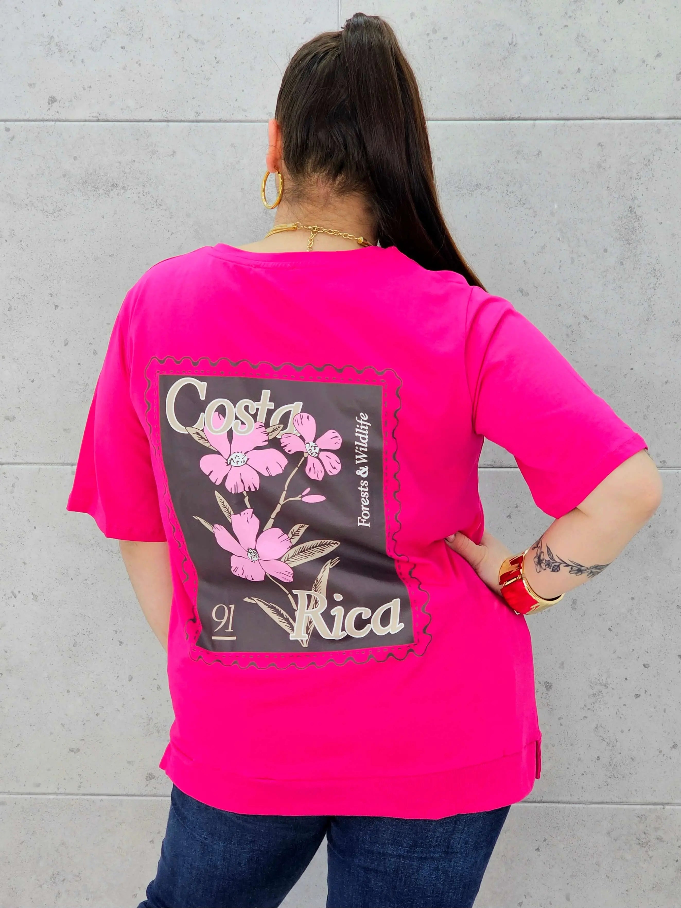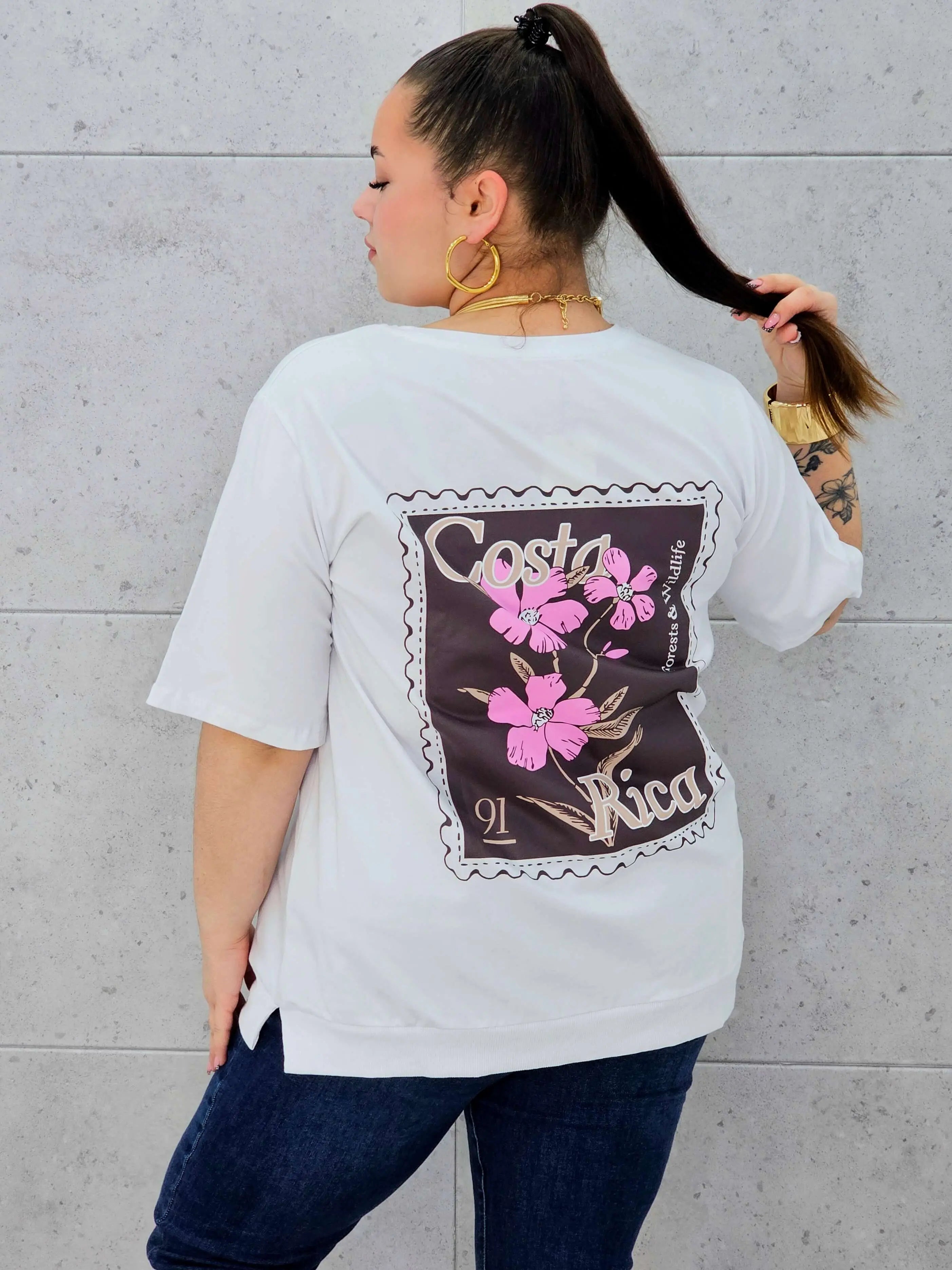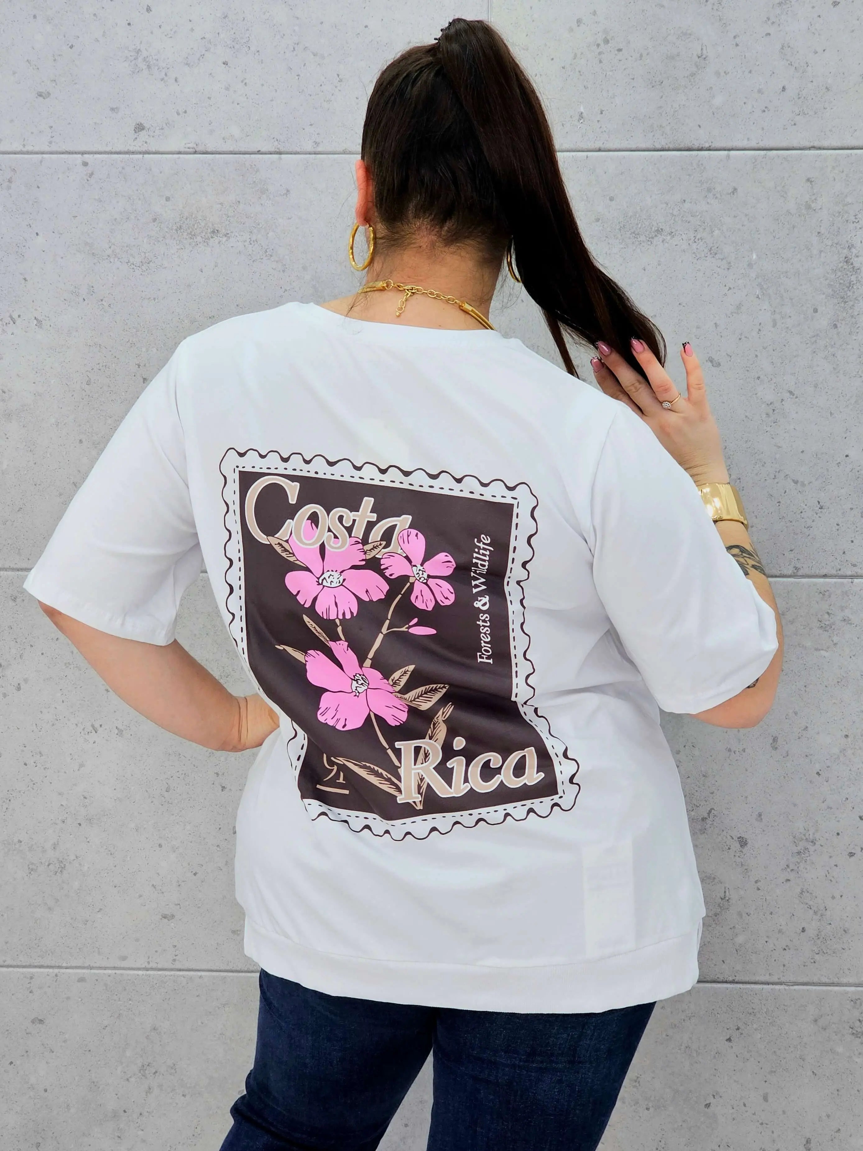 Wykonana z lekkiego, przewiewnego materiału, bluzka dla kobiet plus size doskonale sprawdza się w upalne dni. Luźny krój zapewnia swobodę ruchów i wygodę przez cały dzień, a przyciągający wzrok florystyczny nadruk z napisem „Costa Rica” dodaje całości wyjątkowego charakteru i wakacyjnego nastroju.