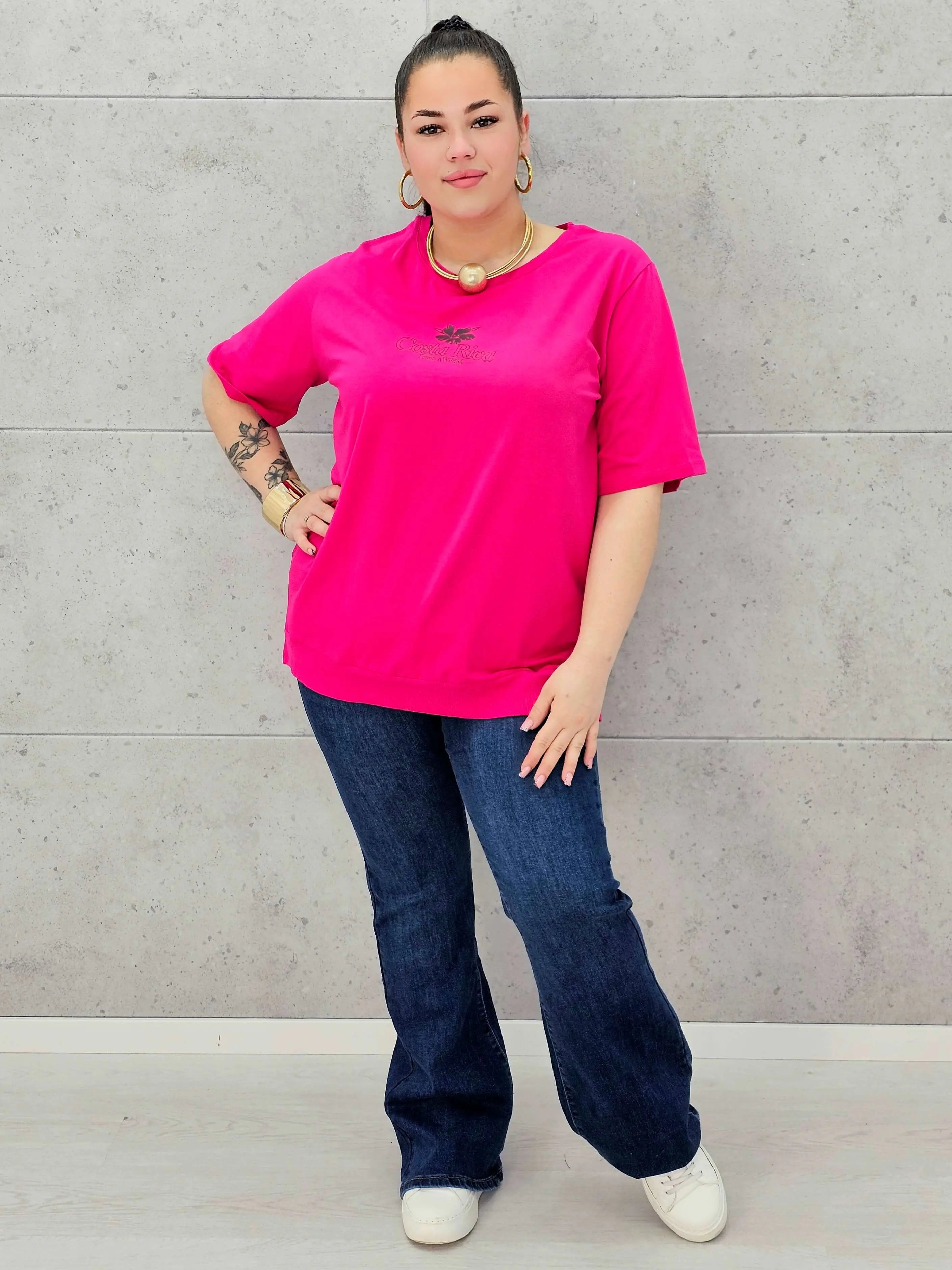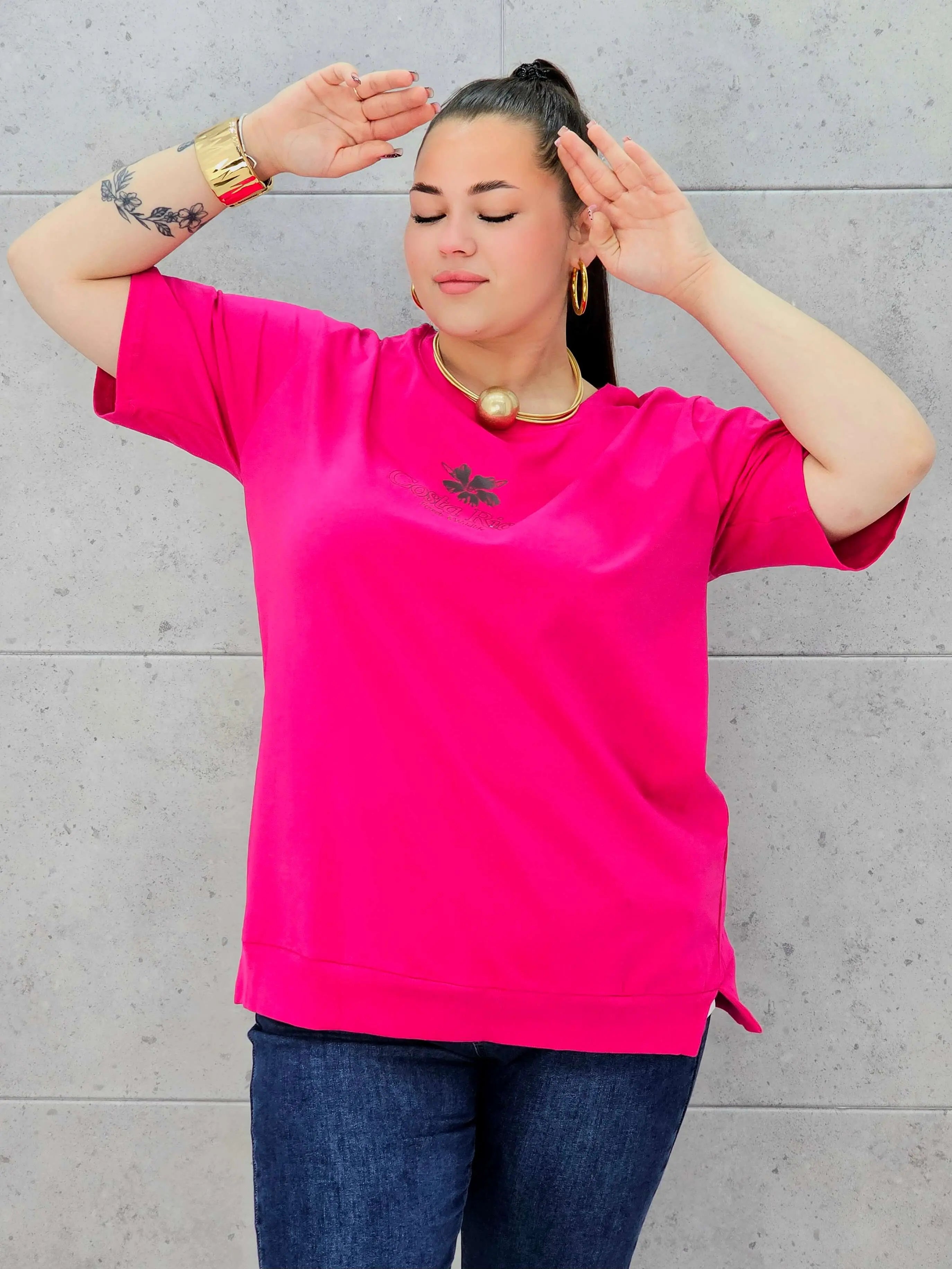 Dostępna w dwóch wariantach – z nadrukiem z przodu lub z tyłu – pozwala wyrazić swój styl na różne sposoby. To modna bluzka plus size idealna do jeansów, szortów lub spódnicy. W kolekcji StylowaXL – odzież plus size dla kobiet, ten model łączy świeżość, lekkość i modowy luz w najlepszym wydaniu.