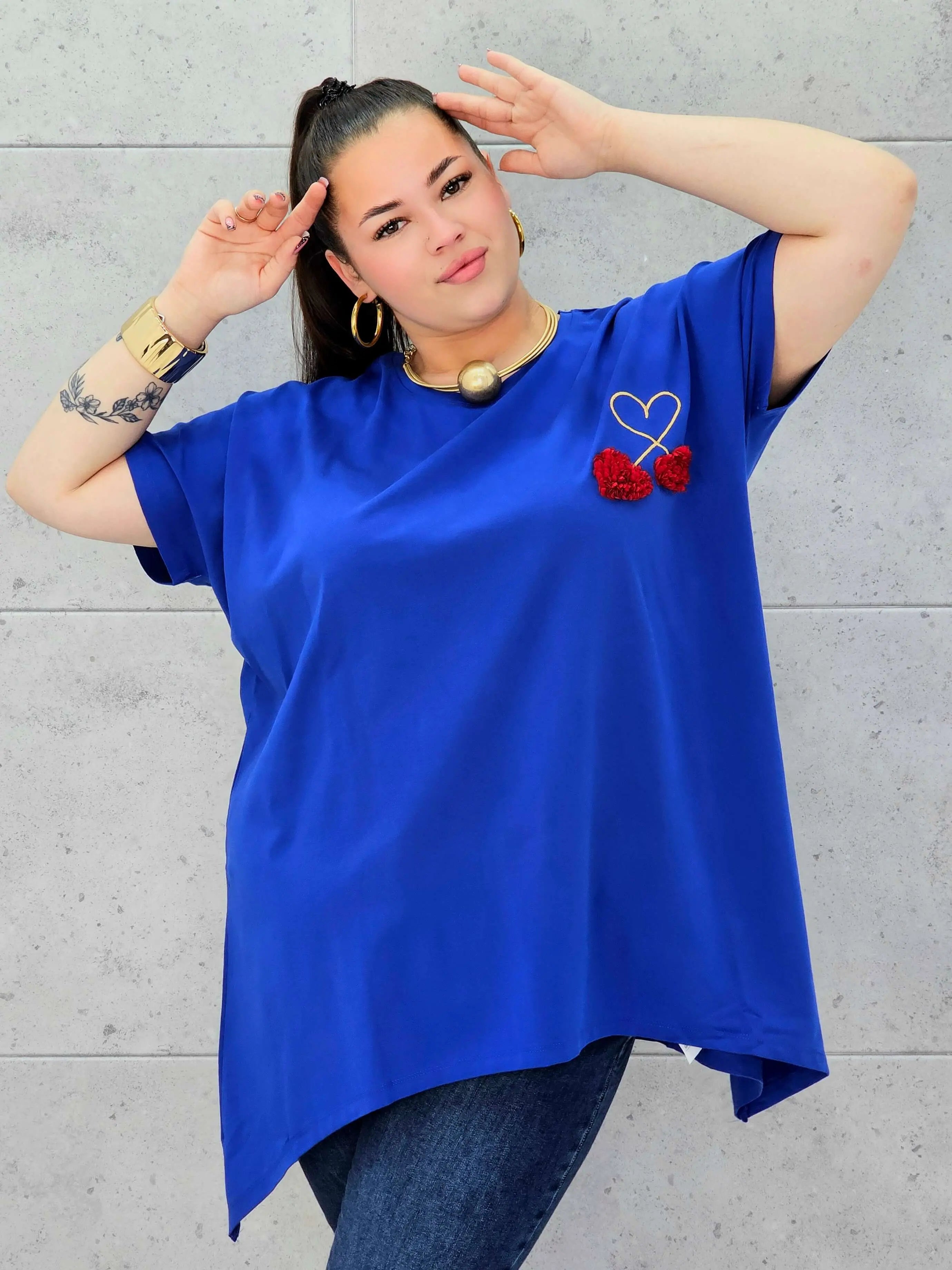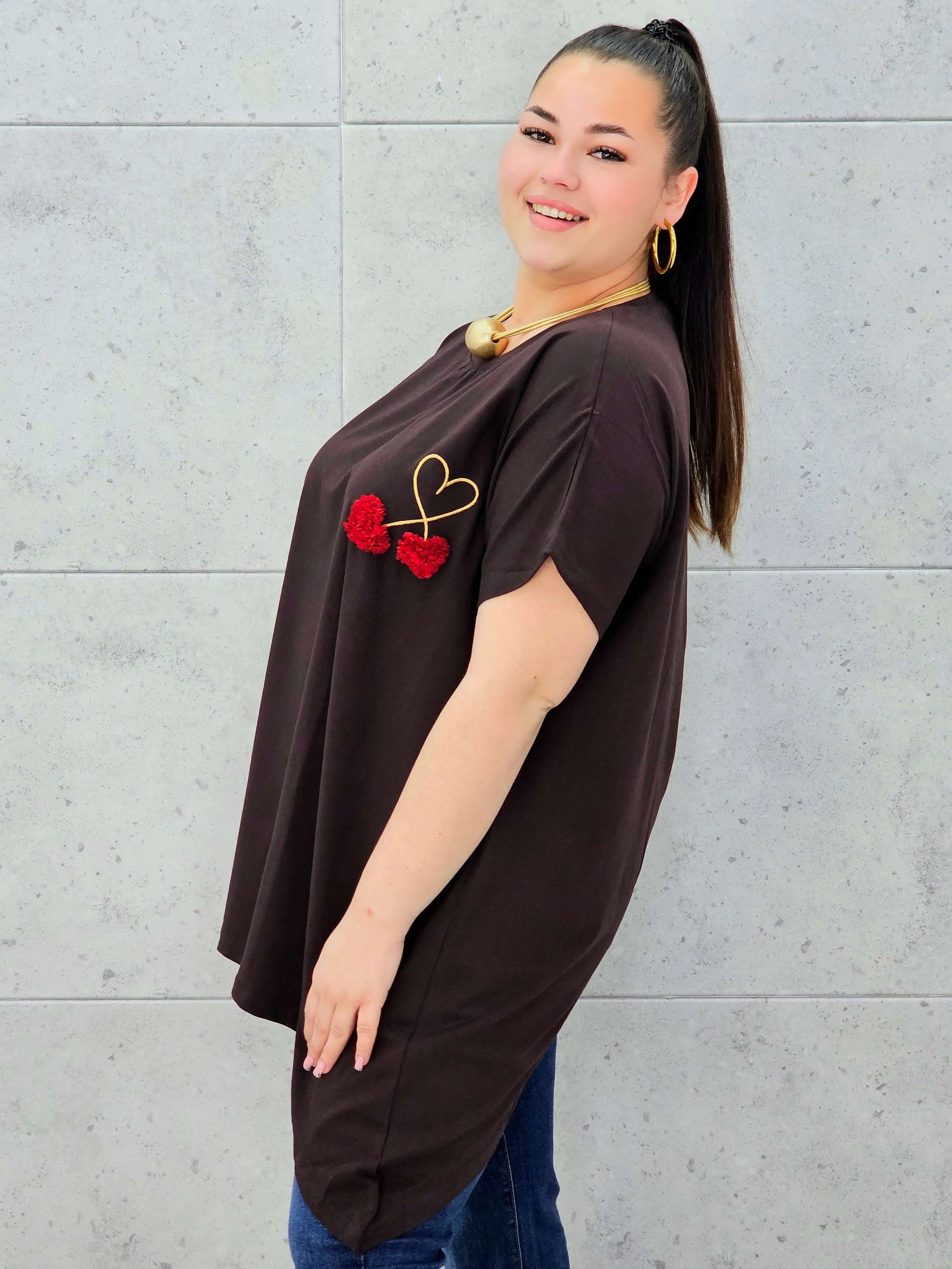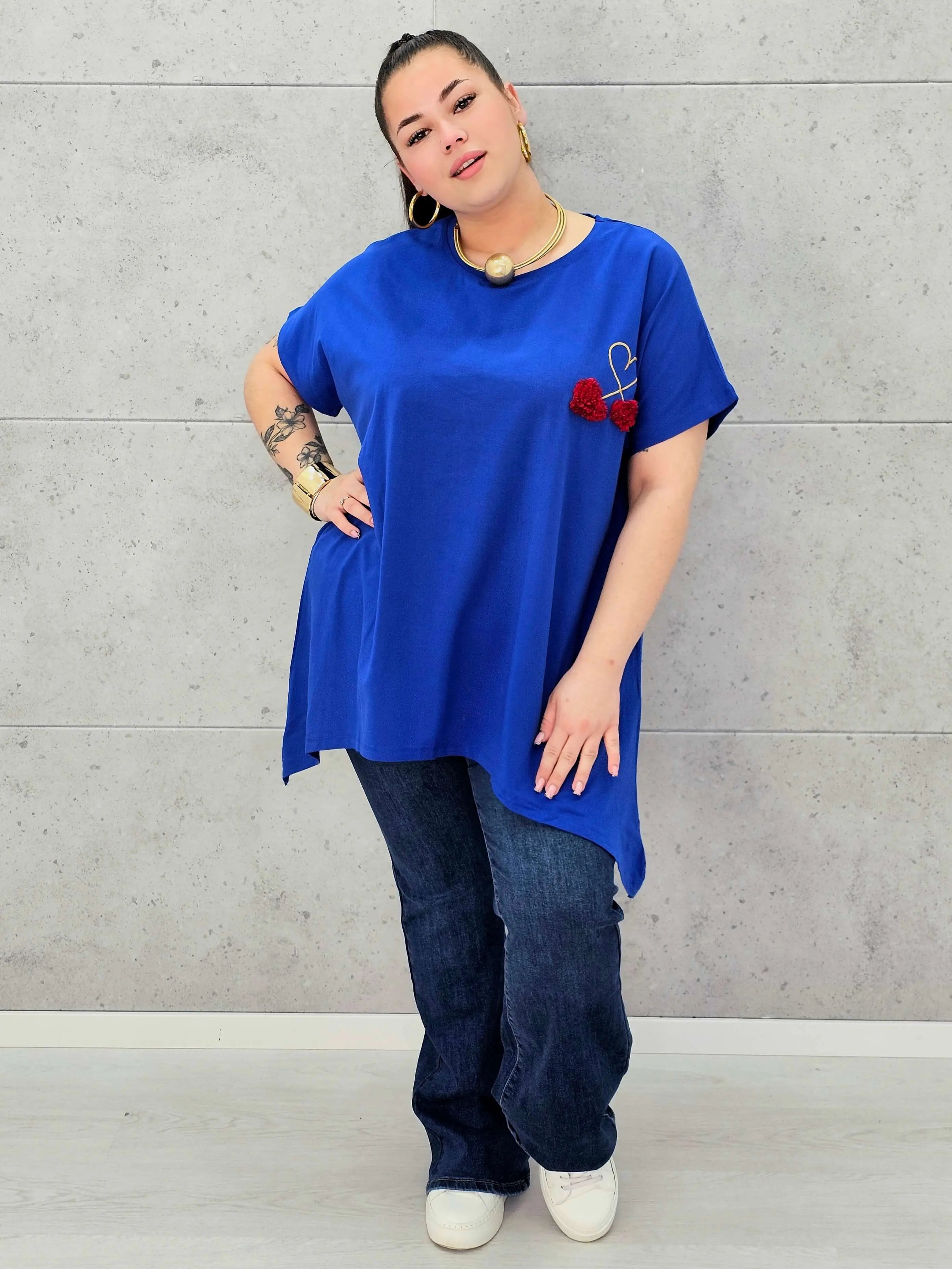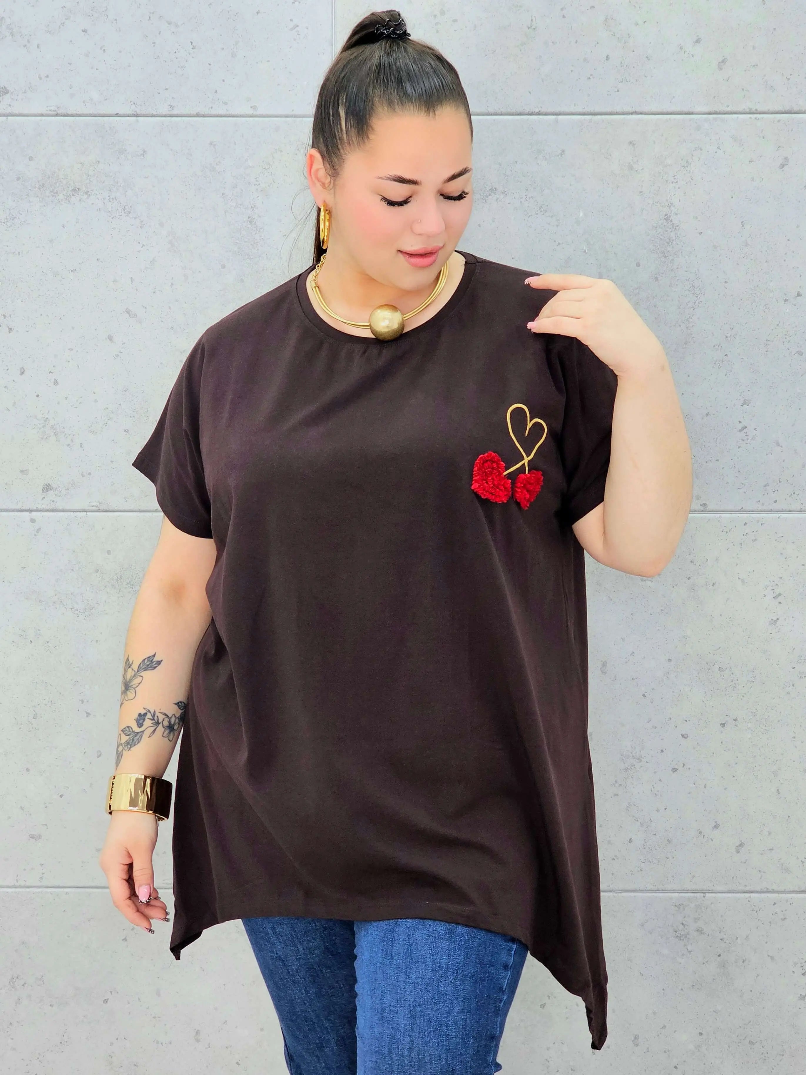 Bluzka plus size to połączenie minimalizmu, wygody i delikatnego, dziewczęcego detalu. Miękka, oddychająca tkanina otula sylwetkę XXL, zapewniając komfort noszenia przez cały dzień. Na przodzie znajduje się subtelne zdobienie w formie serca i trójwymiarowych wiśni, które dodaje całości uroku i sprawia, że bluzka świetnie wpisuje się w nowoczesną modę plus size.