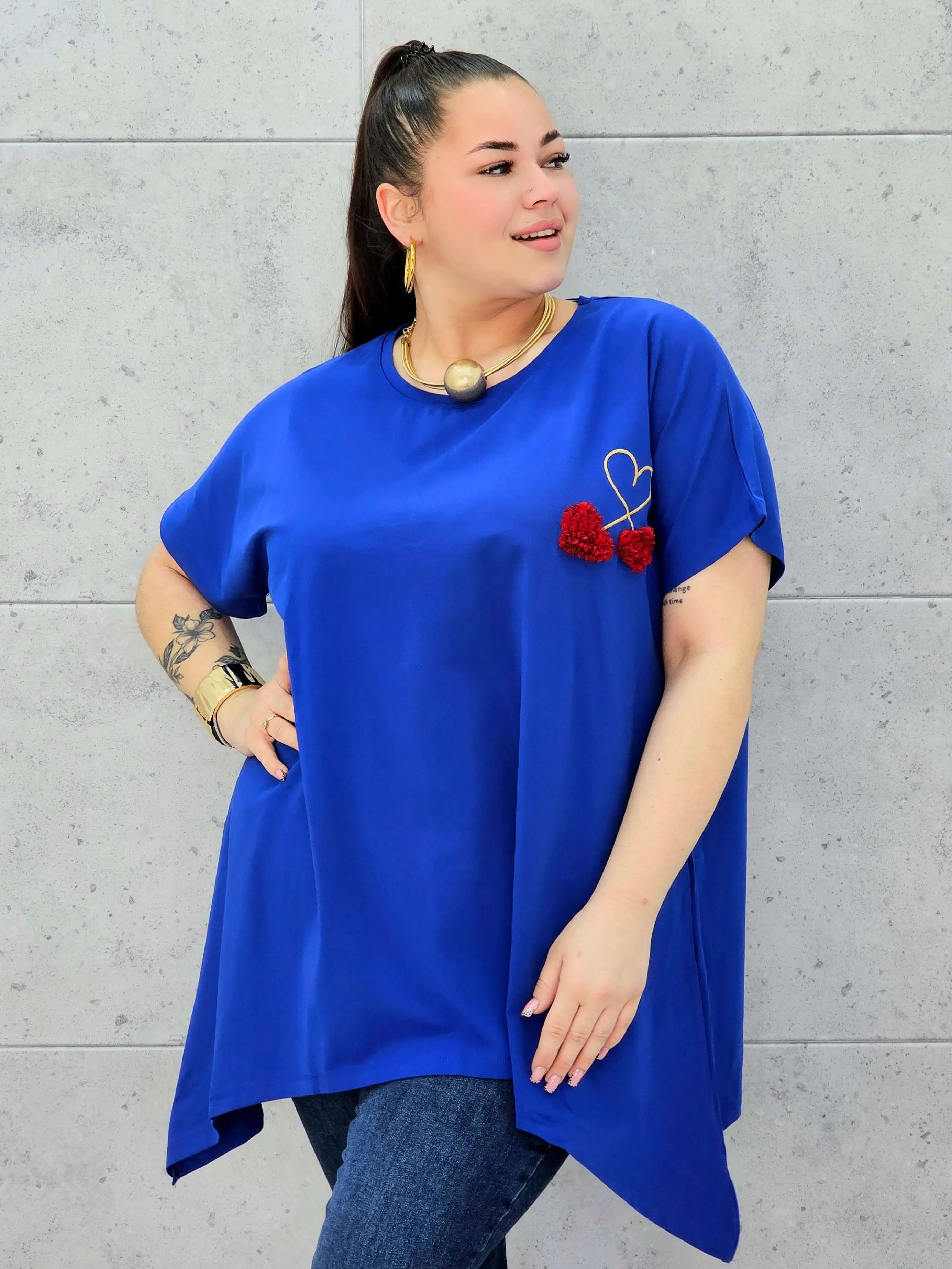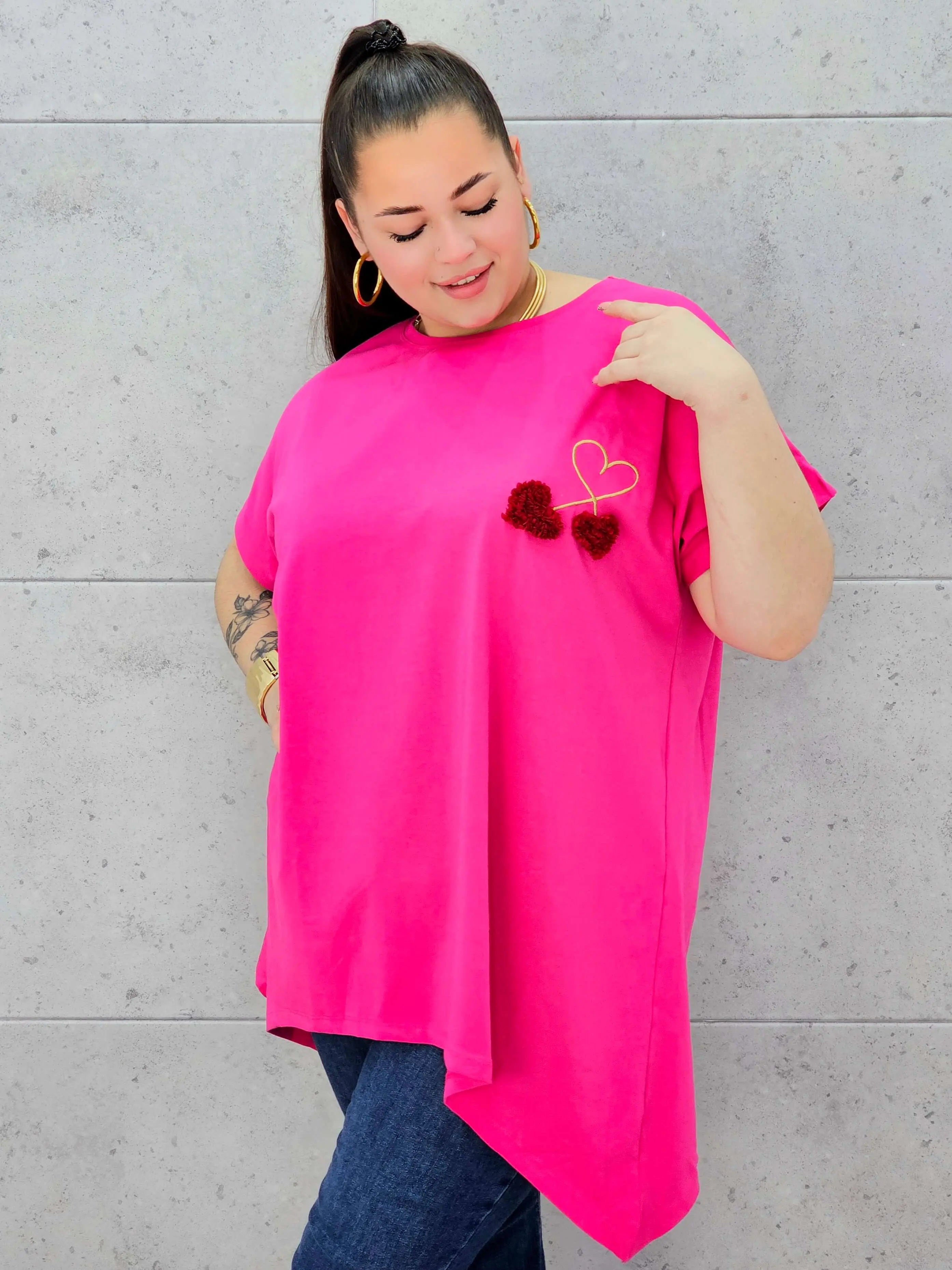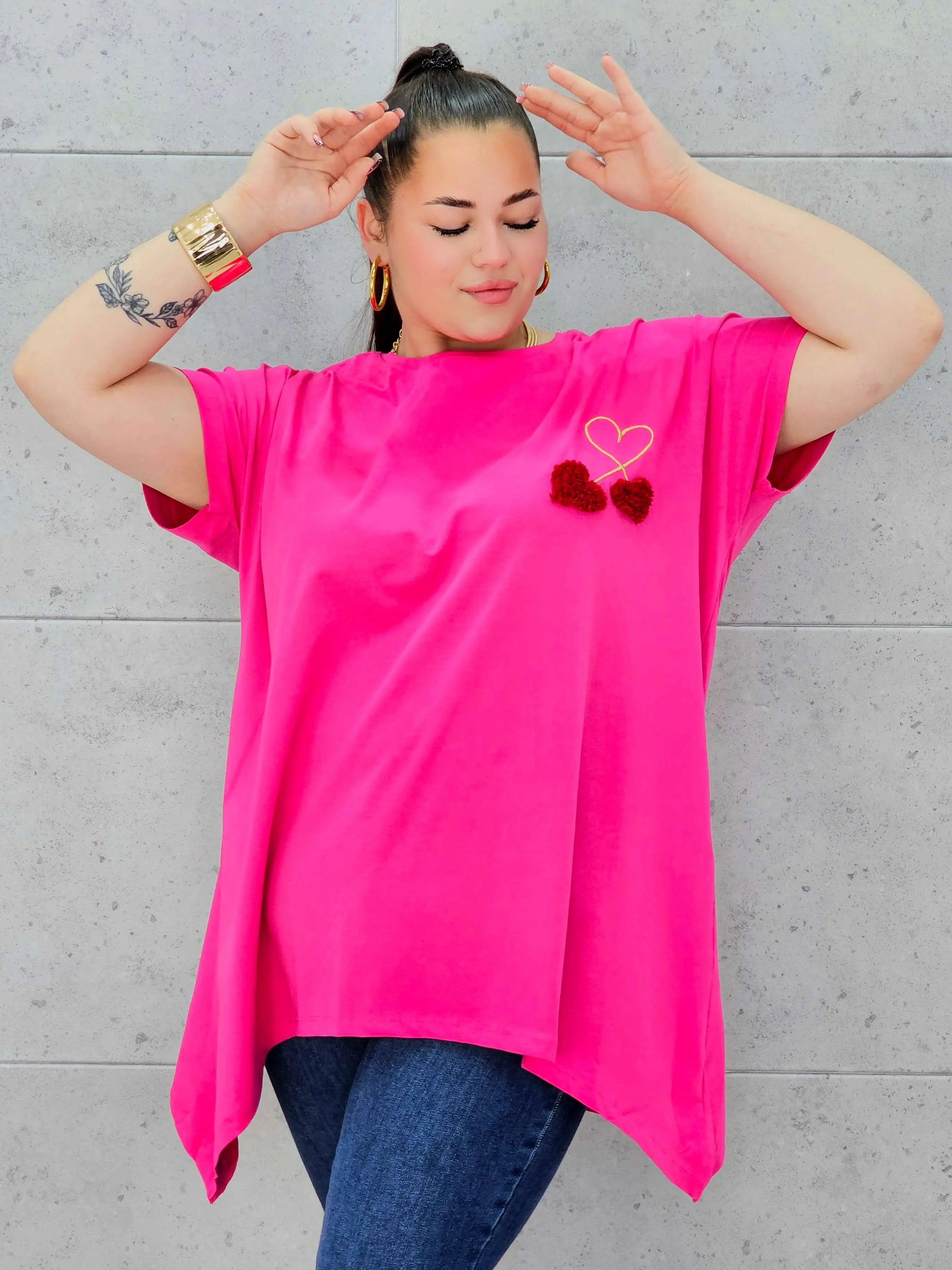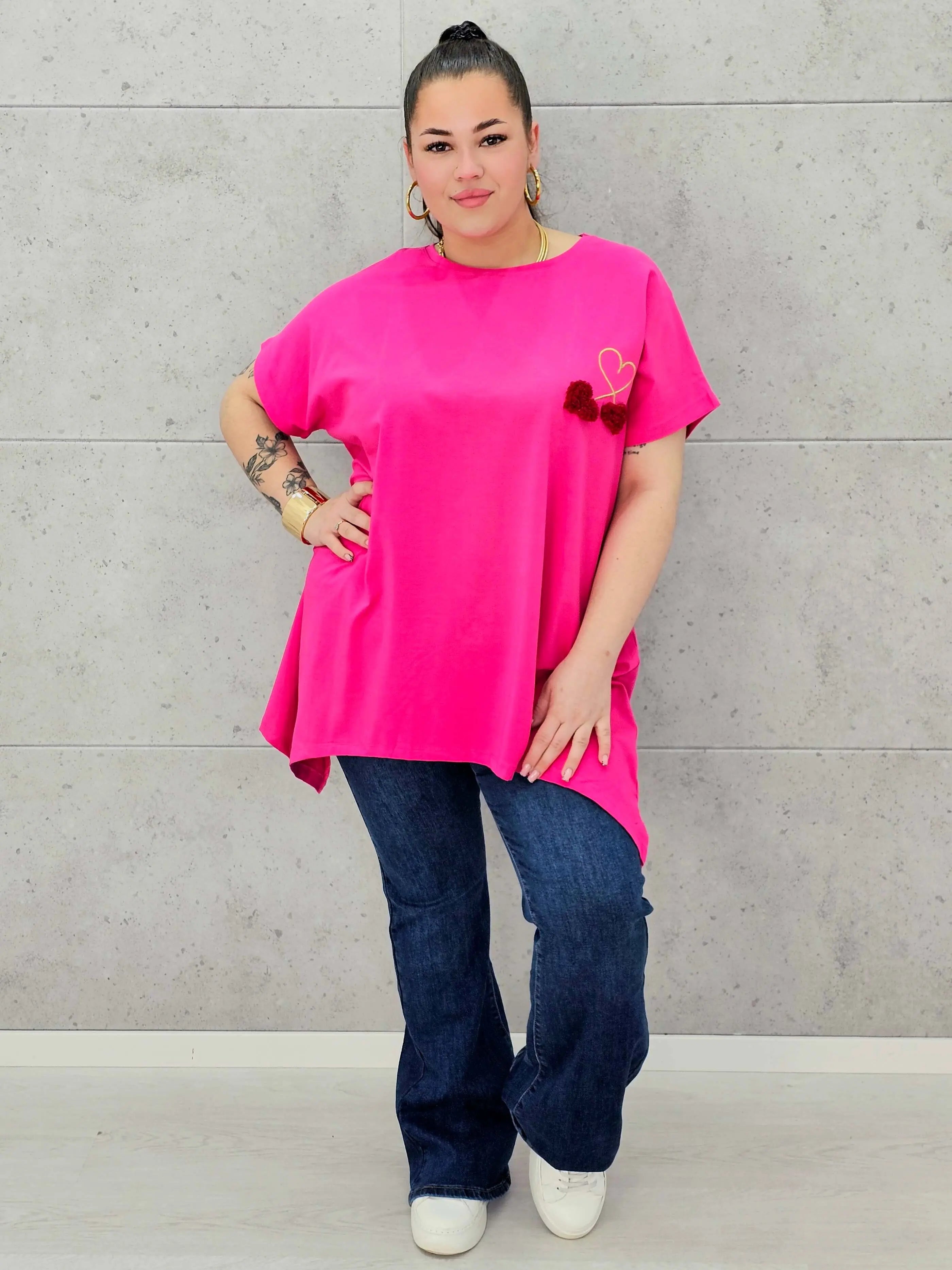 Bluzka plus size to połączenie minimalizmu, wygody i delikatnego, dziewczęcego detalu. Miękka, oddychająca tkanina otula sylwetkę XXL, zapewniając komfort noszenia przez cały dzień. Na przodzie znajduje się subtelne zdobienie w formie serca i trójwymiarowych wiśni, które dodaje całości uroku i sprawia, że bluzka świetnie wpisuje się w nowoczesną modę plus size.