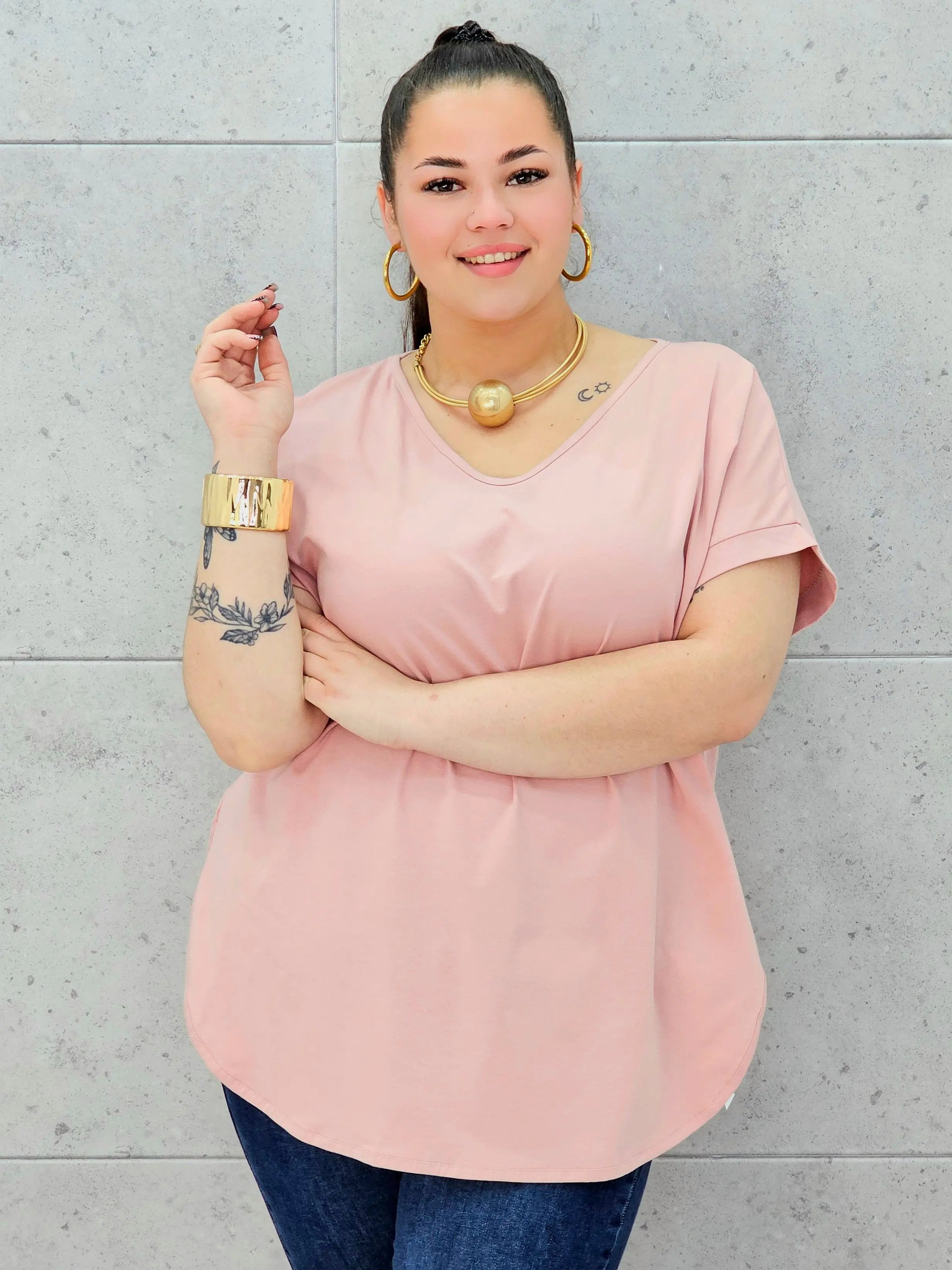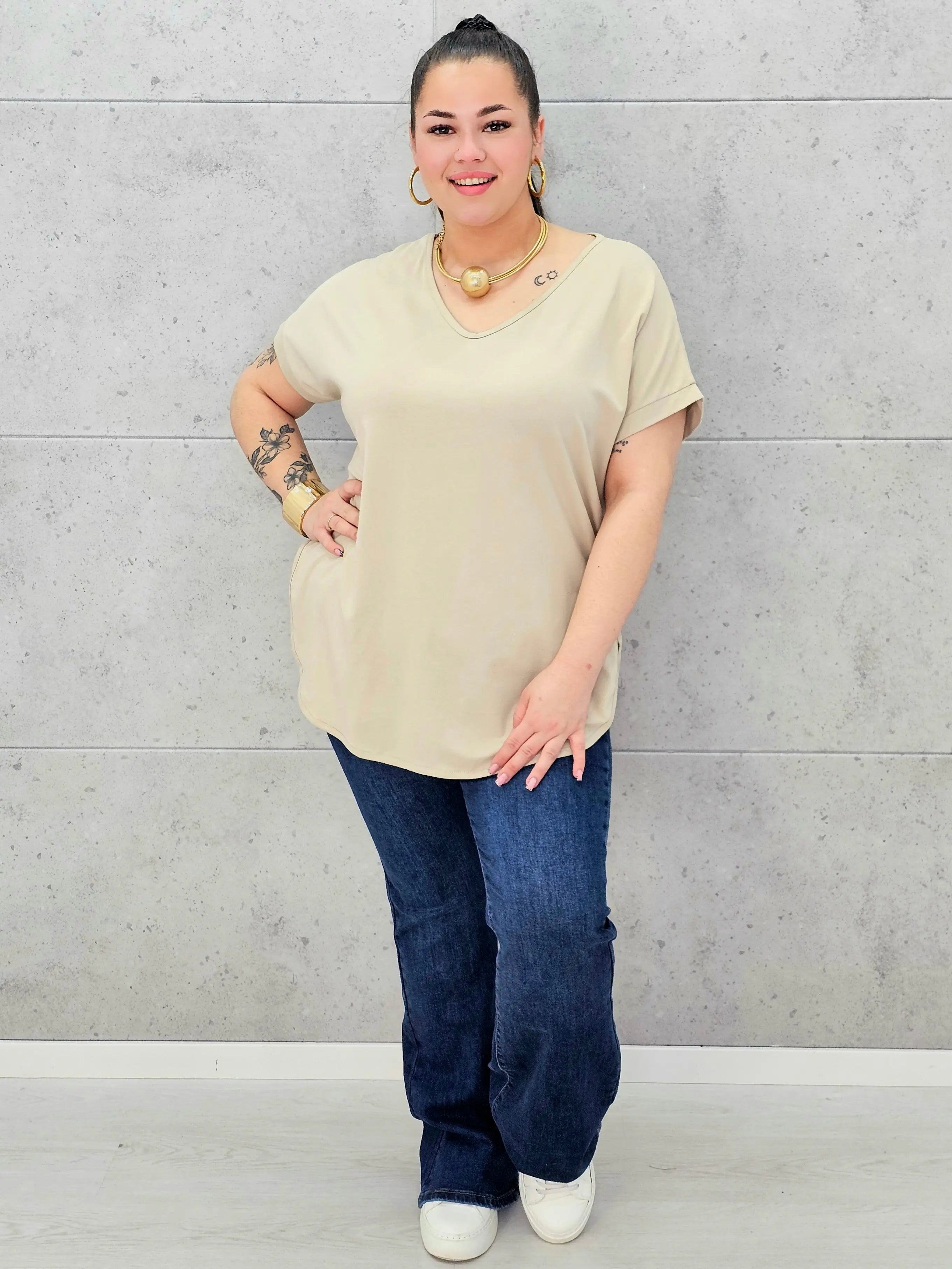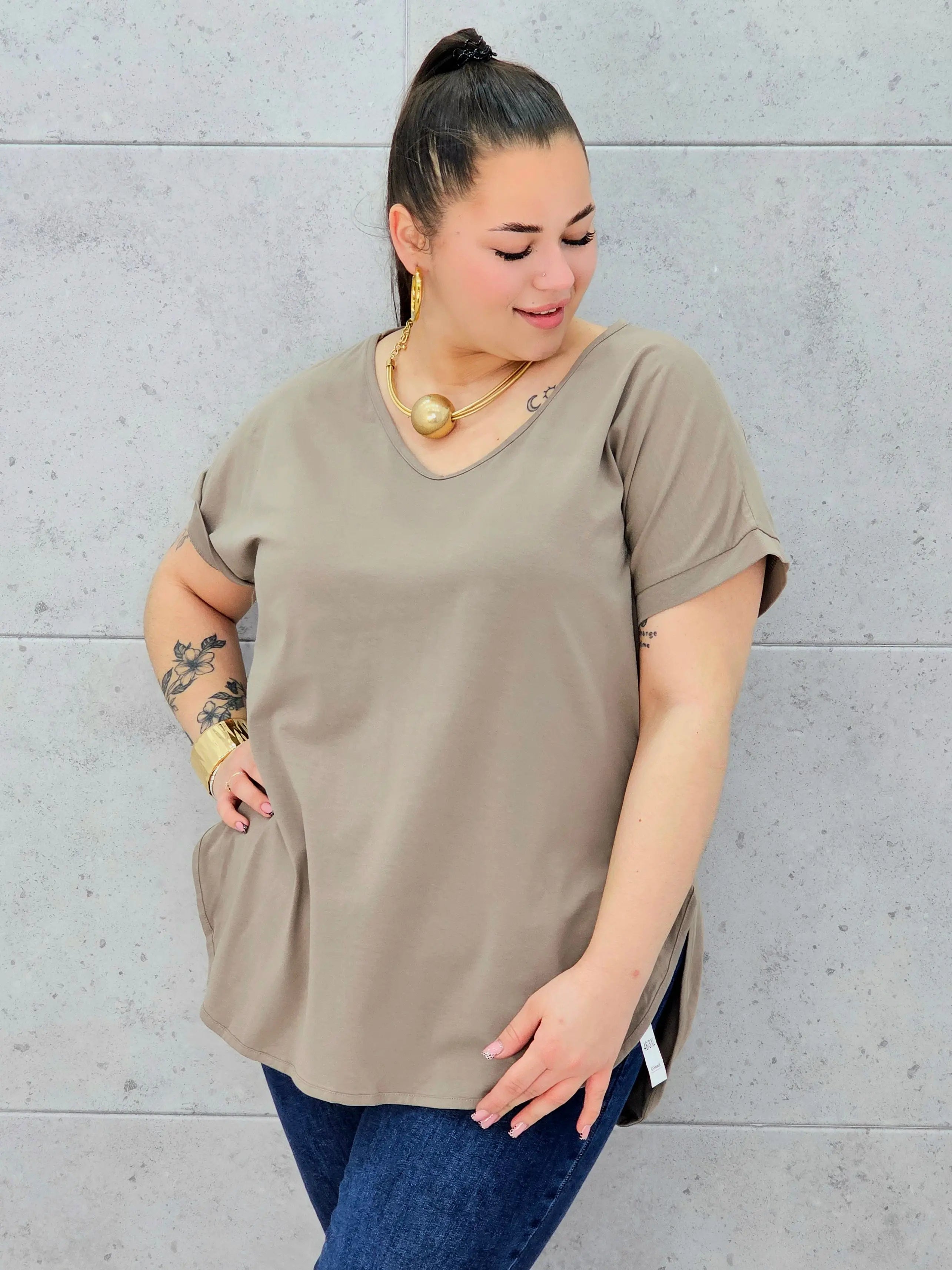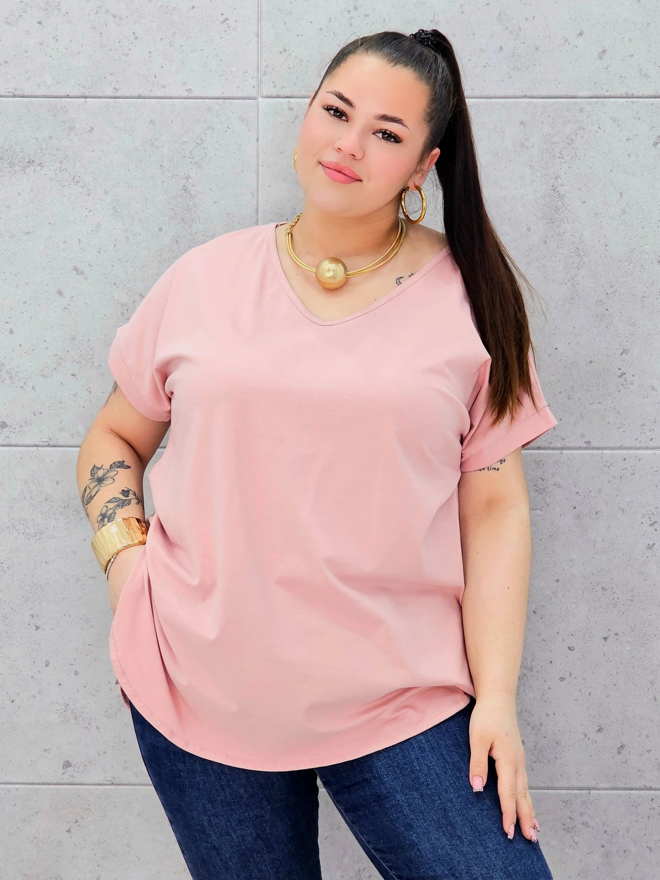 bluzka plus size z dekoltem V, który optycznie wysmukla górną partię sylwetki