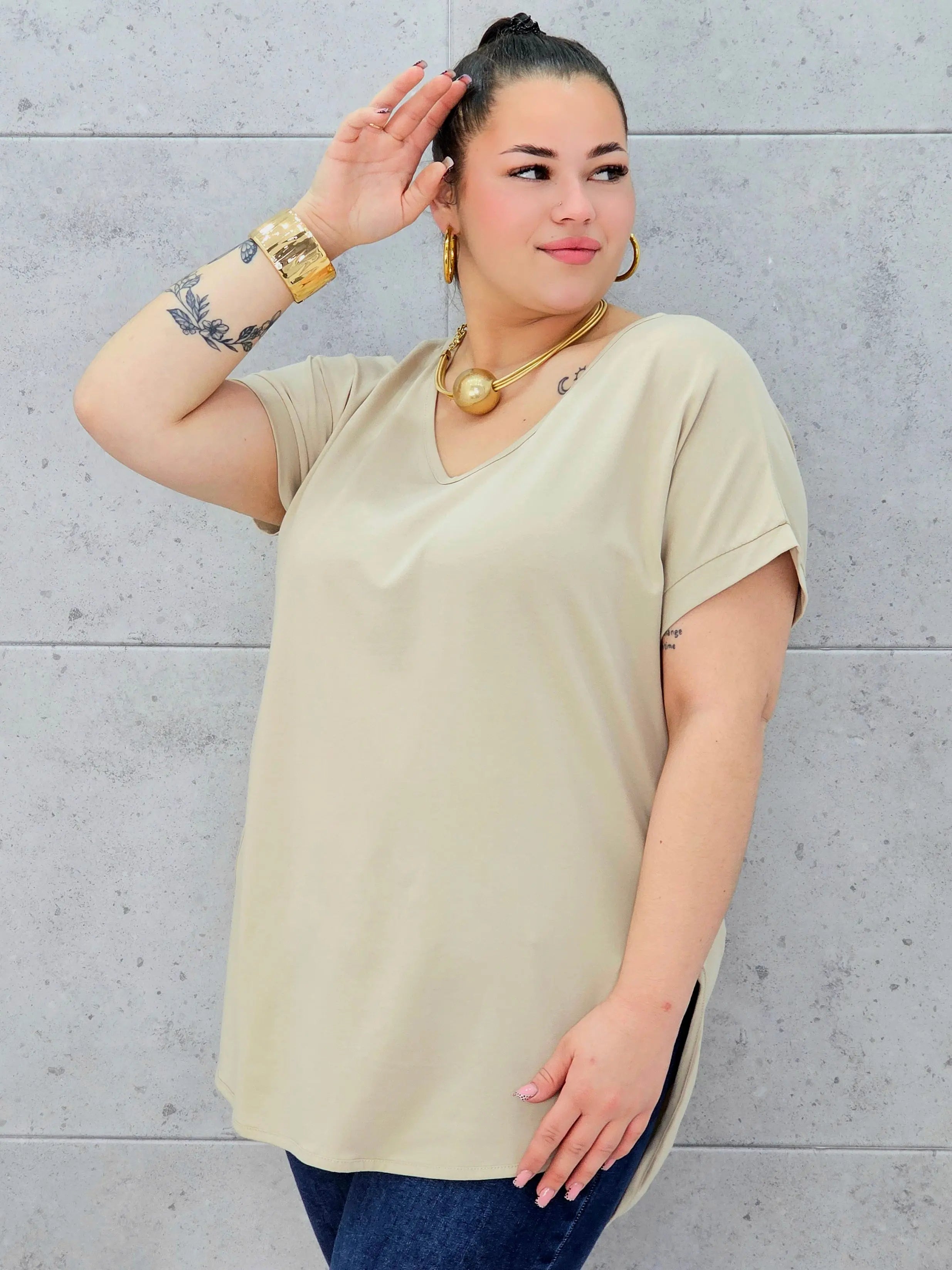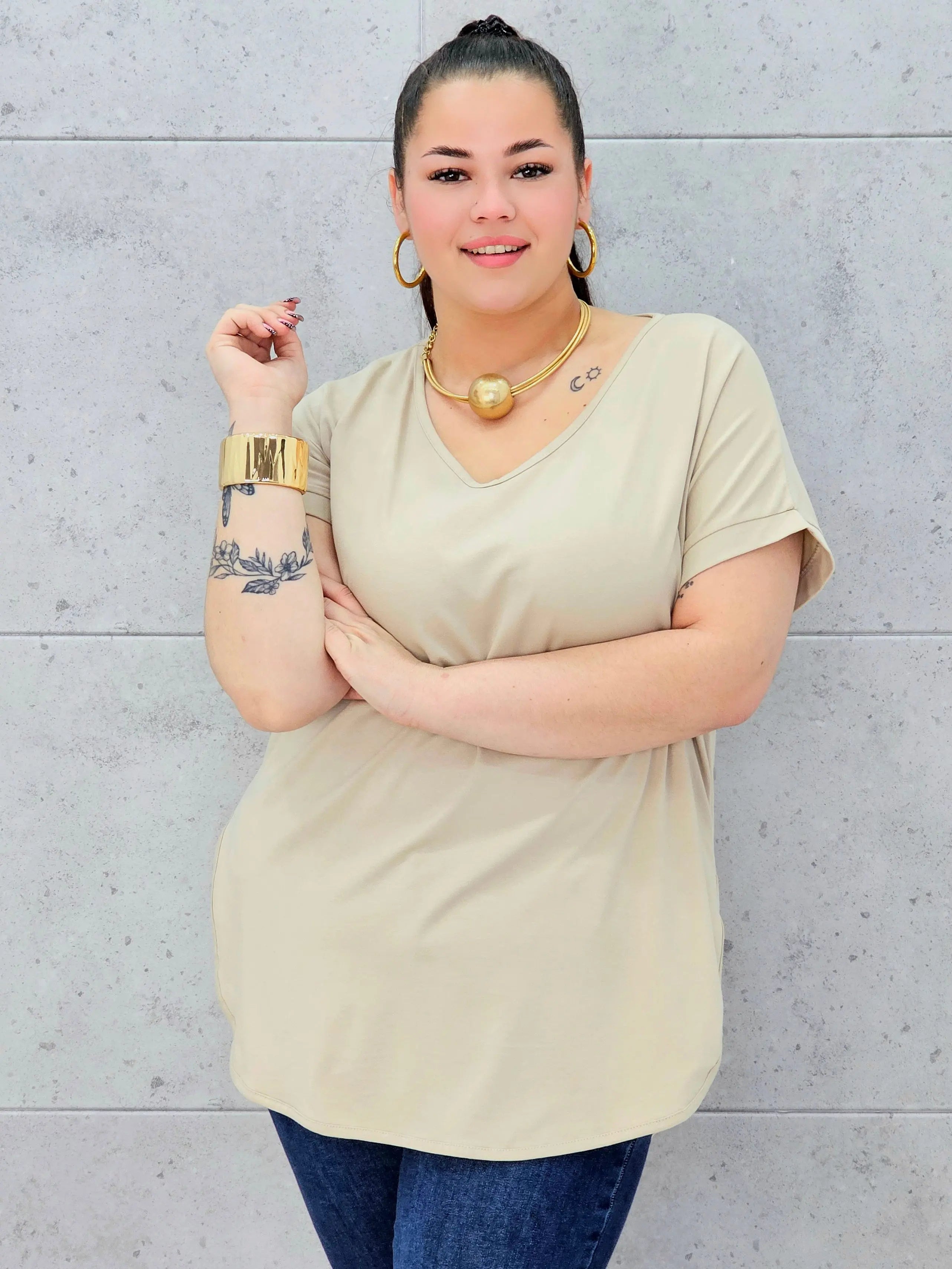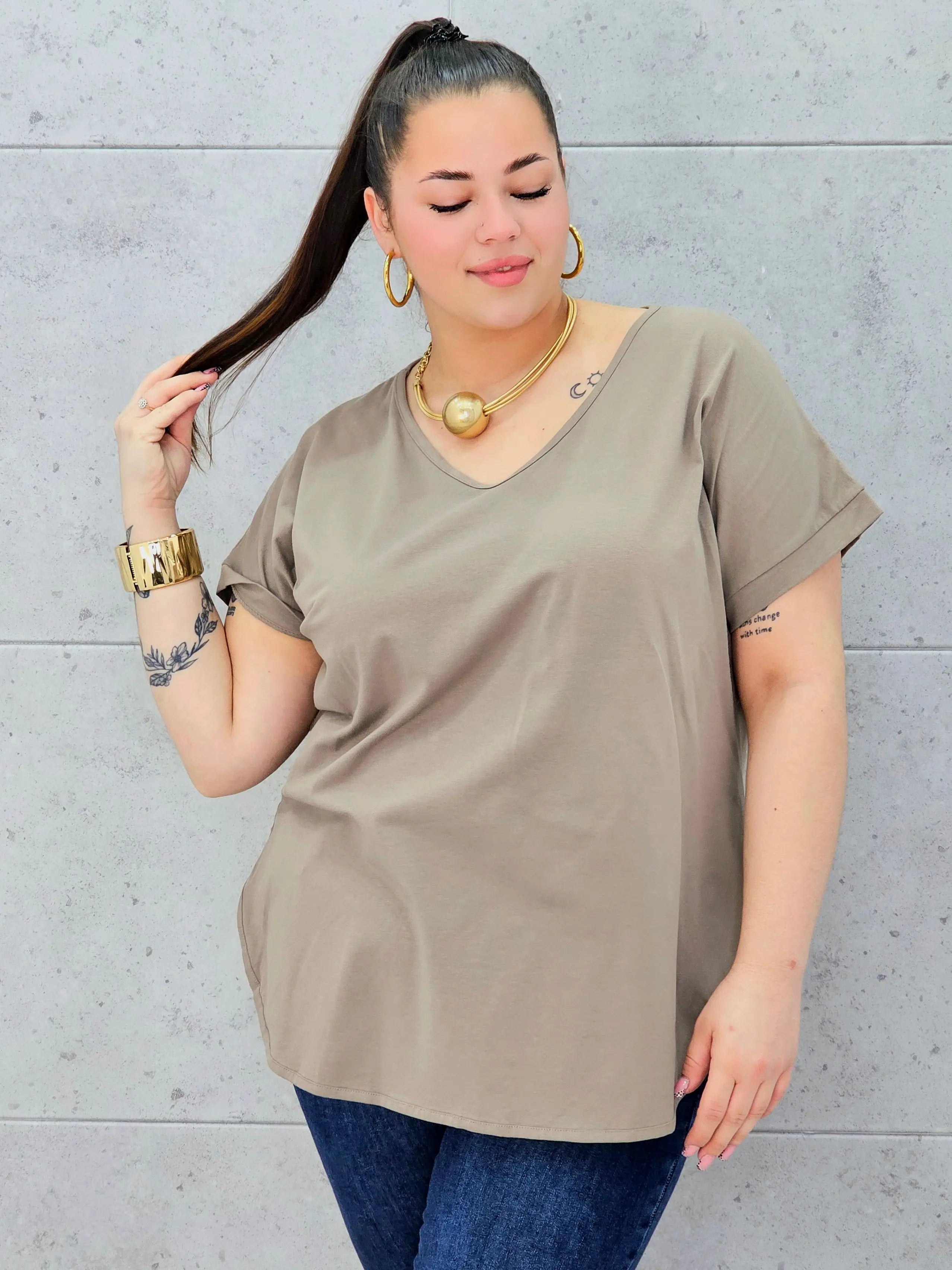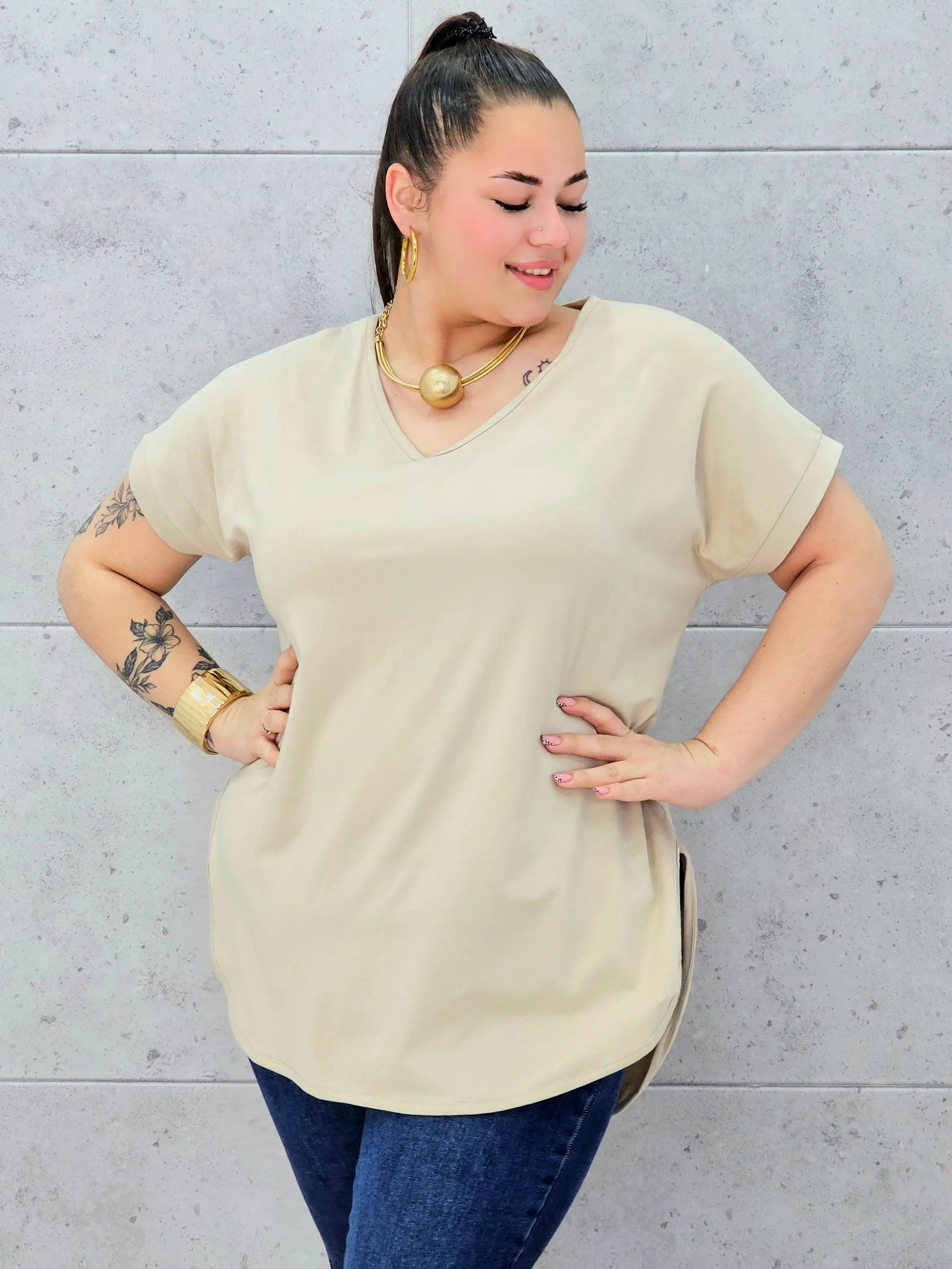 bluzka plus size z dekoltem V, który optycznie wysmukla górną partię sylwetki