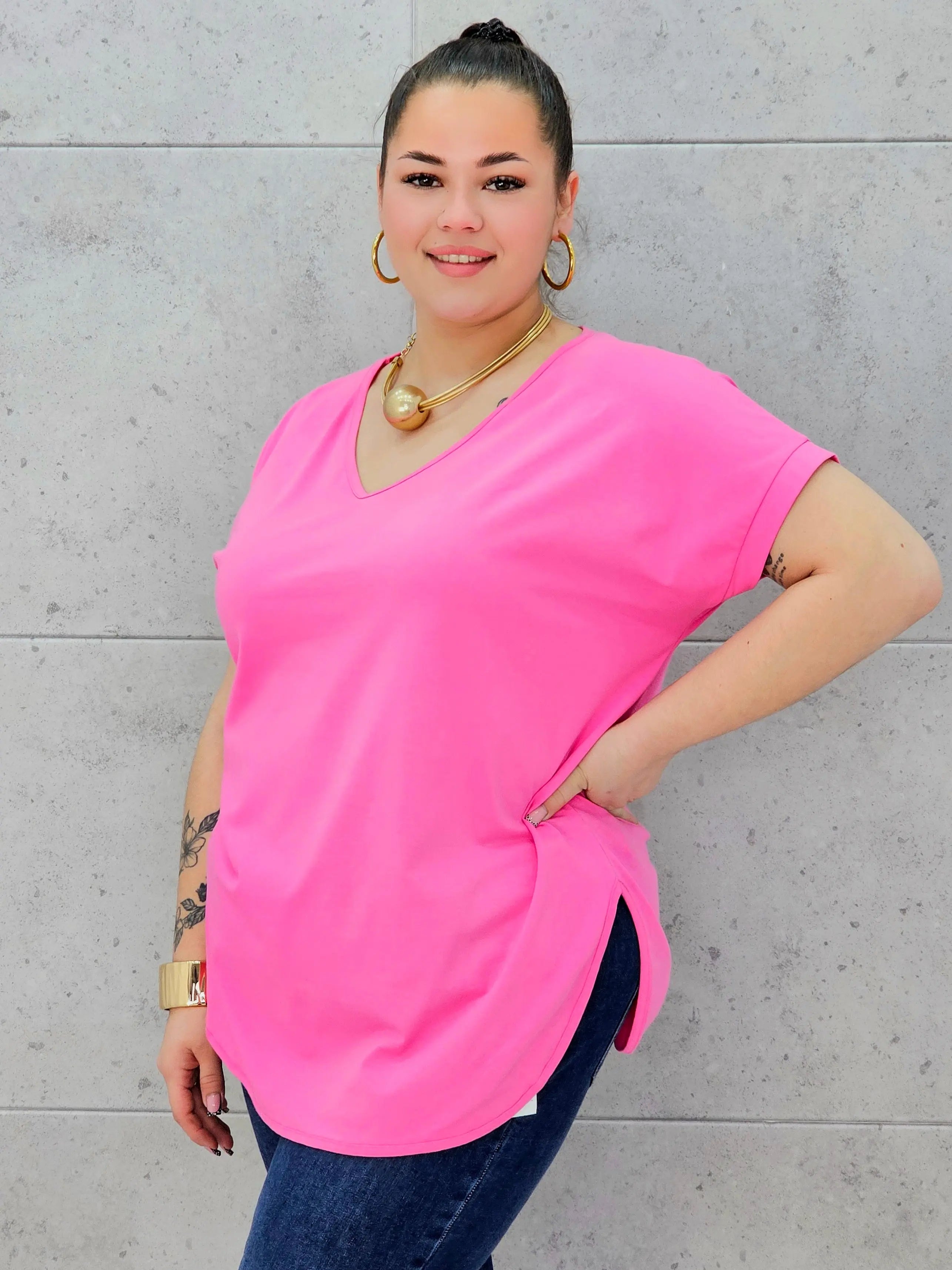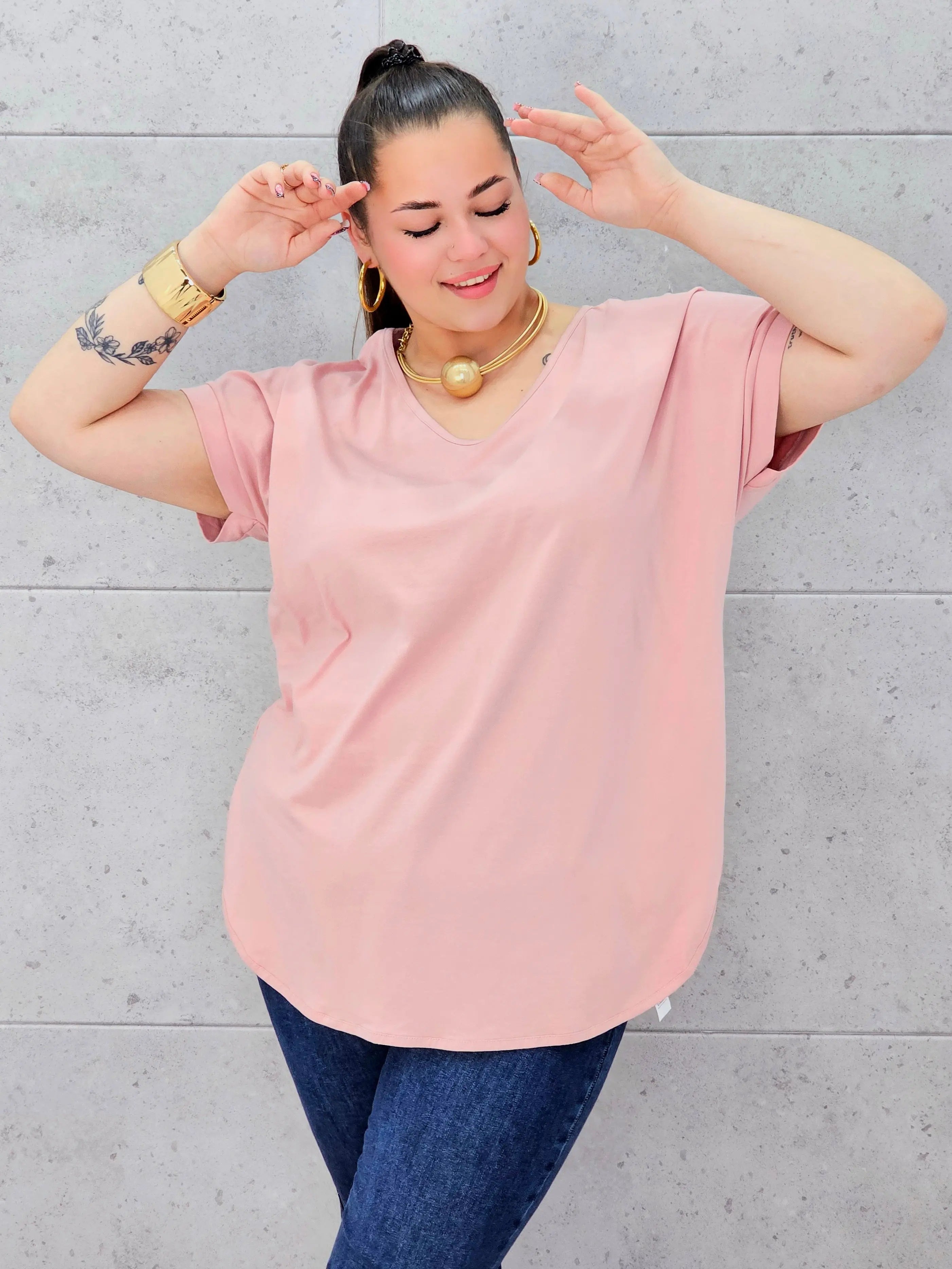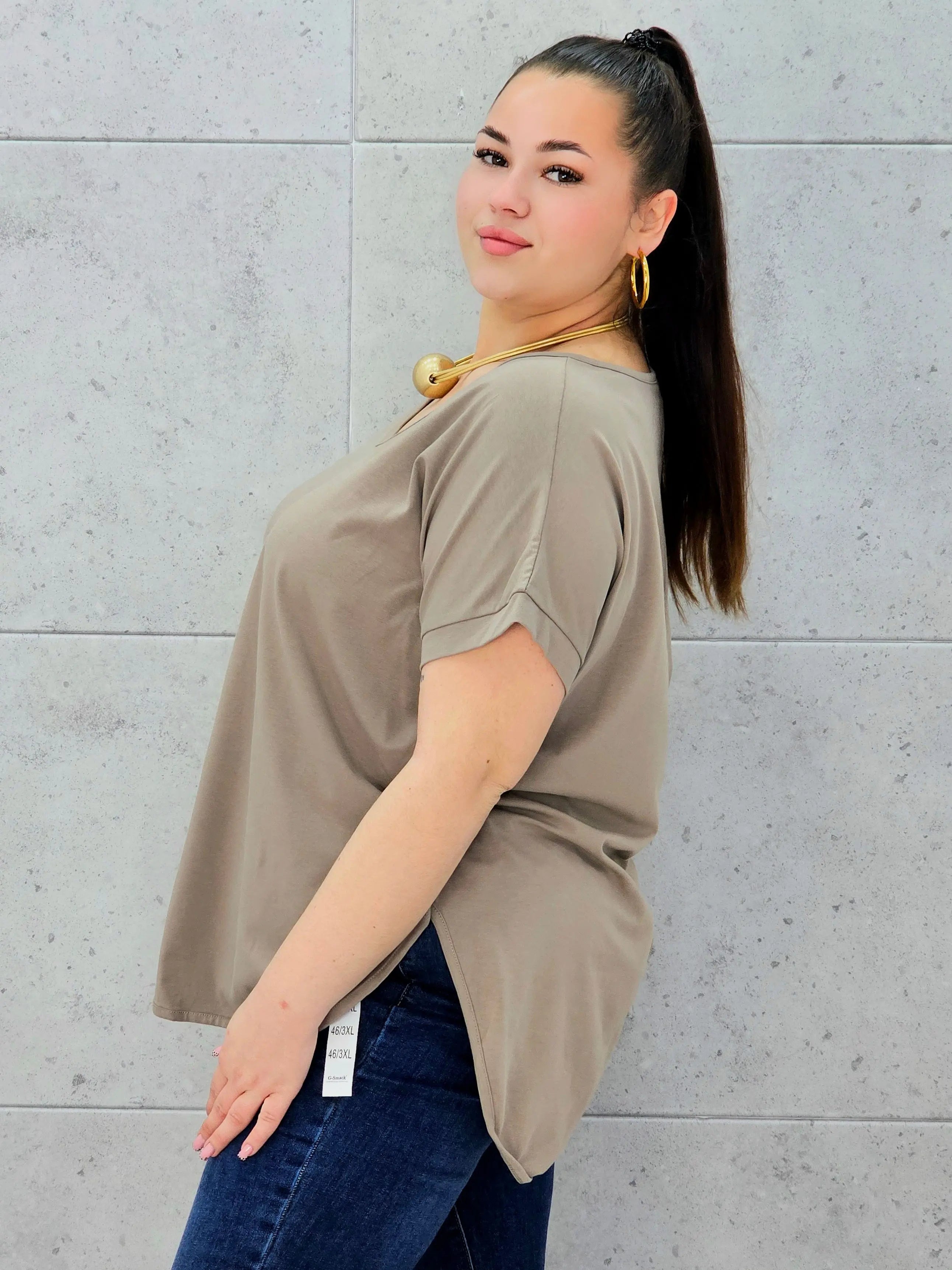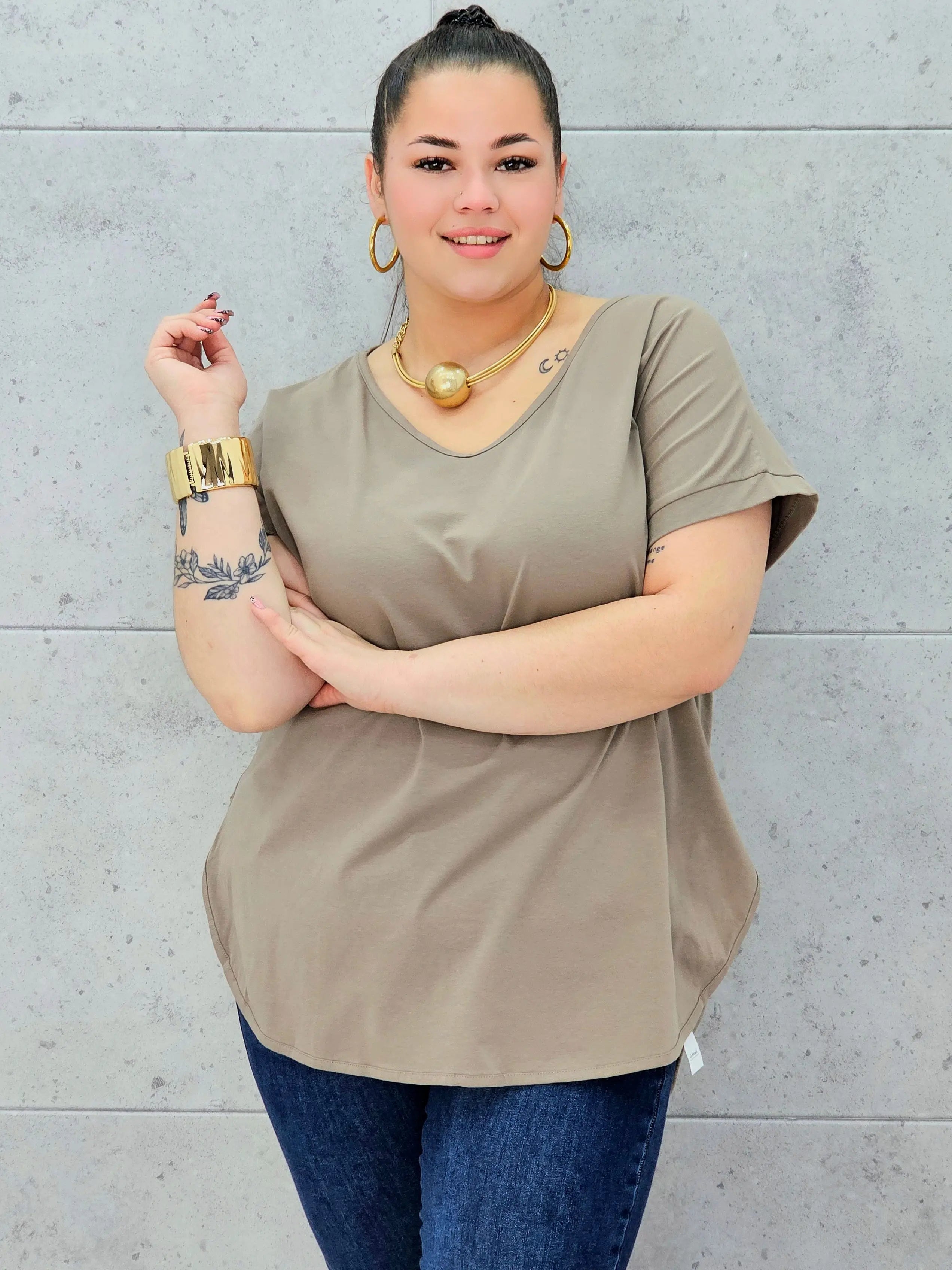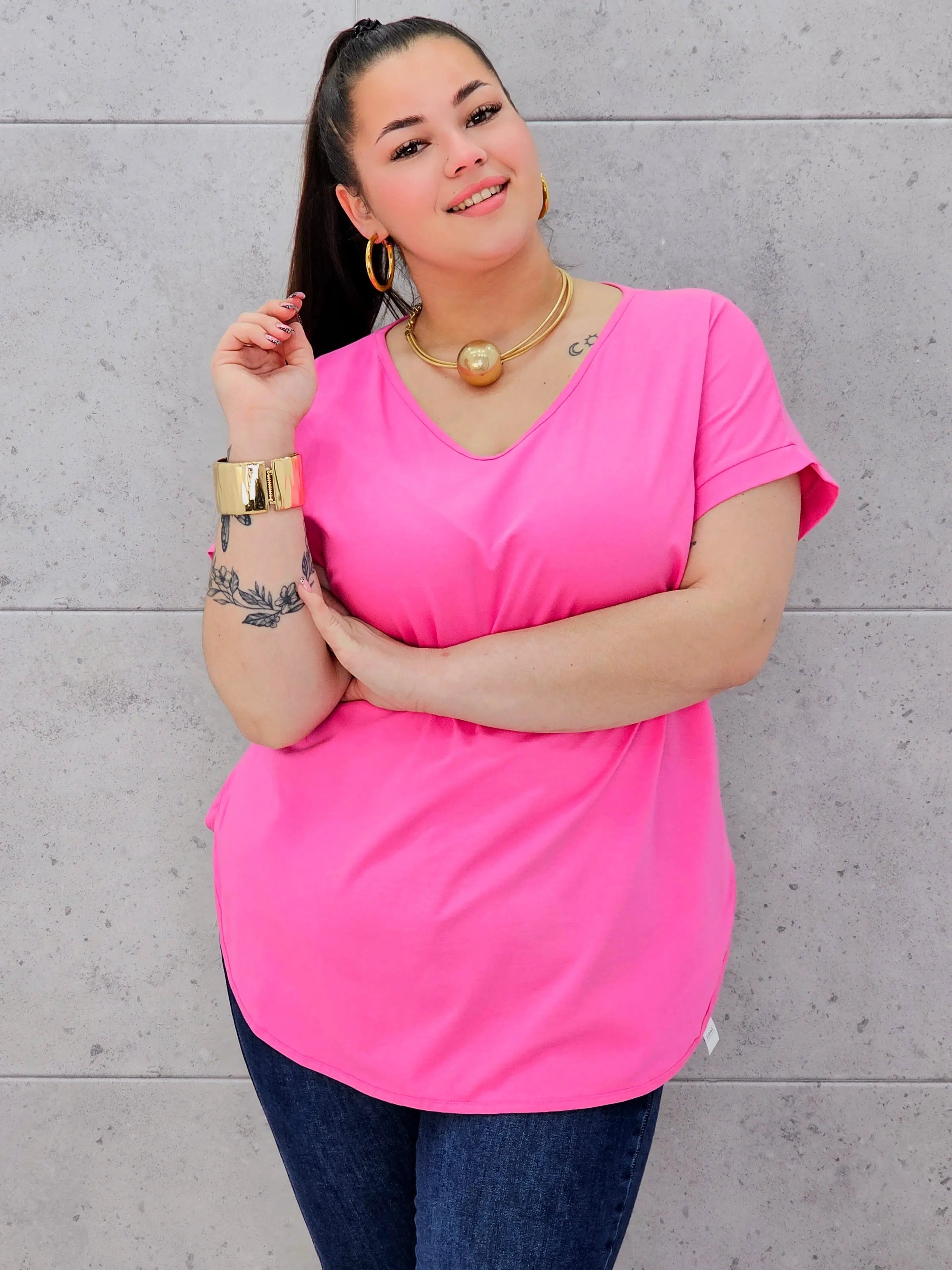 bluzka plus size z dekoltem V, który optycznie wysmukla górną partię sylwetki