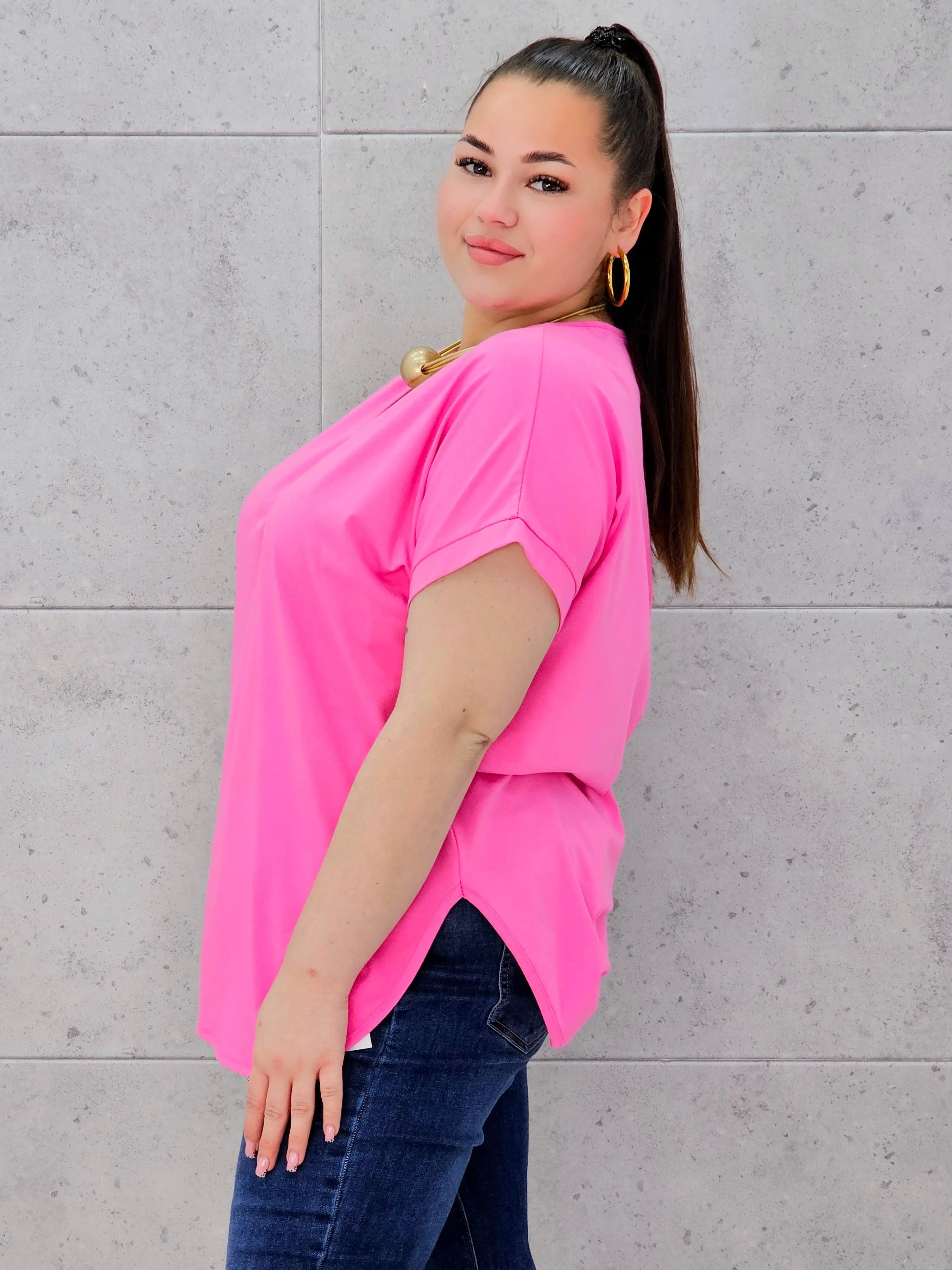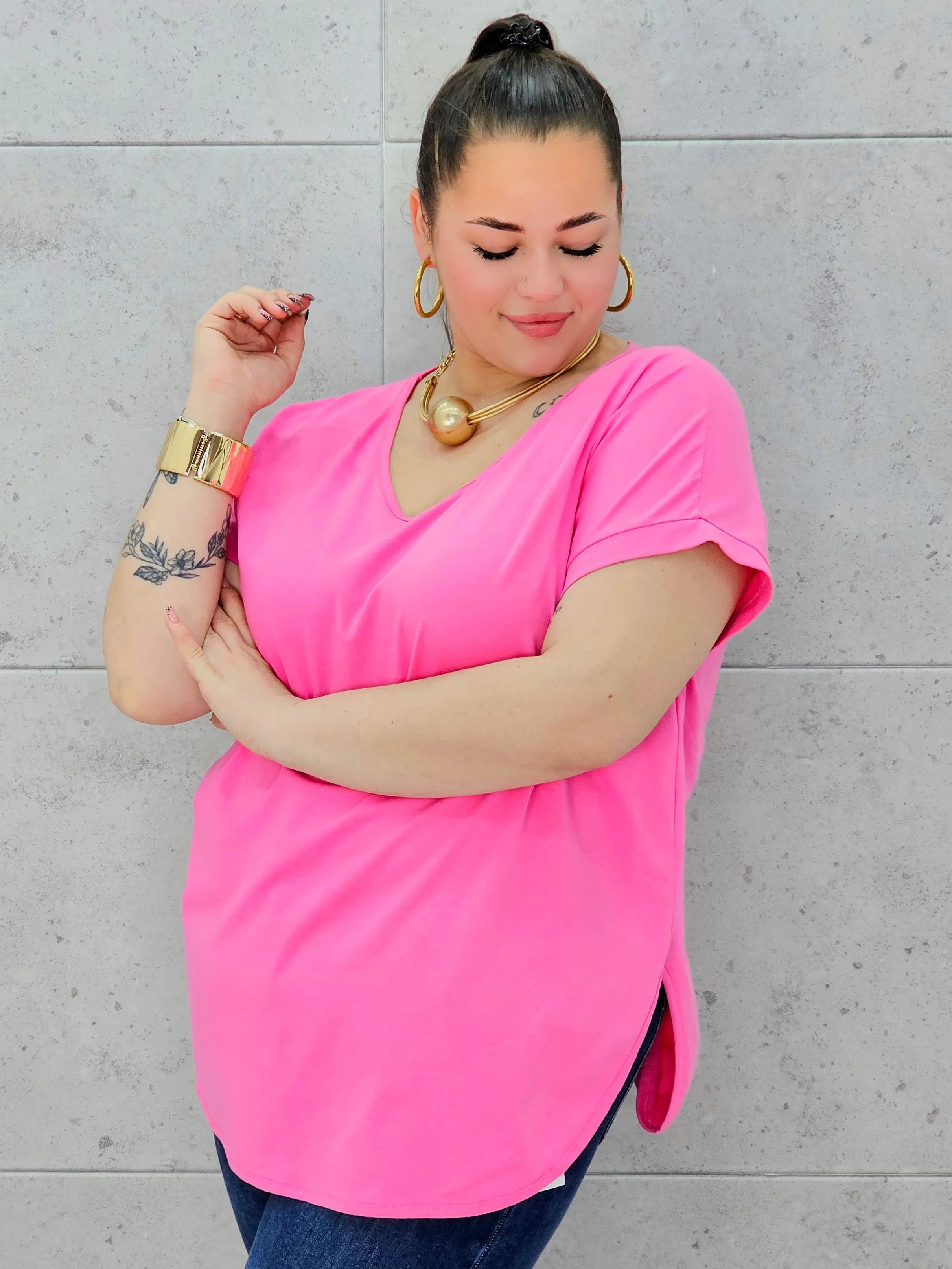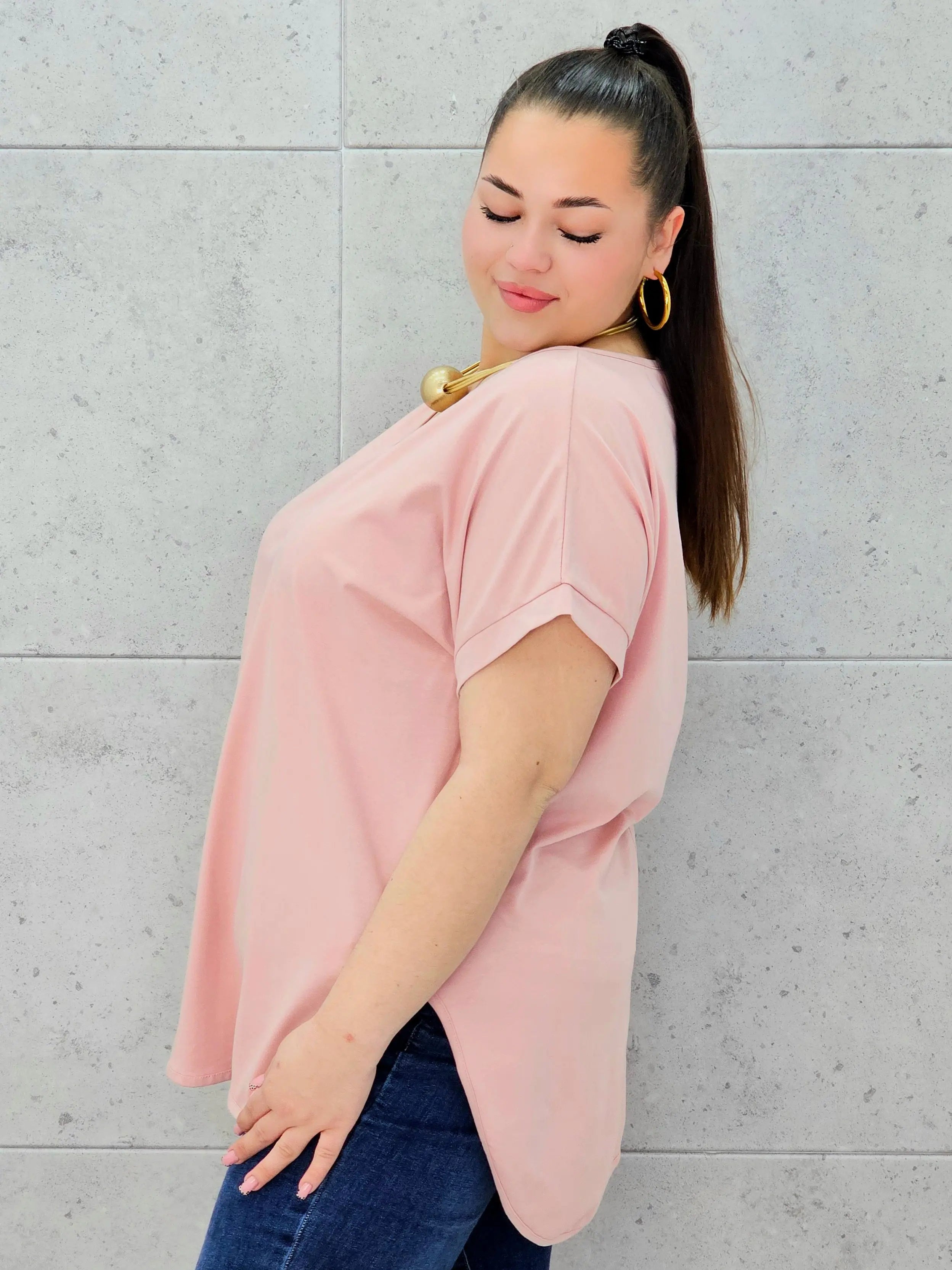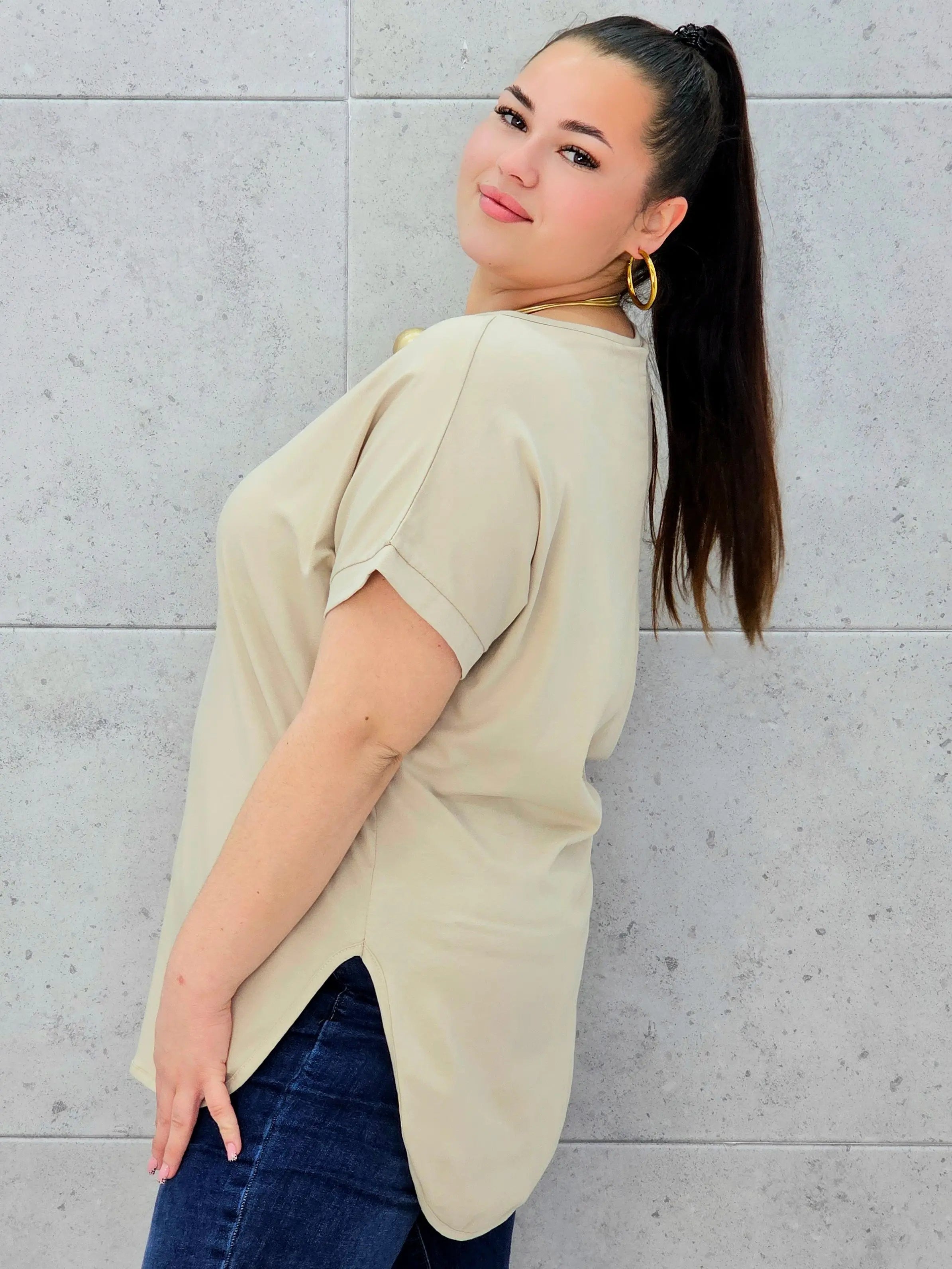 bluzka plus size z dekoltem V, który optycznie wysmukla górną partię sylwetki