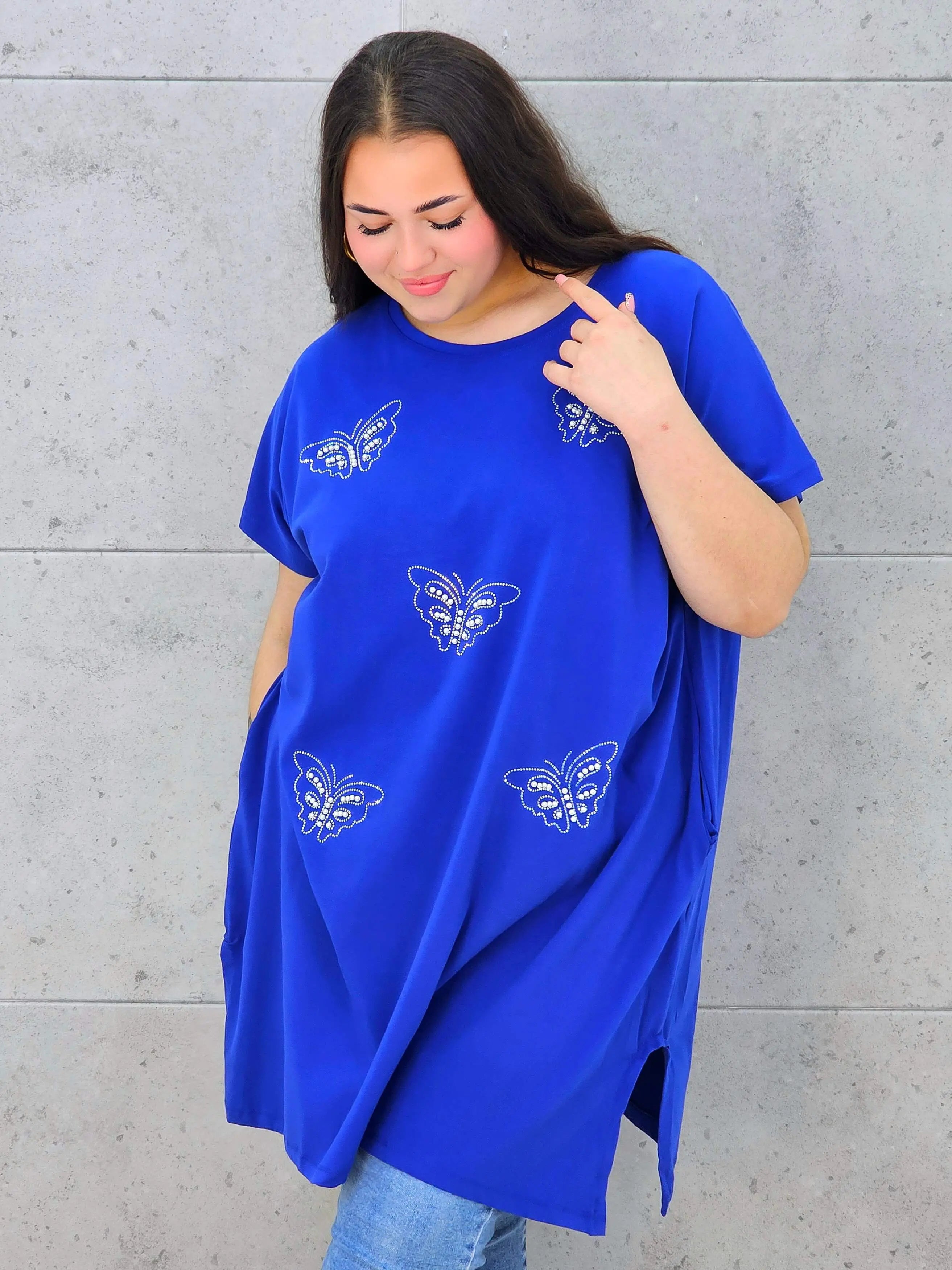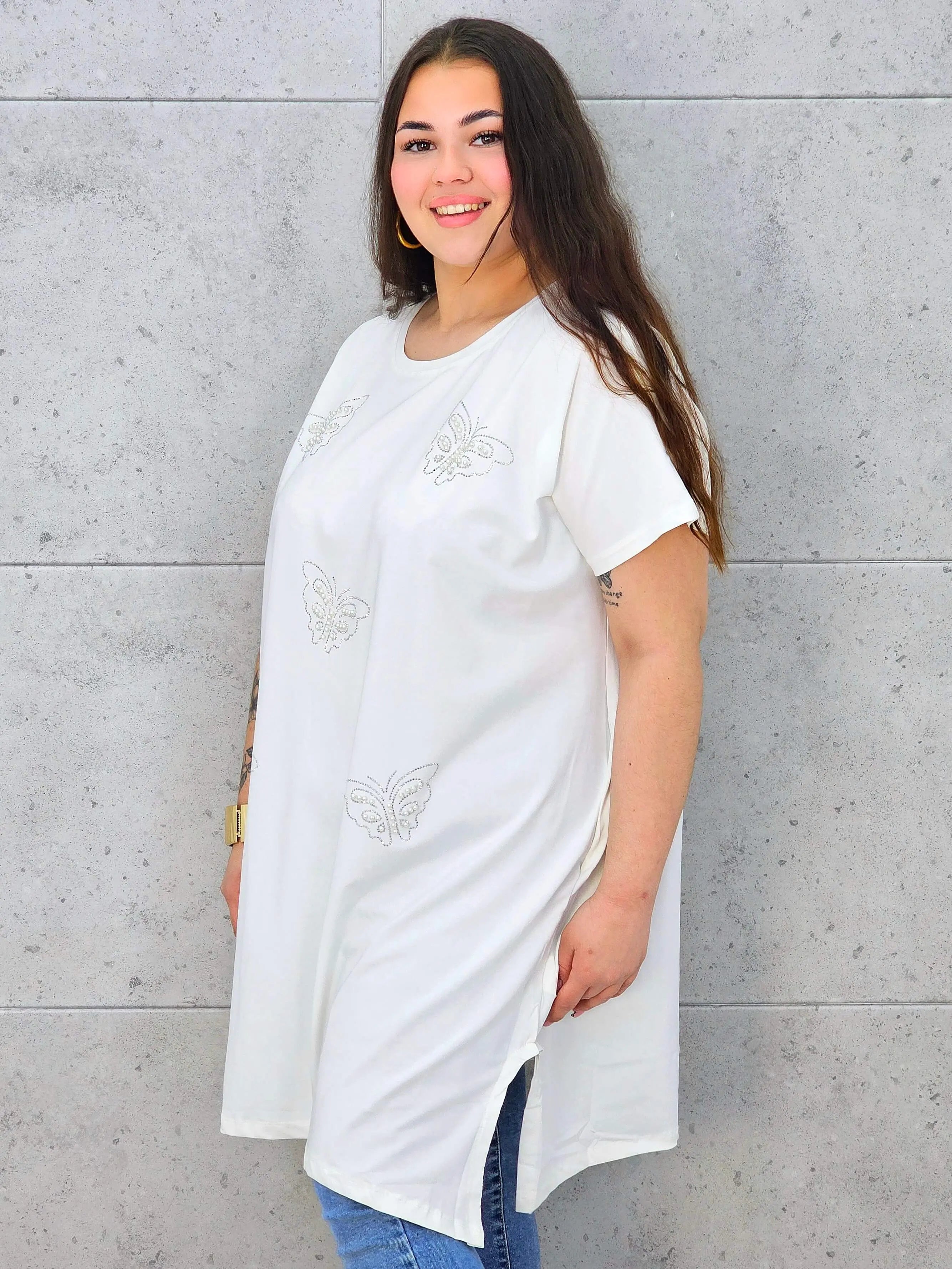 Na przodzie bluzki rozmieszczone są dekoracyjne motyle wykonane z drobnych, połyskujących aplikacji, które dodają stylizacji elegancji i przyciągają spojrzenia. Krój z krótkim rękawkiem oraz delikatnie wydłużonym dołem wysmukla sylwetkę i świetnie prezentuje się zarówno do jeansów, jak i bardziej eleganckich spodni.