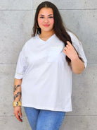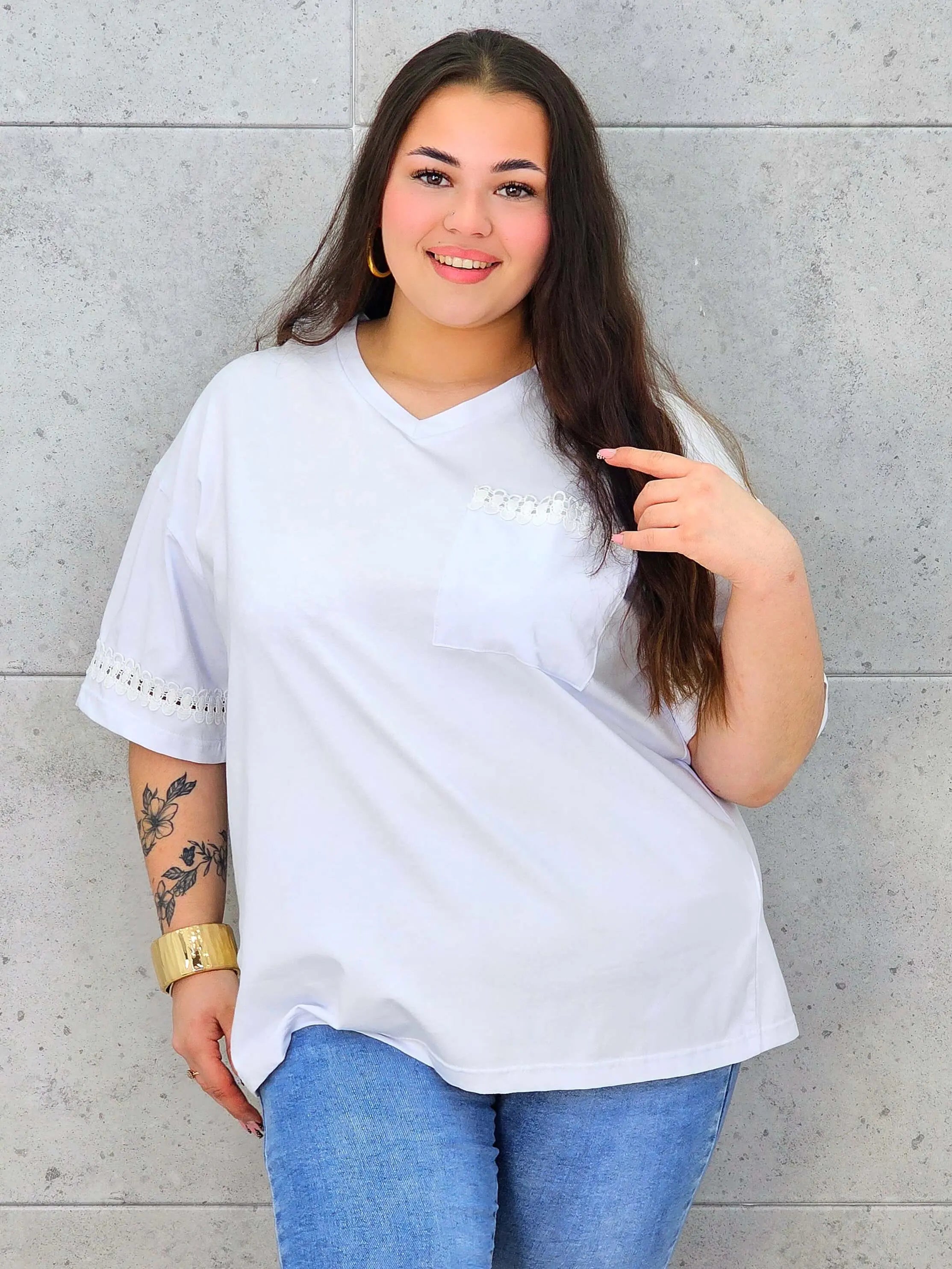Bluzka plus size to idealna propozycja dla kobiet, które cenią wygodę połączoną z subtelną elegancją. Model wyróżnia się delikatną koronką na rękawach oraz kieszonką, które dodają mu lekkości i dziewczęcego uroku. Krój swobodnie opływa sylwetkę, świetnie wpisując się w potrzeby mody plus size i zapewniając komfort przez cały dzień.