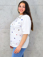 Bluzka plus size z kolorowymi aplikacjami – modny T-shirt dla kobiet XXL