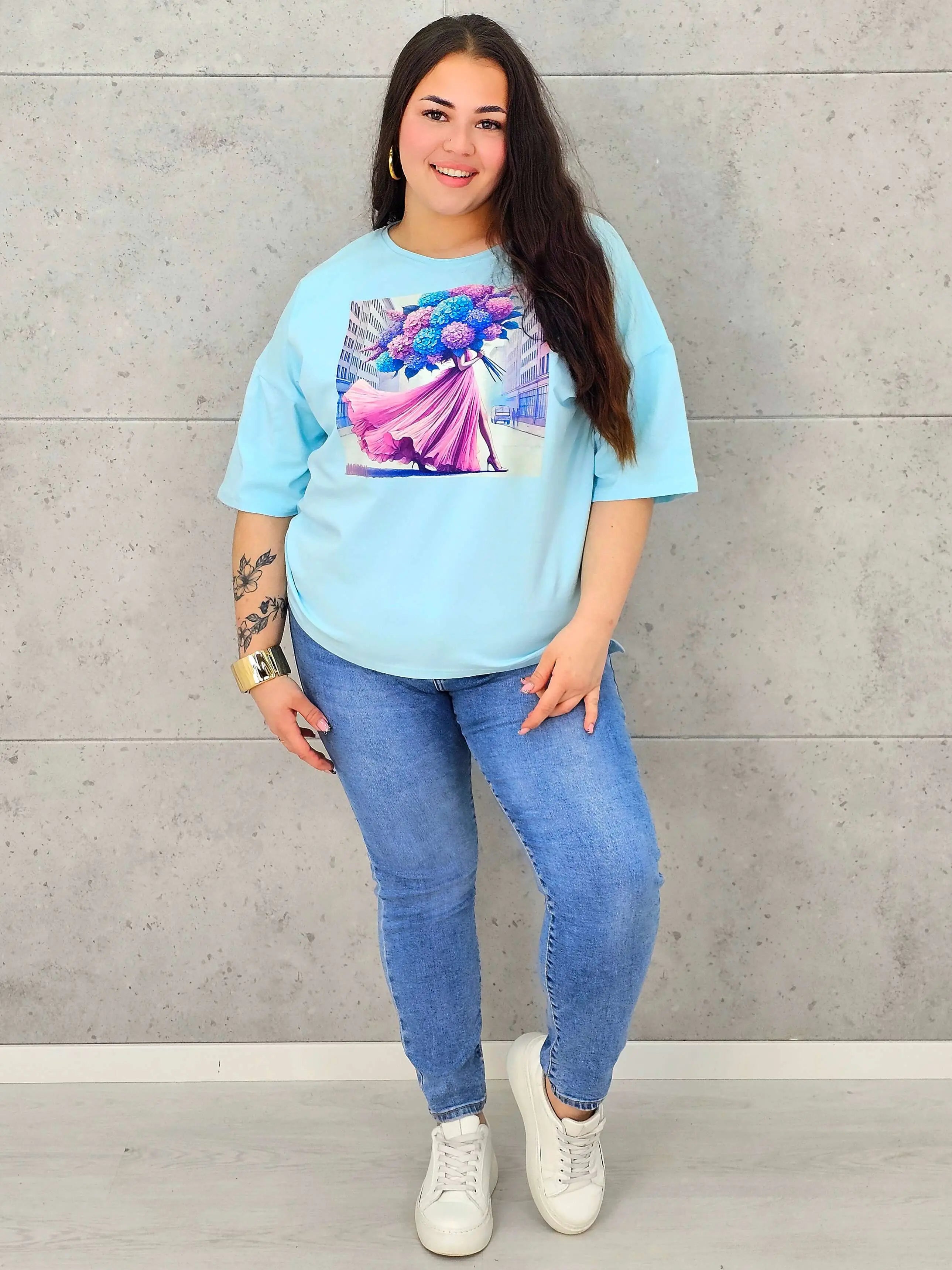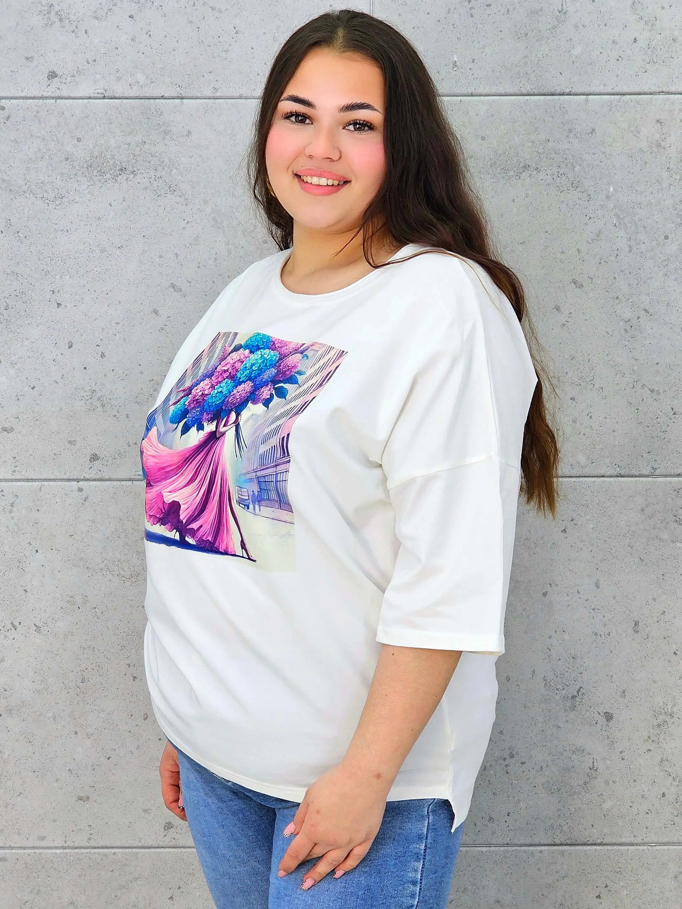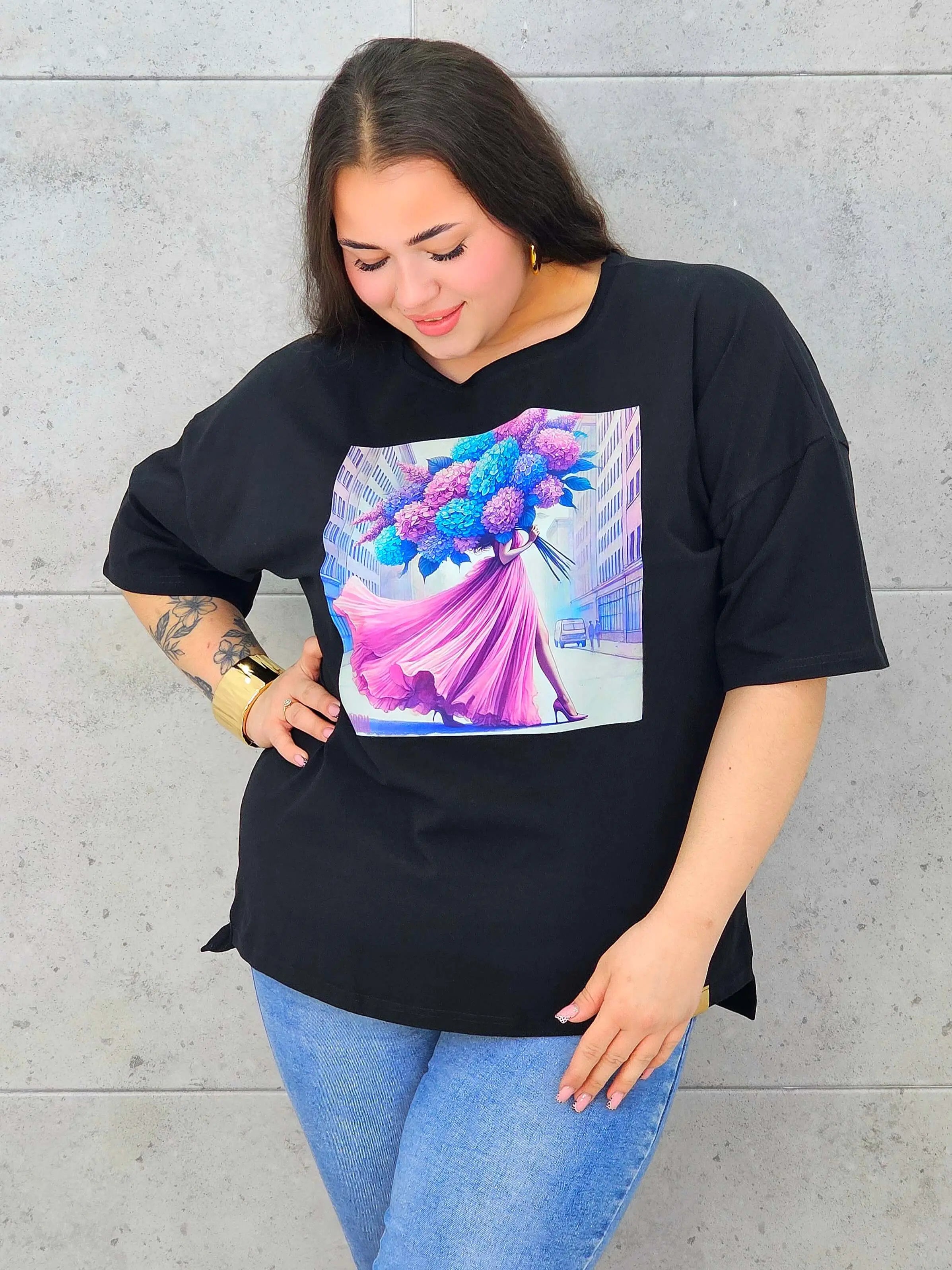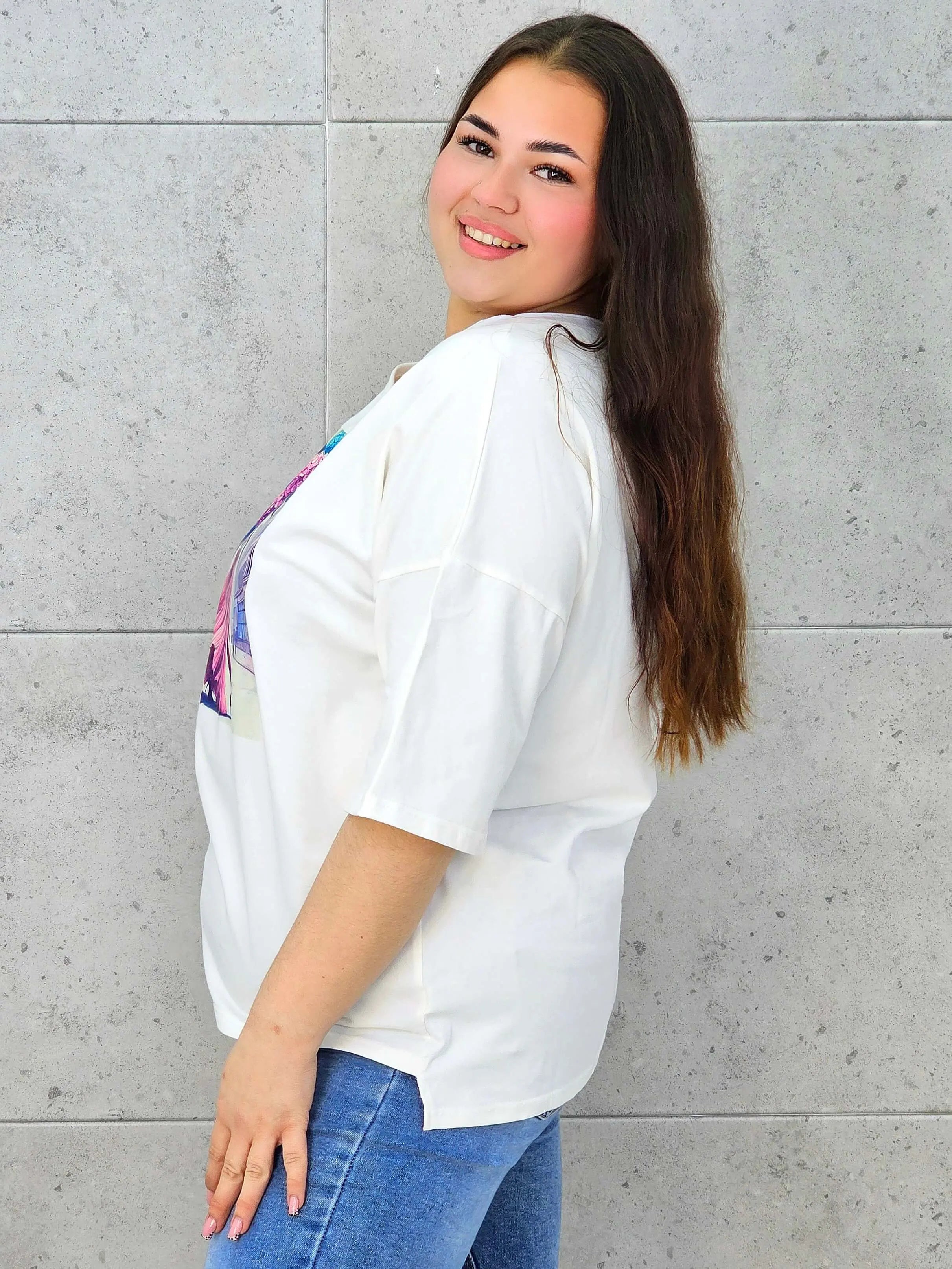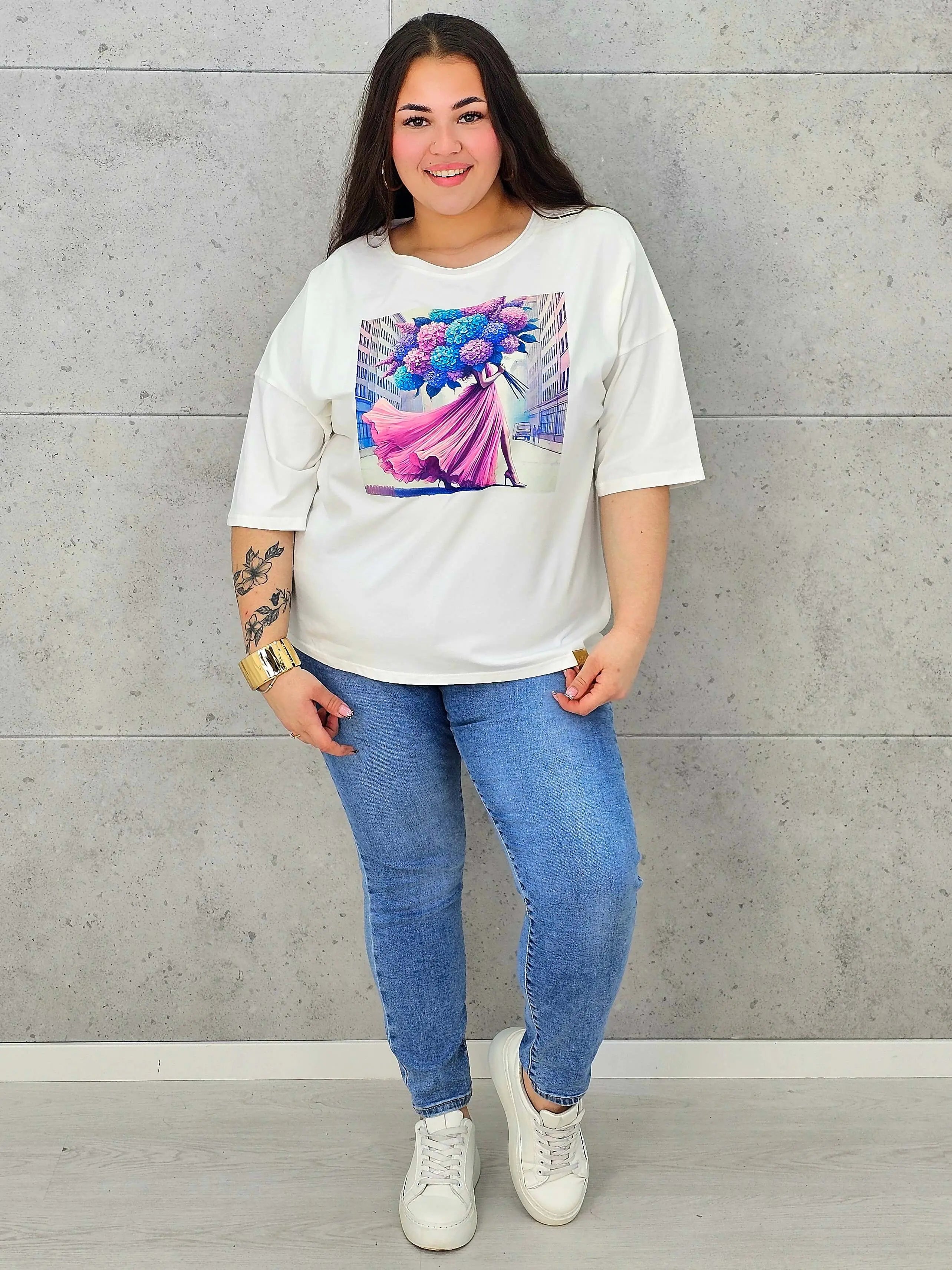 Ten T-shirt plus size świetnie podkreśla sylwetkę, nie opinając jej, a jednocześnie dodaje lekkości i energii dzięki efektownemu nadrukowi. Idealny zarówno na co dzień, jak i do casualowych stylizacji z jeansami czy spódnicą.