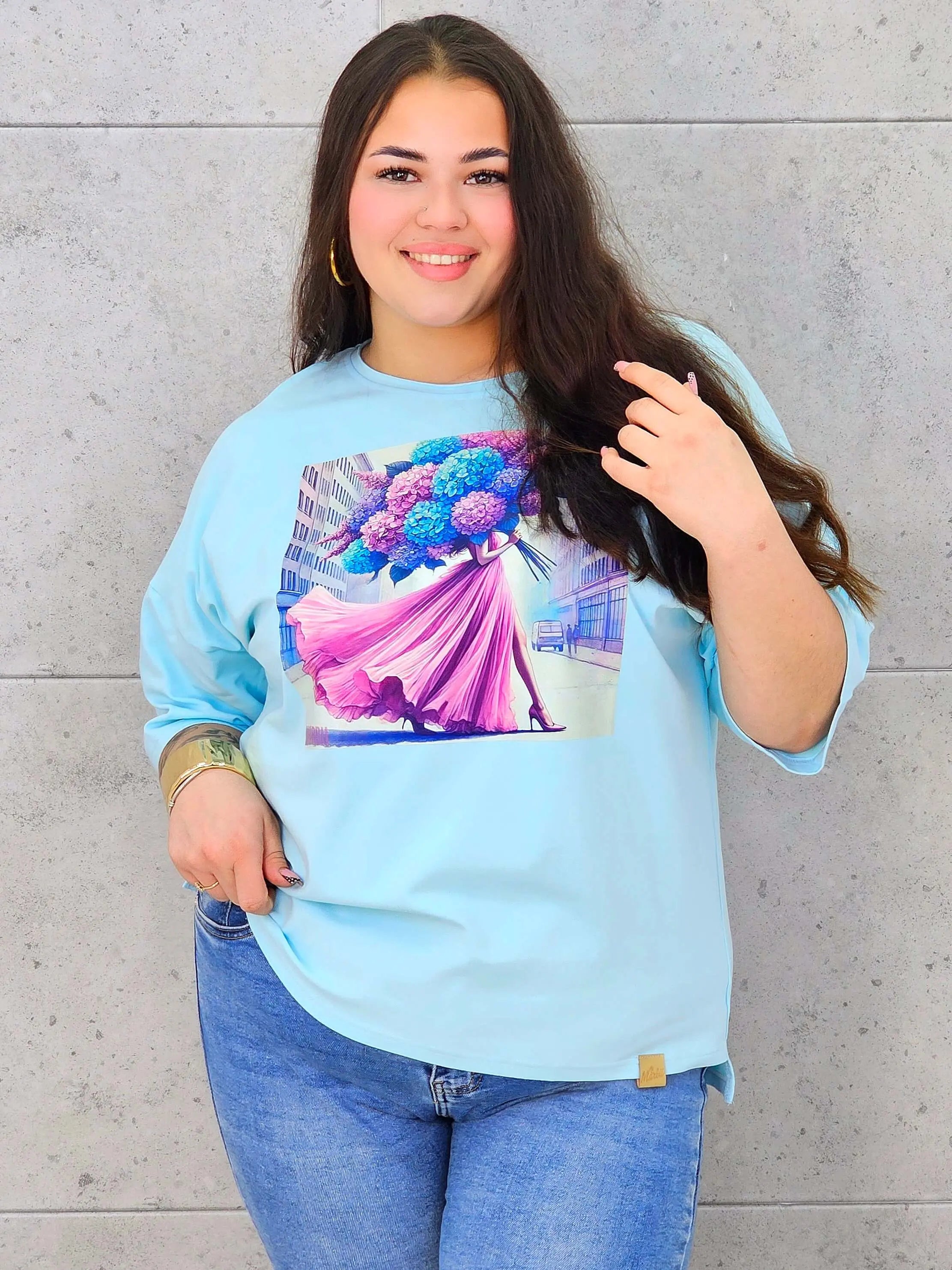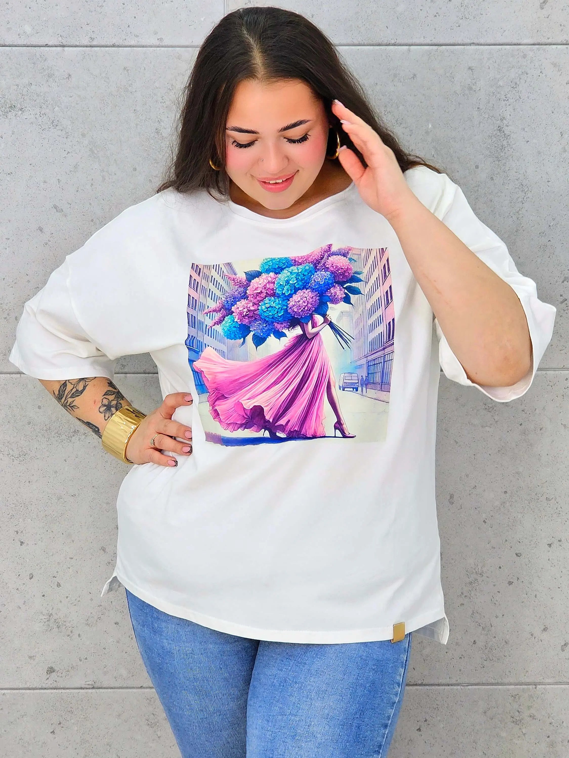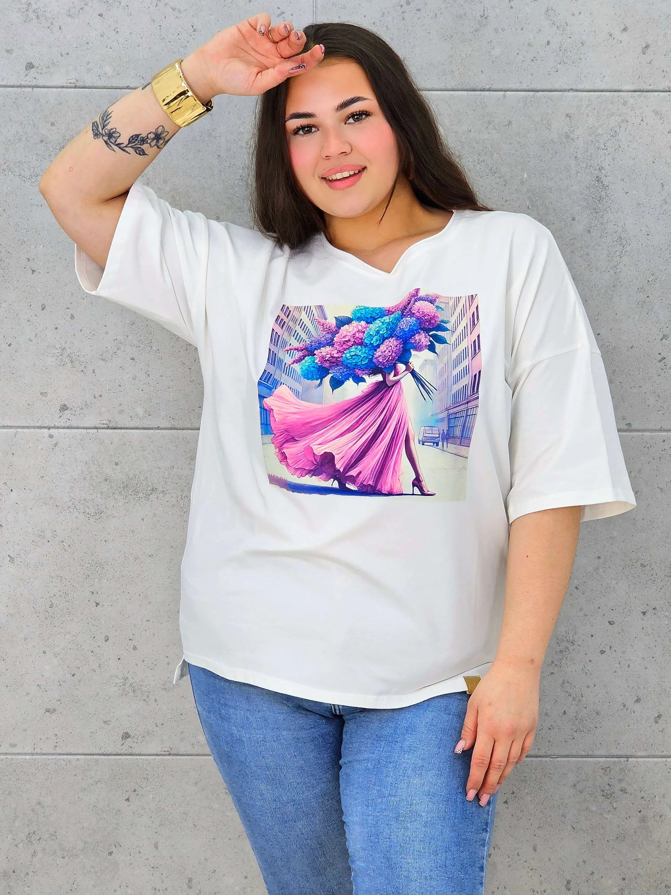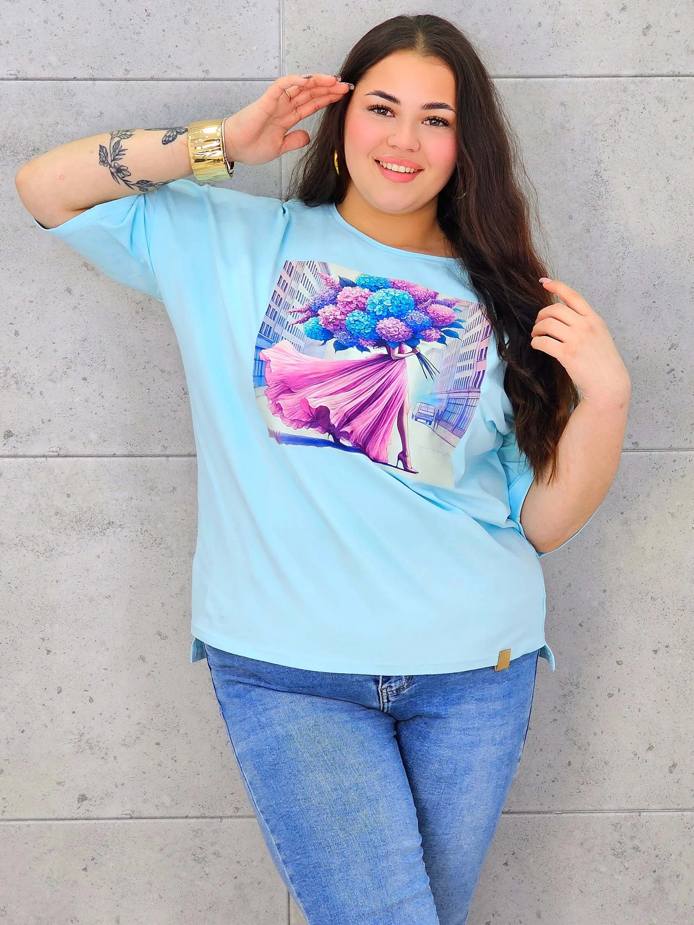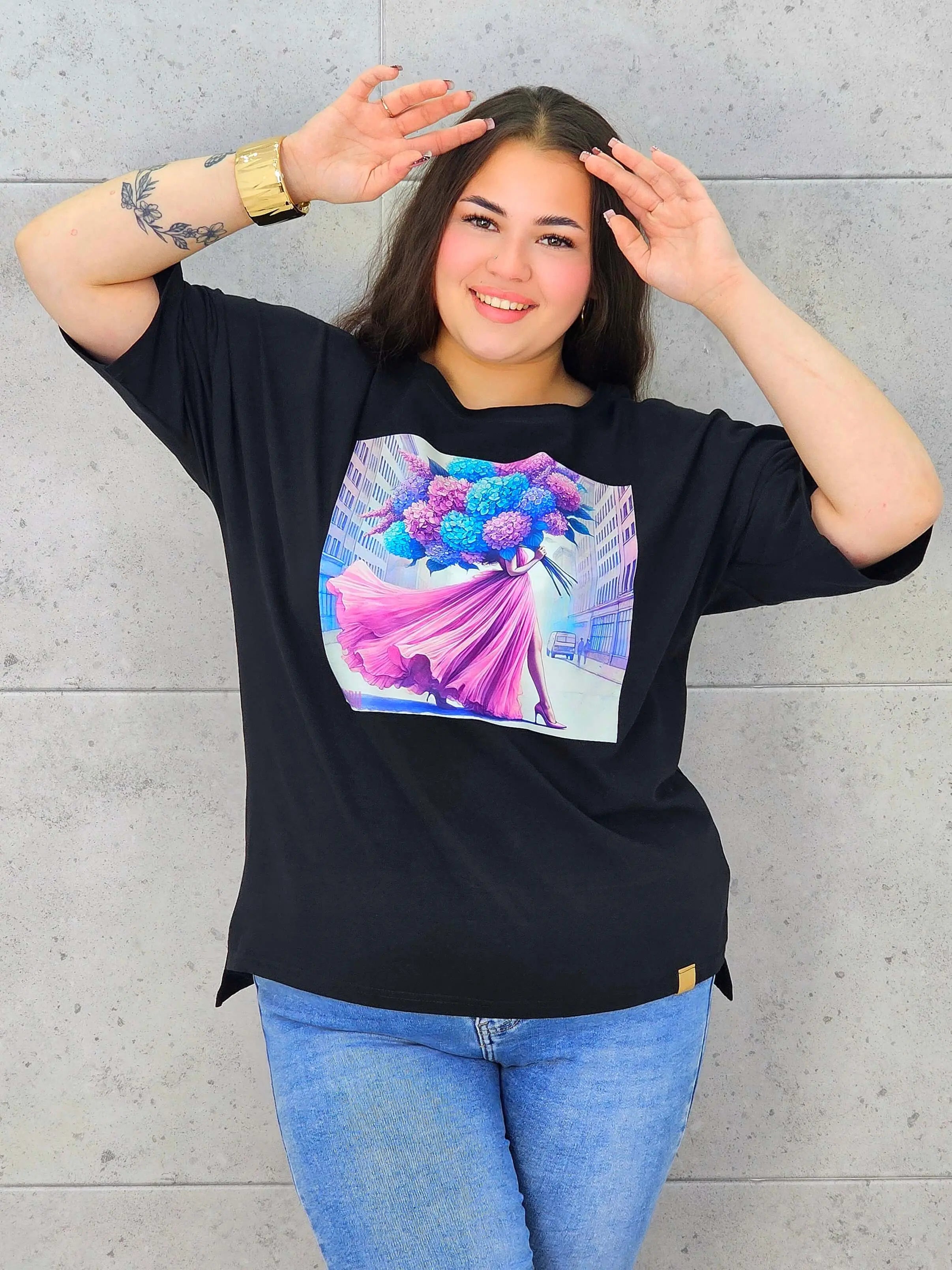 Ten T-shirt plus size świetnie podkreśla sylwetkę, nie opinając jej, a jednocześnie dodaje lekkości i energii dzięki efektownemu nadrukowi. Idealny zarówno na co dzień, jak i do casualowych stylizacji z jeansami czy spódnicą.