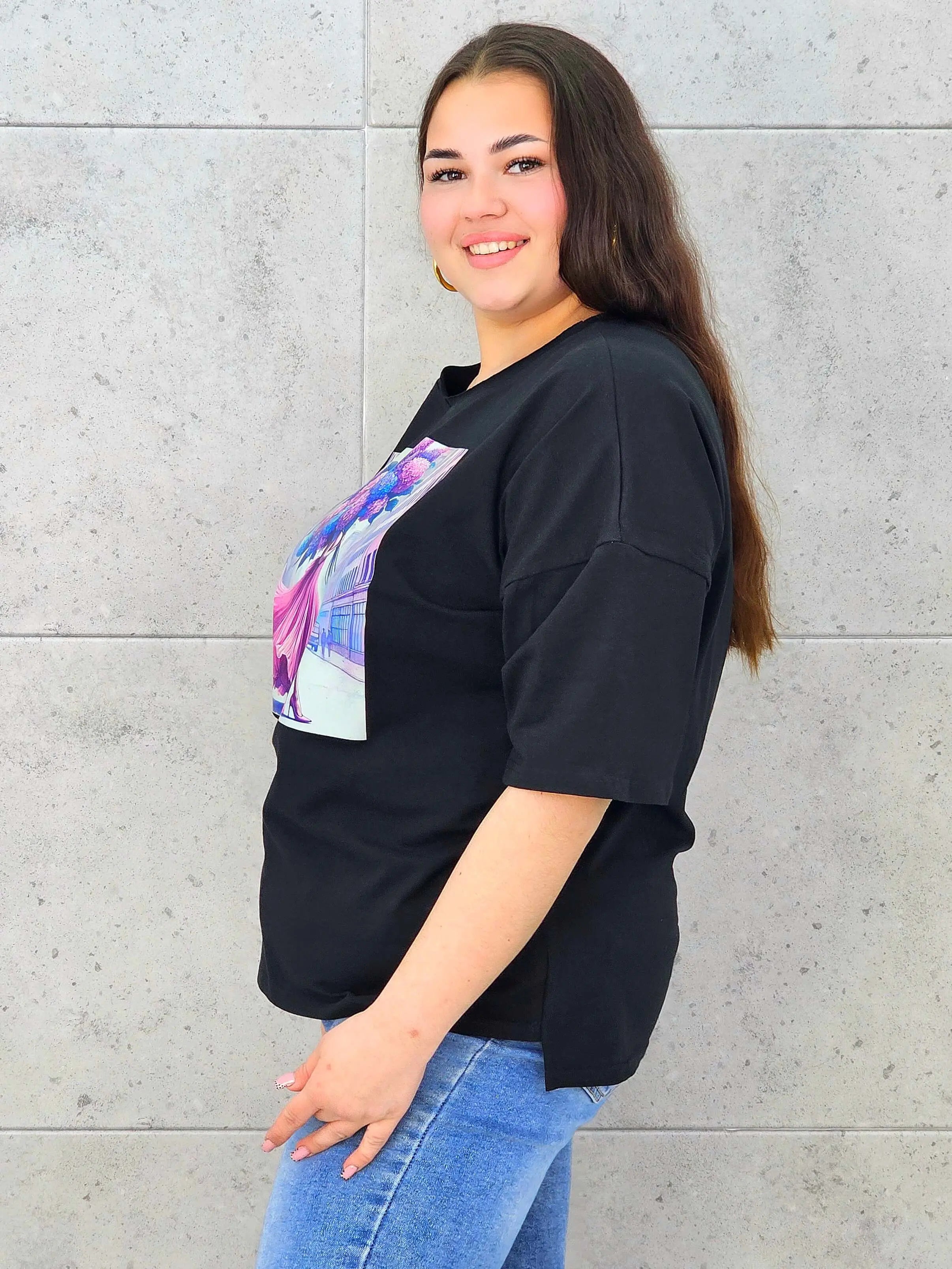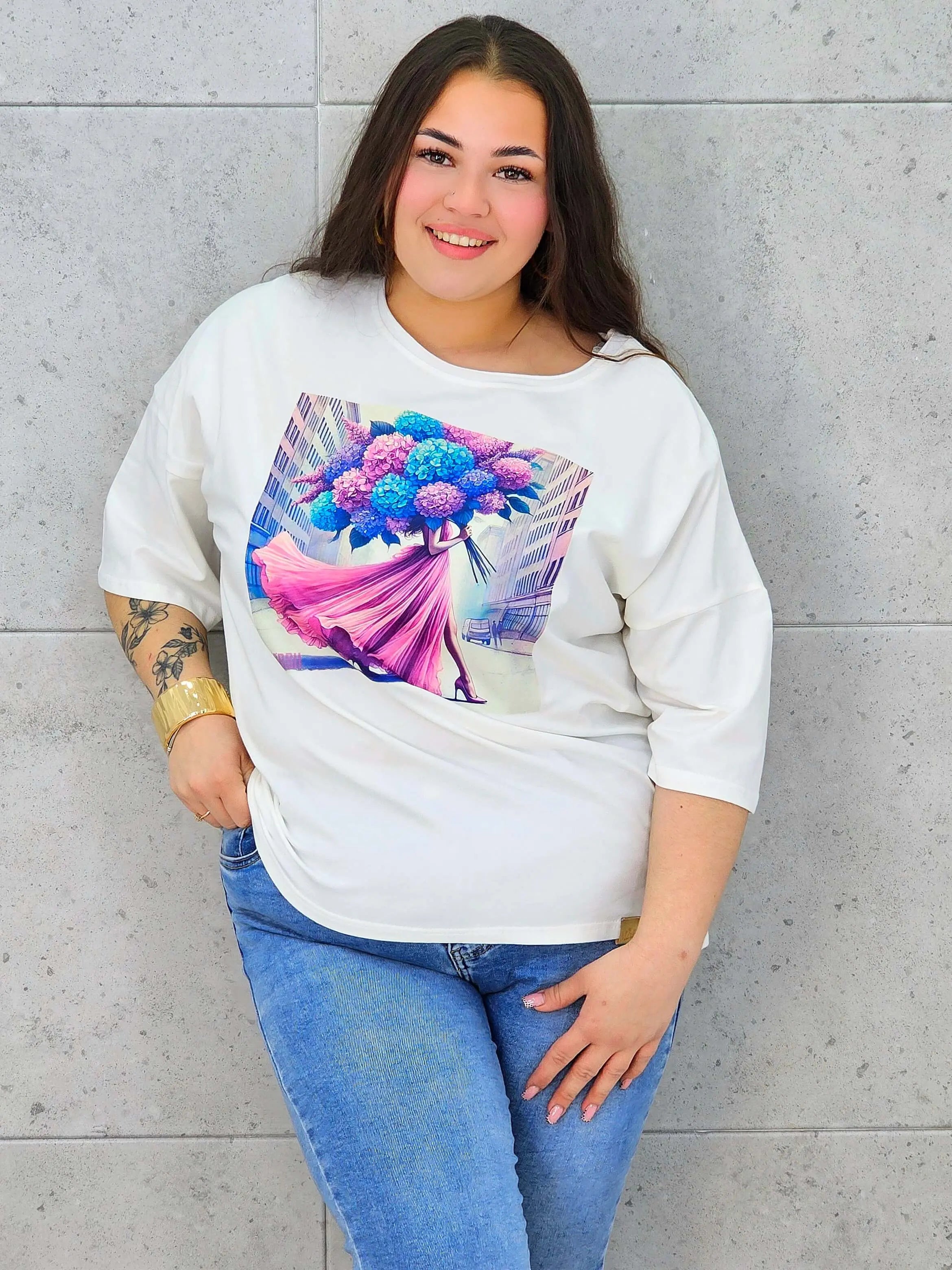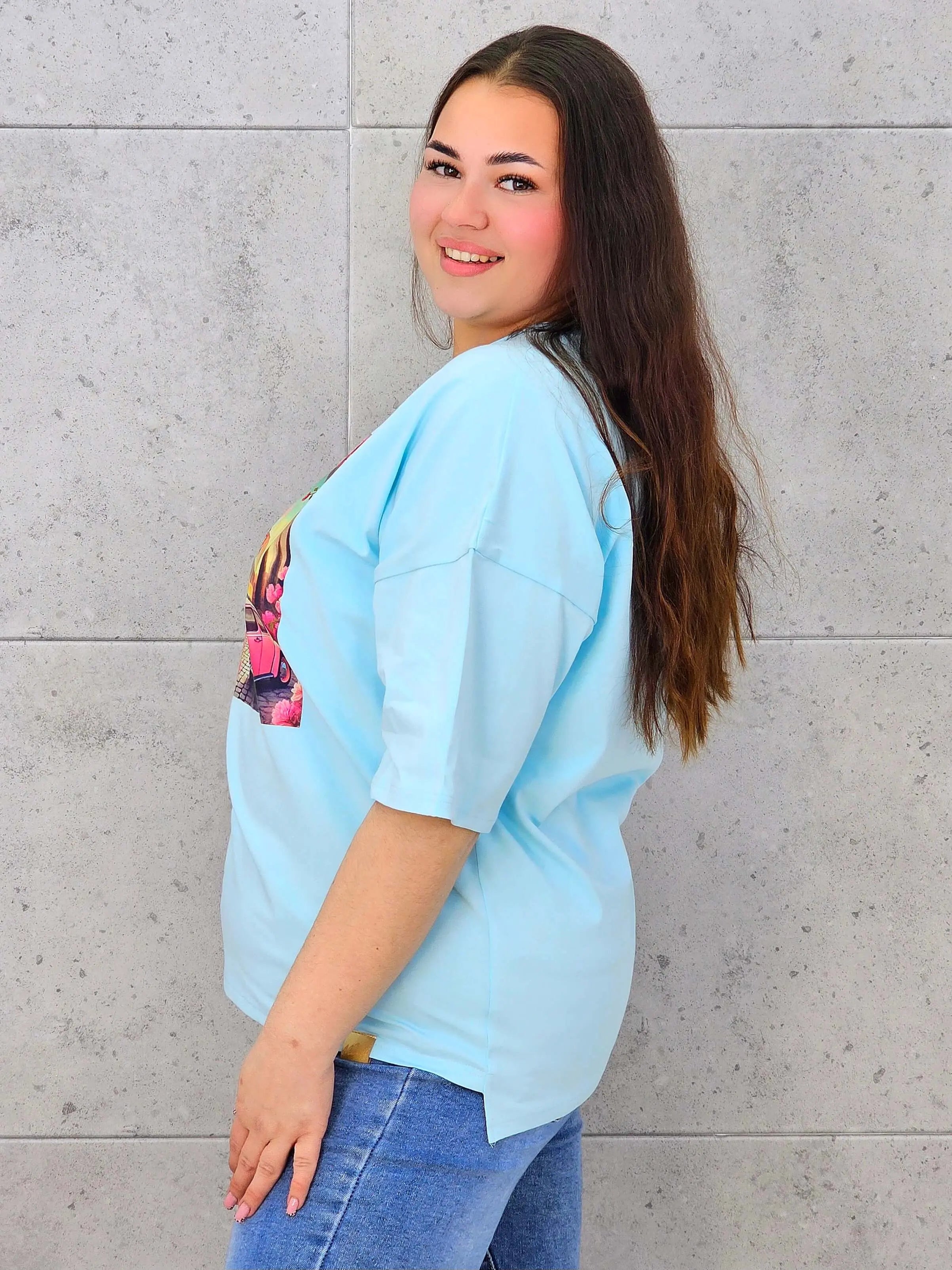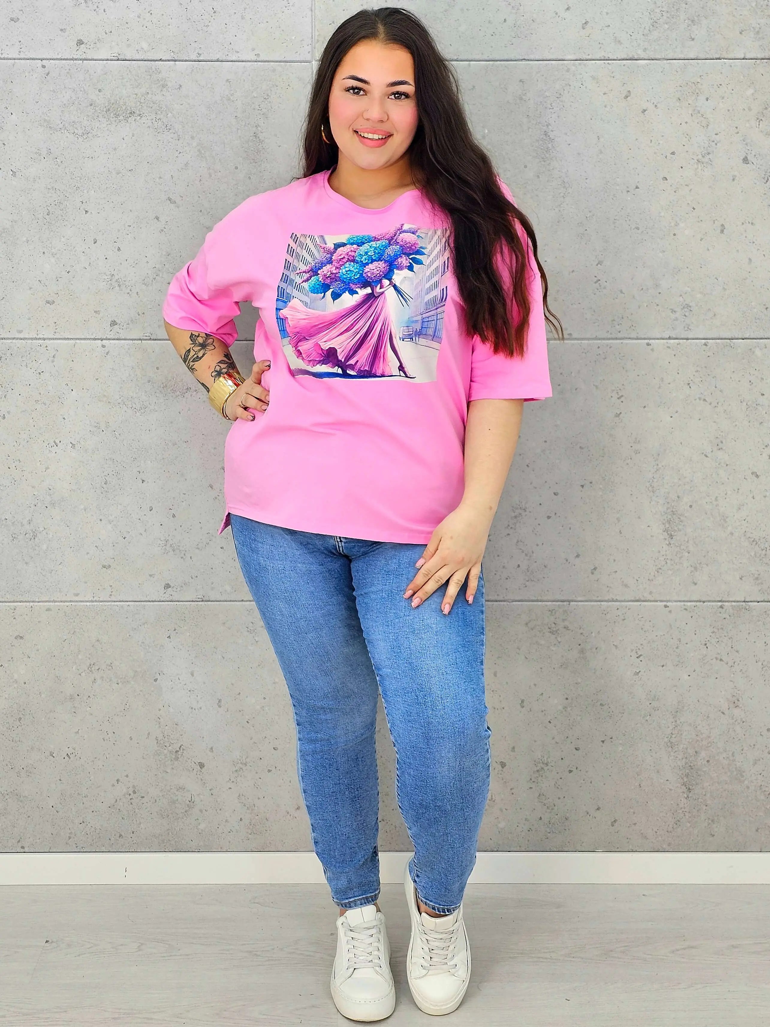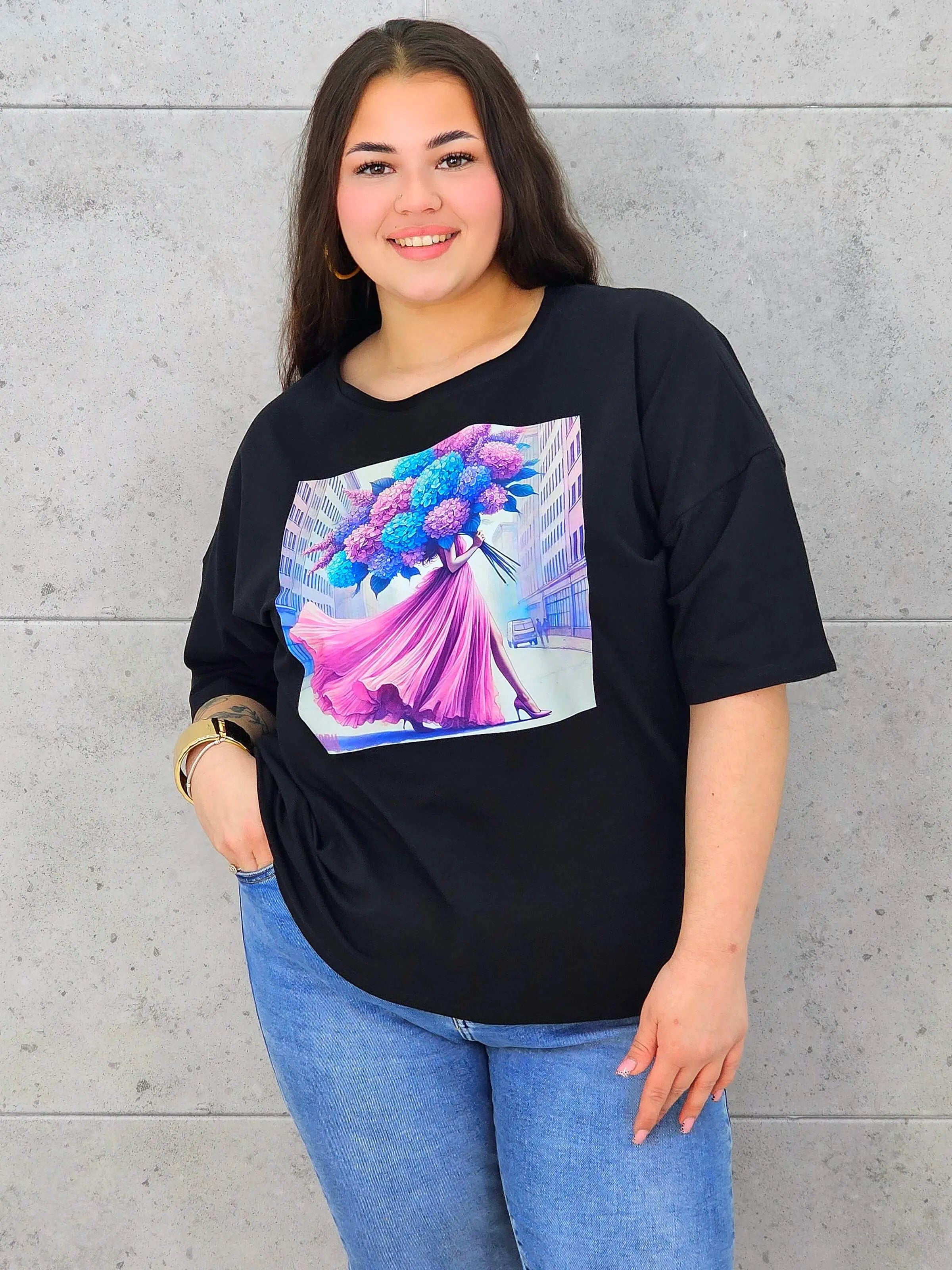Ten T-shirt plus size świetnie podkreśla sylwetkę, nie opinając jej, a jednocześnie dodaje lekkości i energii dzięki efektownemu nadrukowi. Idealny zarówno na co dzień, jak i do casualowych stylizacji z jeansami czy spódnicą.