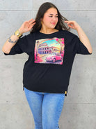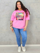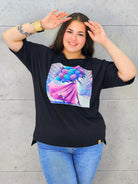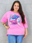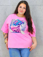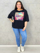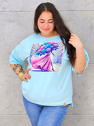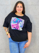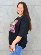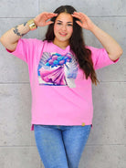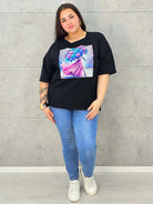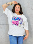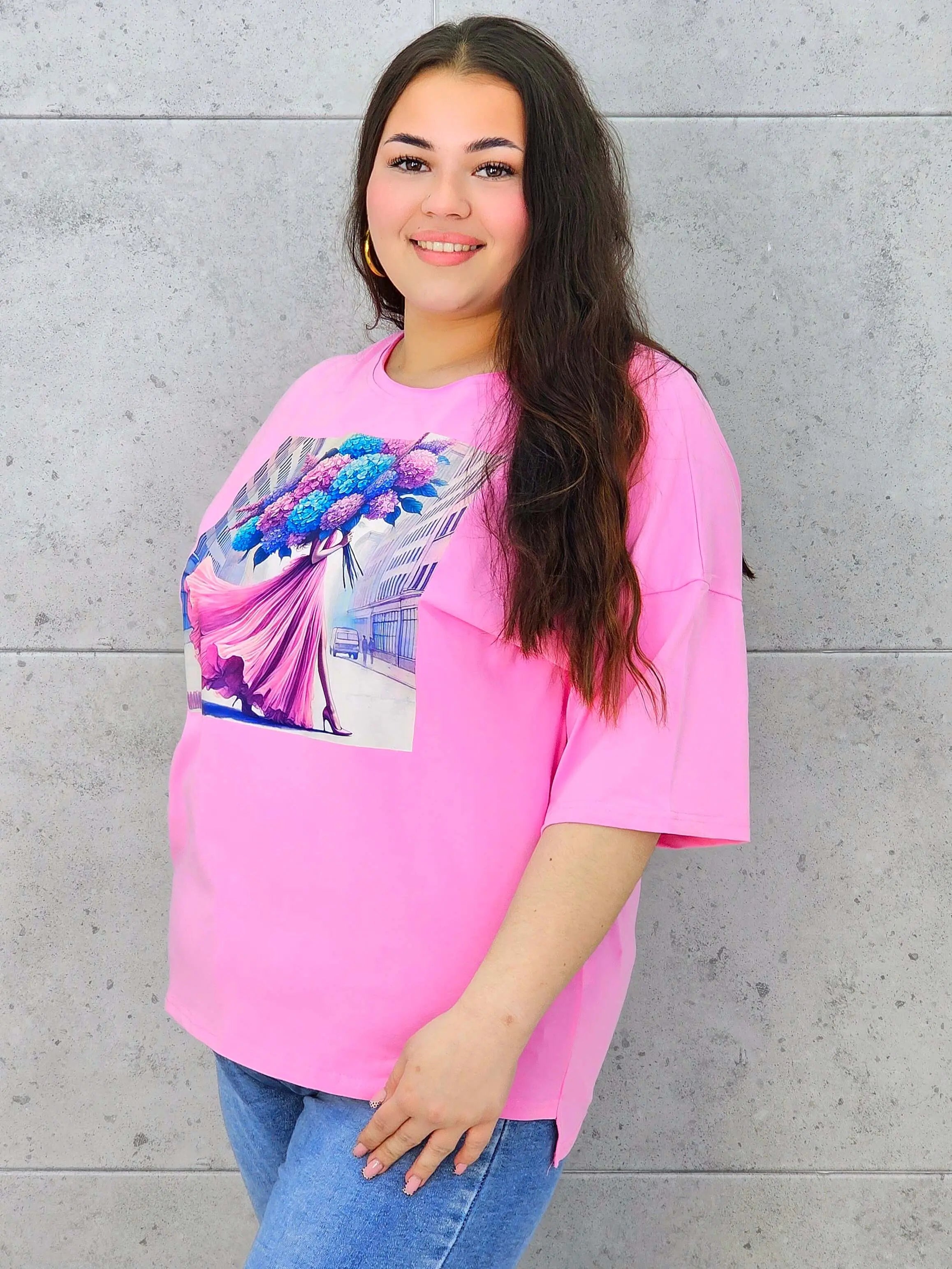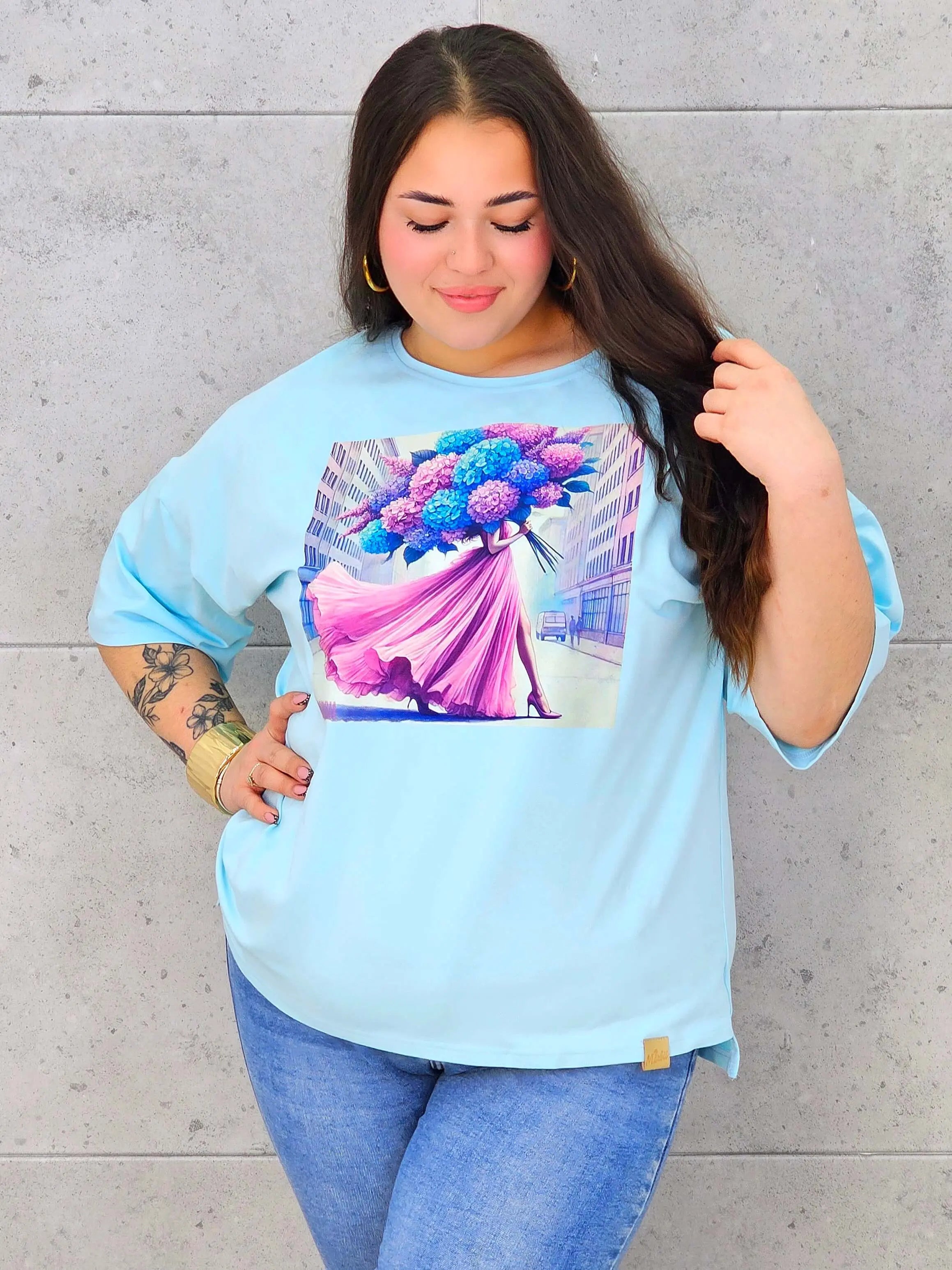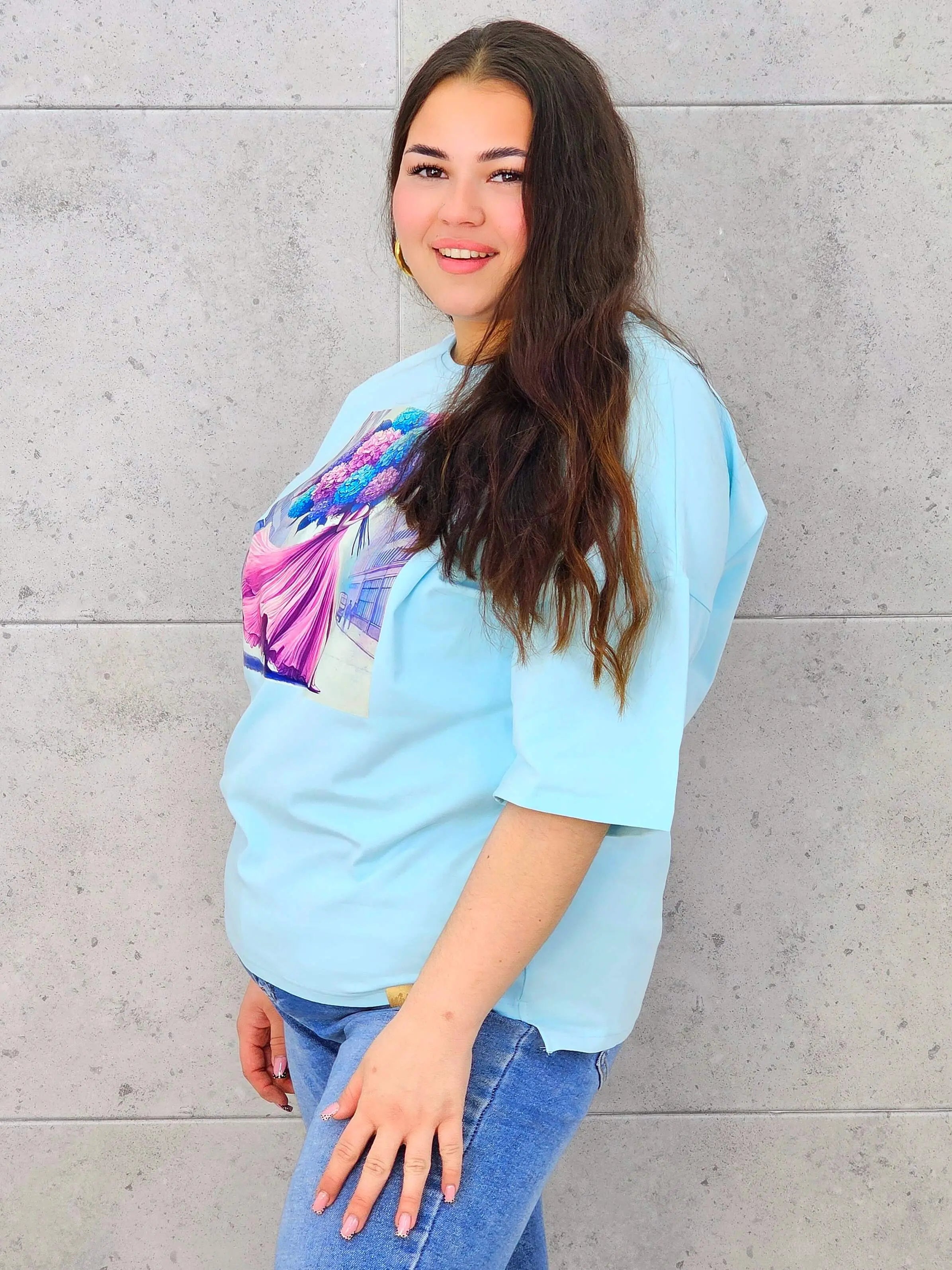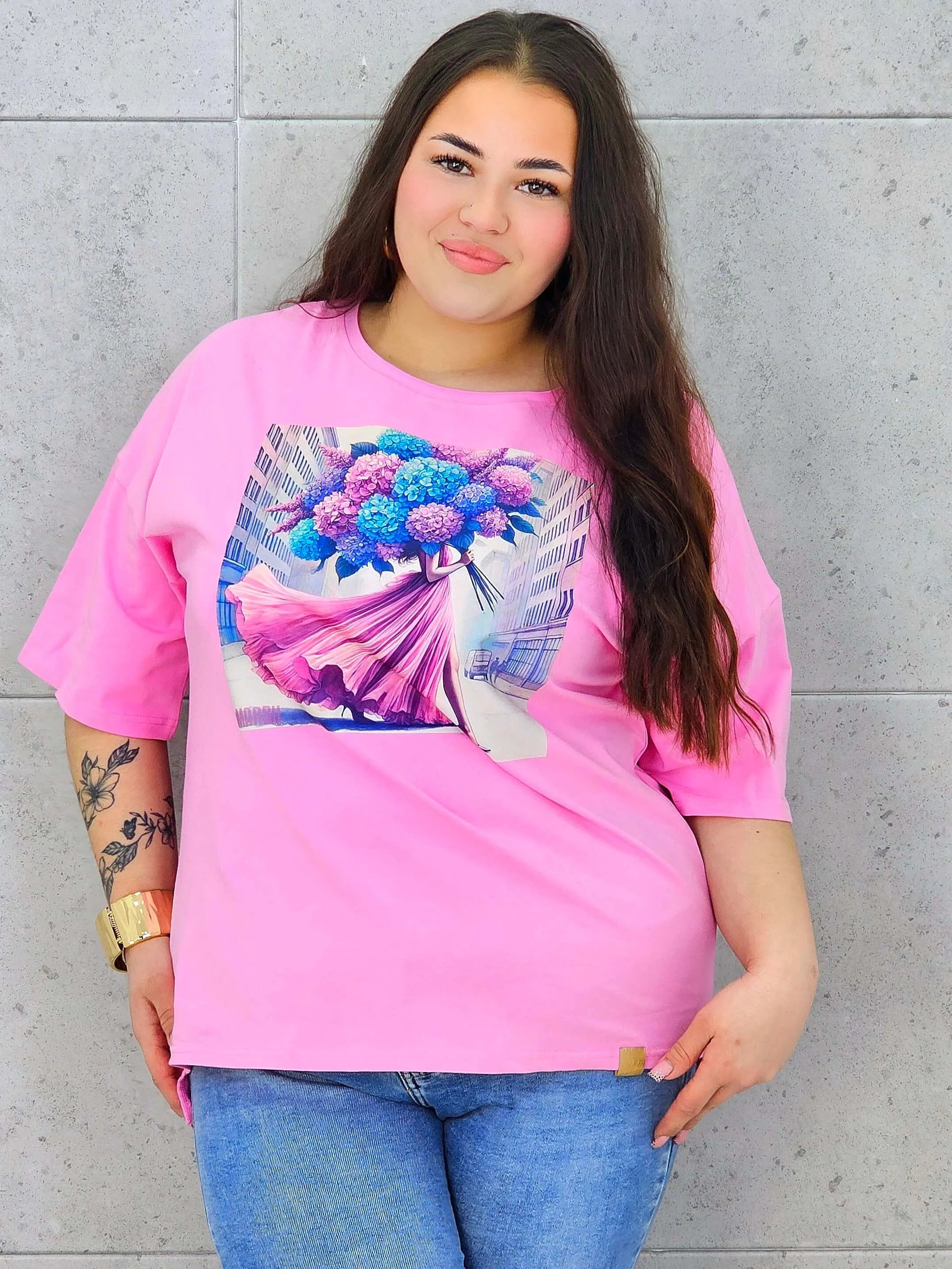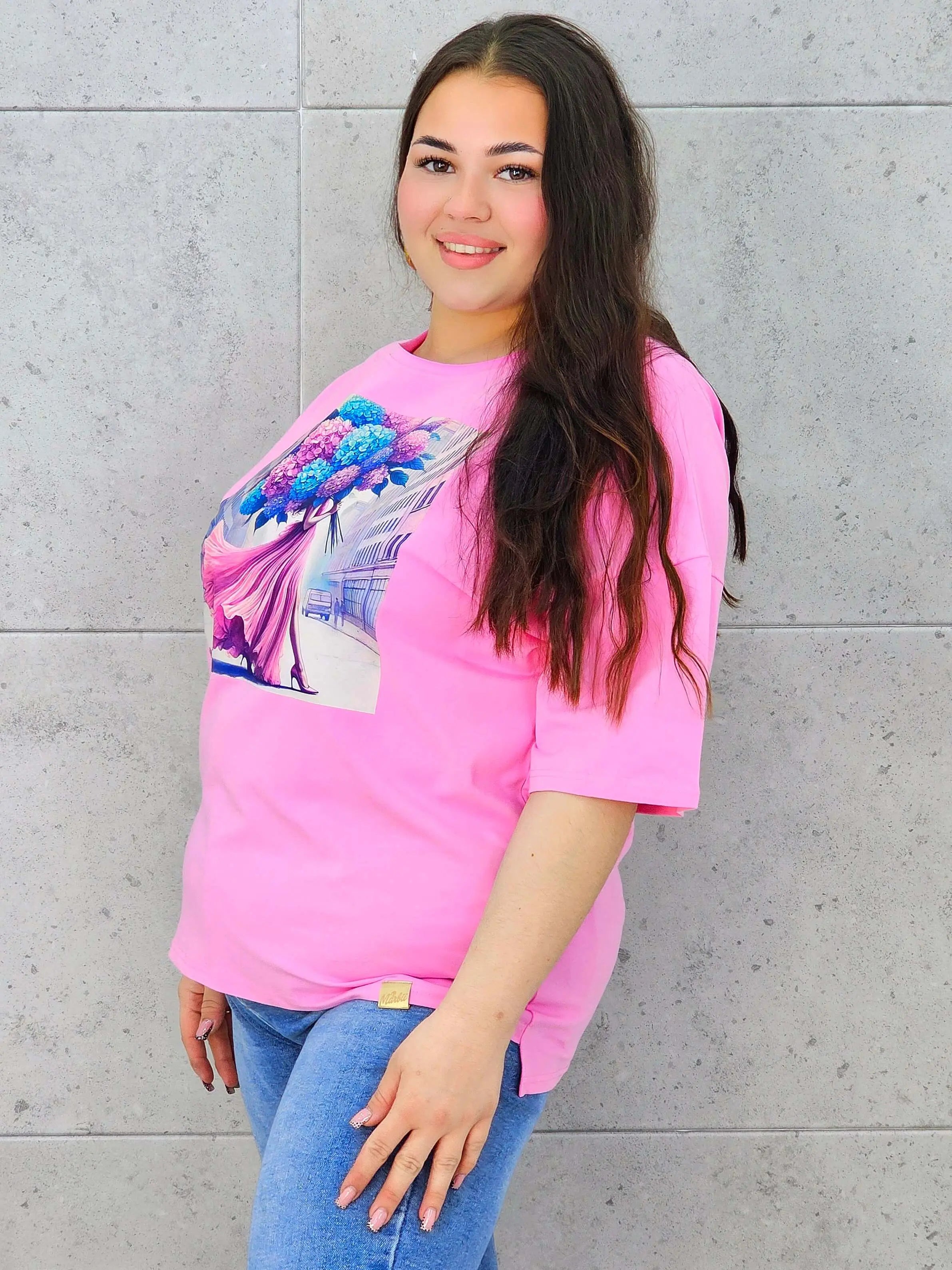 Ten T-shirt plus size świetnie podkreśla sylwetkę, nie opinając jej, a jednocześnie dodaje lekkości i energii dzięki efektownemu nadrukowi. Idealny zarówno na co dzień, jak i do casualowych stylizacji z jeansami czy spódnicą.