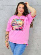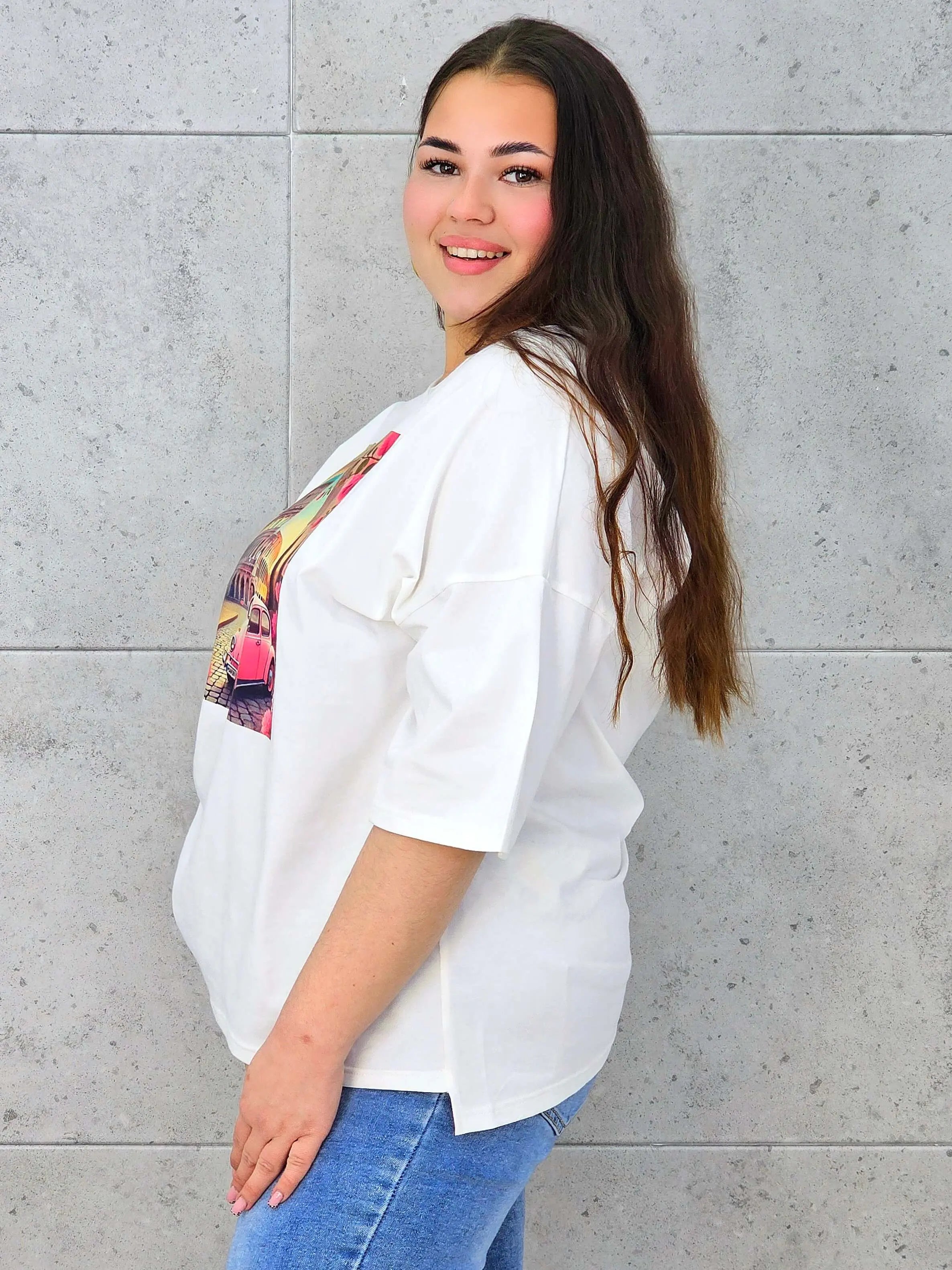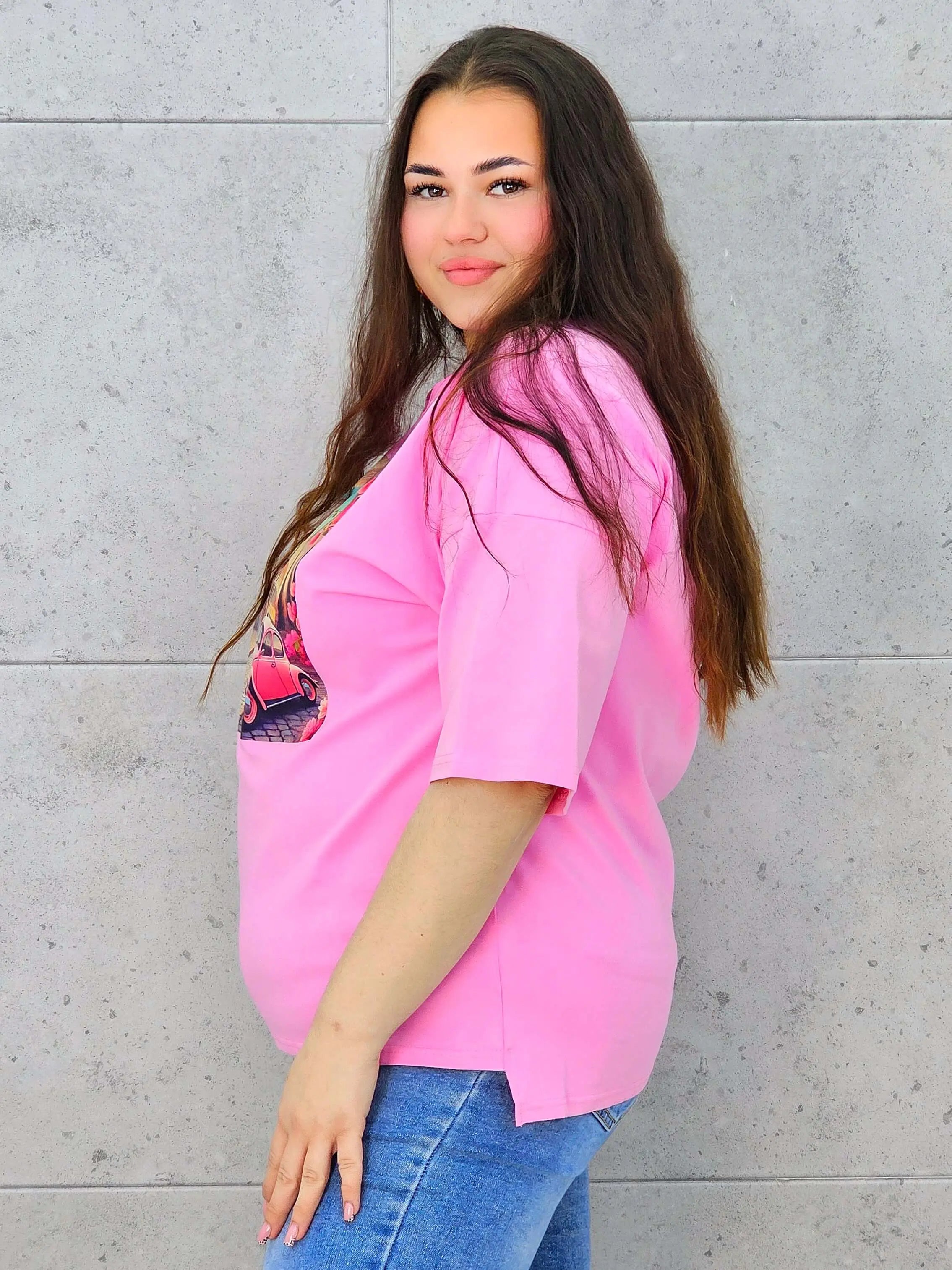 Bluzka plus size z romantycznym nadrukiem przedstawiającym urokliwe włoskie uliczki i kultowego garbusa to propozycja dla kobiet, które lubią wyróżniać się modnym, artystycznym stylem. Model zachwyca swobodnym krojem zapewniającym komfort w rozmiarach XXL oraz wysoką jakością materiału przyjemnego dla skóry.
