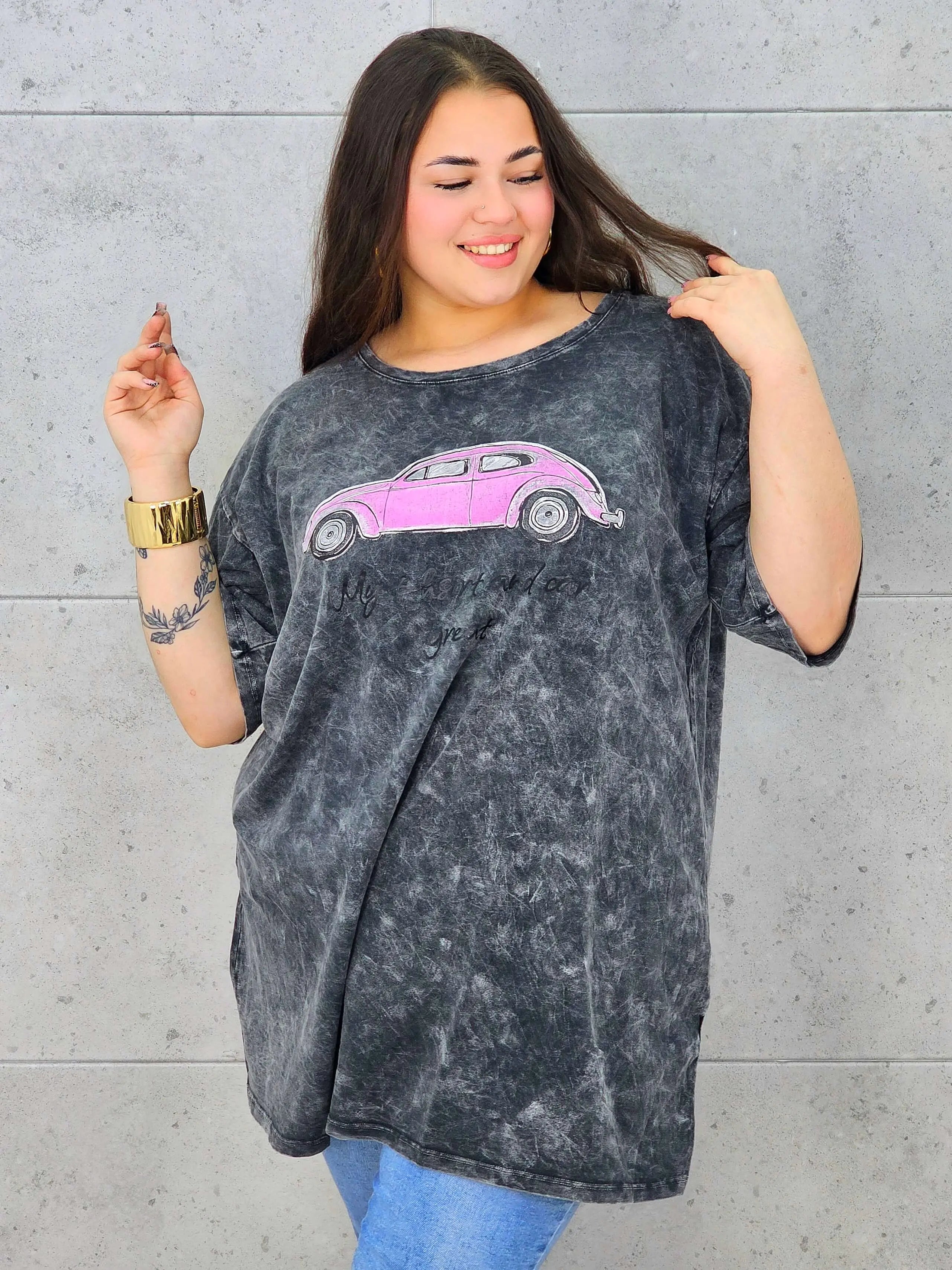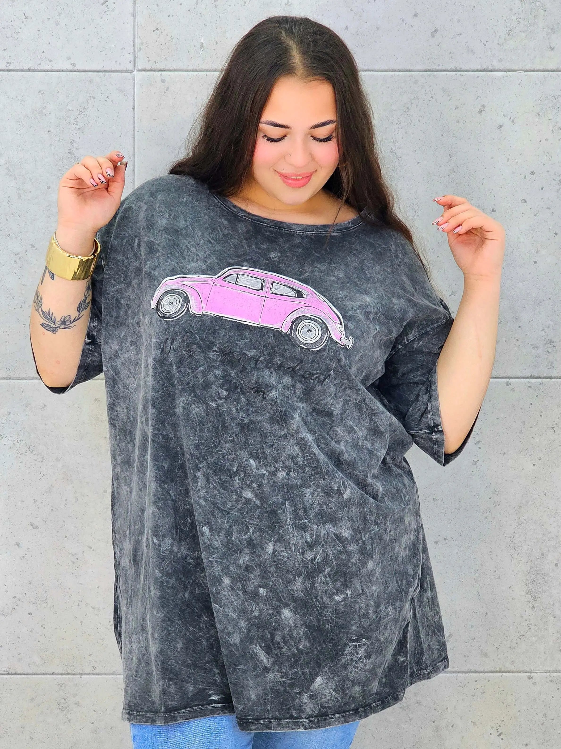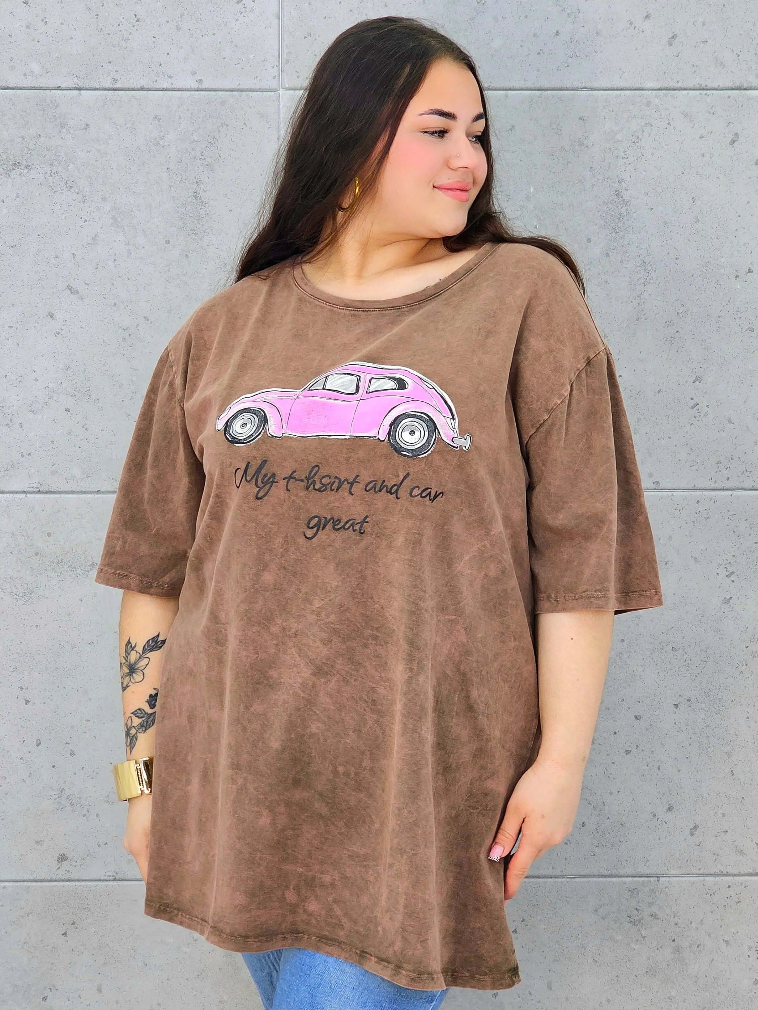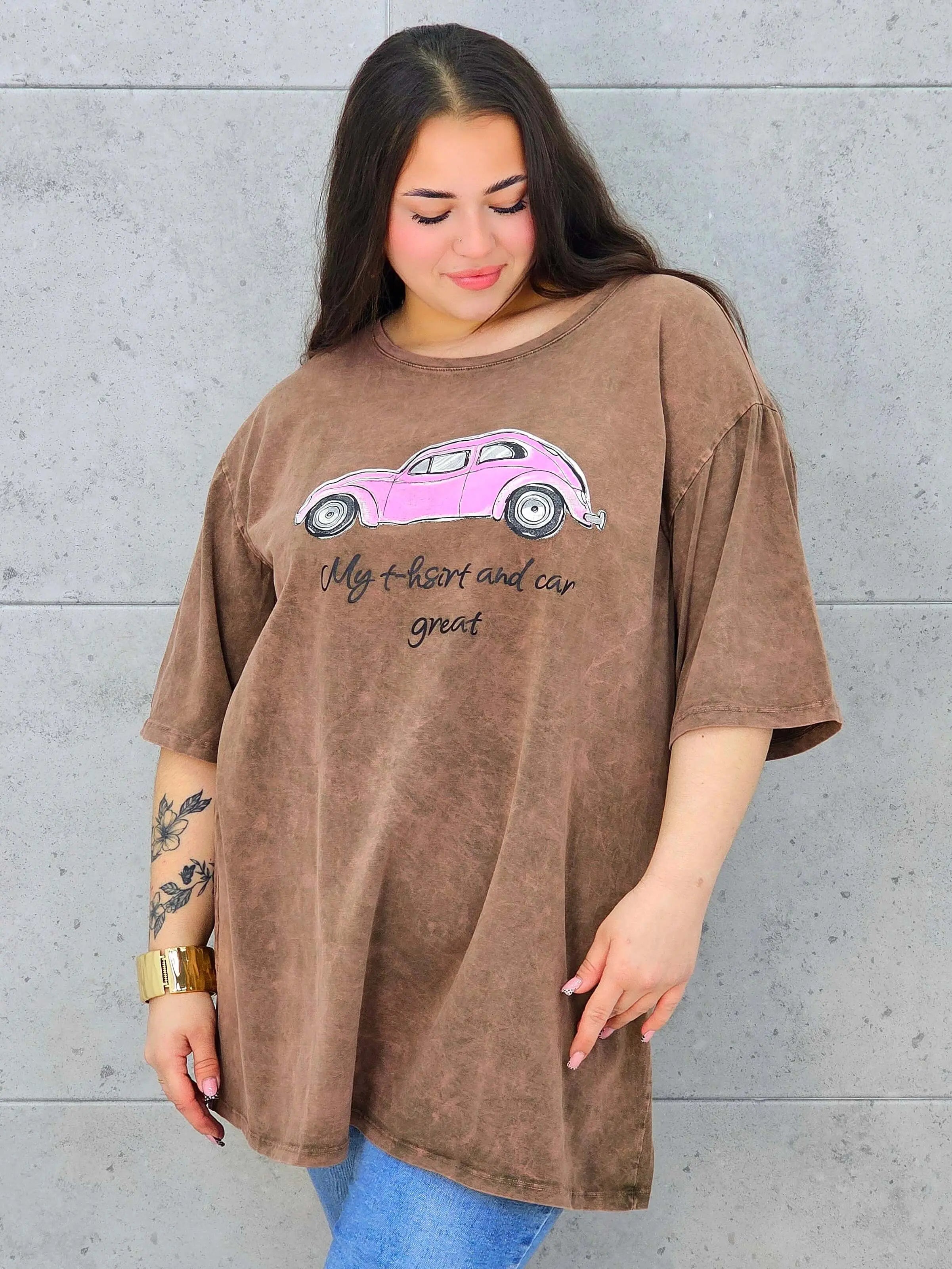Bluzka plus size to propozycja dla kobiet, które kochają modę z charakterem i chcą czuć się swobodnie na co dzień. Luźny, oversize’owy fason zapewnia pełen komfort, a miękki materiał pięknie układa się na sylwetce, podkreślając lekkość stylizacji. Centralny nadruk z autem dodaje całości unikalnego, młodzieżowego akcentu — idealny dla kobiet, które lubią oryginalne detale.
