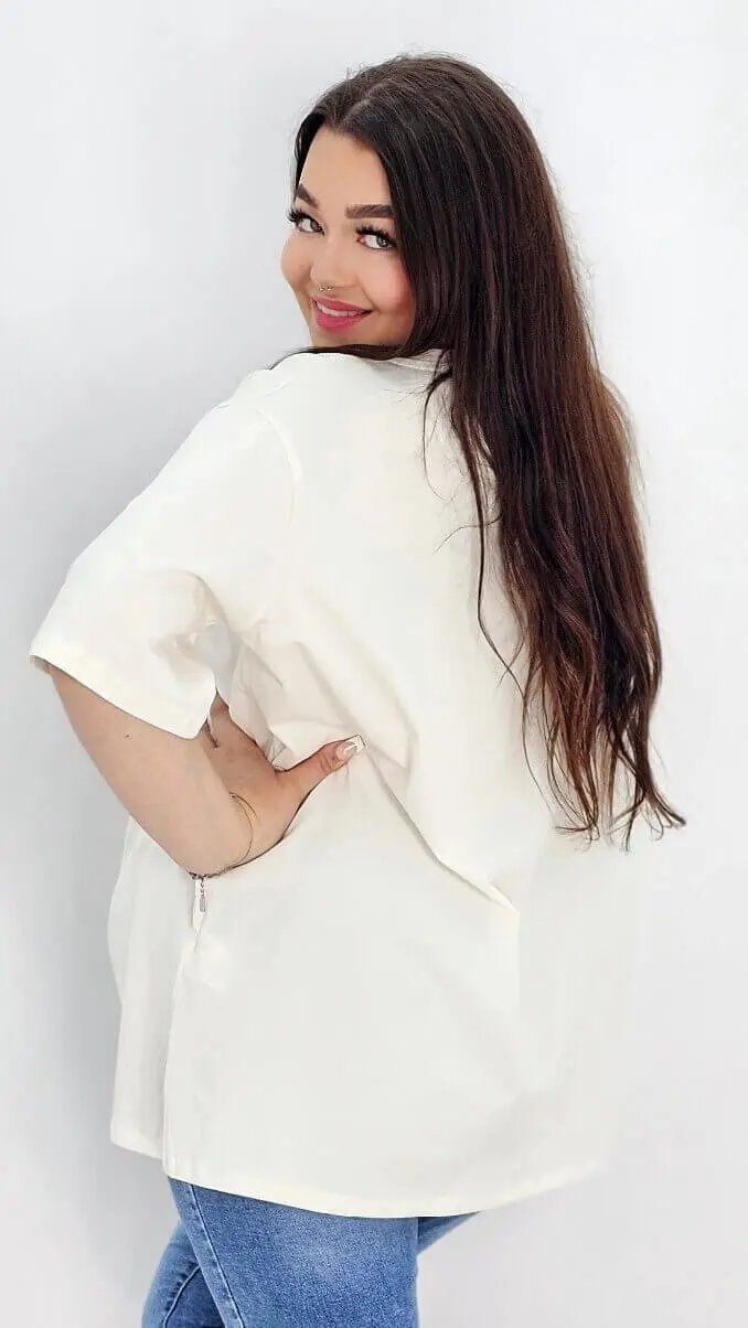 Wyjątkowa bluzka z dekoracyjną aplikacją 3D w kształcie flakonika, która przyciąga wzrok i nadaje stylizacji unikalnego charakteru. Misternie marszczona tkanina tworzy trójwymiarowy efekt, a naszyty haft z subtelnym motywem geometrycznym dodaje całości wyrafinowanego wykończenia.