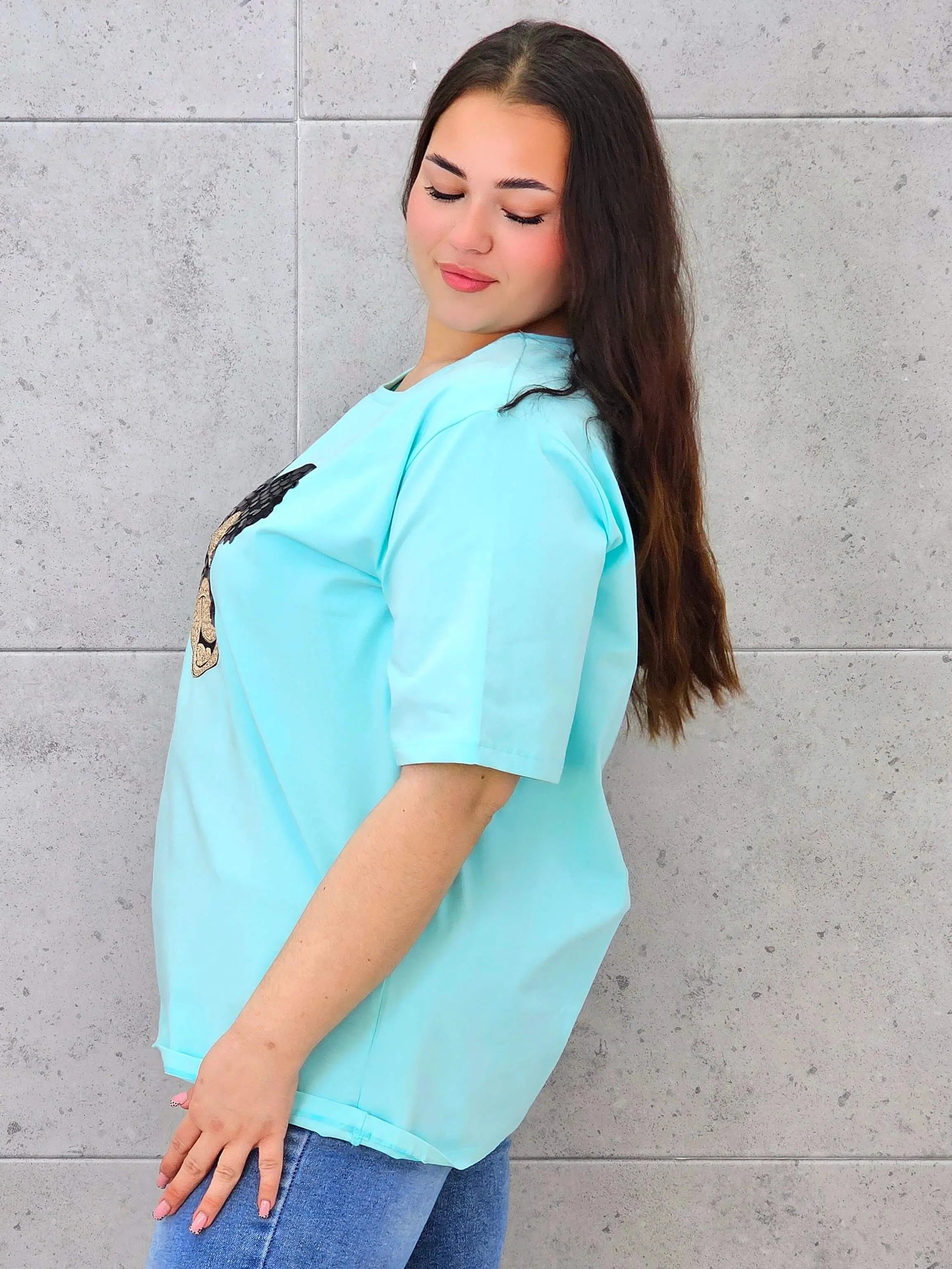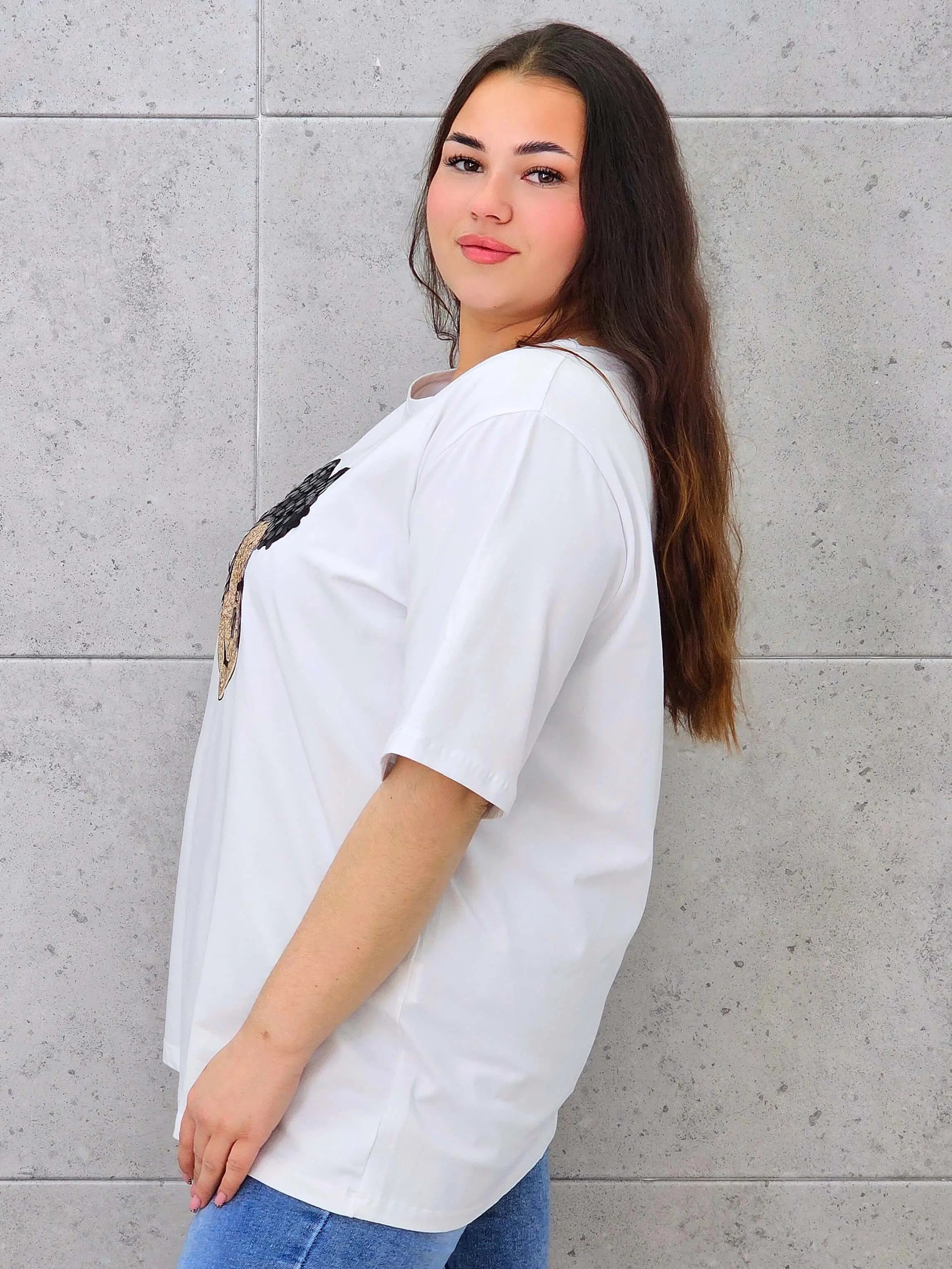 Wyróżnij się unikalnym stylem dzięki bluzce z efektownym nadrukiem i błyszczącymi cekinami. Ten model łączy komfort codziennego noszenia z nutą oryginalności i świetnie sprawdzi się w każdej casualowej stylizacji.