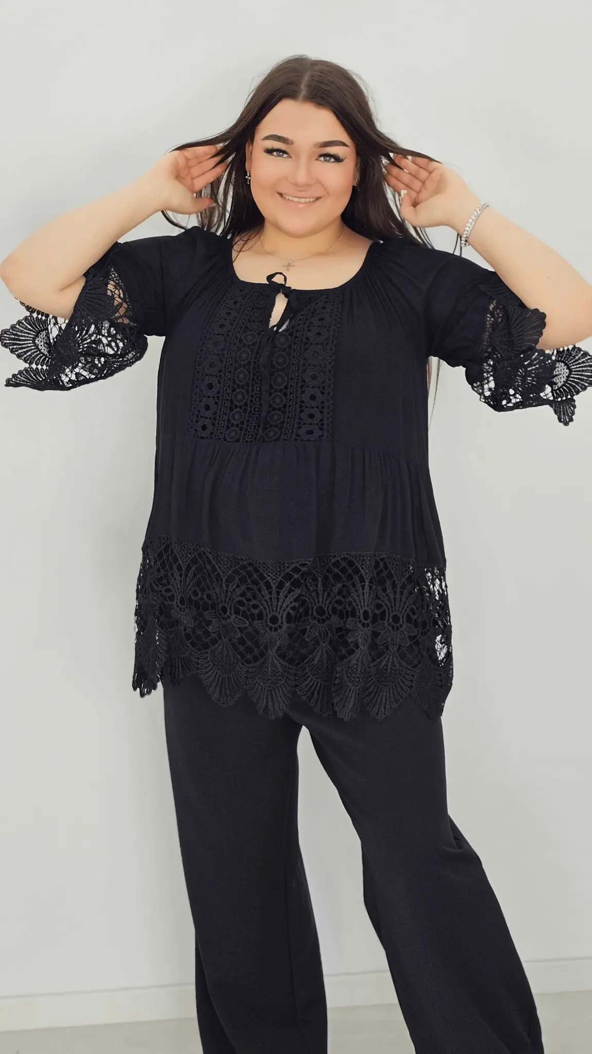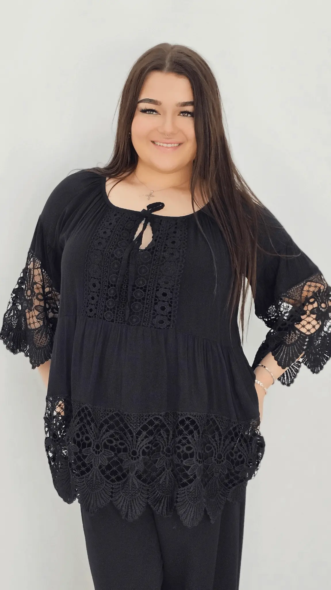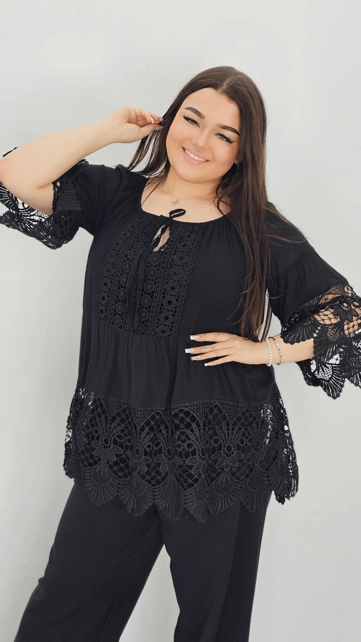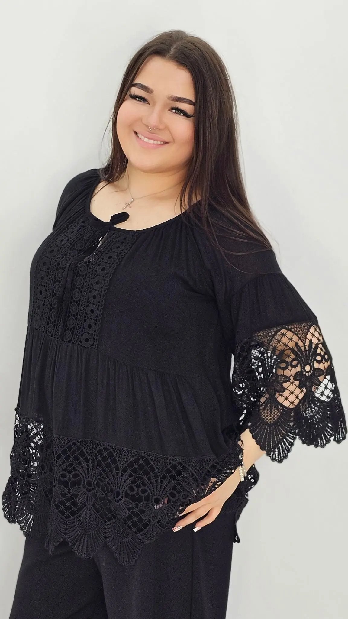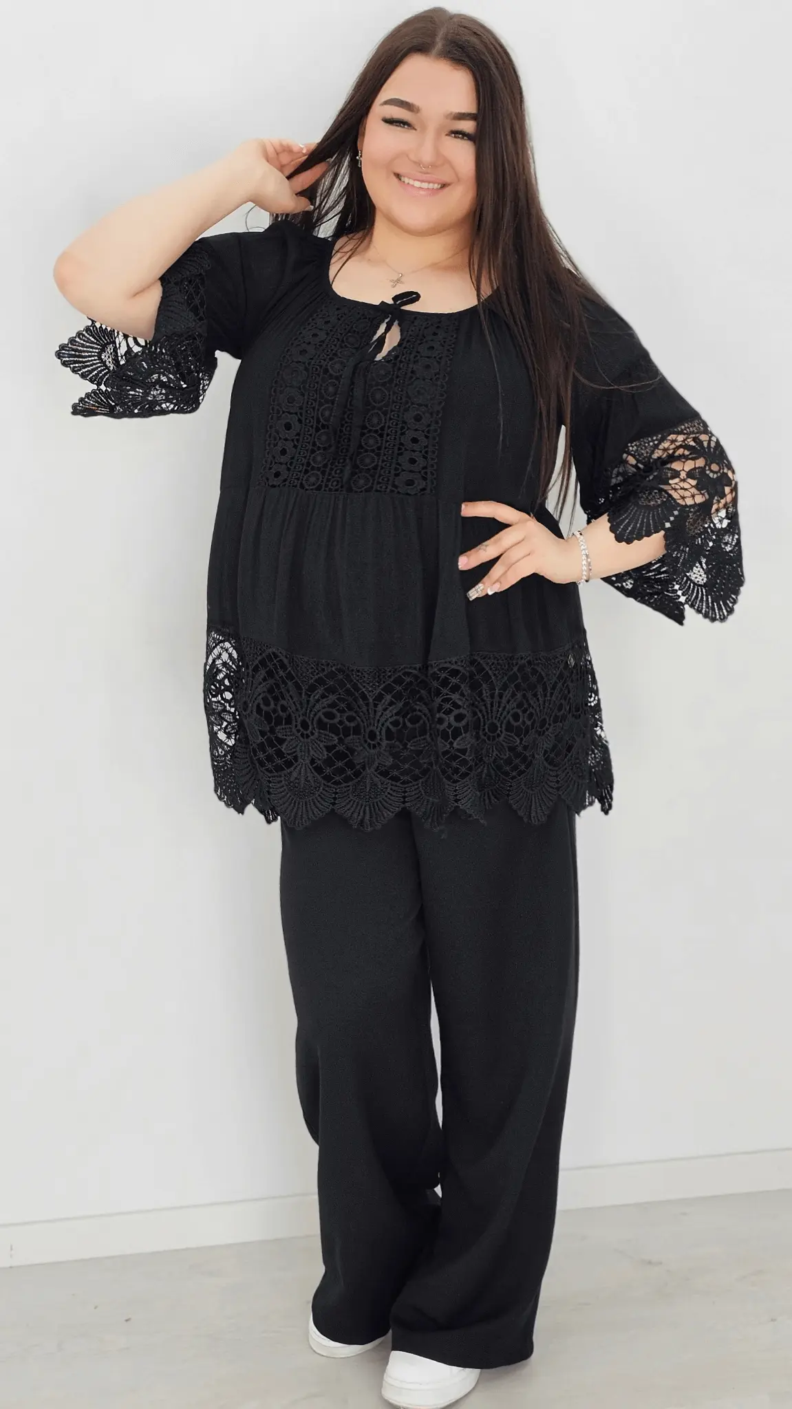 Bluzka z wiązaniem przy dekolcie oraz wstawki koronki - czarna