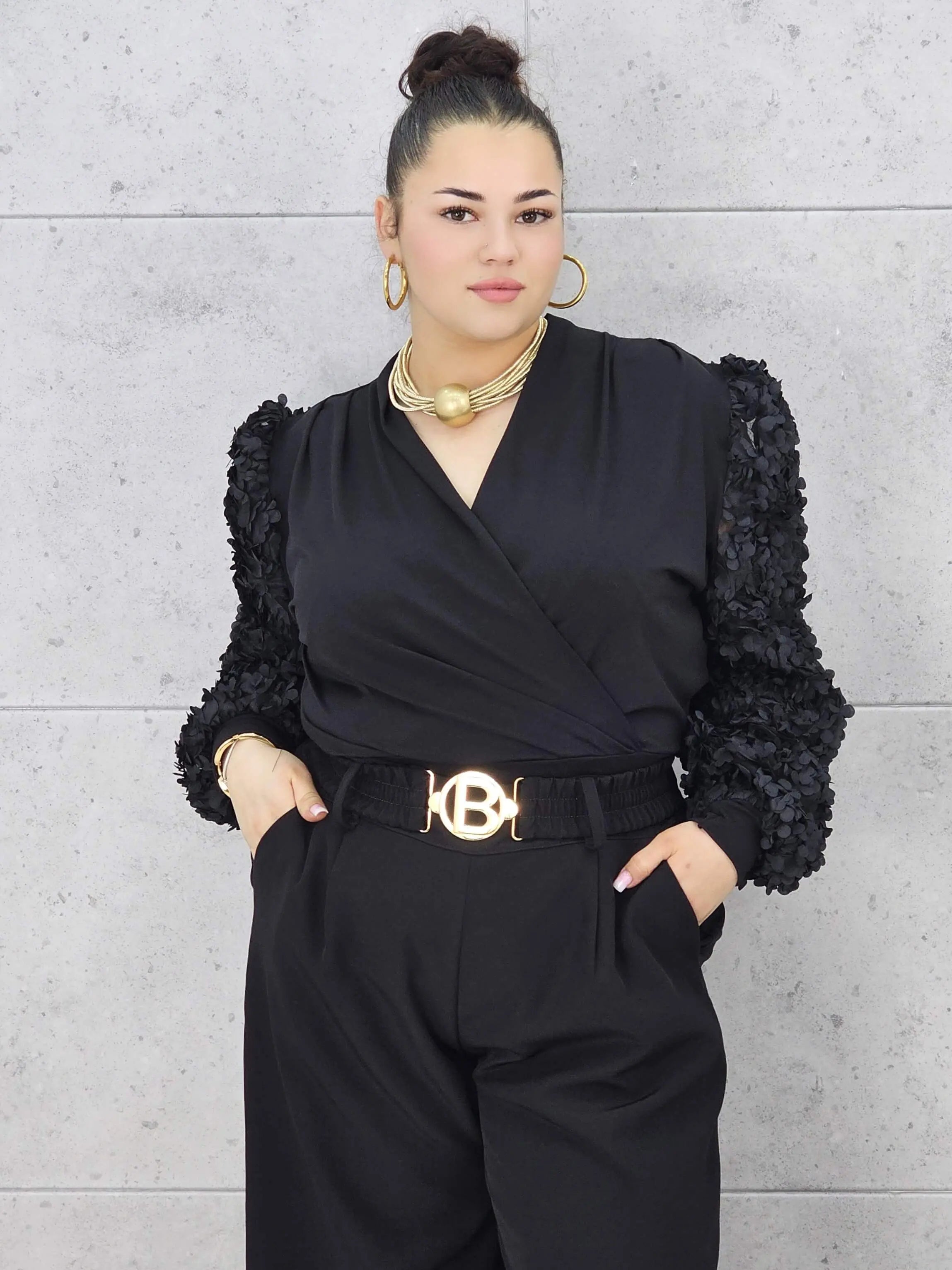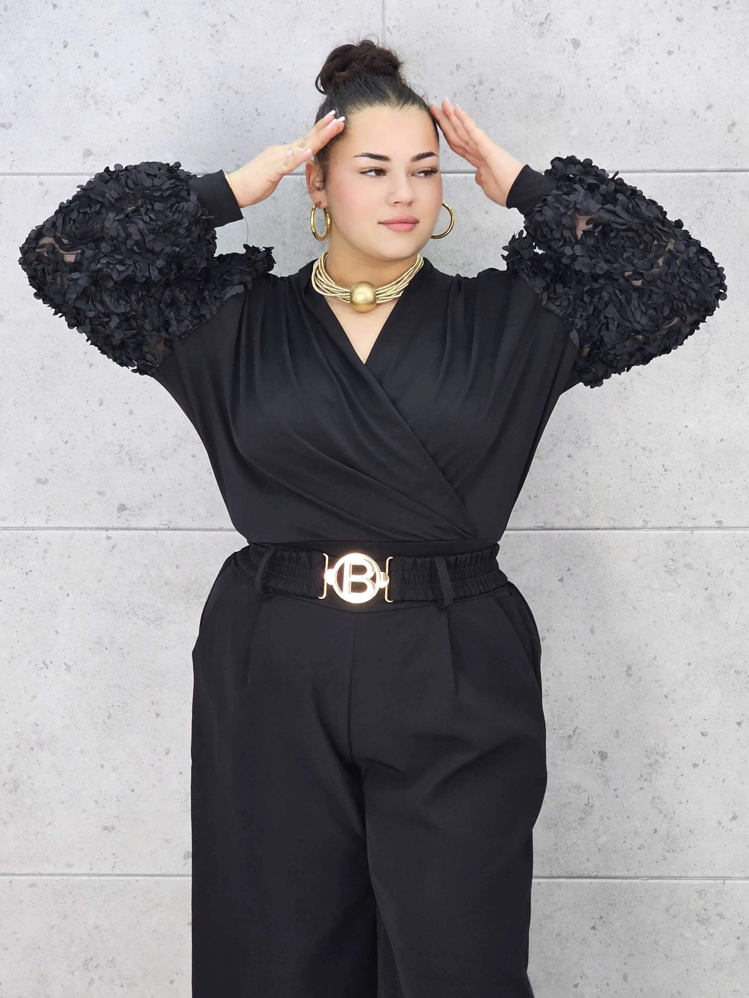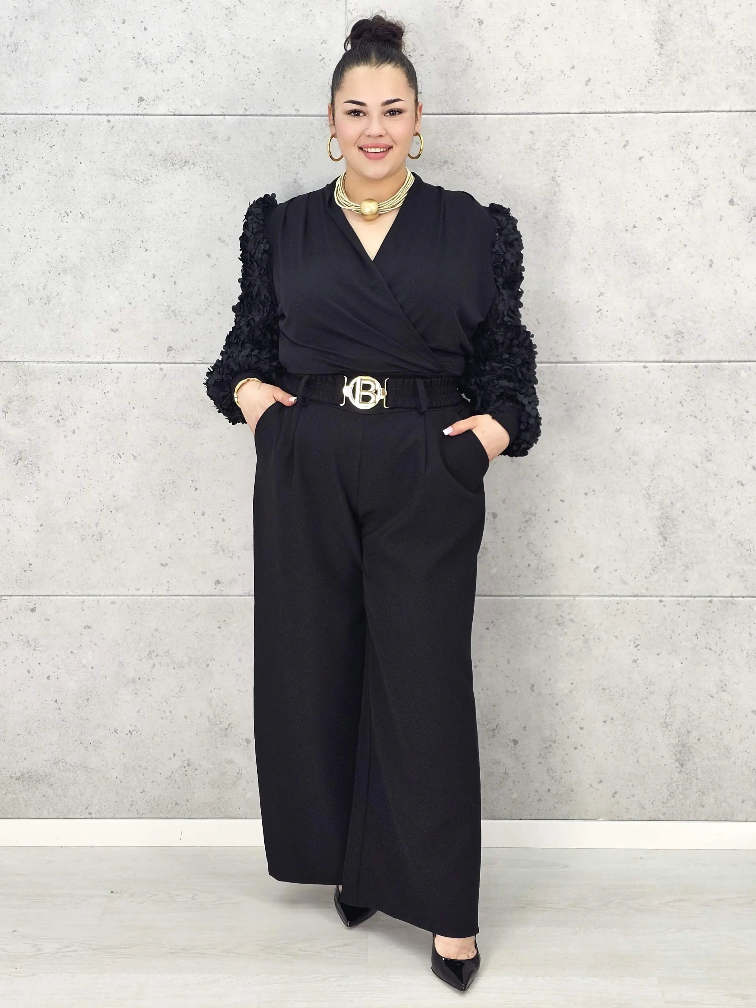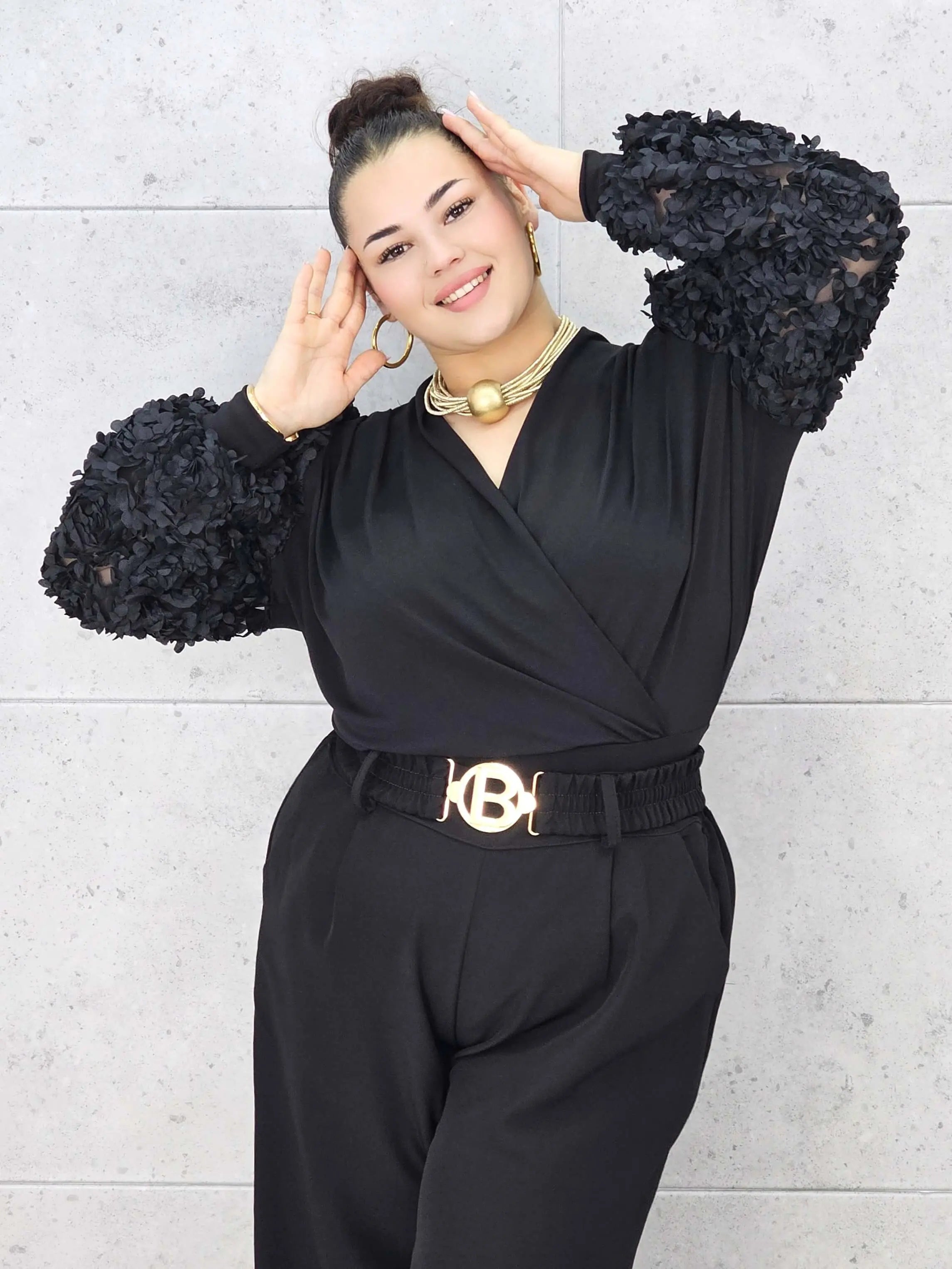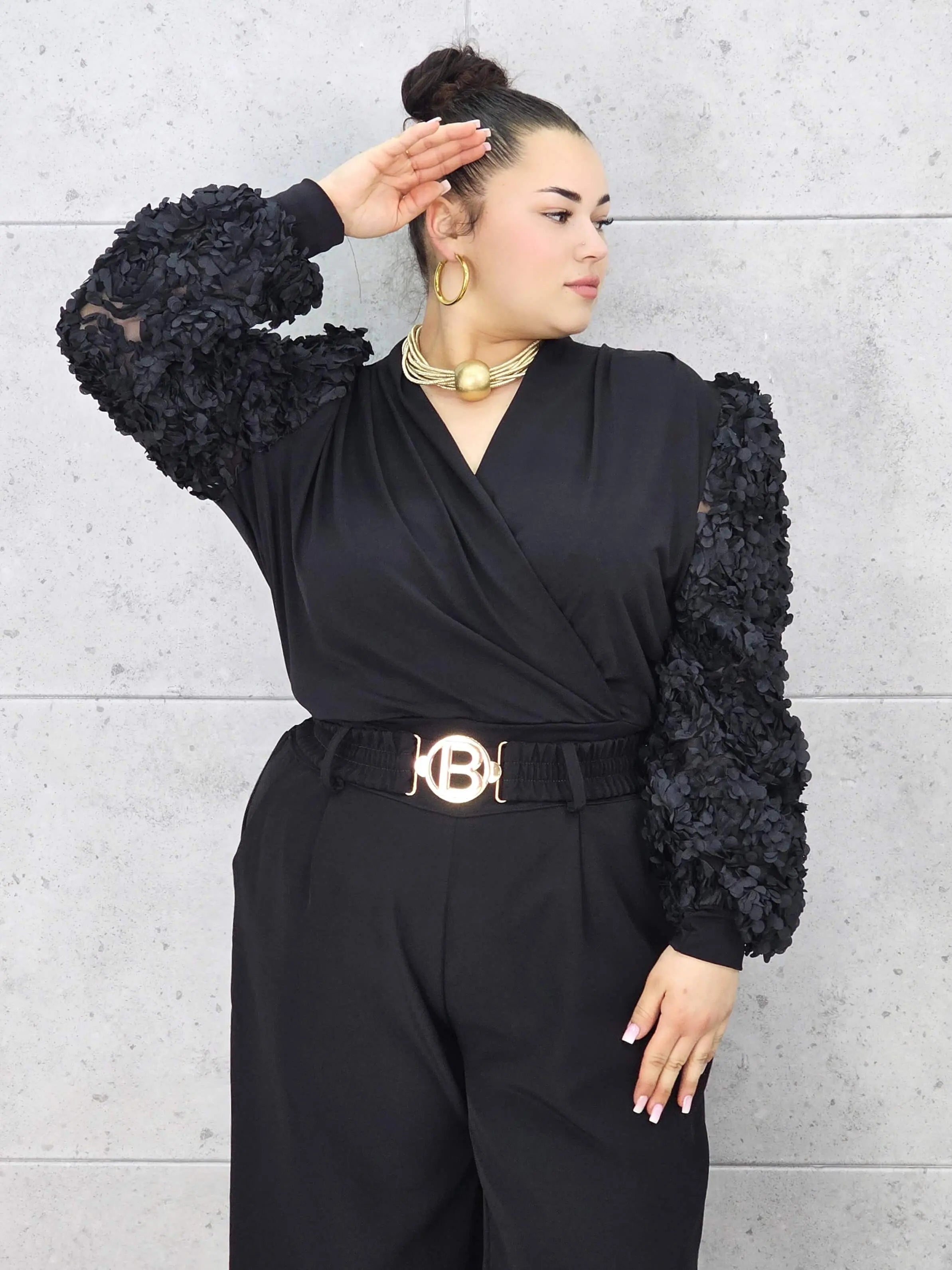 Body plus size to idealna propozycja dla kobiet, które kochają połączenie wygody, elegancji i efektownych detali. Model z kopertowym dekoltem pięknie podkreśla linię biustu, a spektakularne rękawy zdobione trójwymiarowymi aplikacjami dodają całości nowoczesnego charakteru. To body stworzone do wyjątkowych stylizacji – od wieczornych wyjść aż po eleganckie zestawy biznesowe.