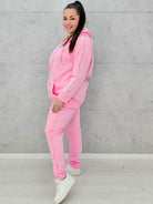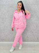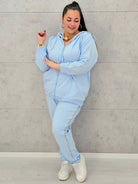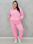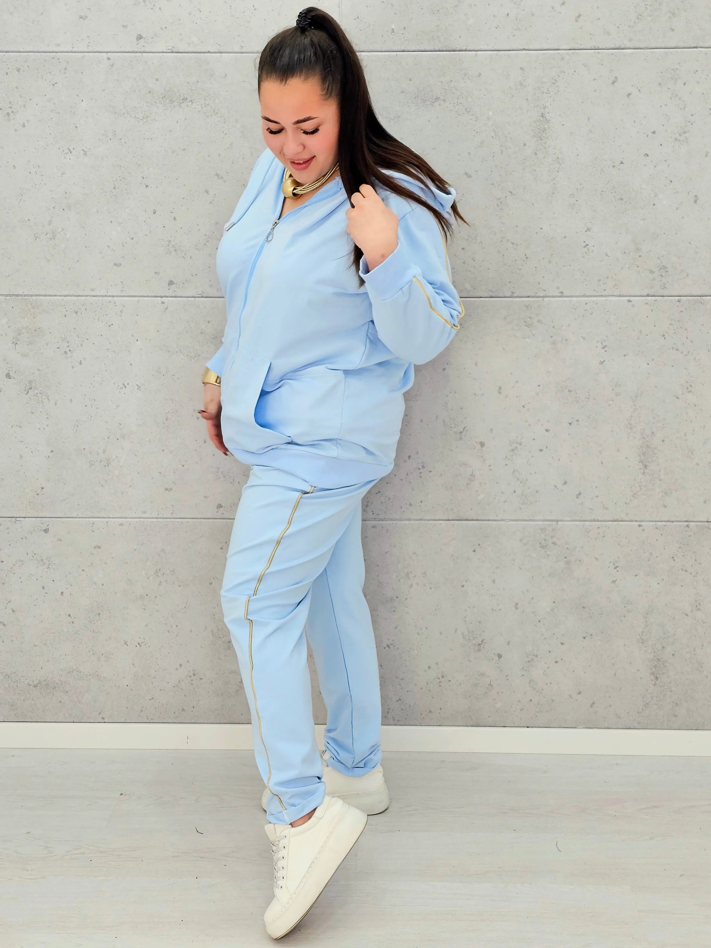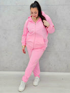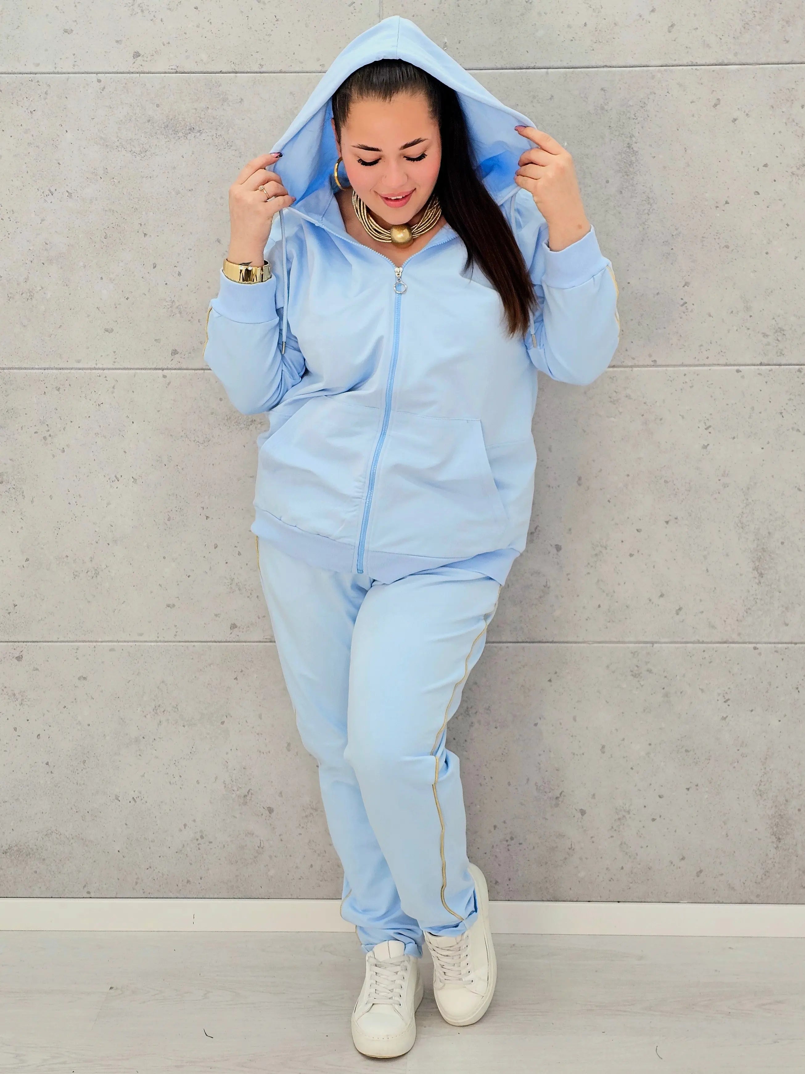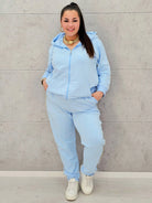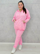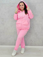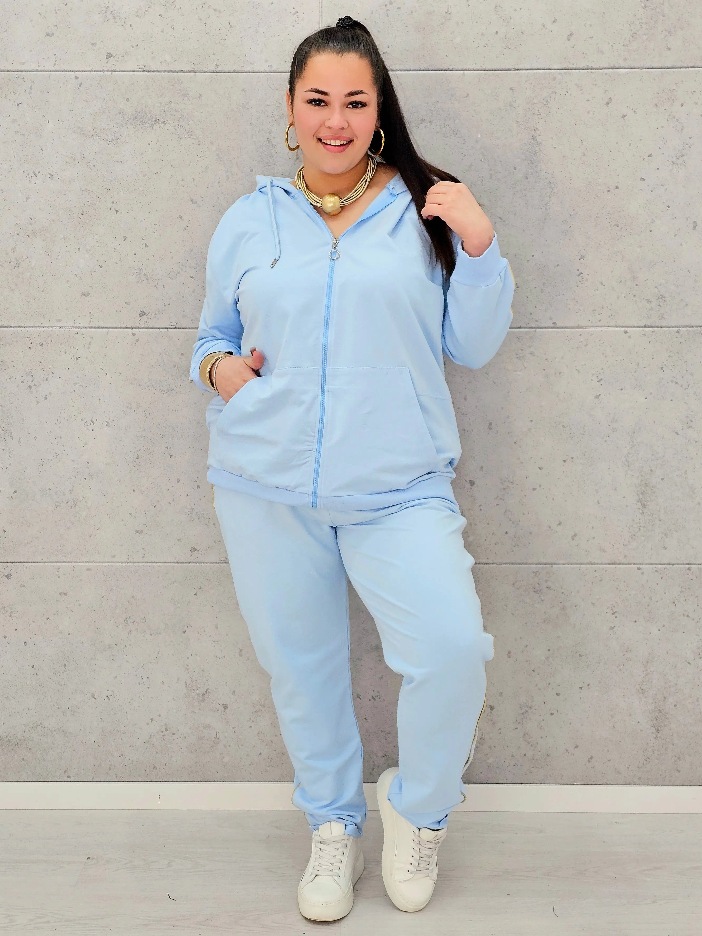 Bluza posiada praktyczne kieszenie i wygodny kaptur, a spodnie zostały wykończone zwężanymi nogawkami, które wysmuklają nogi. To ponadczasowy model, który łączy w sobie praktyczność, wygodę i lekki sportowy charakter, idealnie wpisując się w modę plus size dla kobiet.