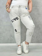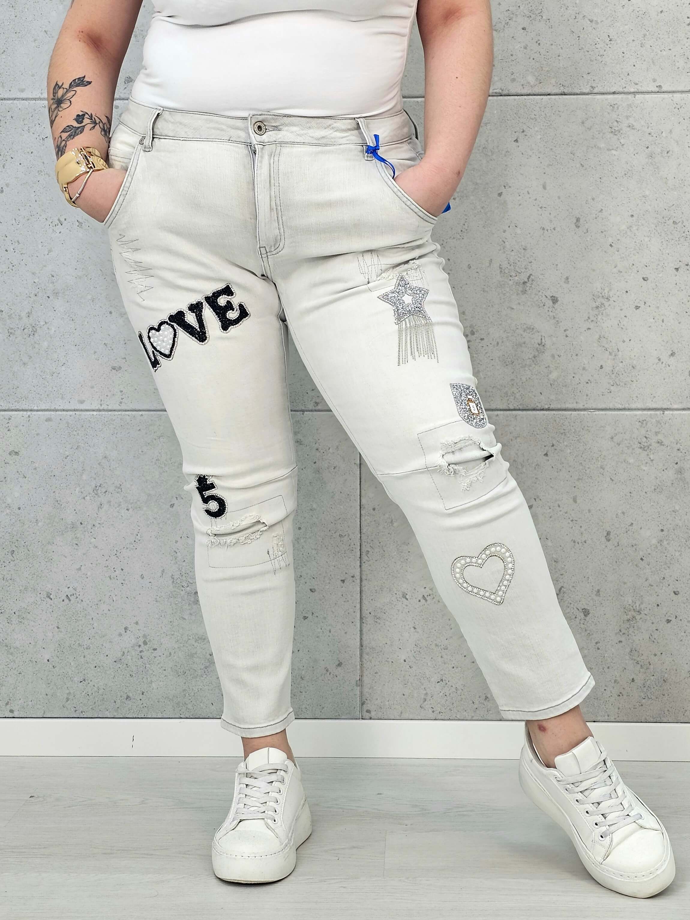 Wyrazisty napis LOVE umieszczony na nogawce nadaje spodniom odważnego, streetwearowego charakteru. Szary denim jest ponadczasowy i łatwy do łączenia, dzięki czemu spodnie doskonale komponują się zarówno z t-shirtami, jak i elegantszymi koszulami.