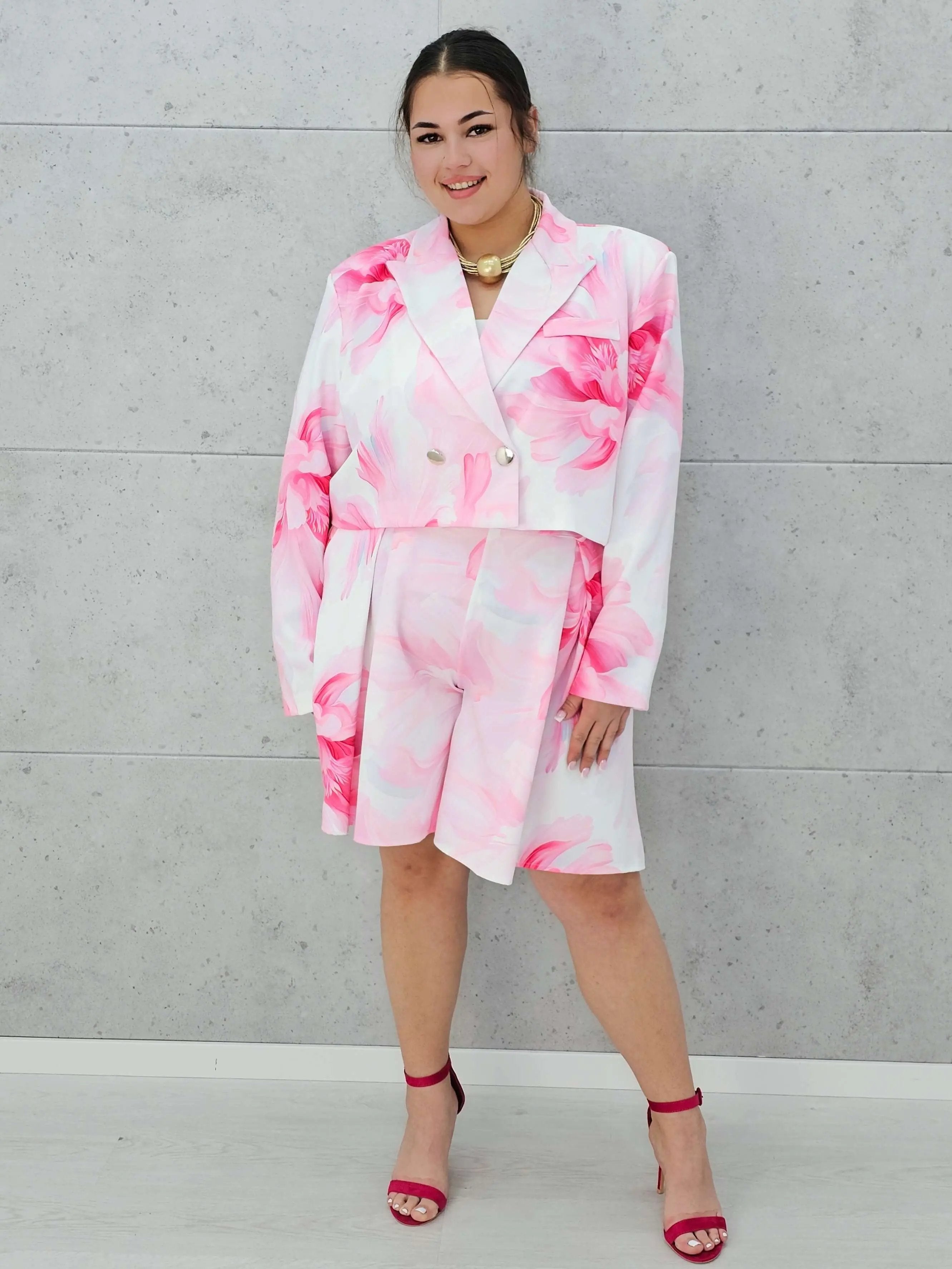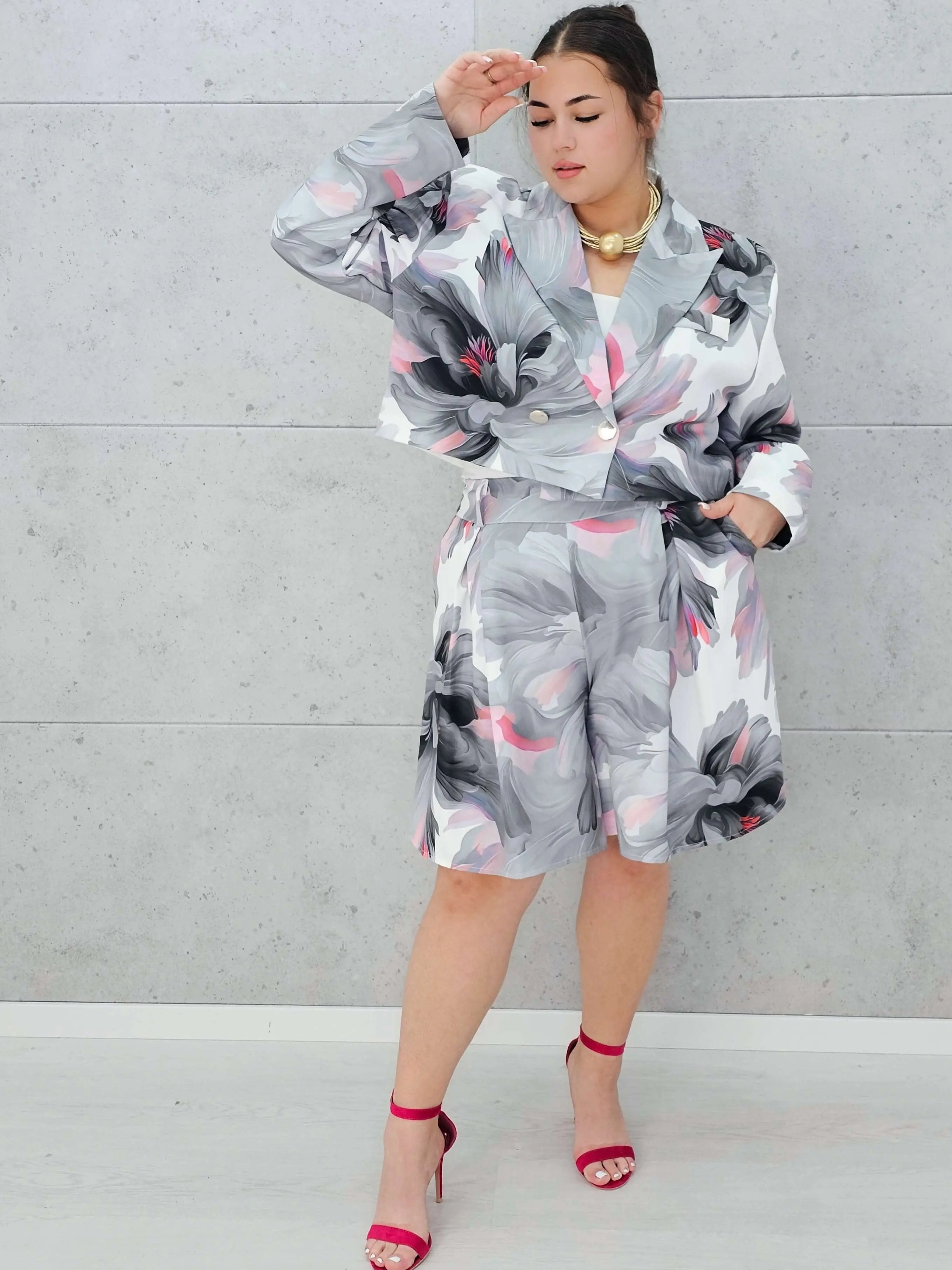 Wyrazisty print dodaje całości nowoczesnego charakteru – w połączeniu z klasycznym krojem tworzy look pełen świeżości i energii. Krótsza marynarka wysmukla proporcje, a szorty o idealnej długości zapewniają wygodę i modny wygląd.