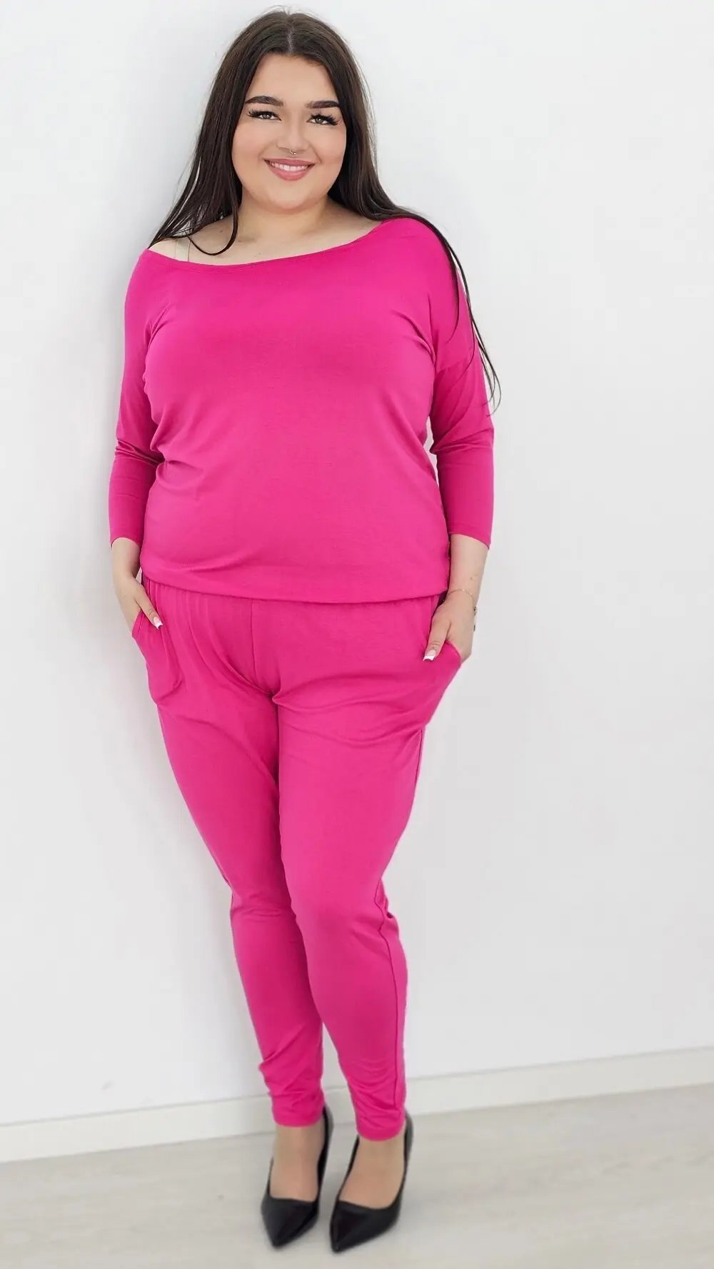 Kombinezon w kolorze fuksji z kieszeniami, w tali gumki , rękaw 3/4.