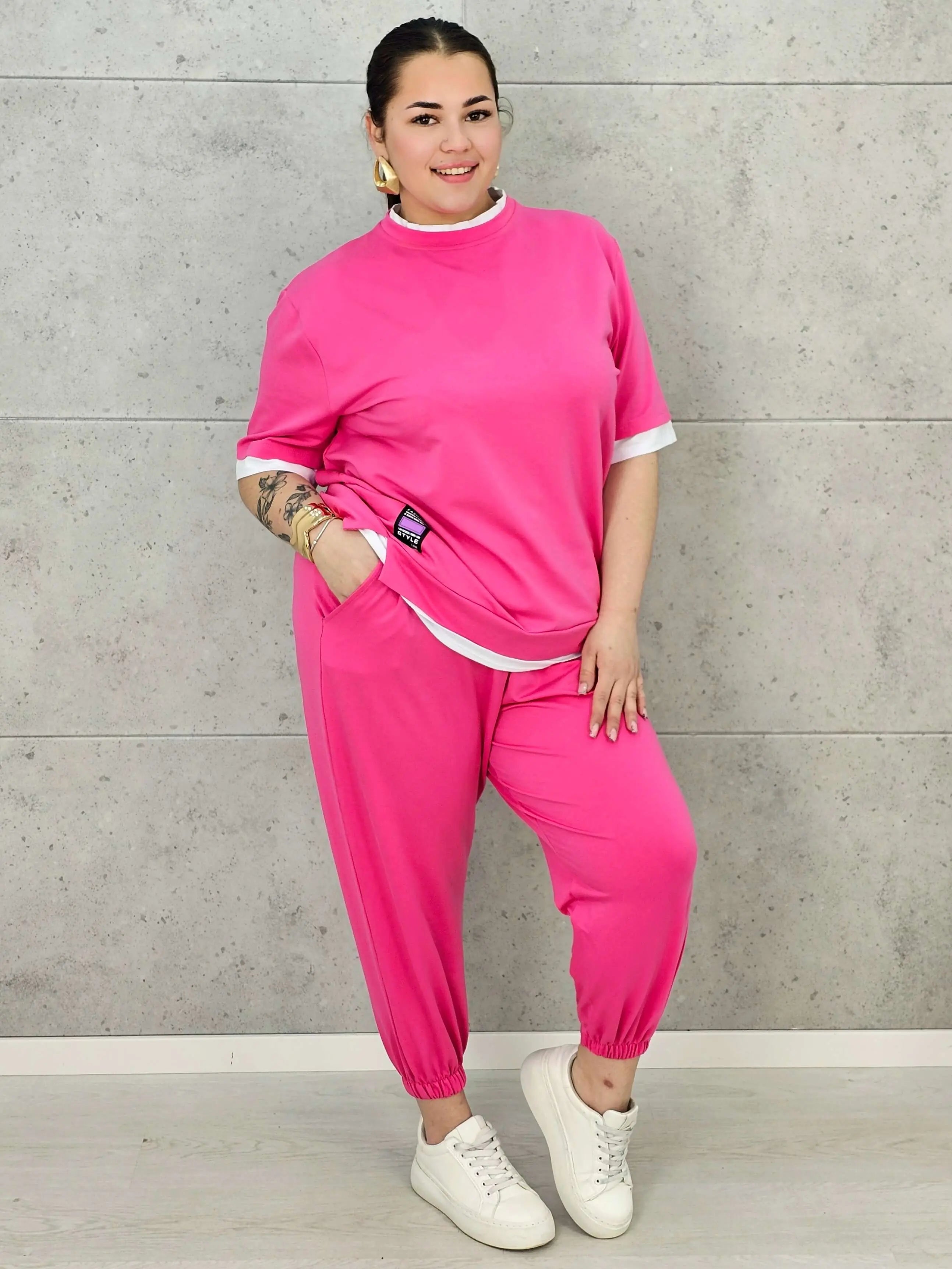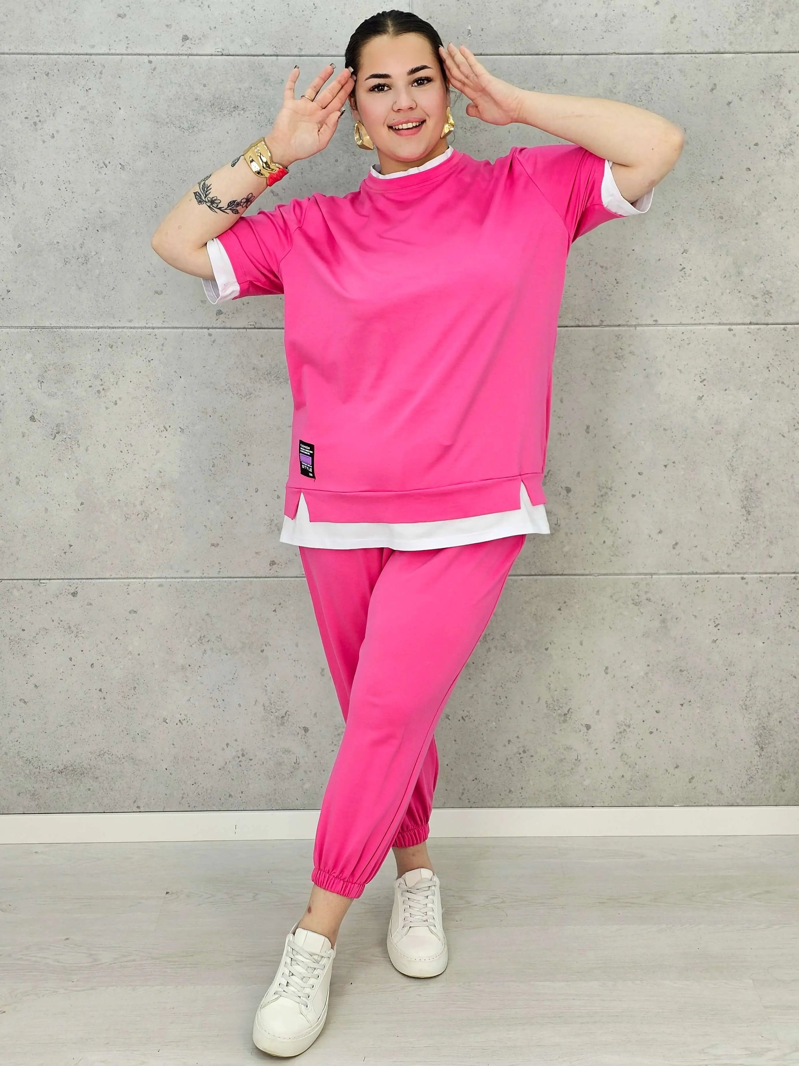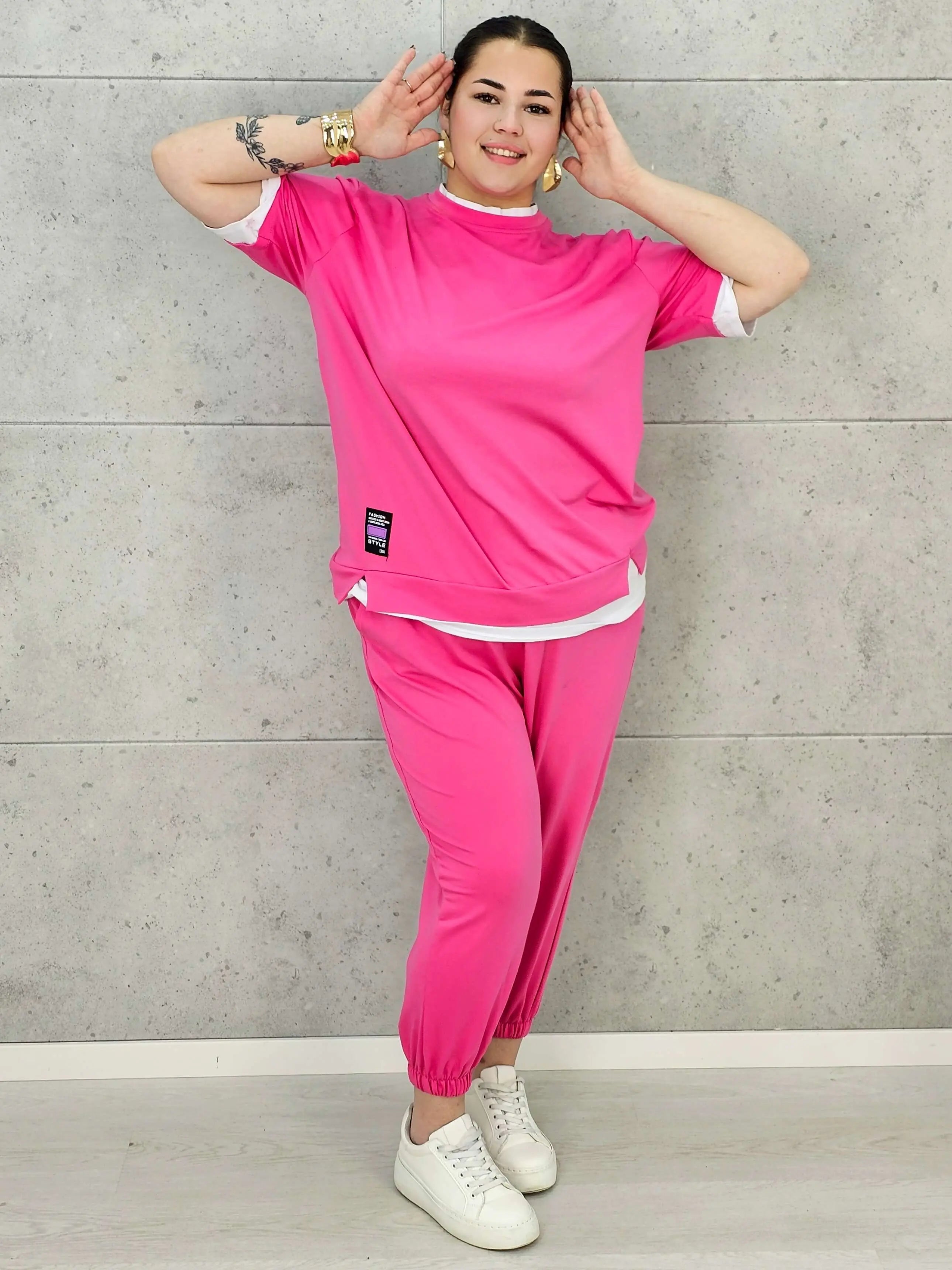 Ten komplet dresowy XXL możesz nosić zarówno jako spójny zestaw, jak i miksować z innymi częściami garderoby — bluzą z jeansami lub spodniami dresowymi z klasycznym t-shirtem. To wszechstronny model, który sprawdzi się w wielu codziennych stylizacjach.