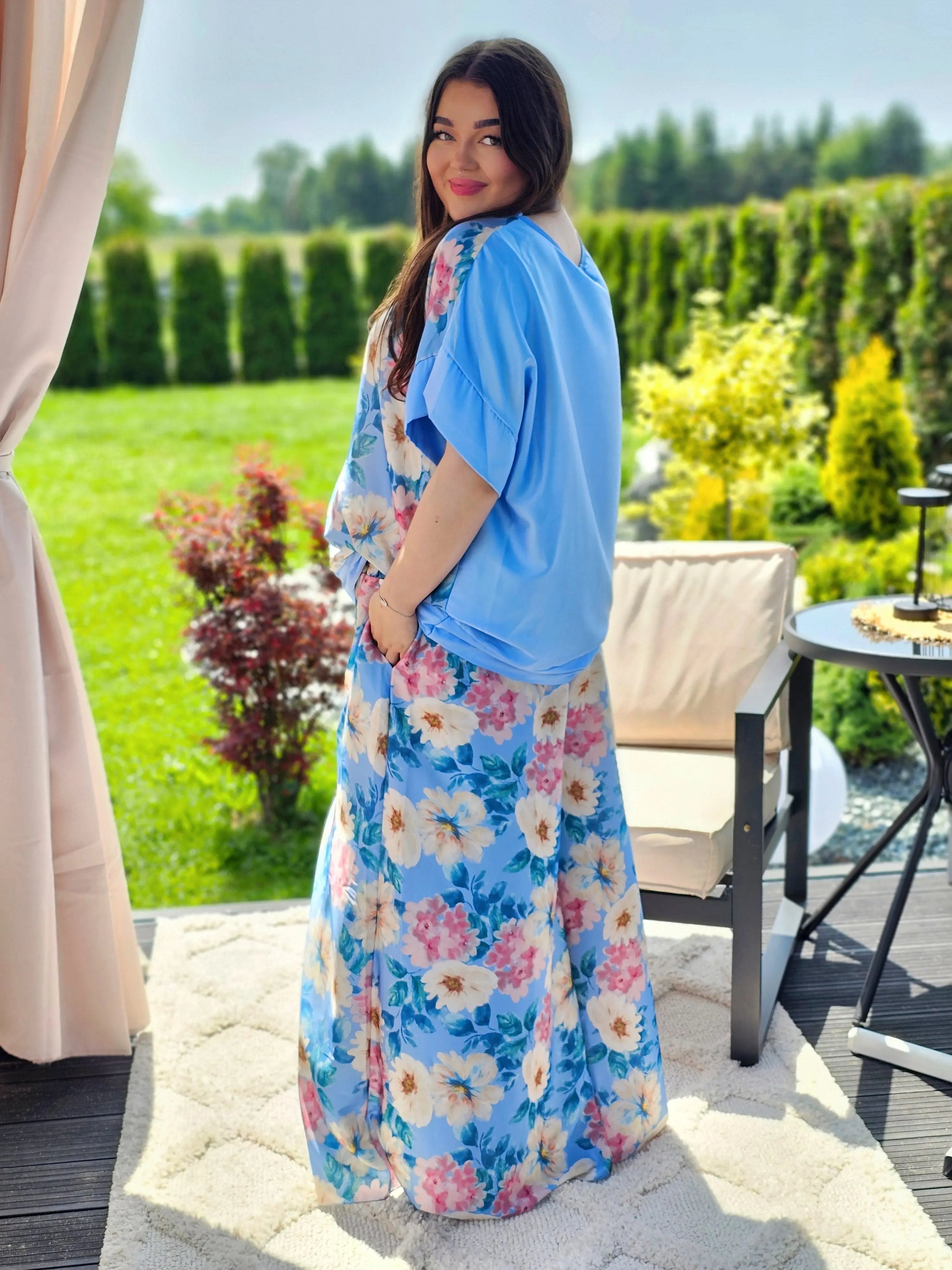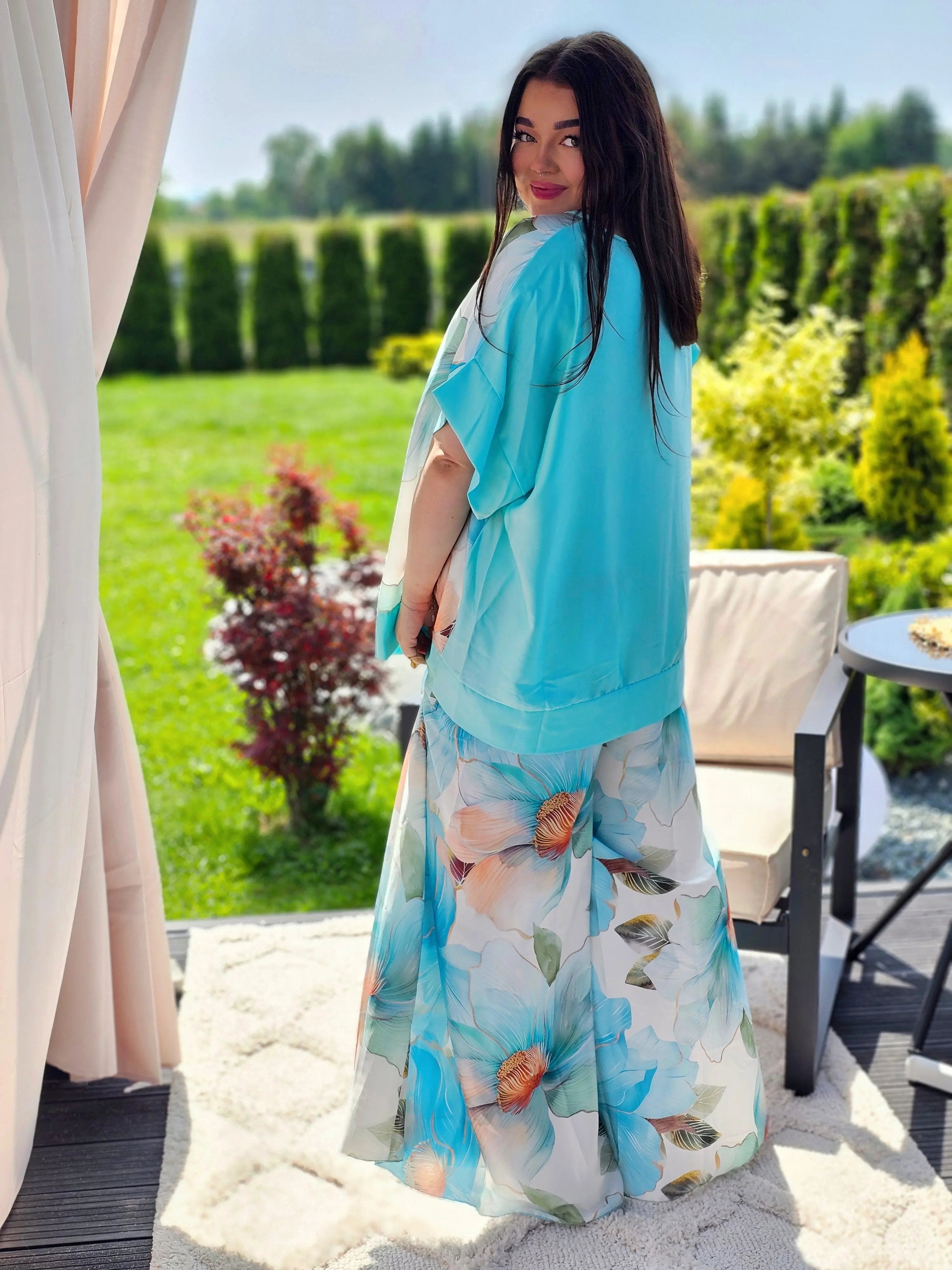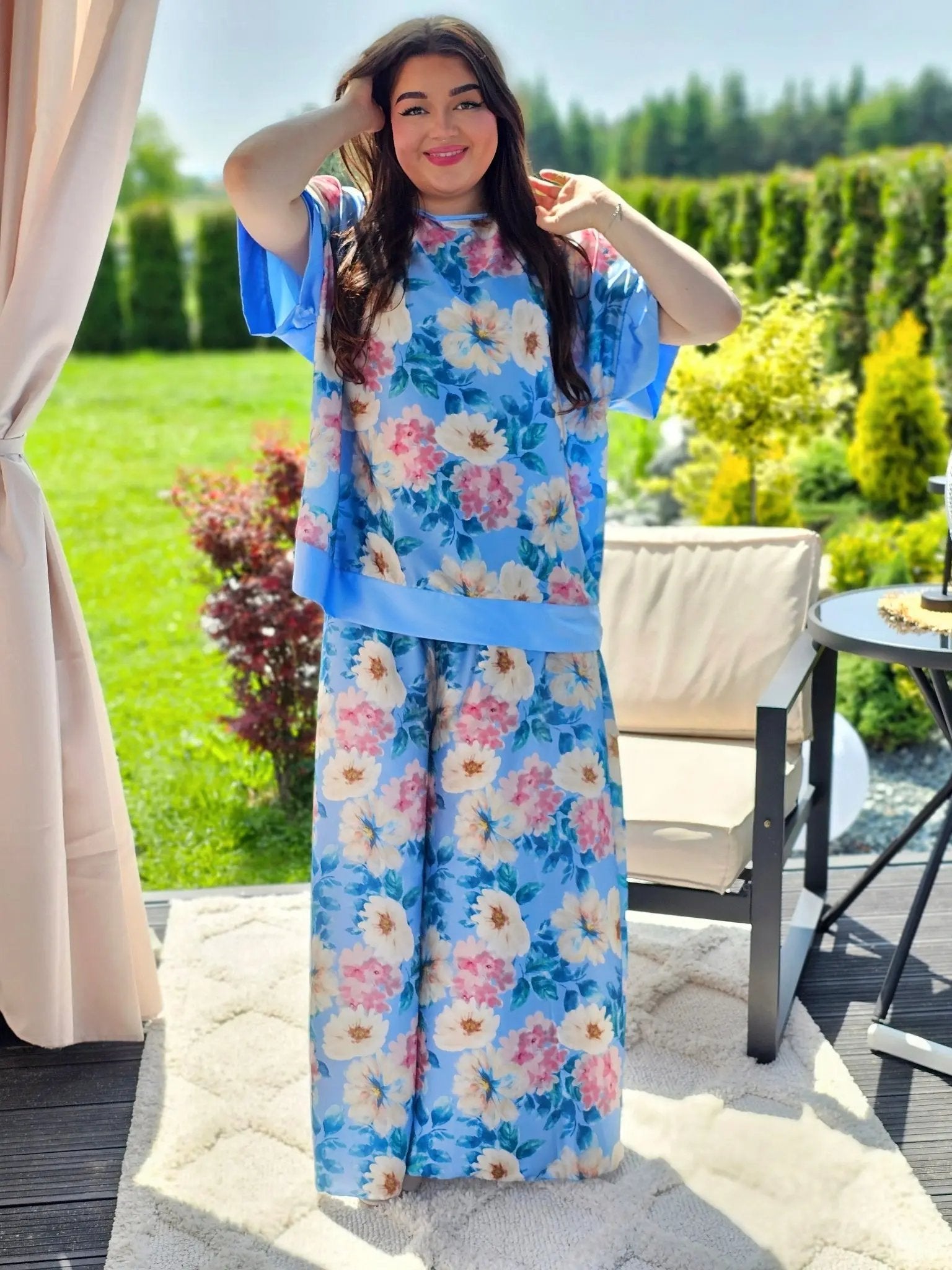 Stylowy, lekki i pełen wdzięku – komplet "Kwiatowa Elegancja" to propozycja dla kobiet, które cenią połączenie komfortu i klasy. Zestaw składający się z luźnej bluzki oraz zwiewnych spodni to idealny wybór na ciepłe dni, eleganckie spotkania i codzienne stylizacje z nutą romantyzmu.