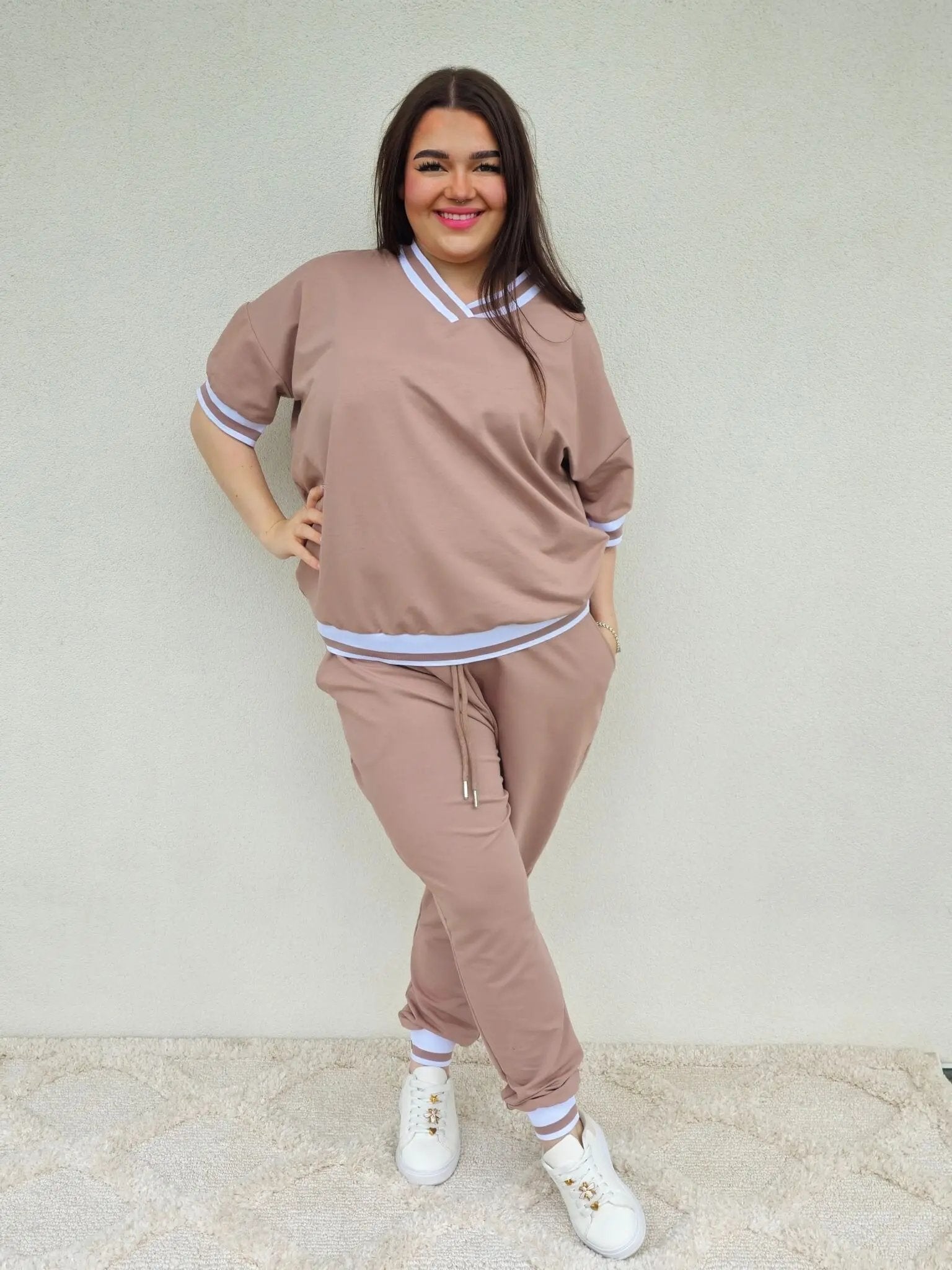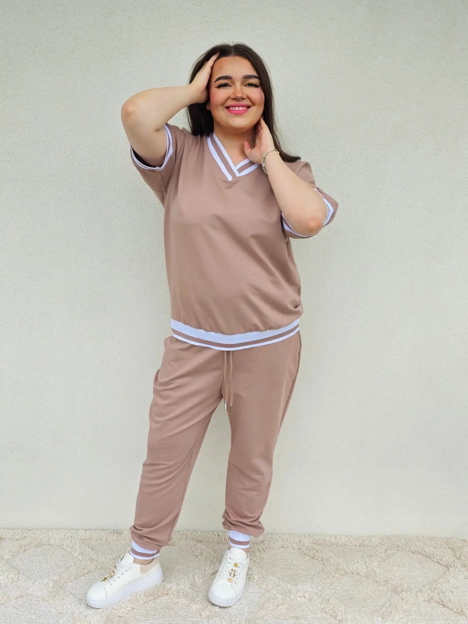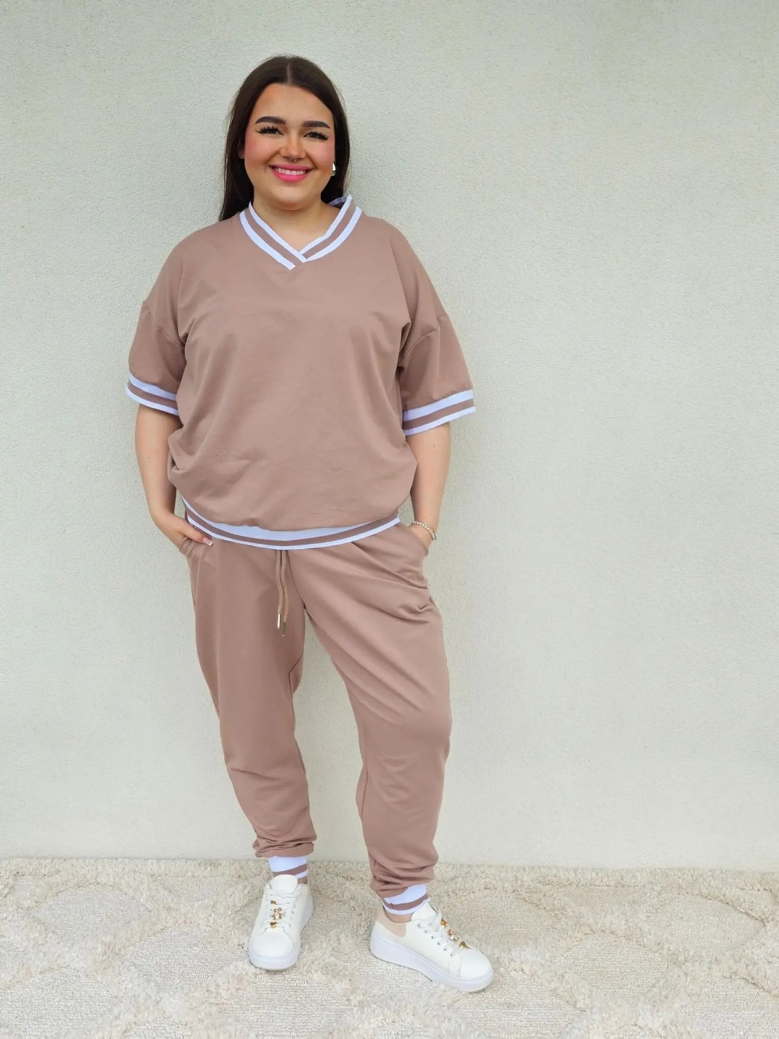Ten komplet dresowy to połączenie miejskiego stylu z kobiecą wygodą. Kontrastowe ściągacze dodają charakteru, a miękki materiał gwarantuje komfort niezależnie od sytuacji. Bluza z dekoltem w literę V i spodnie ze ściągaczem w pasie tworzą duet, który sprawdzi się zarówno na co dzień, jak i w podróży. Dostępny w czterech kolorach – wybierz swój vibe i poczuj się swobodnie.