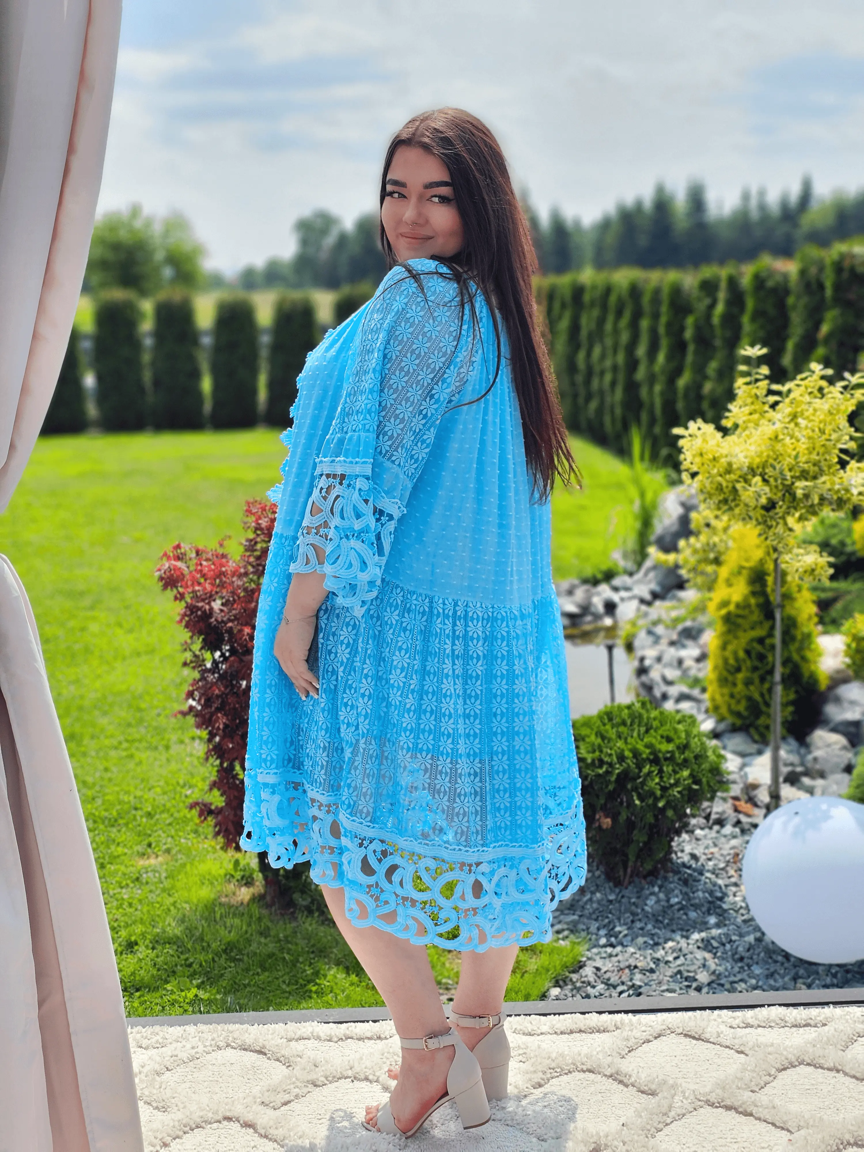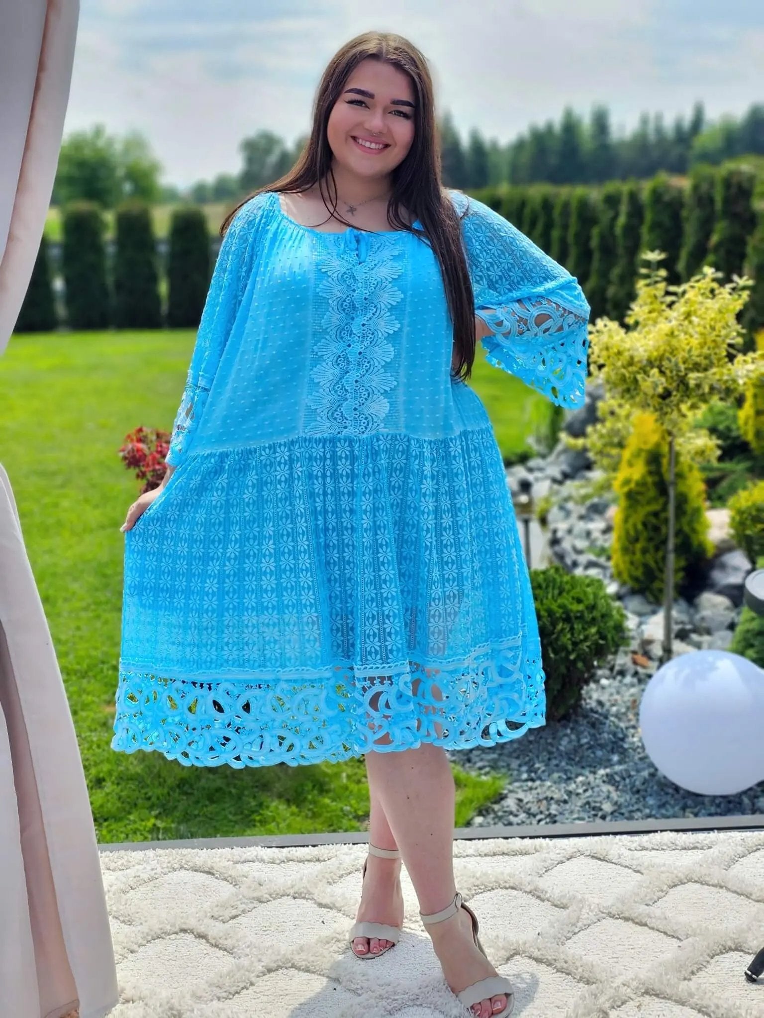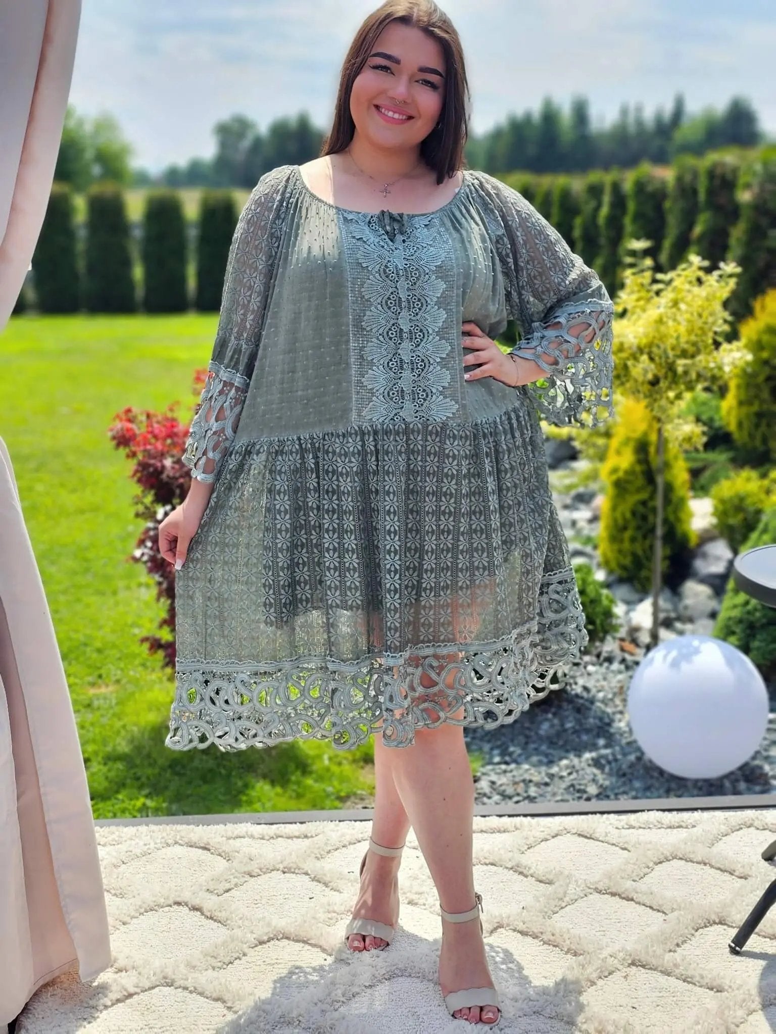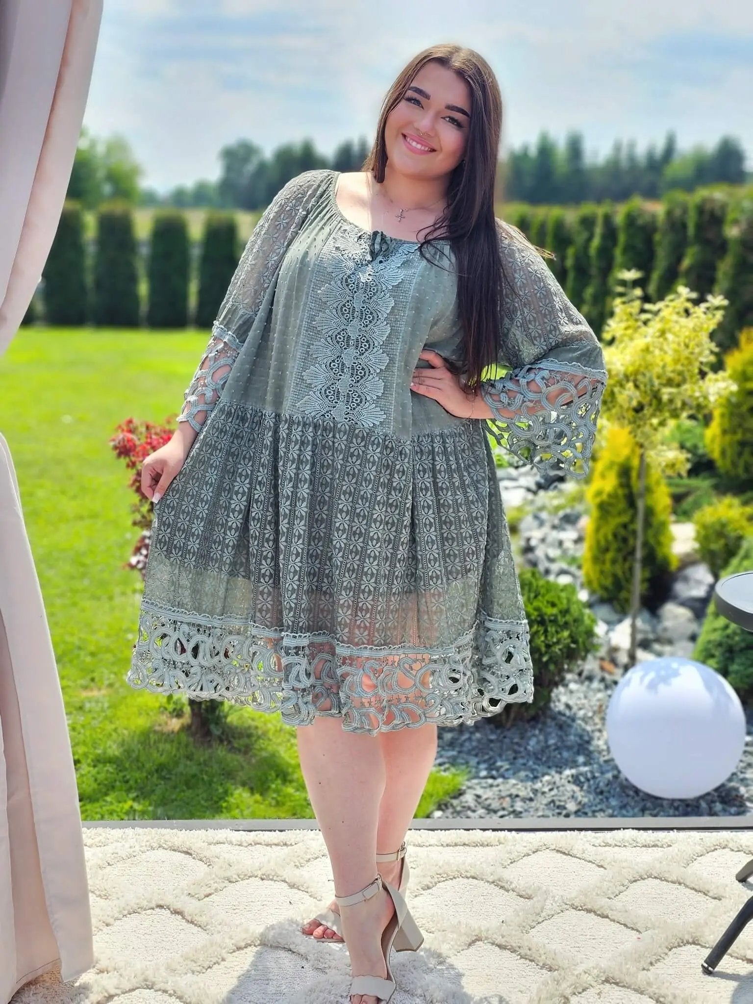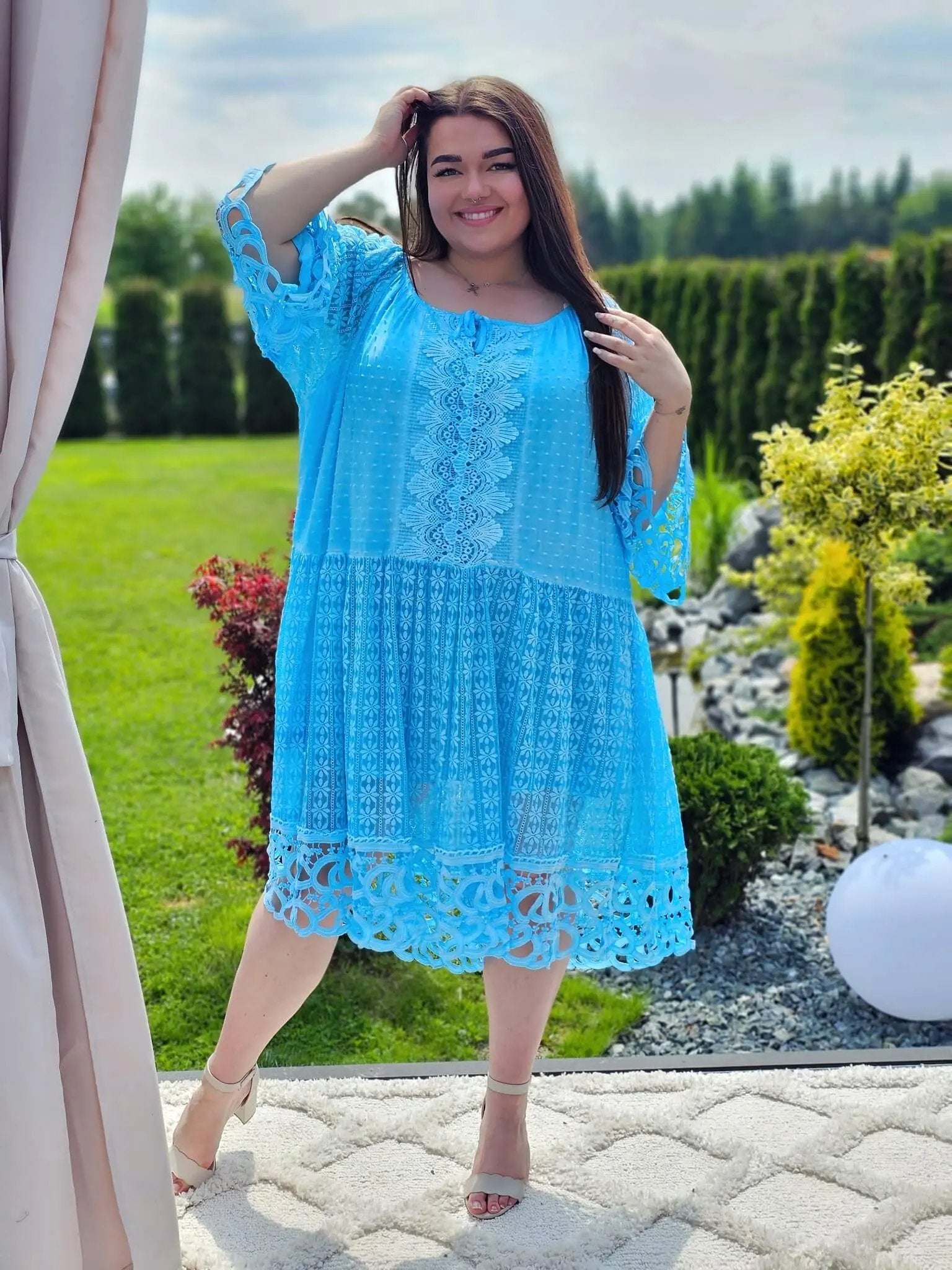 Sukienka to kwintesencja letniej lekkości i kobiecego stylu. Zwiewny materiał i subtelna koronka tworzą idealny duet na upalne dni – zarówno na spacer po parku, jak i wakacyjną kolację przy zachodzie słońca