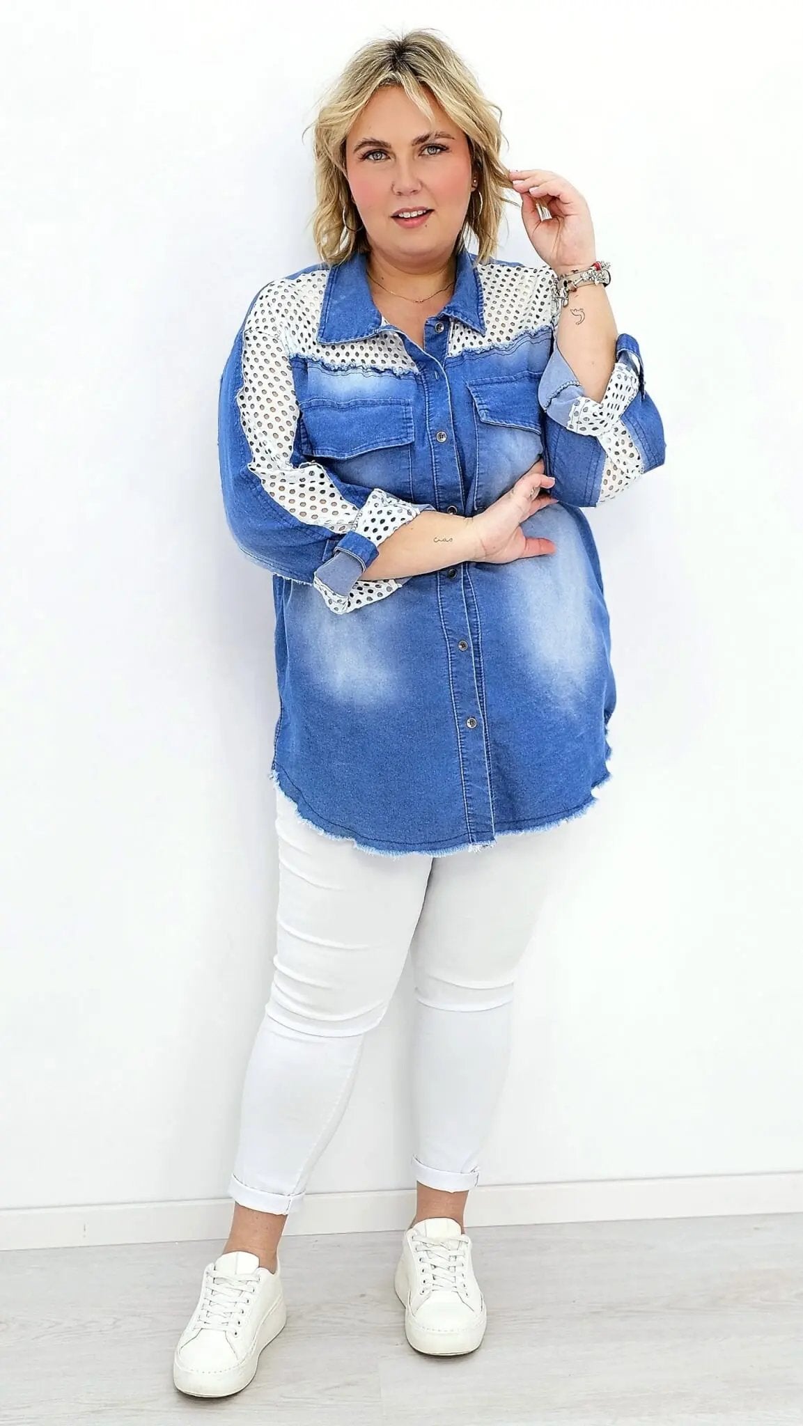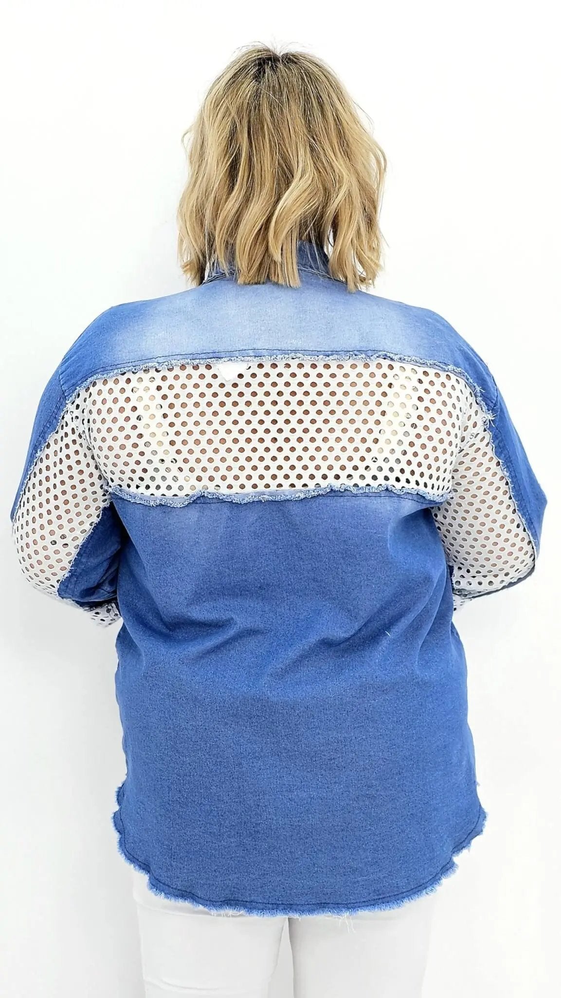 Koszula jeansowa z ażurową siateczką- odcień ciemny