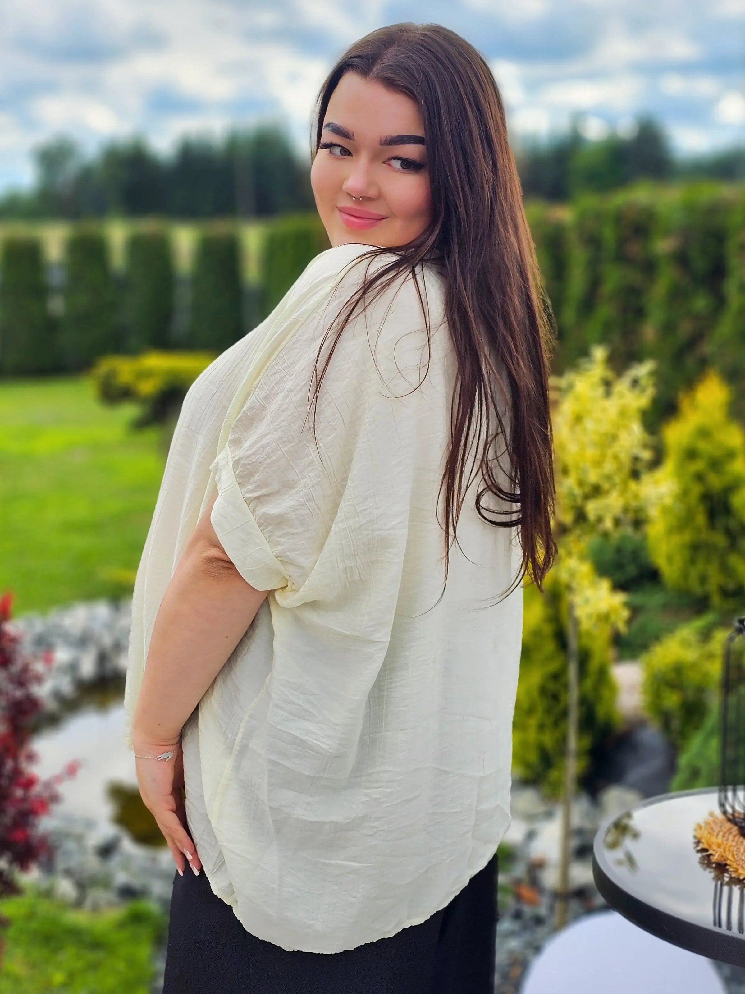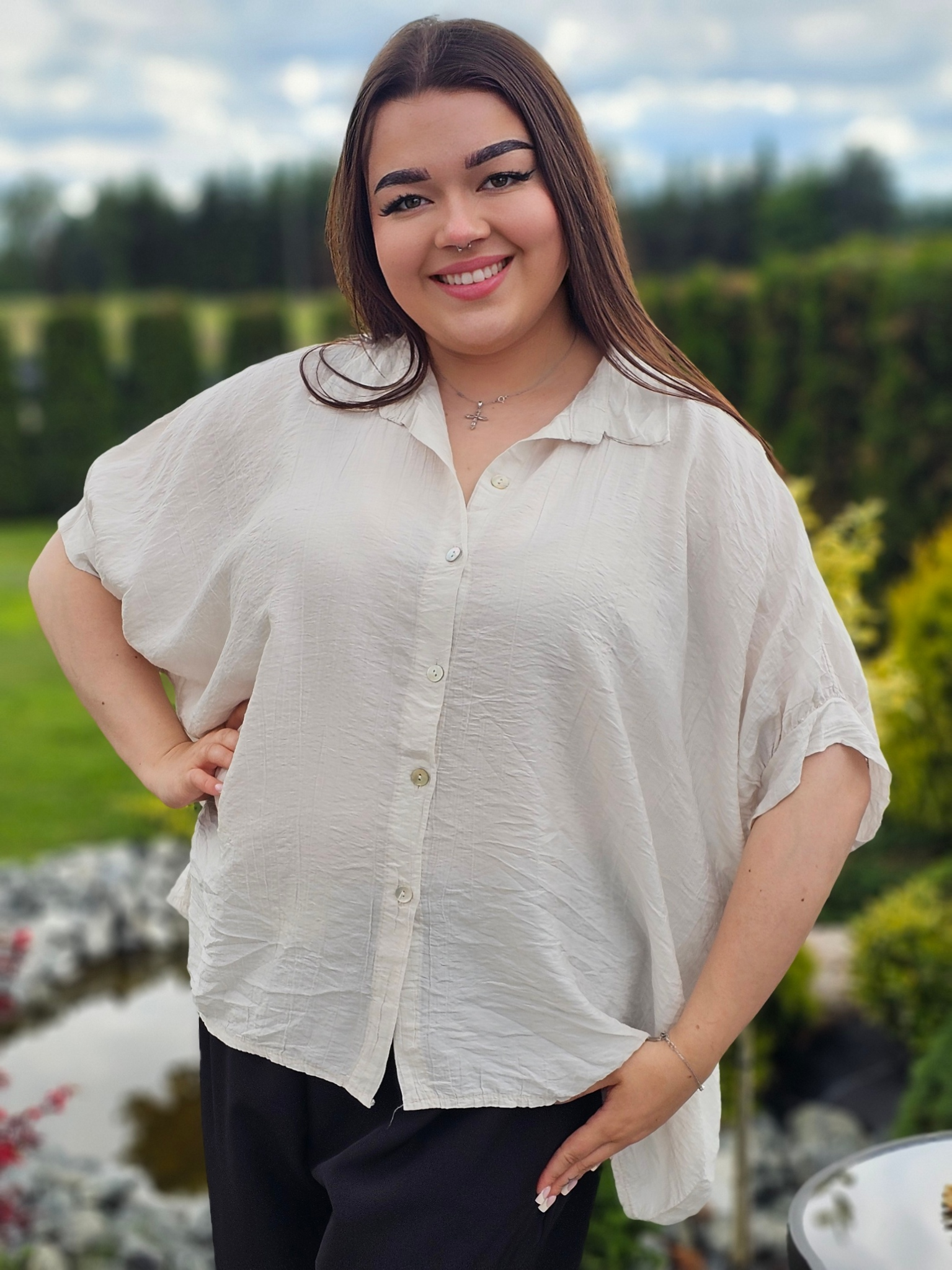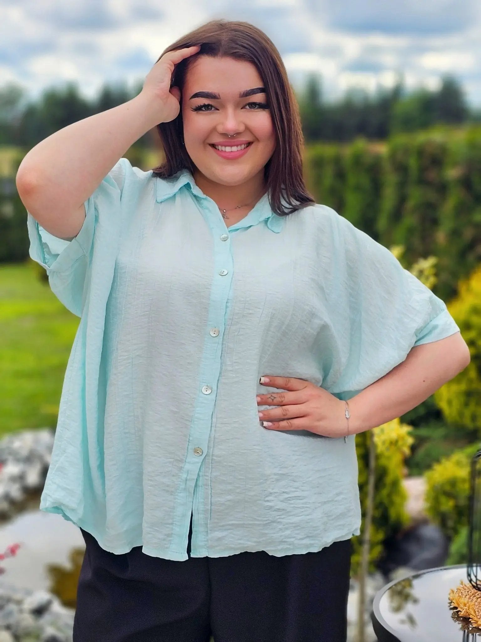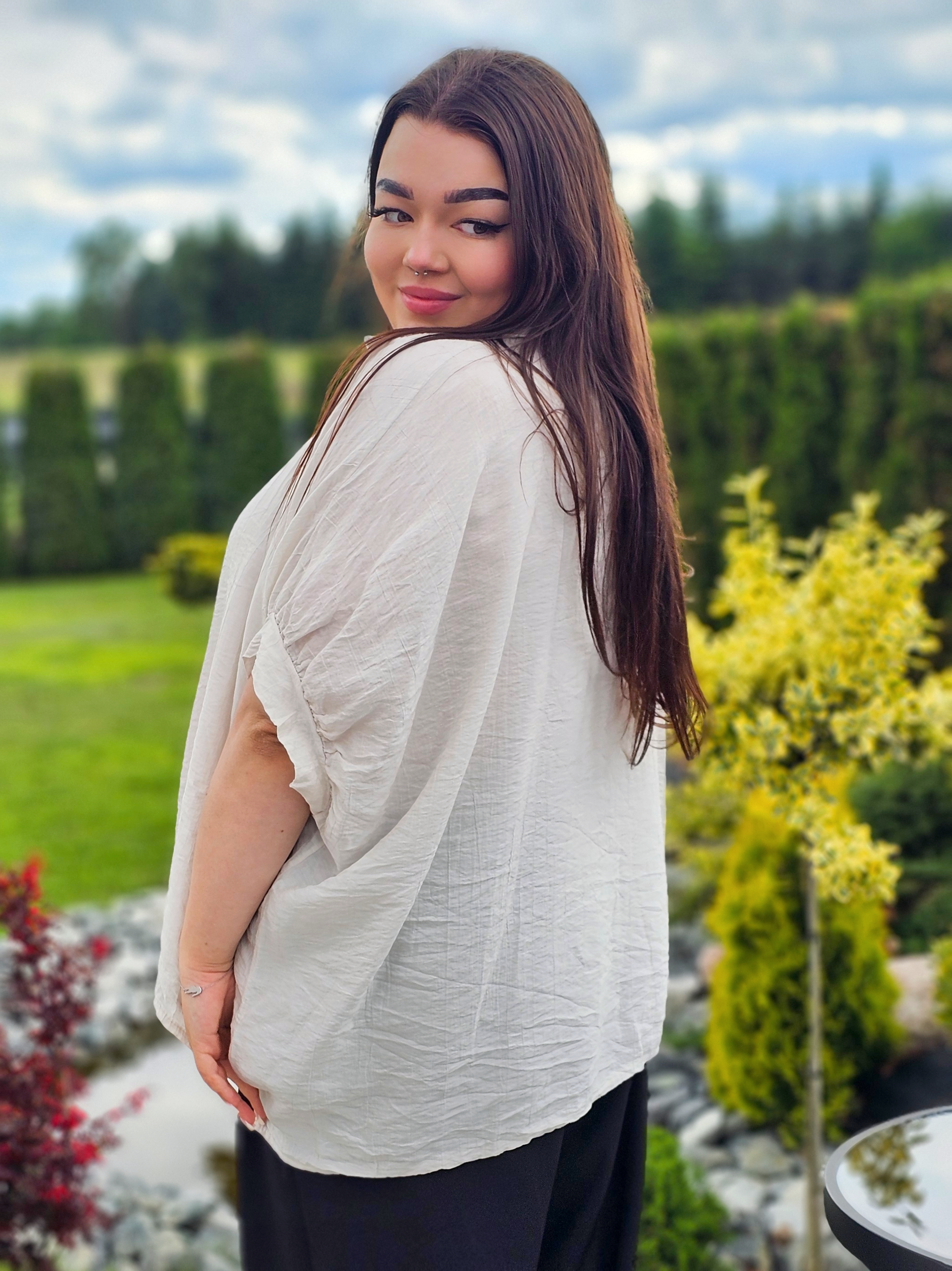 Wykonana z przewiewnego, delikatnie marszczonego materiału, świetnie dopasowuje się do sylwetki, zapewniając swobodę ruchów i wygodę przez cały dzień. Klasyczny kołnierzyk i guziki dodają jej ponadczasowego charakteru, a luźny fason sprawia, że pasuje do każdej stylizacji.