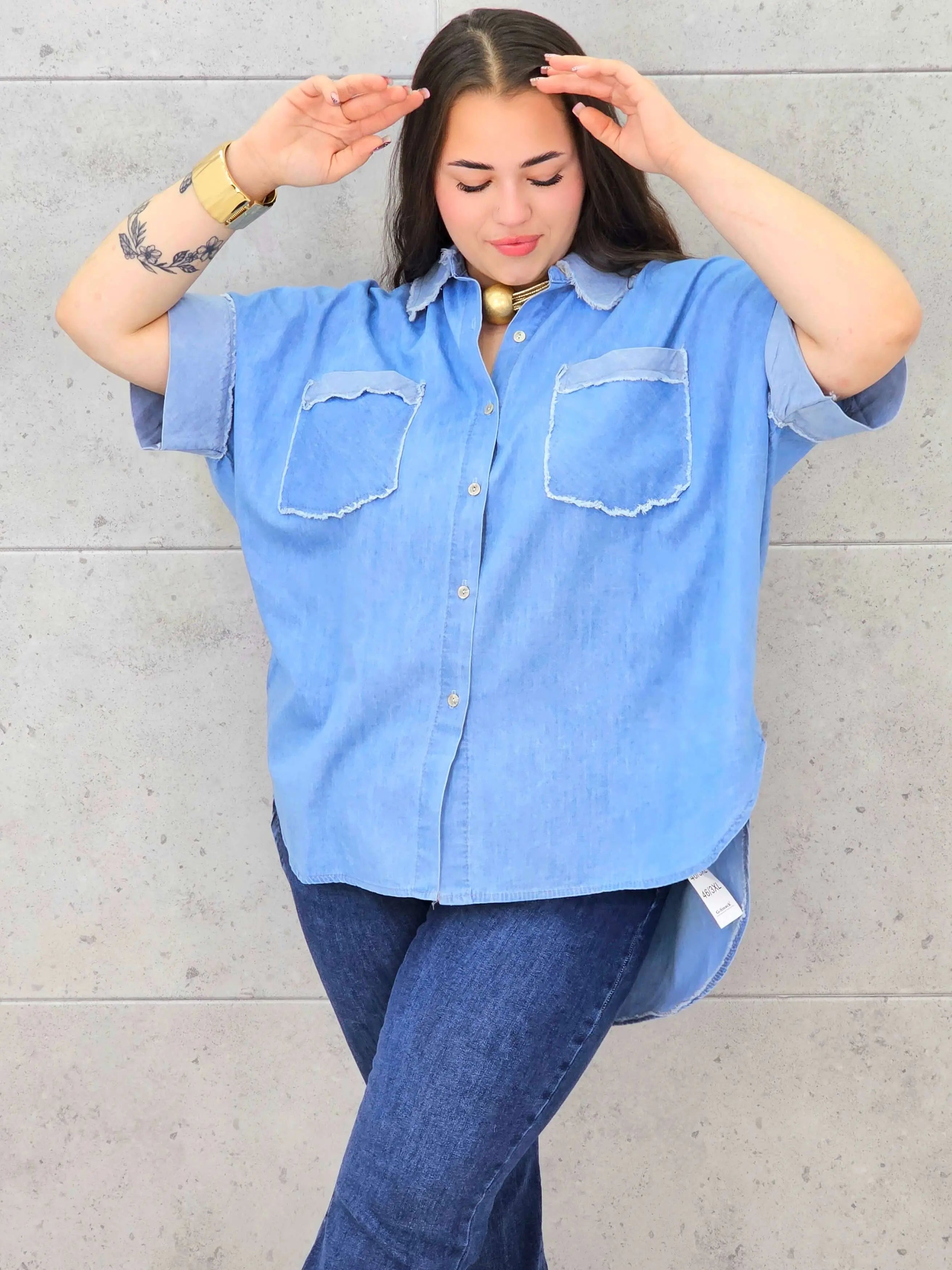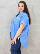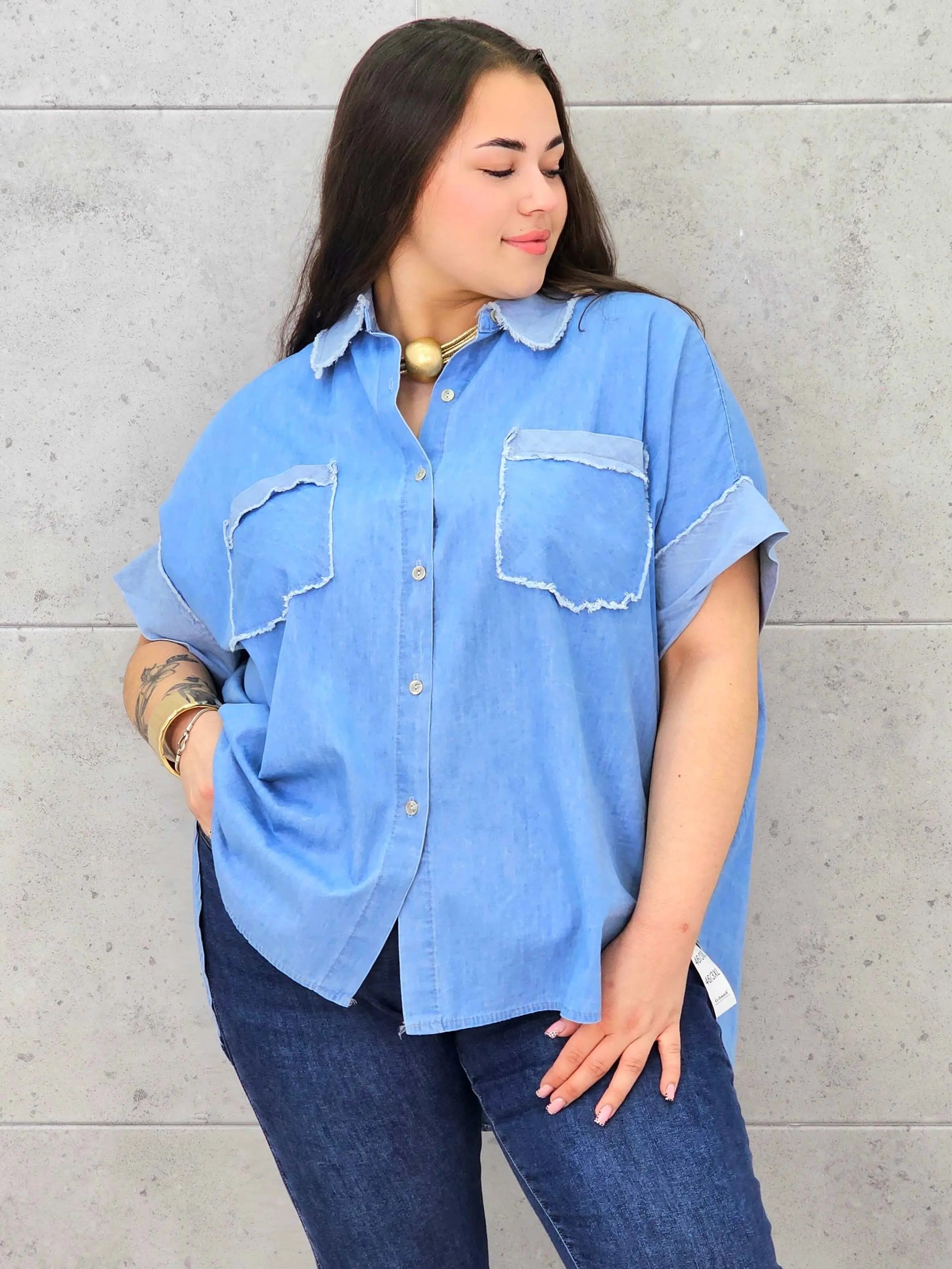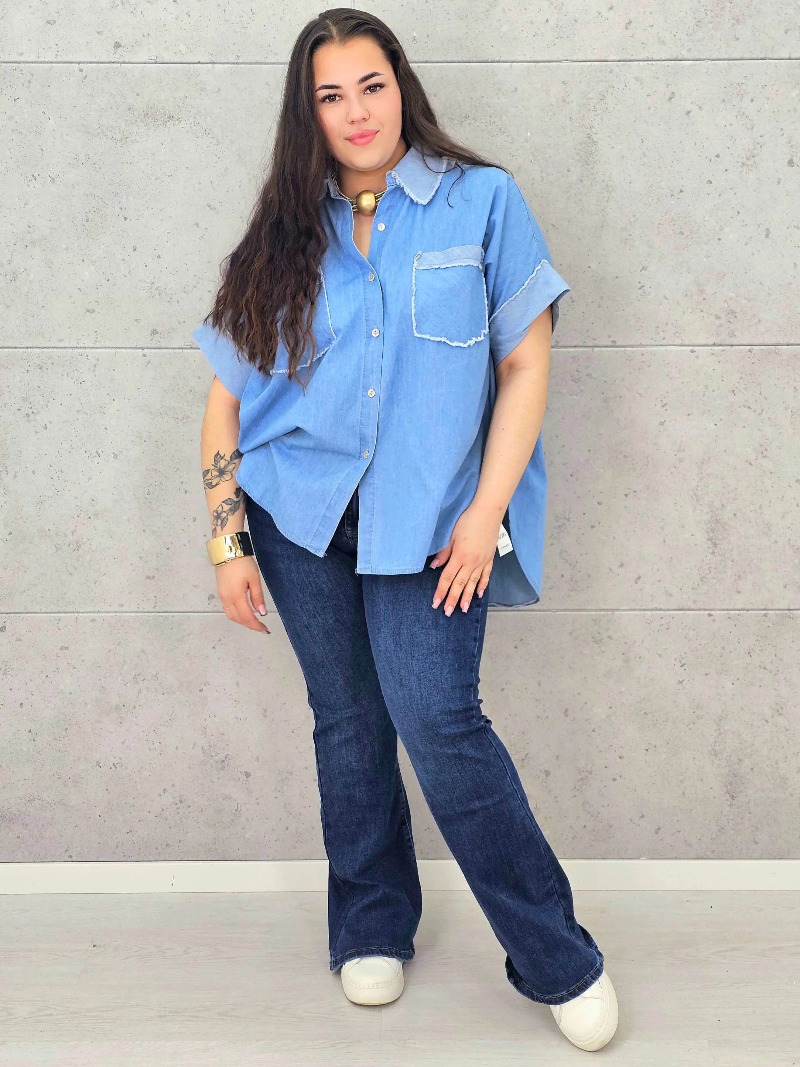 Efektowne, postrzępione wykończenia przy kieszeniach, kołnierzyku i rękawach wprowadzają lekki, vintage’owy akcent, który wyróżnia koszulę na tle klasycznych modeli plus size. Asymetryczny dół — z delikatnie wydłużonym tyłem — świetnie prezentuje się zarówno do jeansów, jak i legginsów, tworząc spójny i modny outfit.