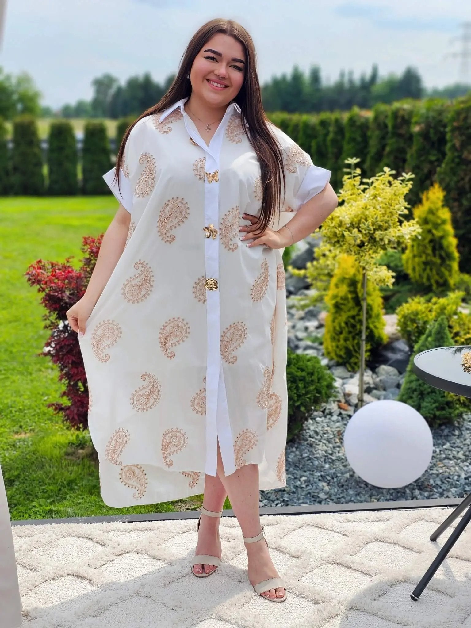Ta sukienka łączy w sobie klasę, luz i egzotyczny urok – idealna na letnie dni, kiedy chcesz wyglądać stylowo i czuć się w pełni swobodnie. Nadruk w stylu paisley i złote ozdobne guziki dodają całości niepowtarzalnego charakteru. Wybierz wersję z czarnym lub beżowym wzorem i poczuj się wyjątkowo