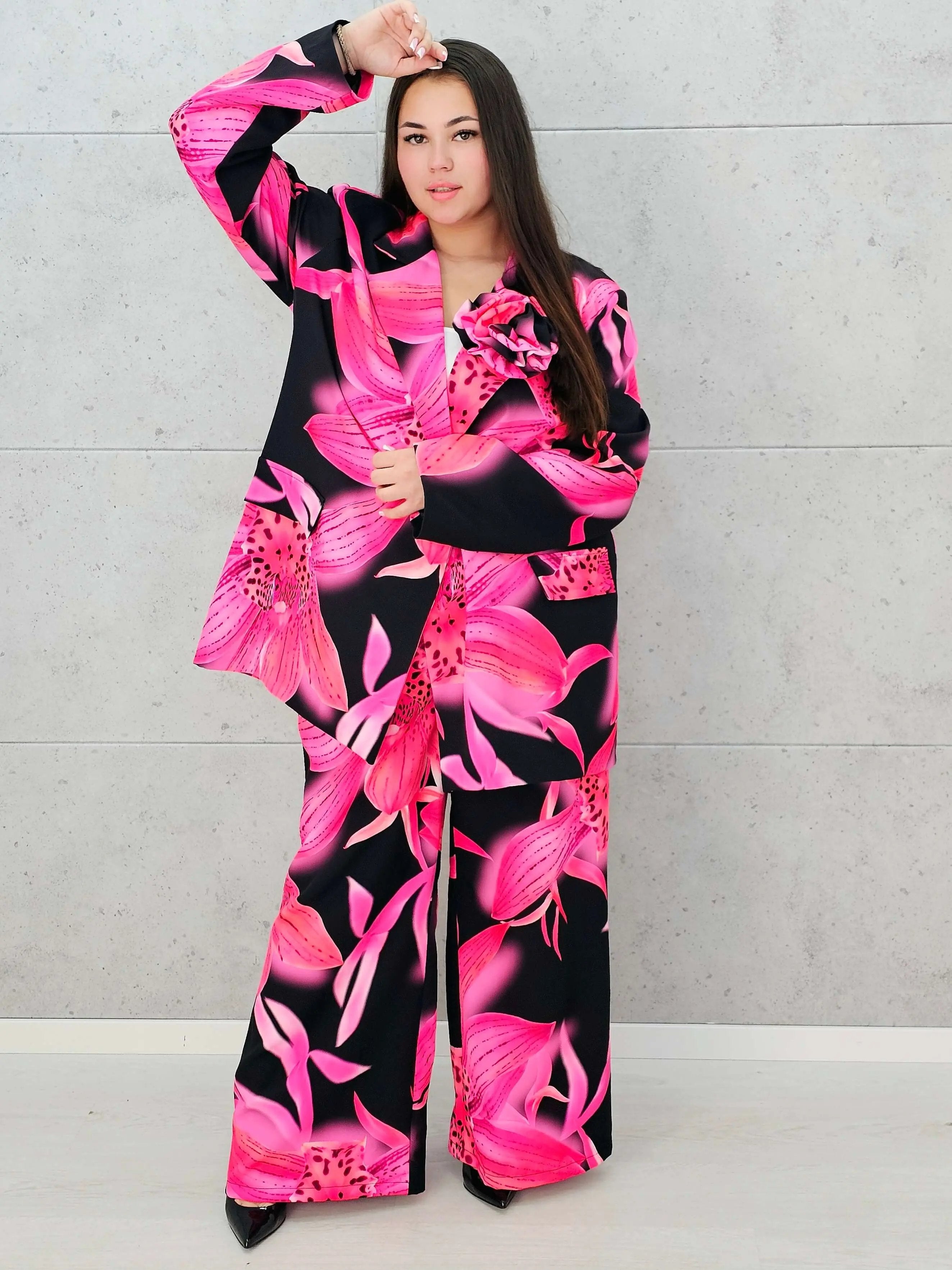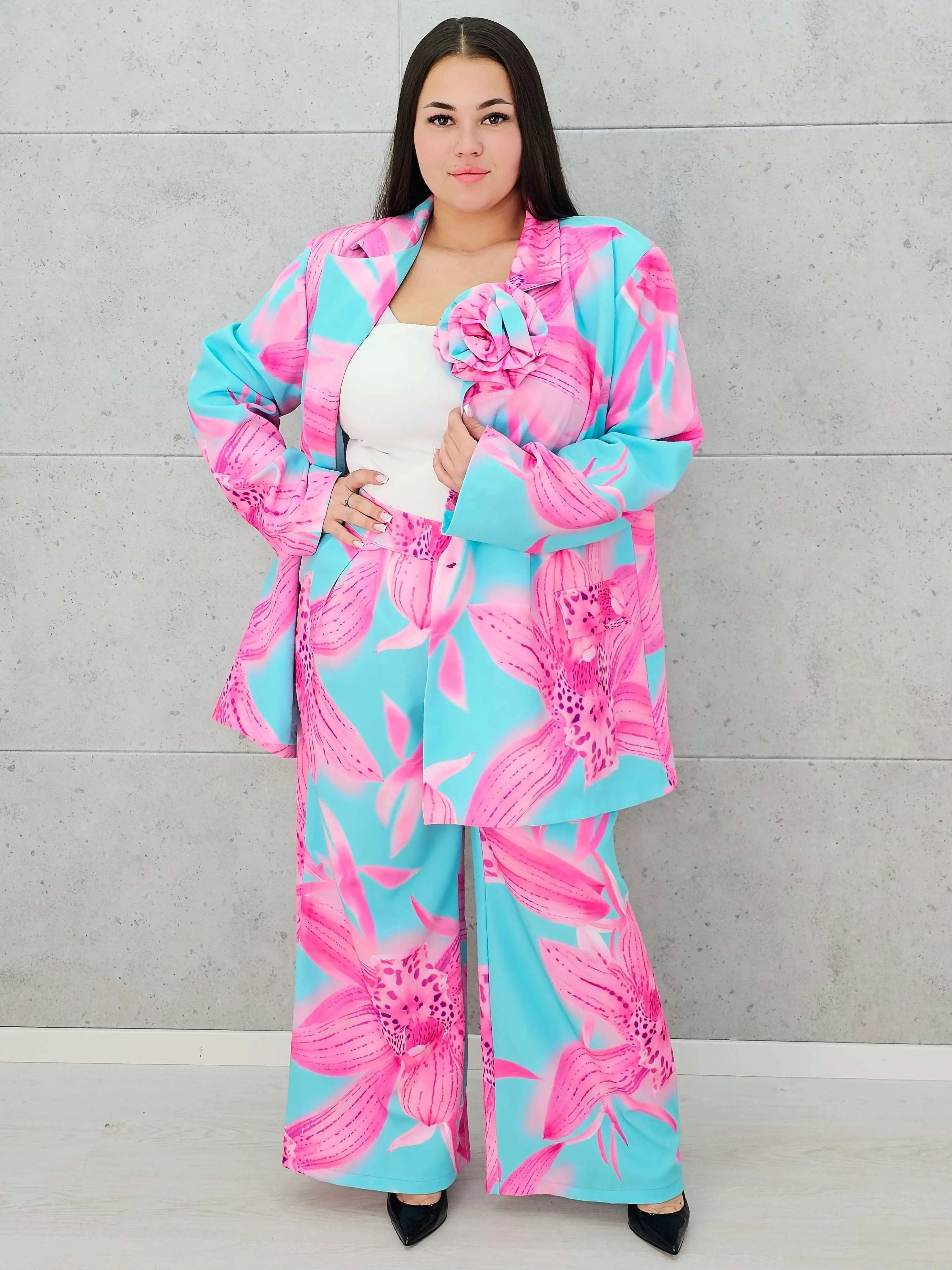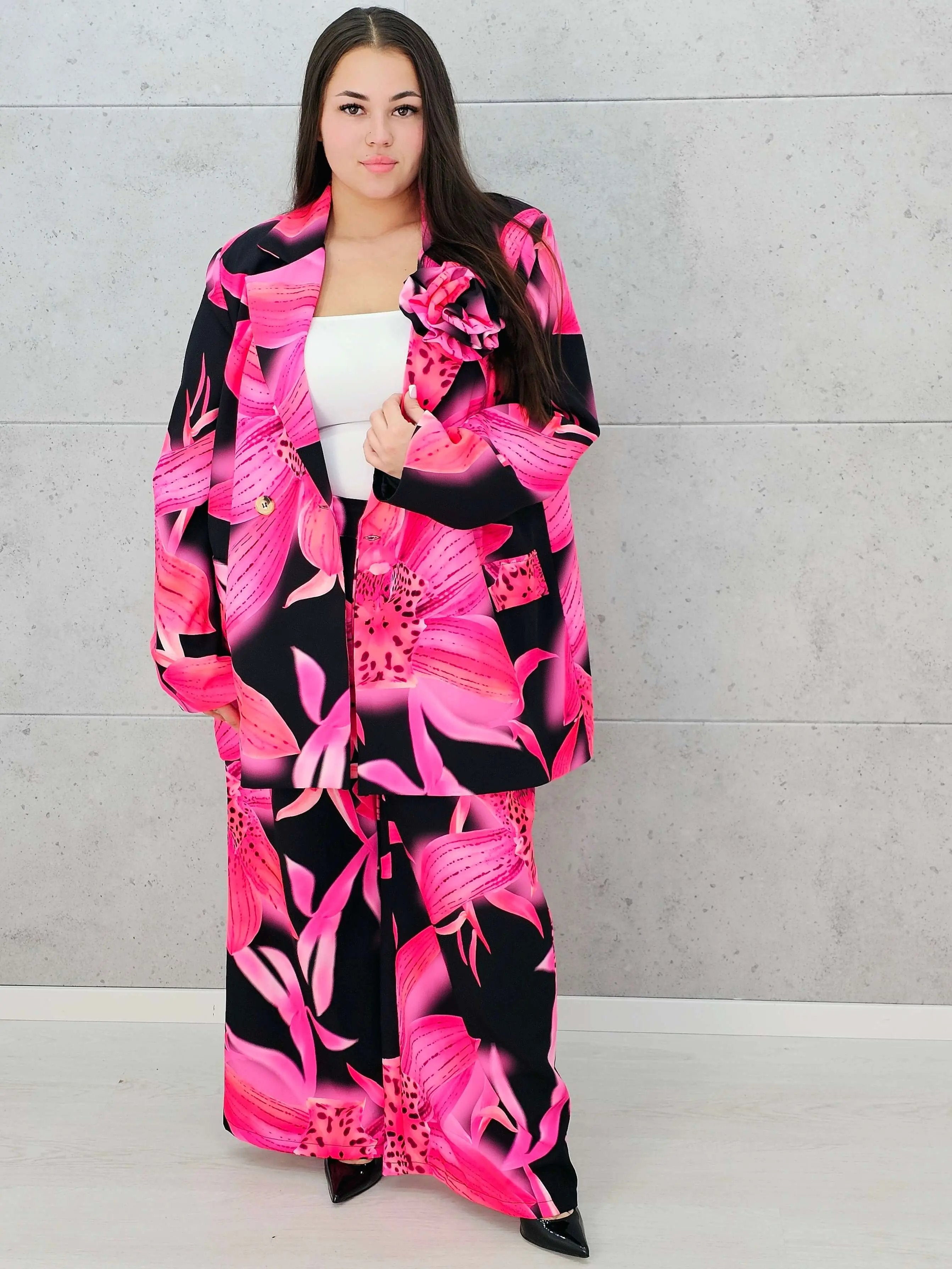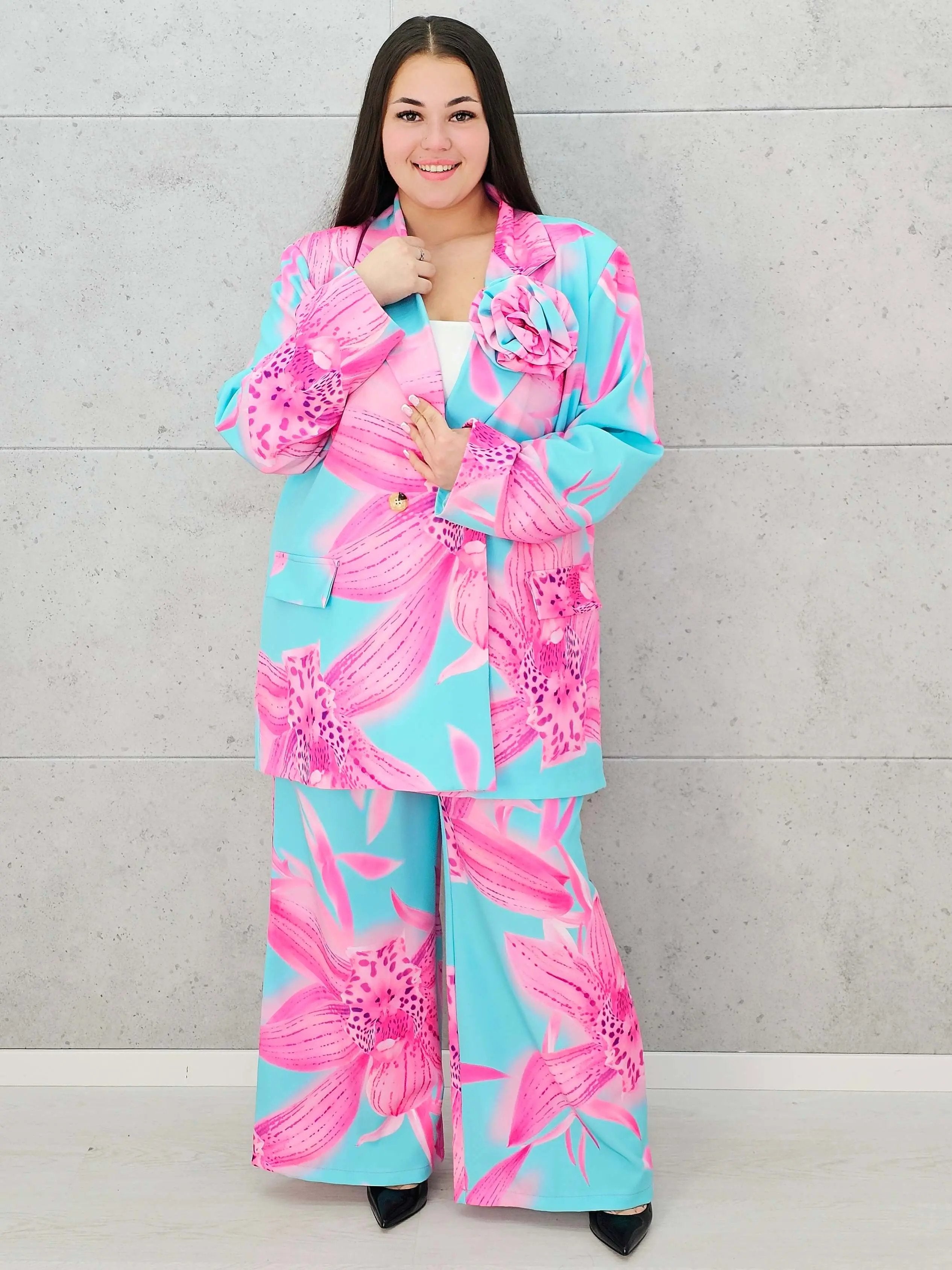 Ten wyjątkowy komplet został zaprojektowany z myślą o kobietach, które kochają modę i chcą czuć się wyjątkowo niezależnie od rozmiaru. Intensywny wzór w duże kwiaty przyciąga wzrok, dodając energii i pewności siebie – idealnie wpisuje się w letnie, słoneczne dni.