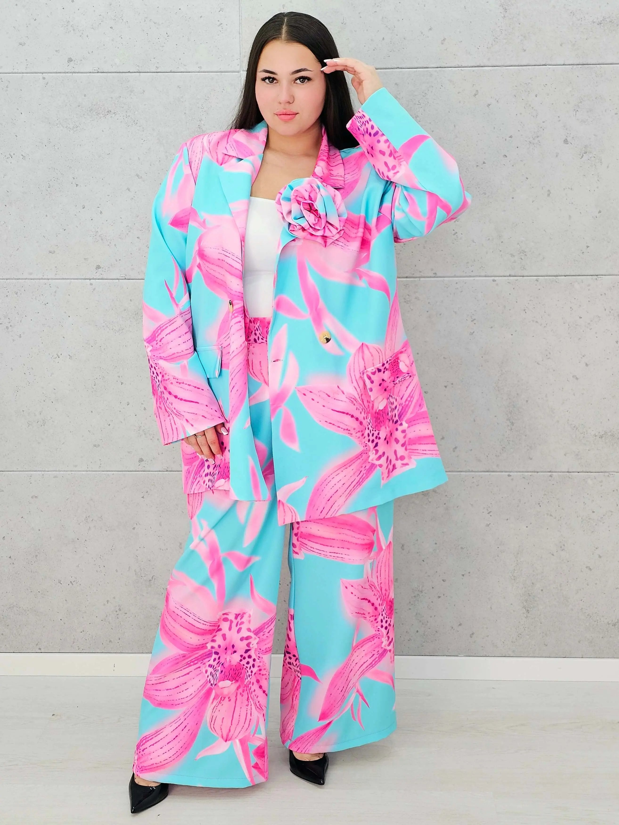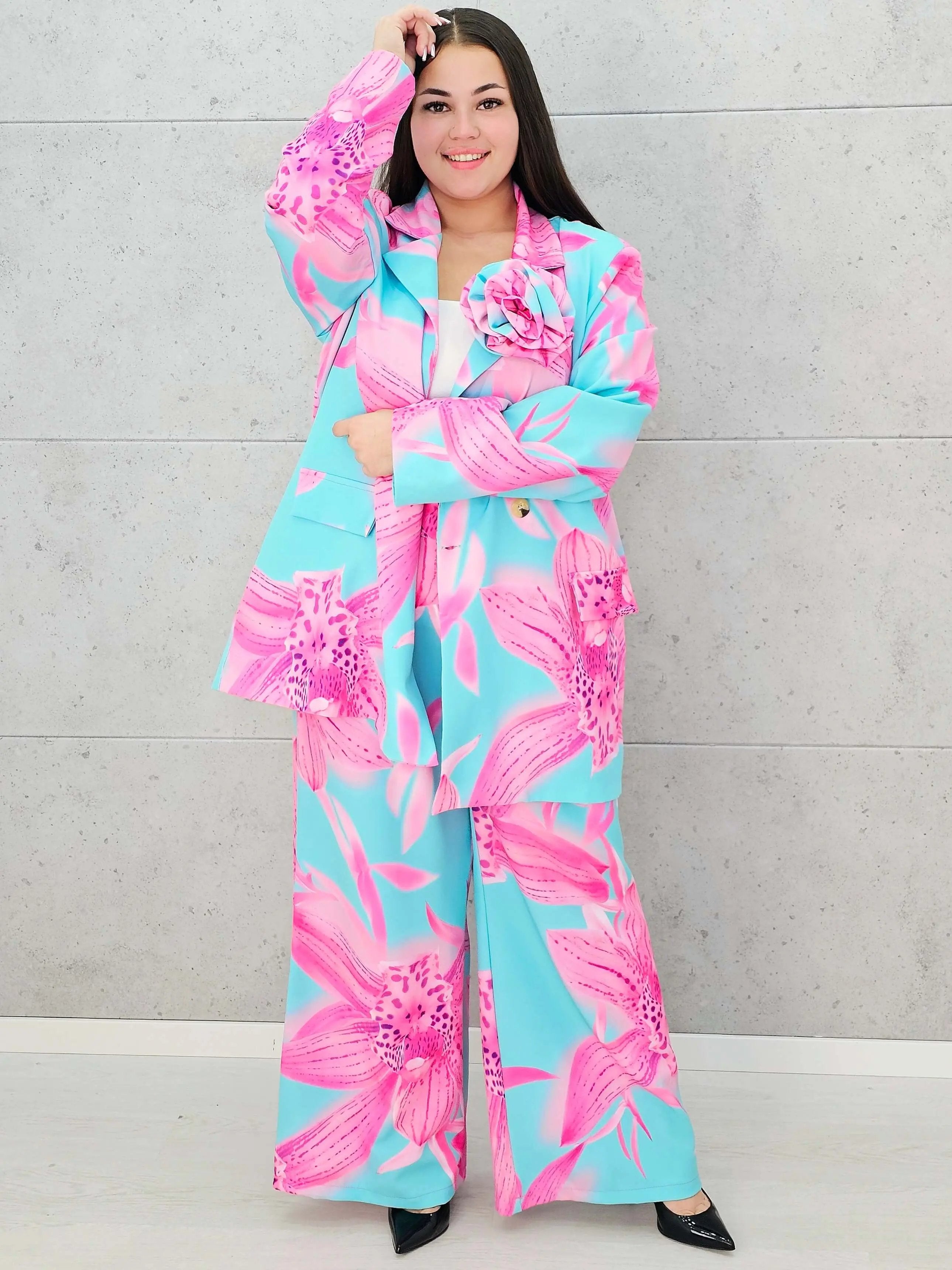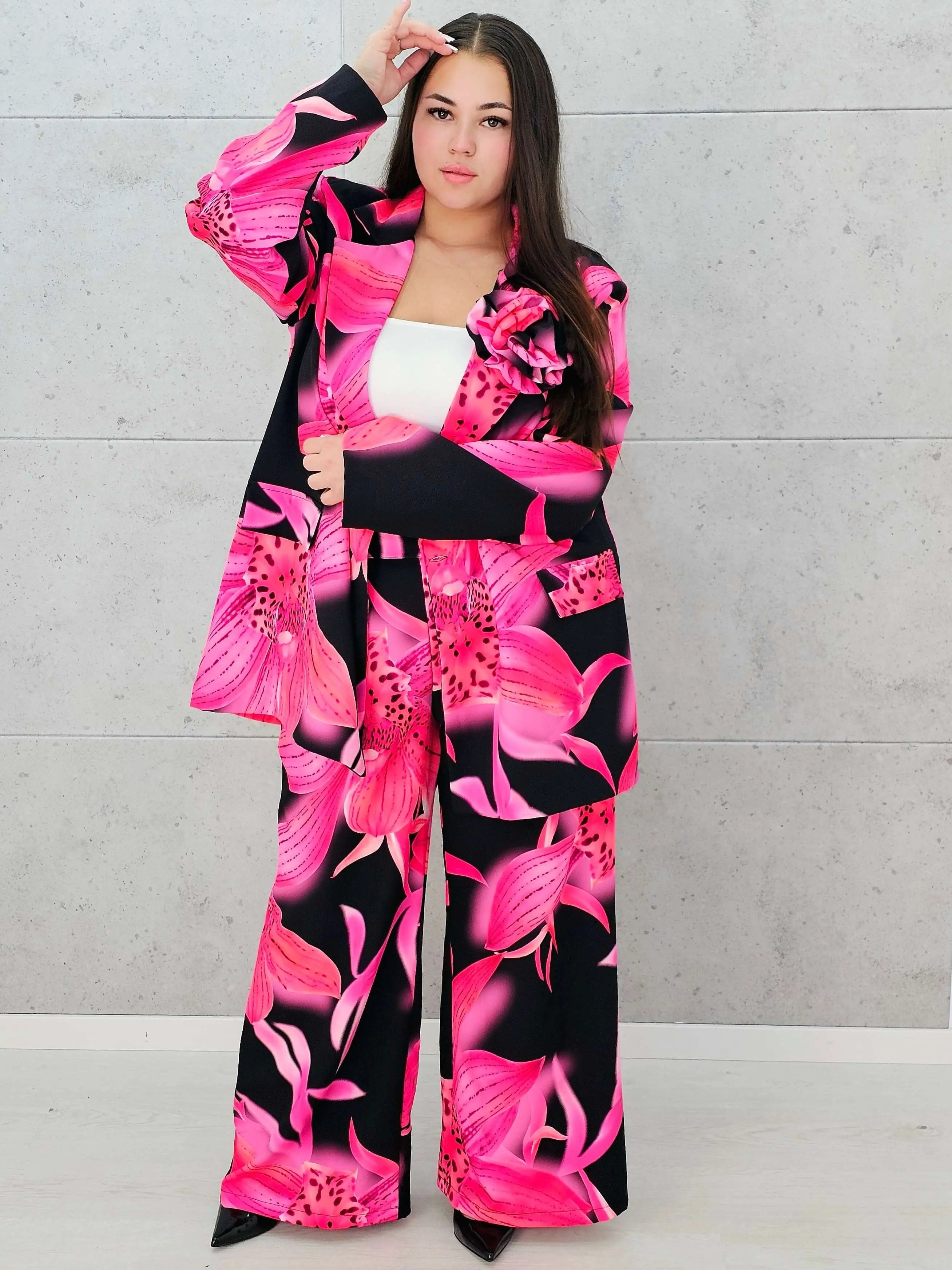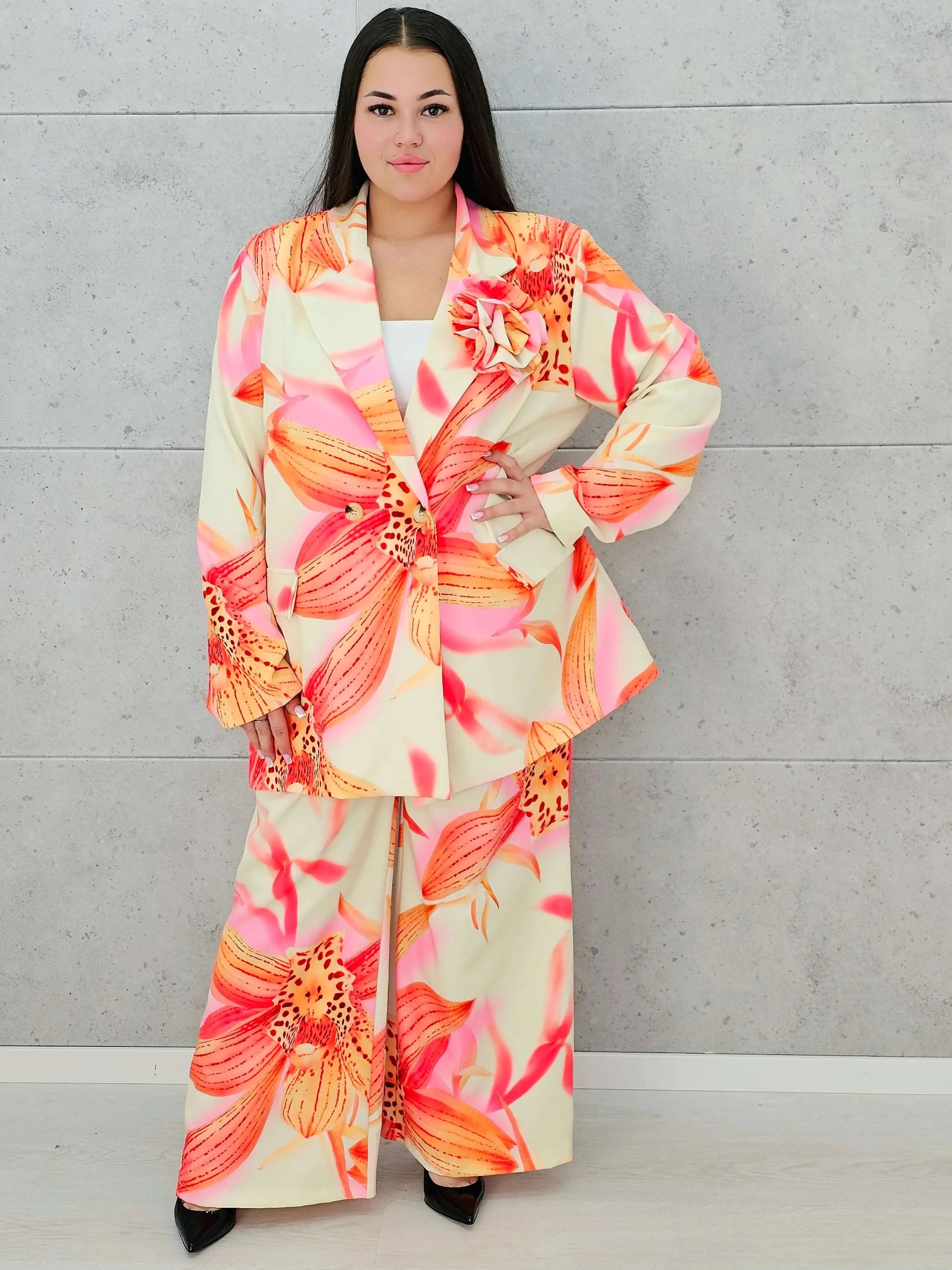 Ten wyjątkowy komplet został zaprojektowany z myślą o kobietach, które kochają modę i chcą czuć się wyjątkowo niezależnie od rozmiaru. Intensywny wzór w duże kwiaty przyciąga wzrok, dodając energii i pewności siebie – idealnie wpisuje się w letnie, słoneczne dni.